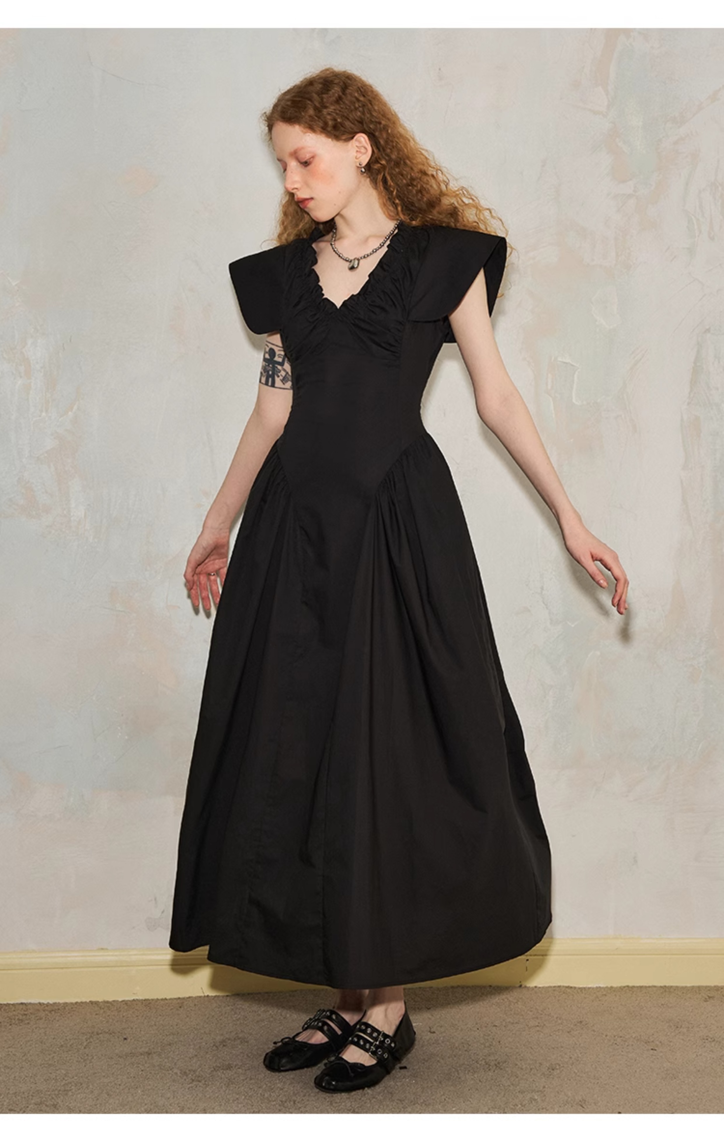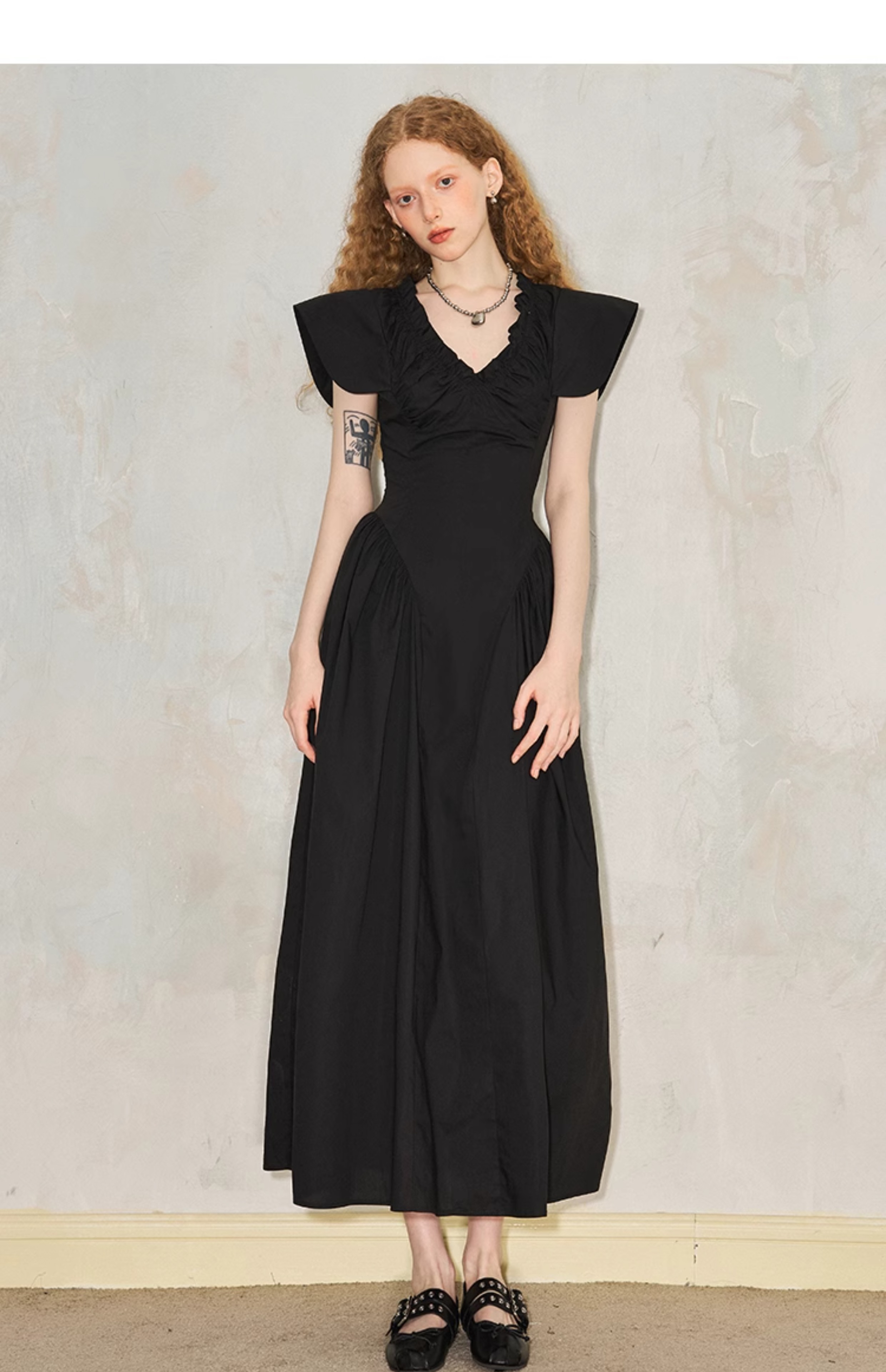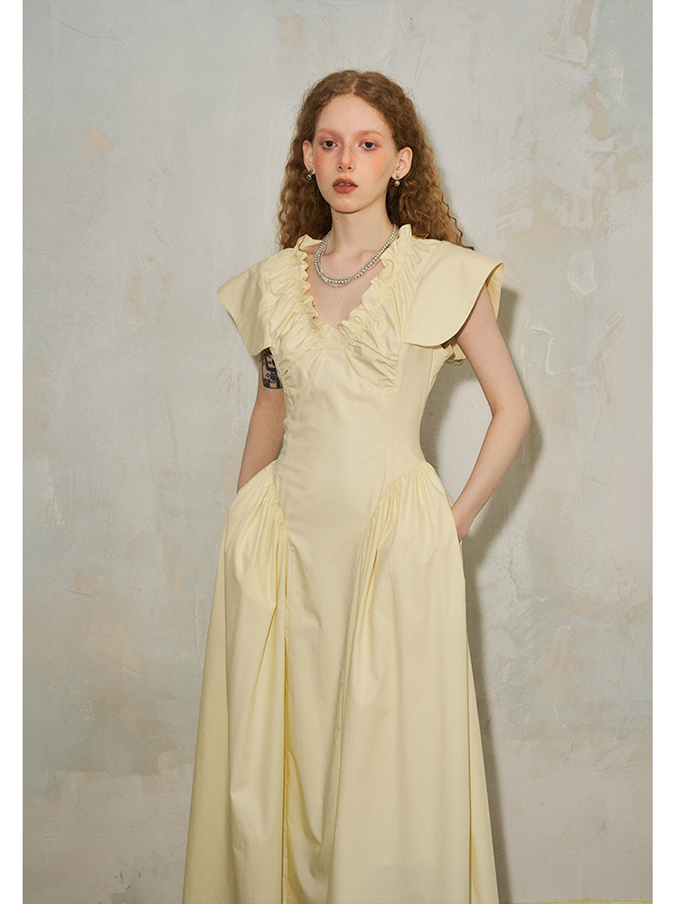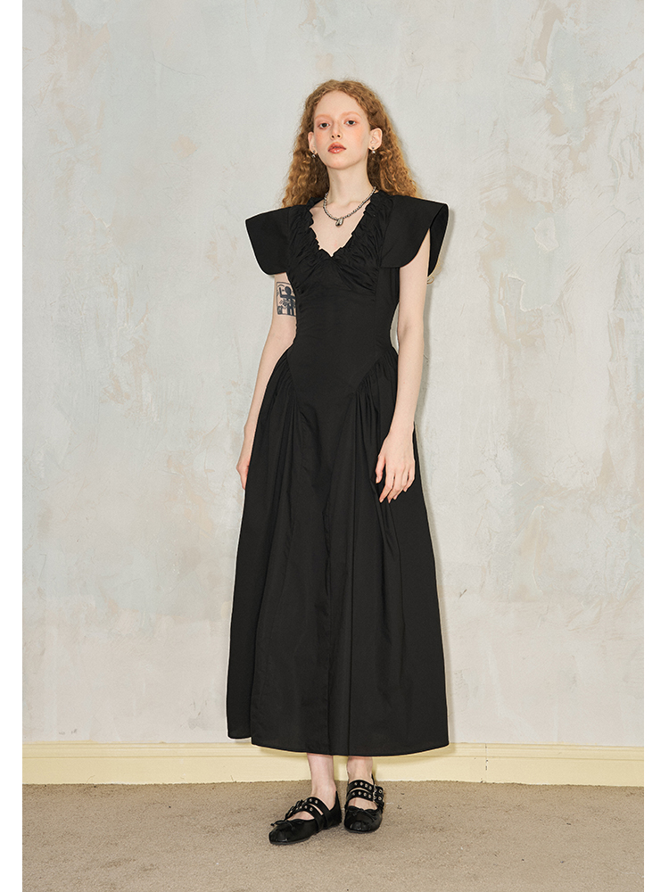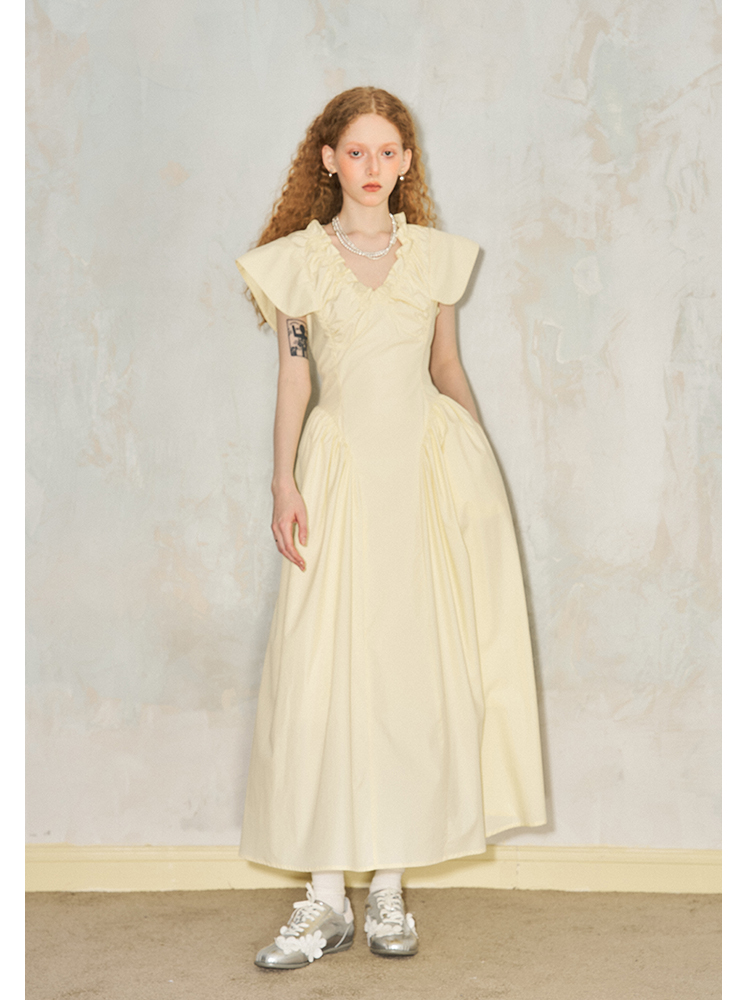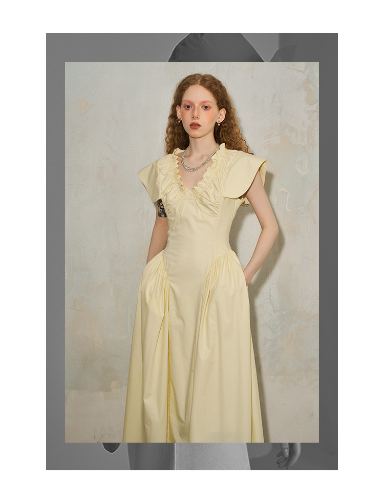 فستان مطوي بياقة على شكل حرف V وأكمام طائرة