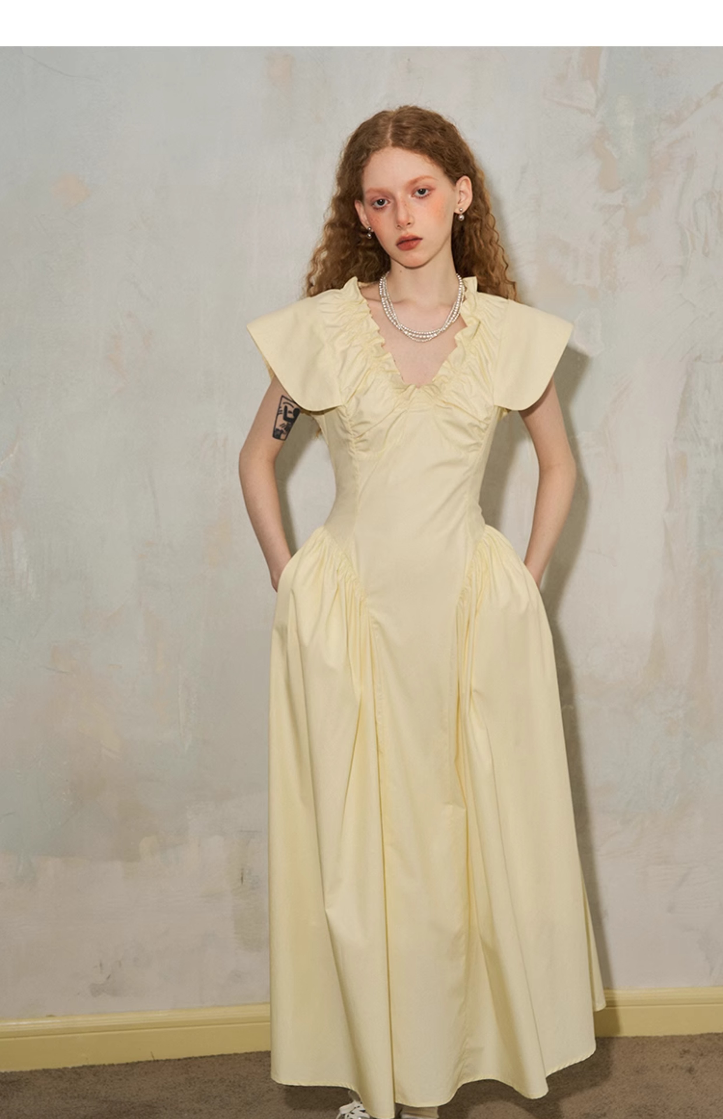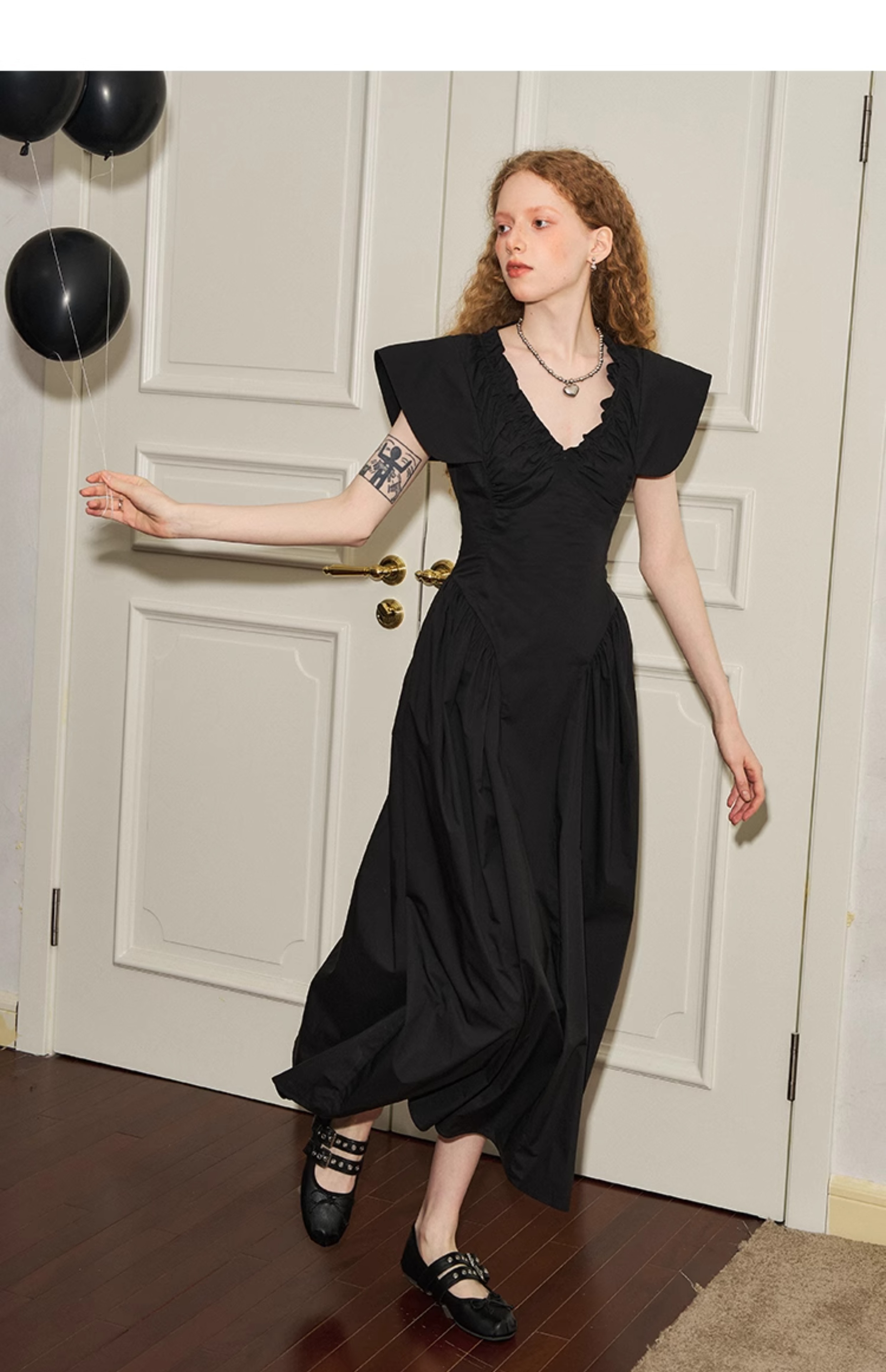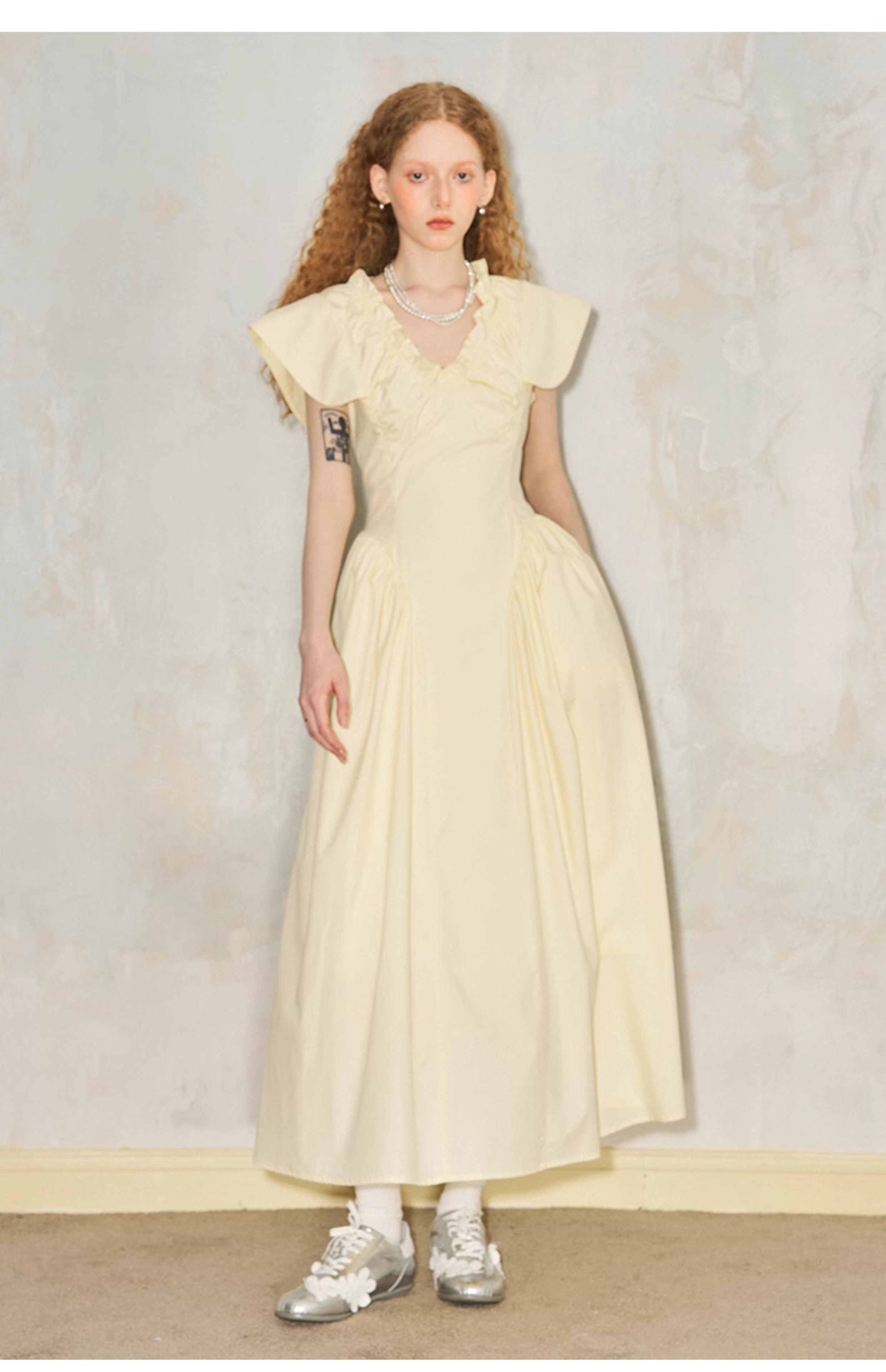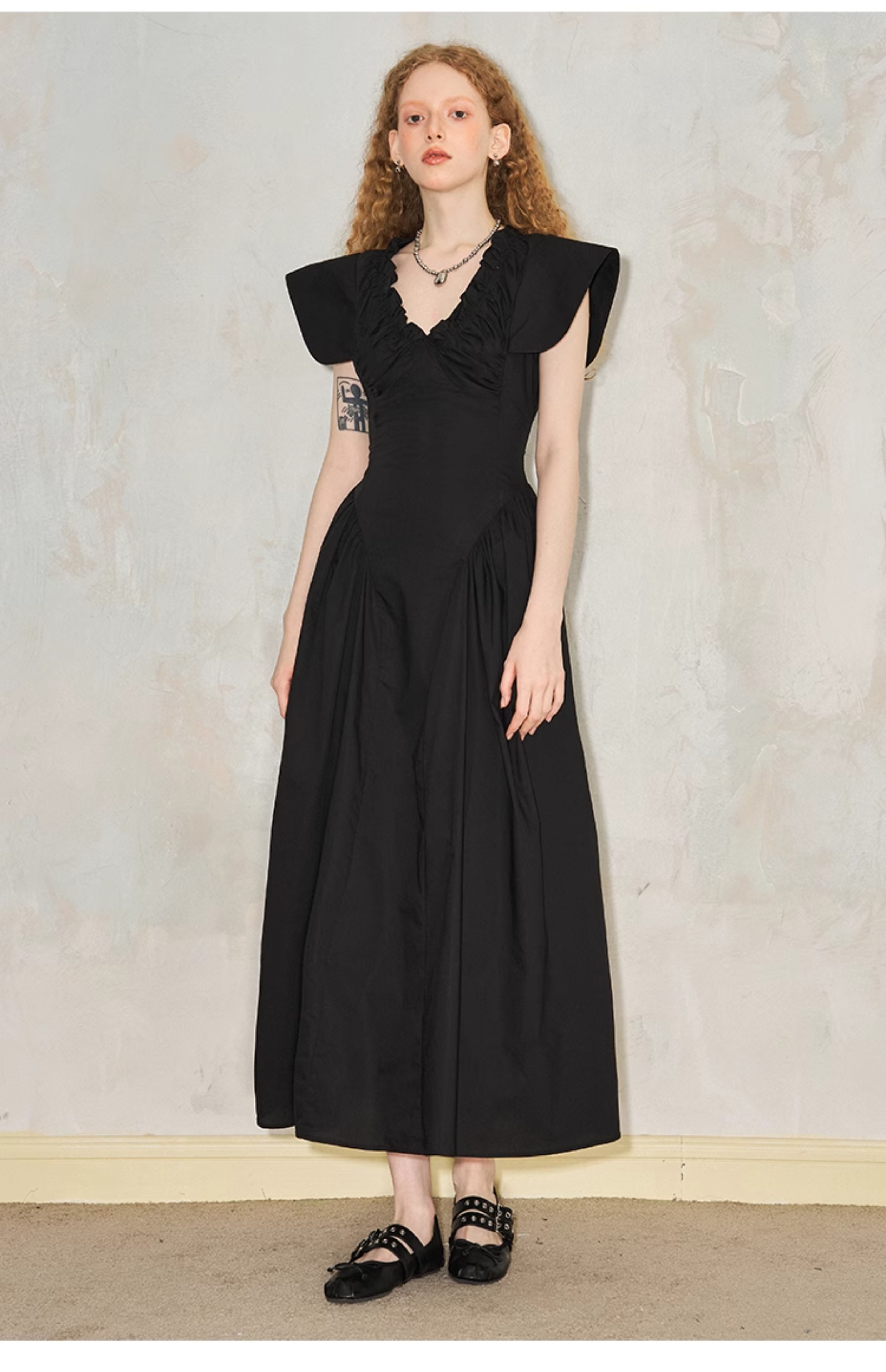 فستان مطوي بياقة على شكل حرف V وأكمام طائرة