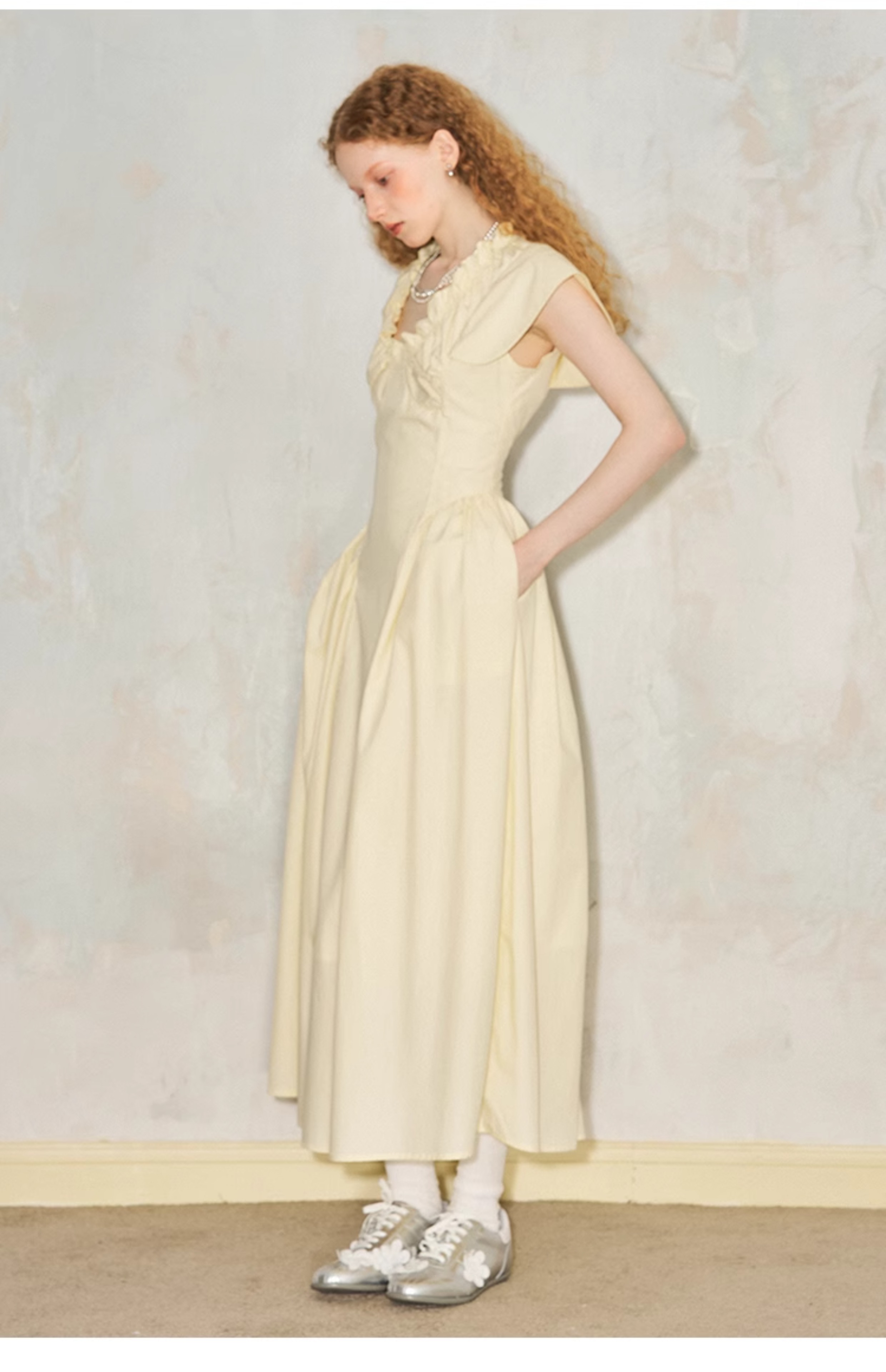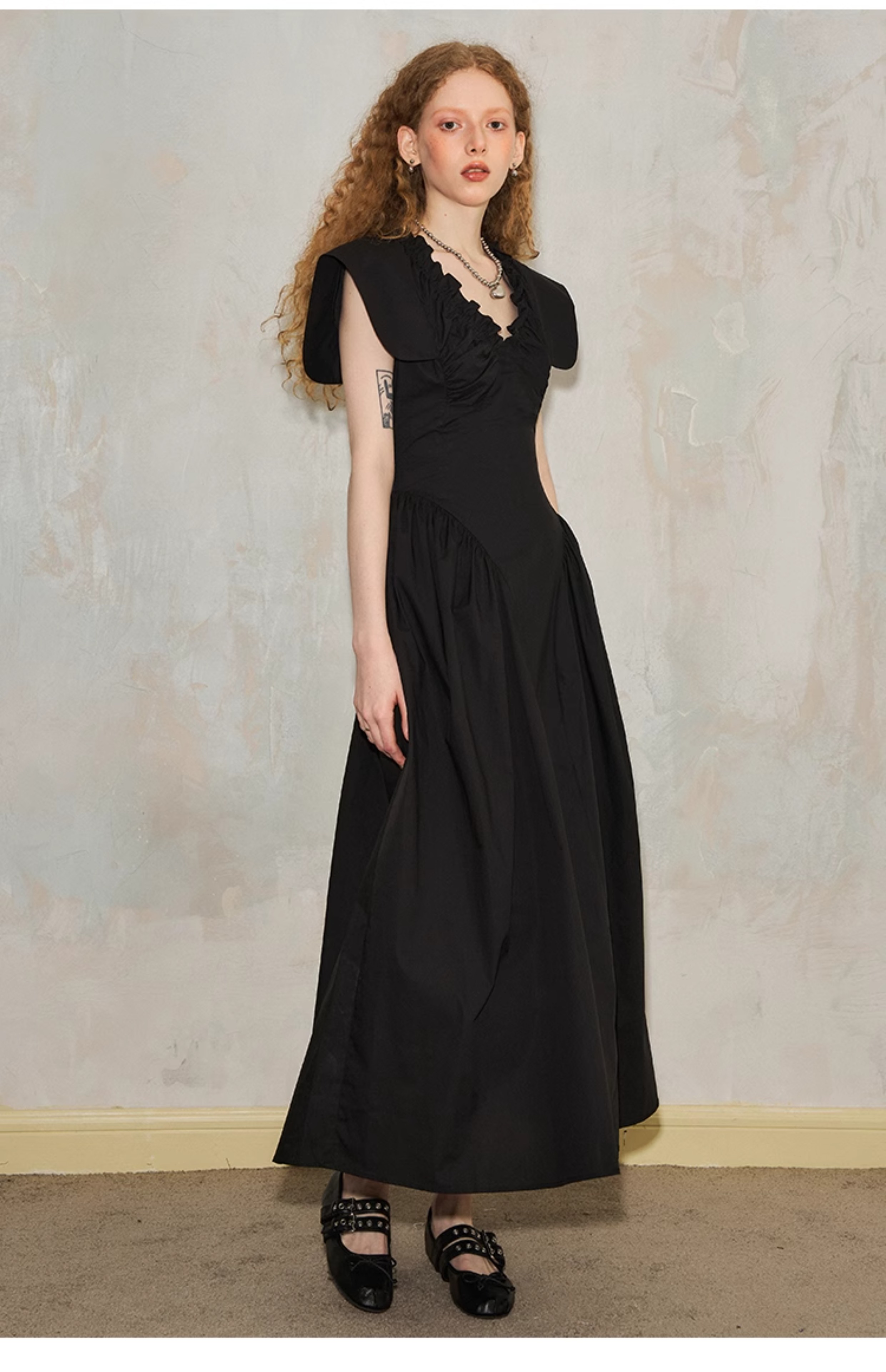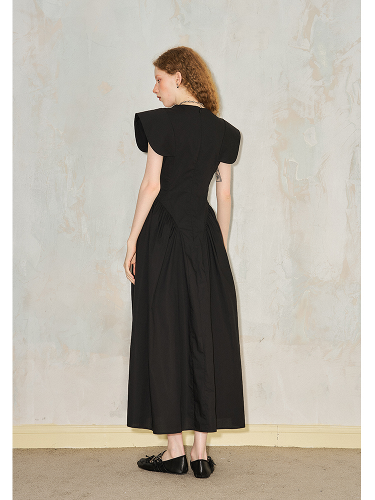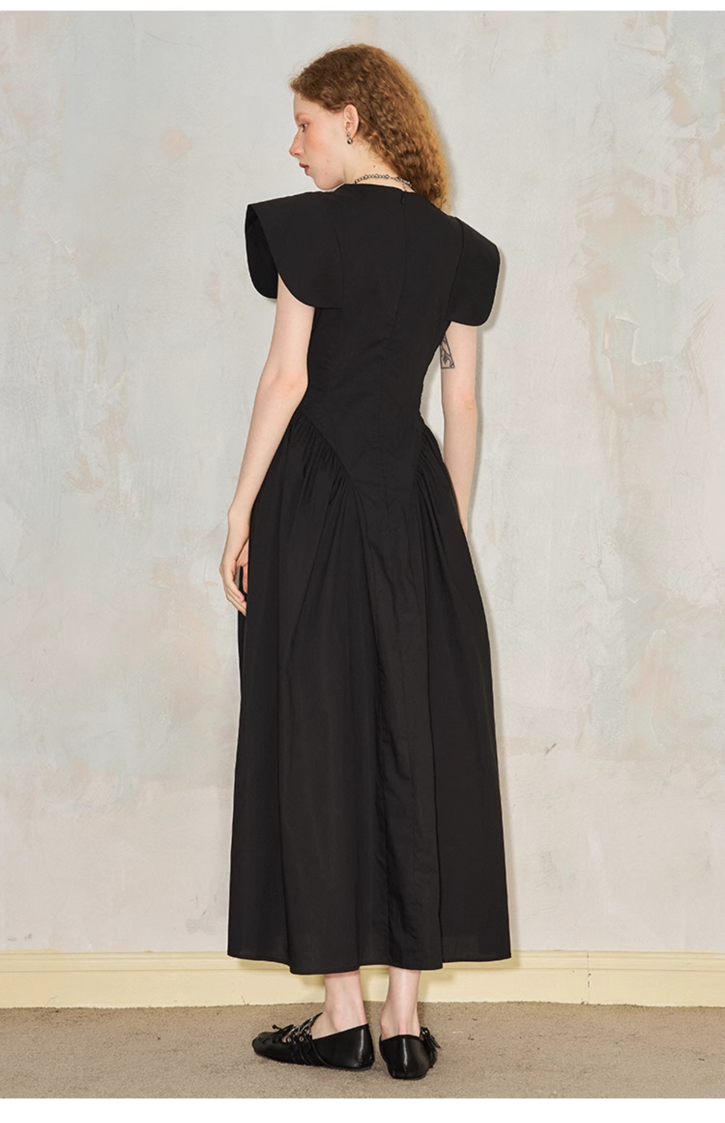 فستان مطوي بياقة على شكل حرف V وأكمام طائرة