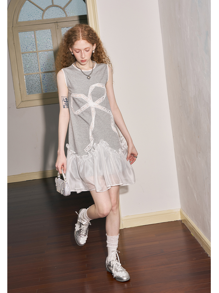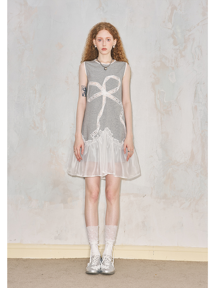 فستان بدون أكمام مطرز بفيونكة مجوفة