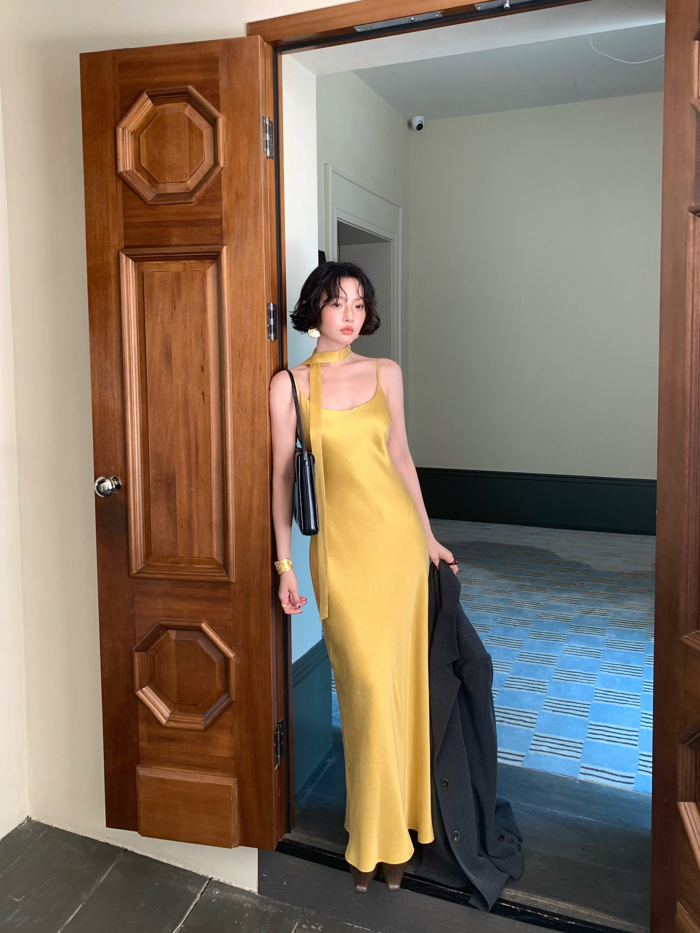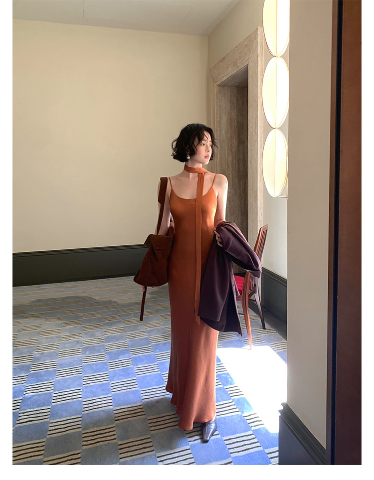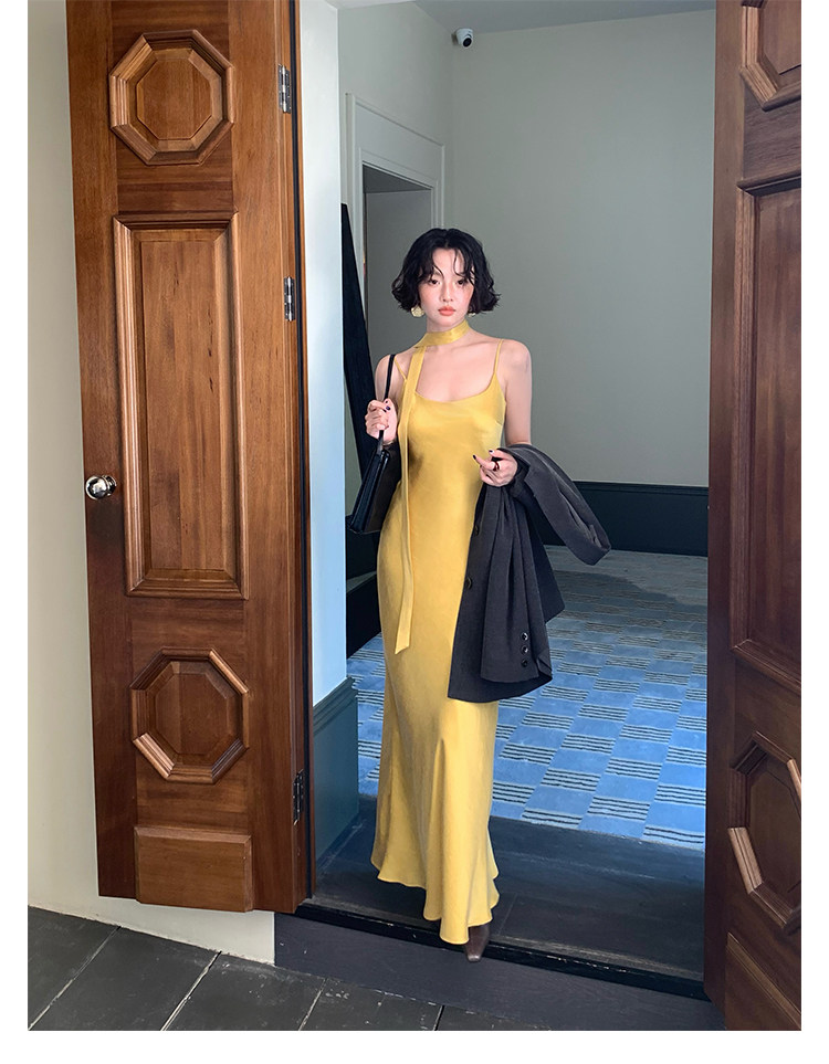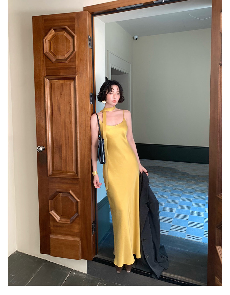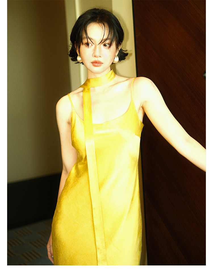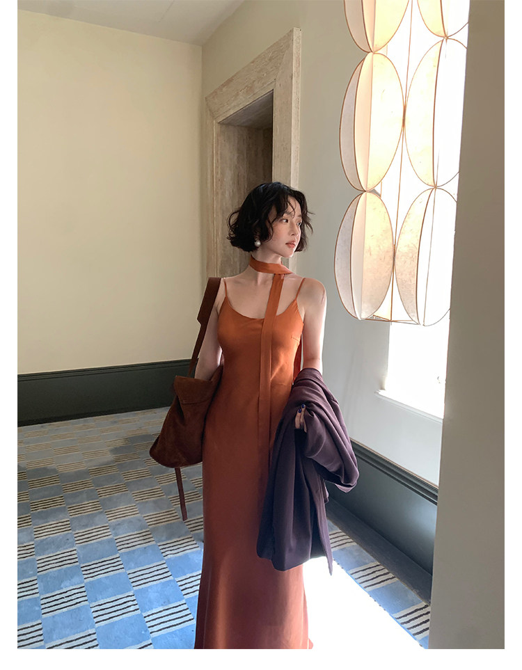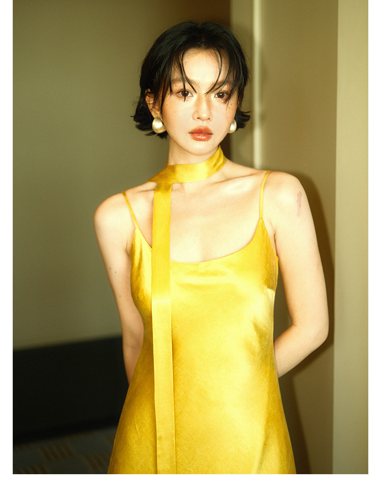 Sunlight Charm Tencel Satin Suspender Dress with Neck Tie – Retro Autumn
