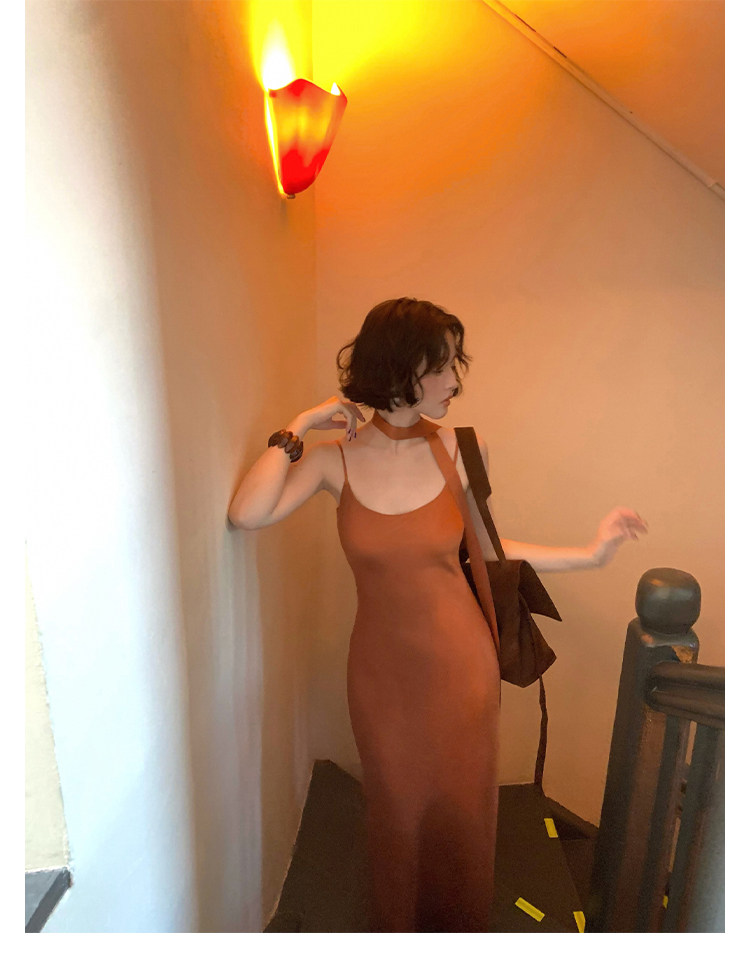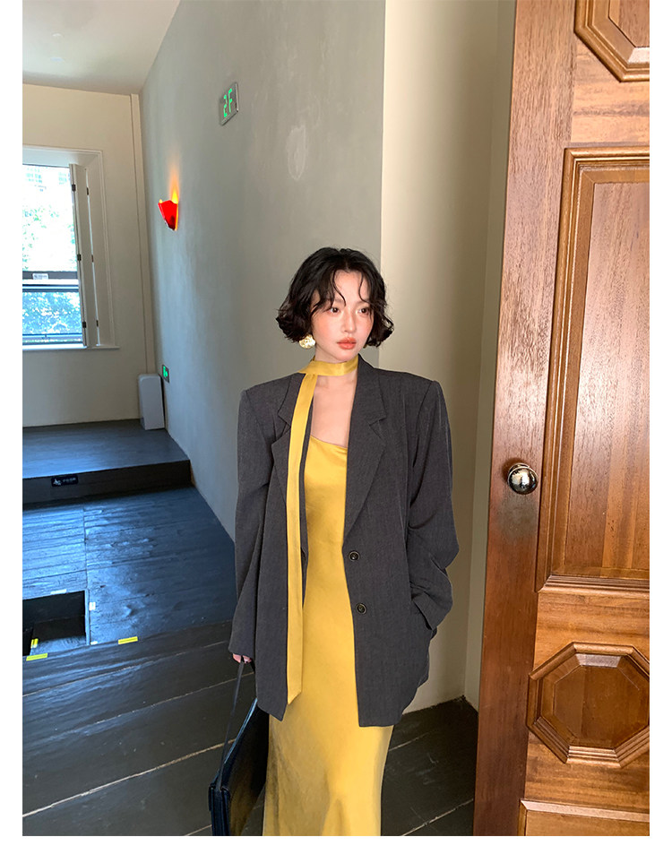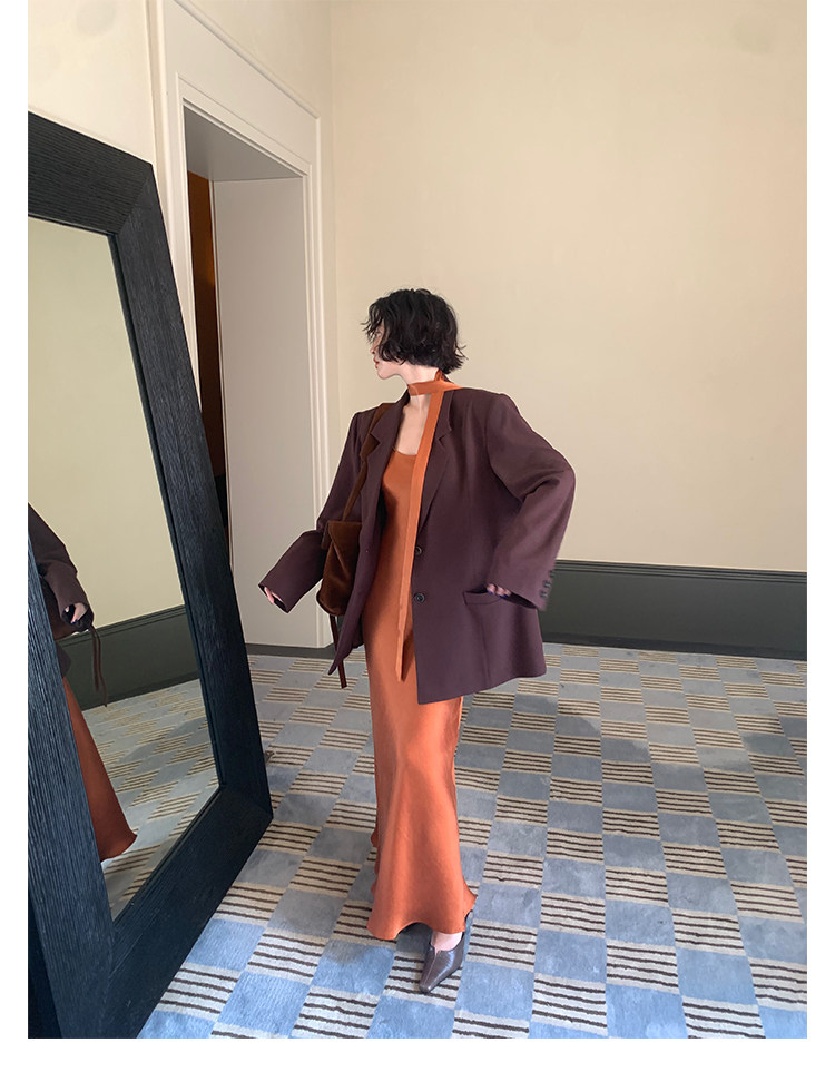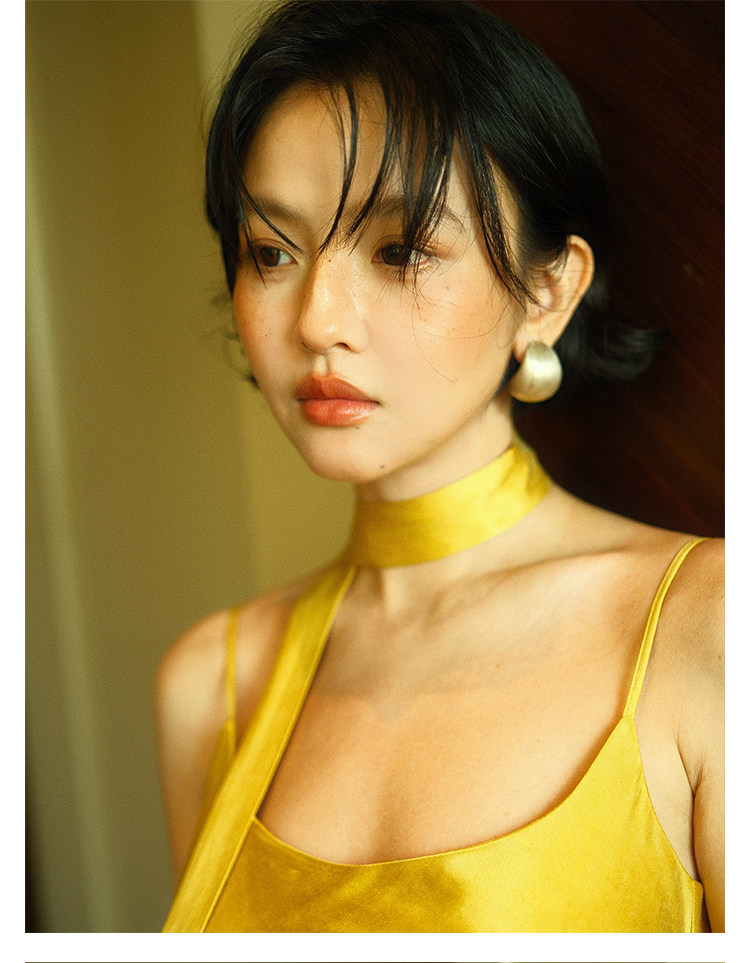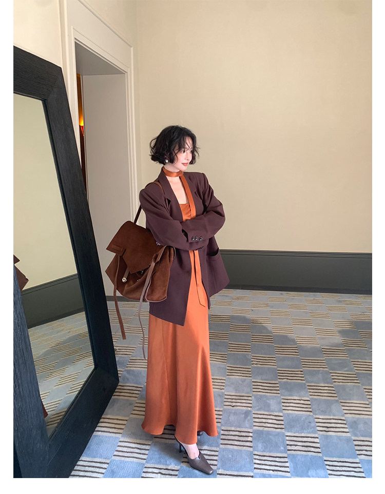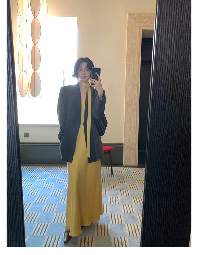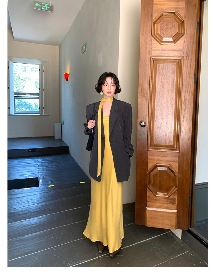 Sunlight Charm Tencel Satin Suspender Dress with Neck Tie – Retro Autumn