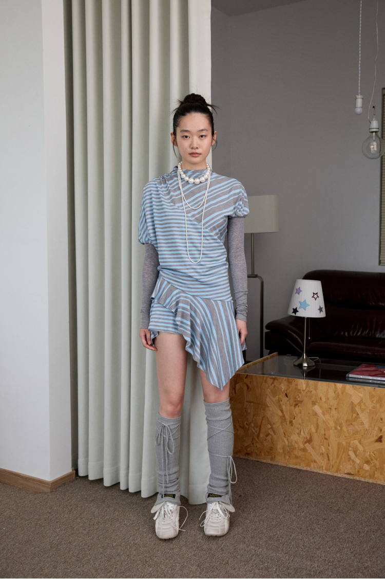 Blue & Gray Patchwork Dress – Contrast Puff Sleeve Long Sleeve Style