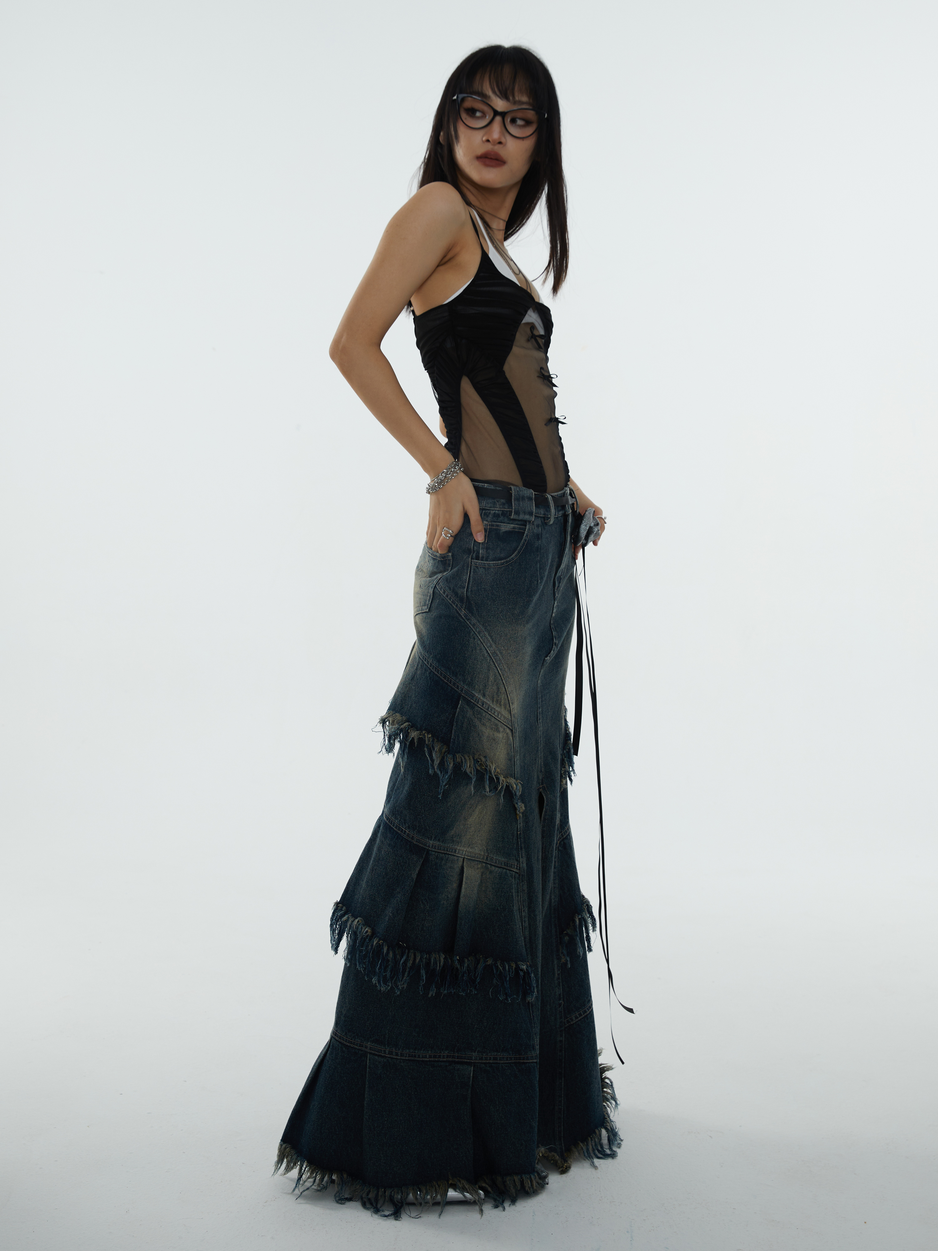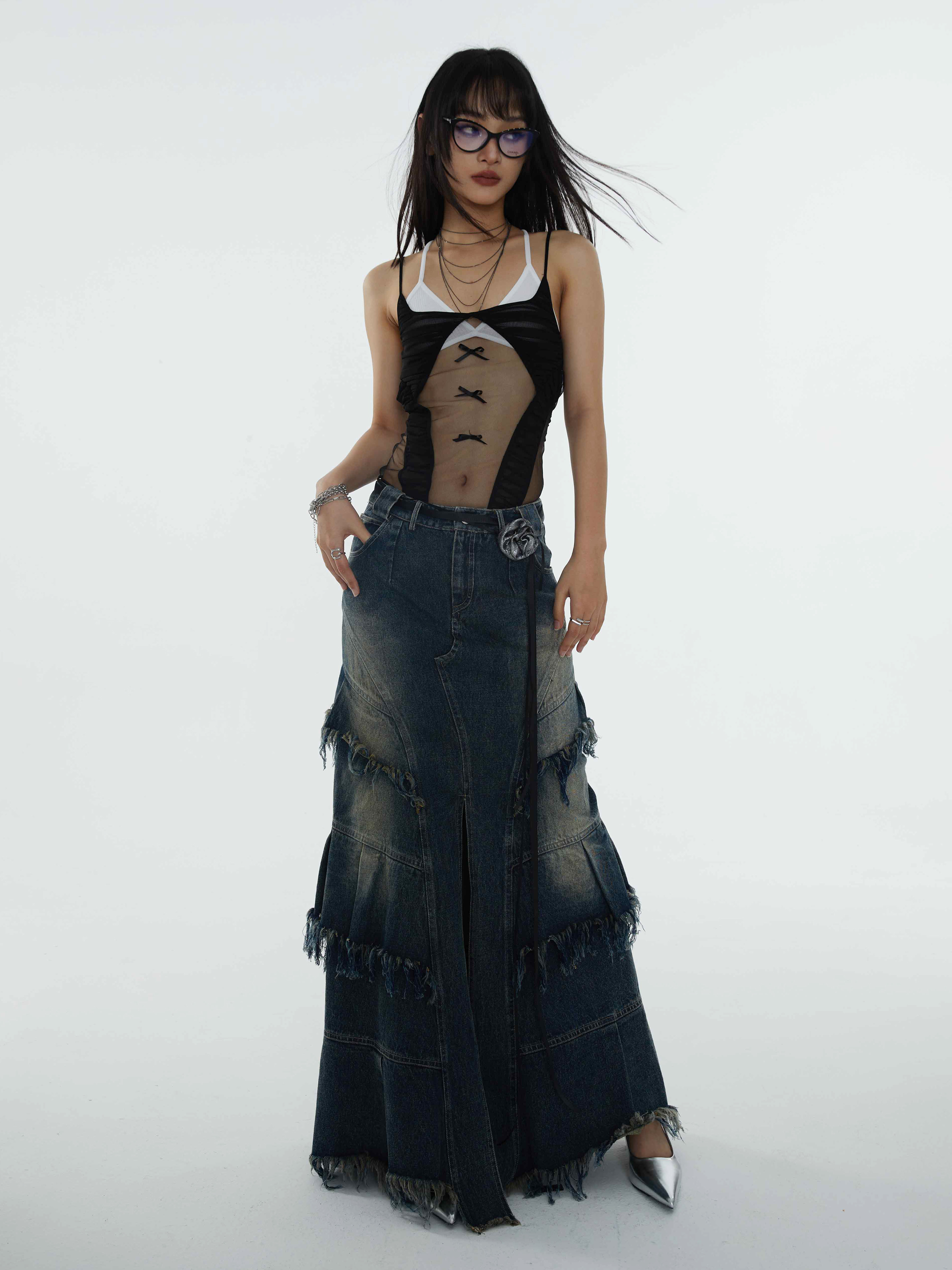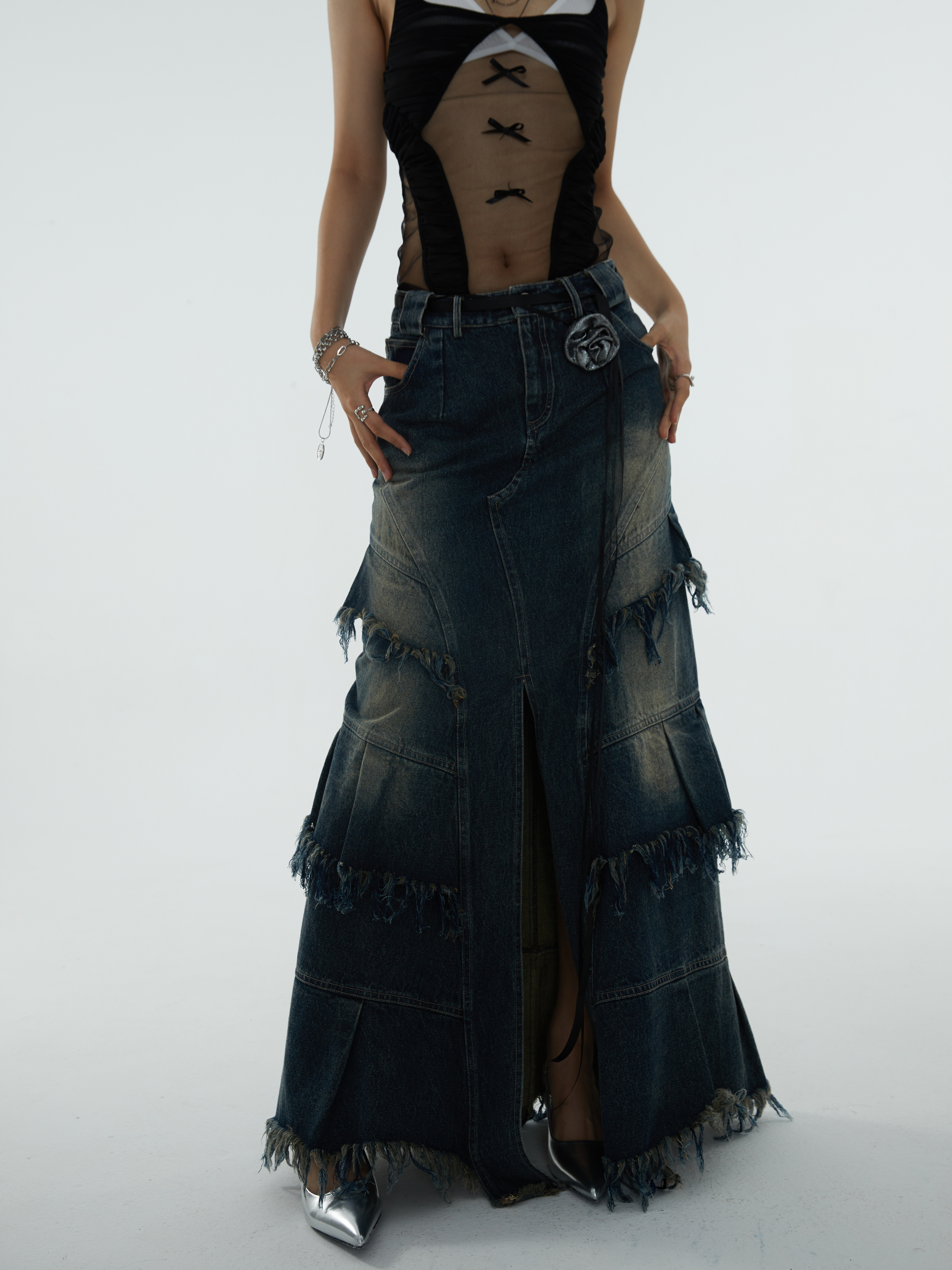 সুপার লং এ-শেপড ডিস্ট্রেসড ডেনিম স্কার্ট