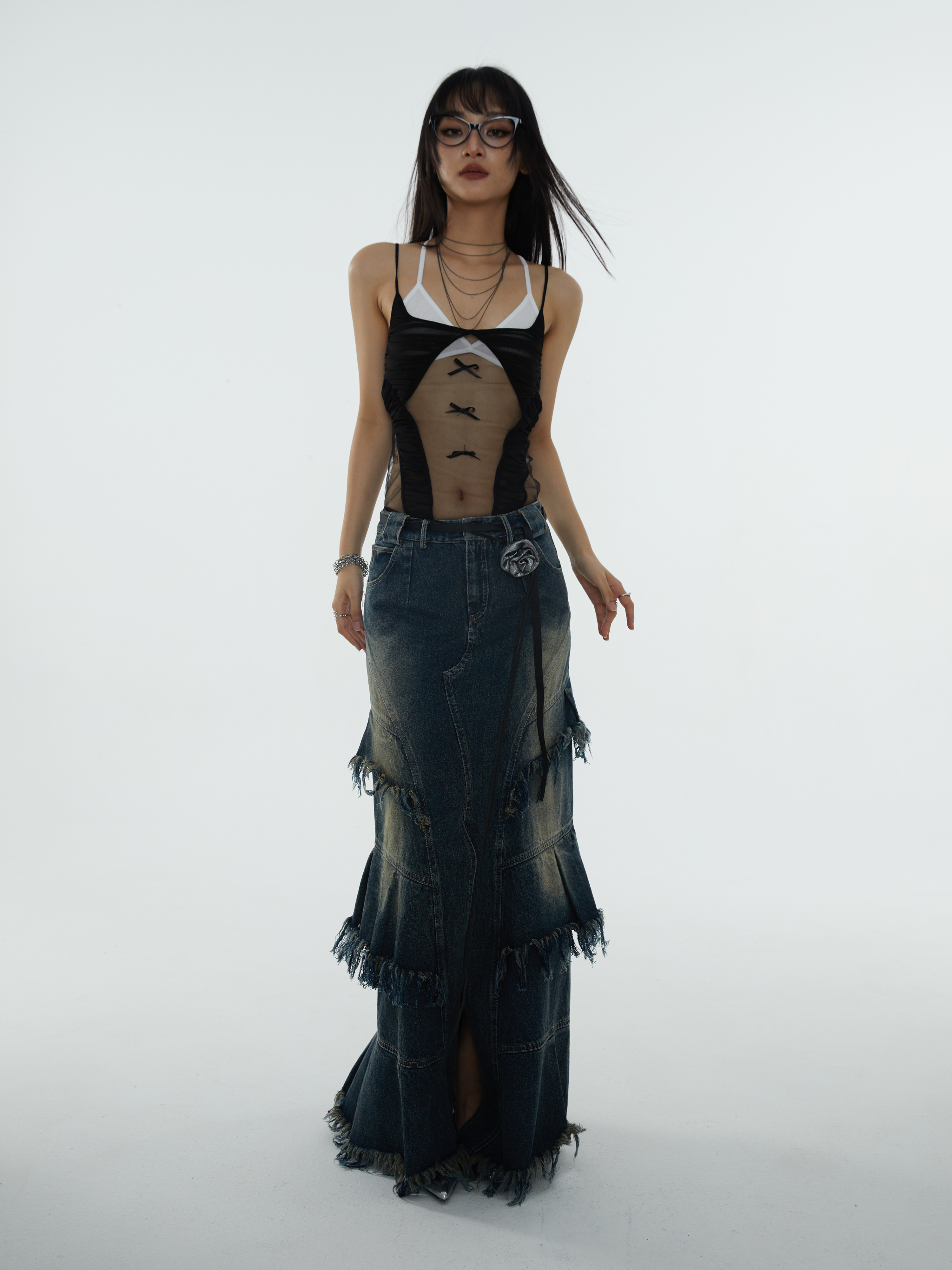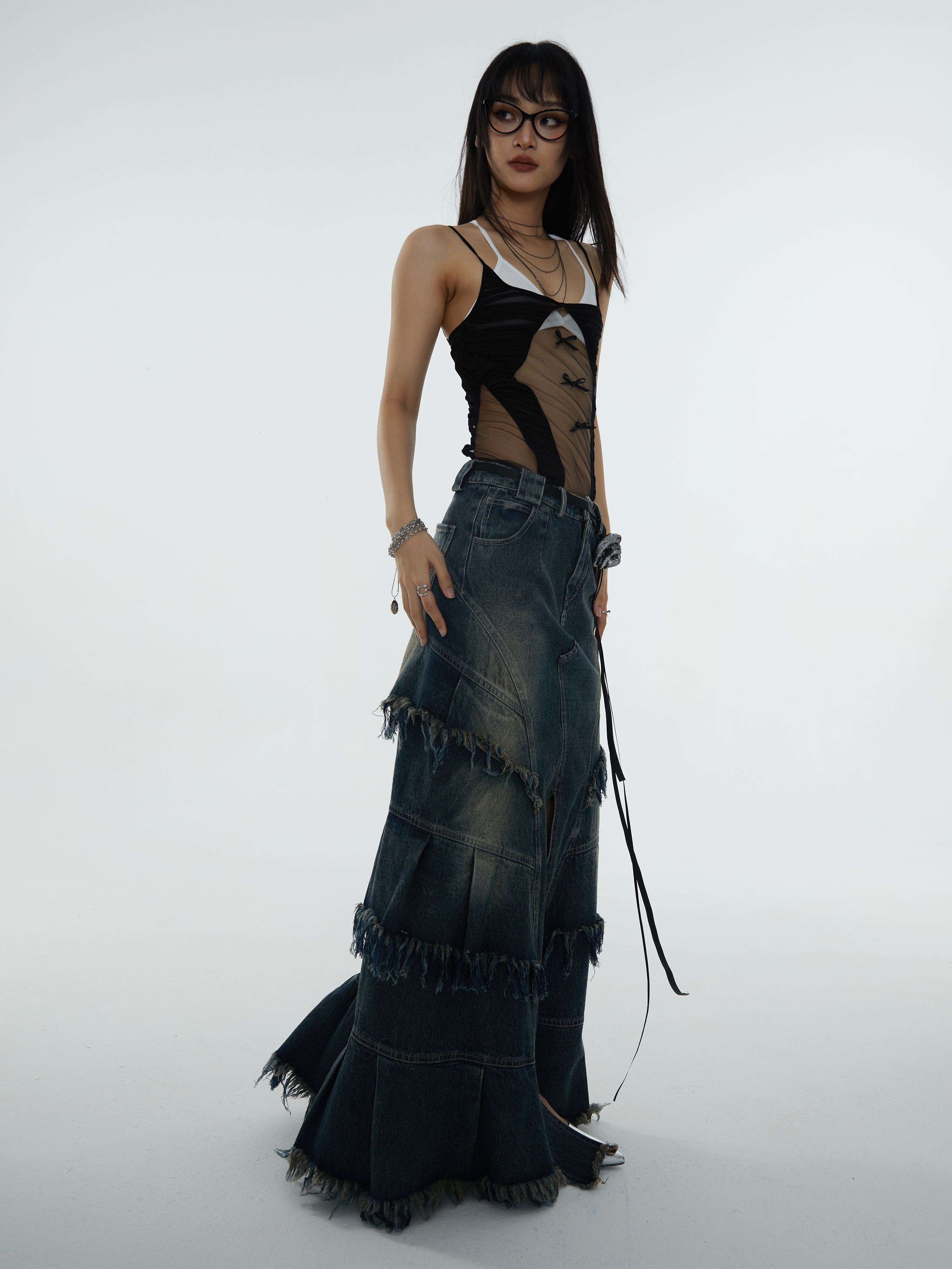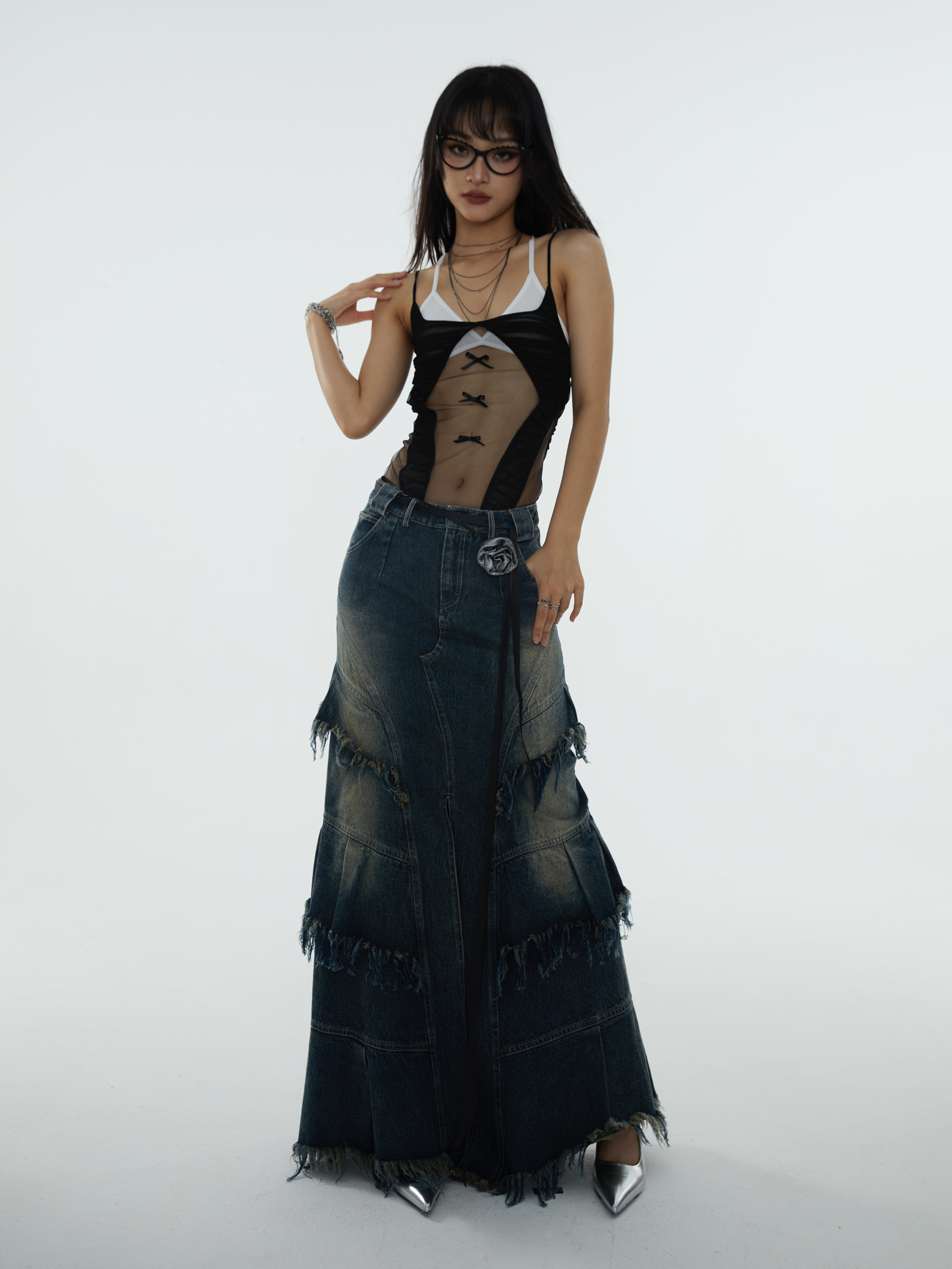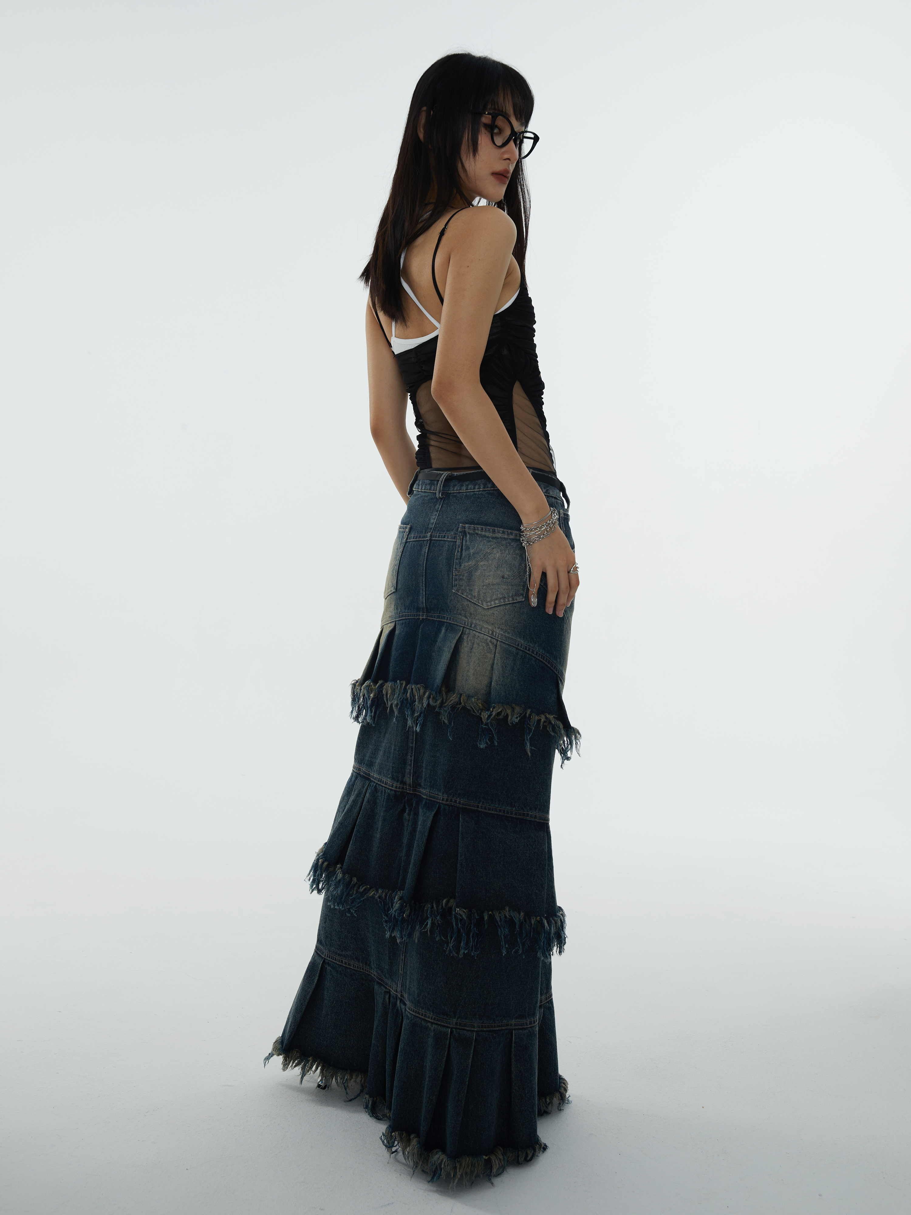 সুপার লং এ-শেপড ডিস্ট্রেসড ডেনিম স্কার্ট