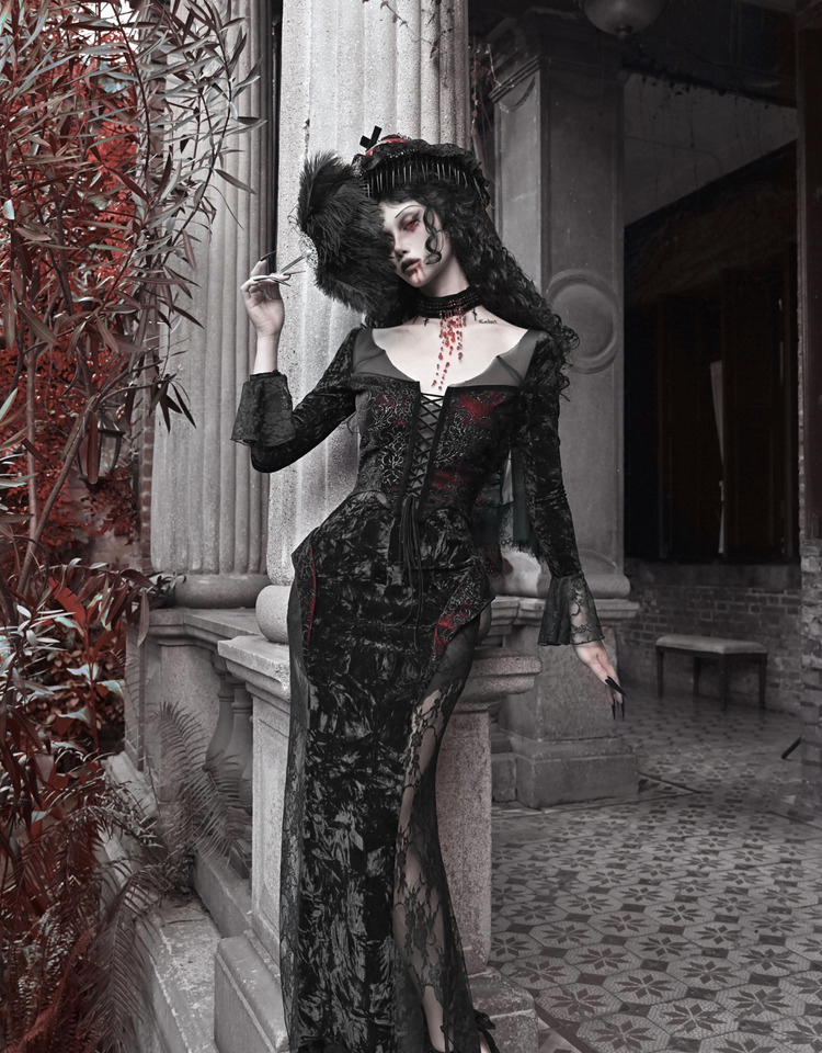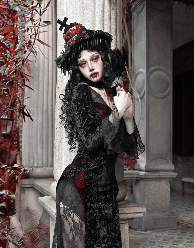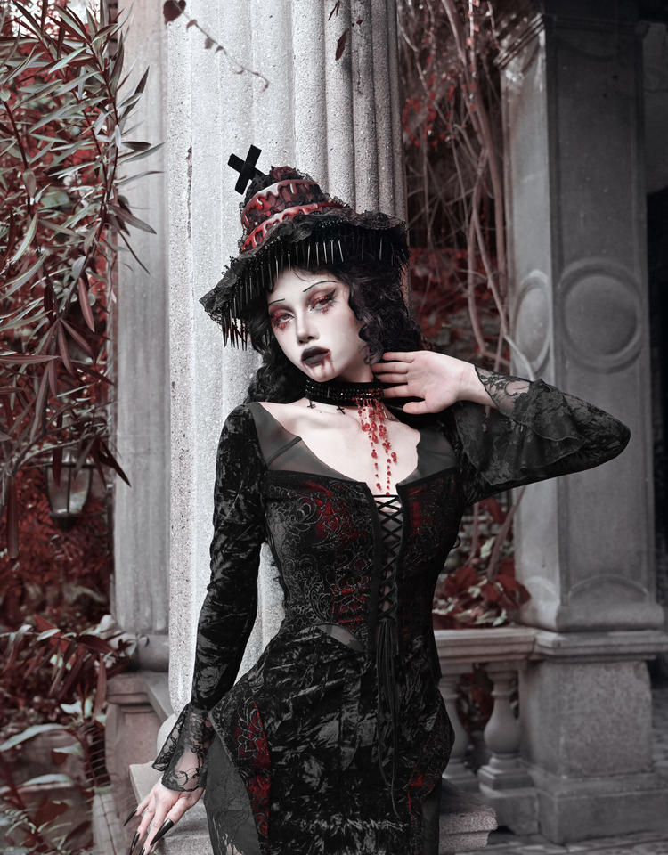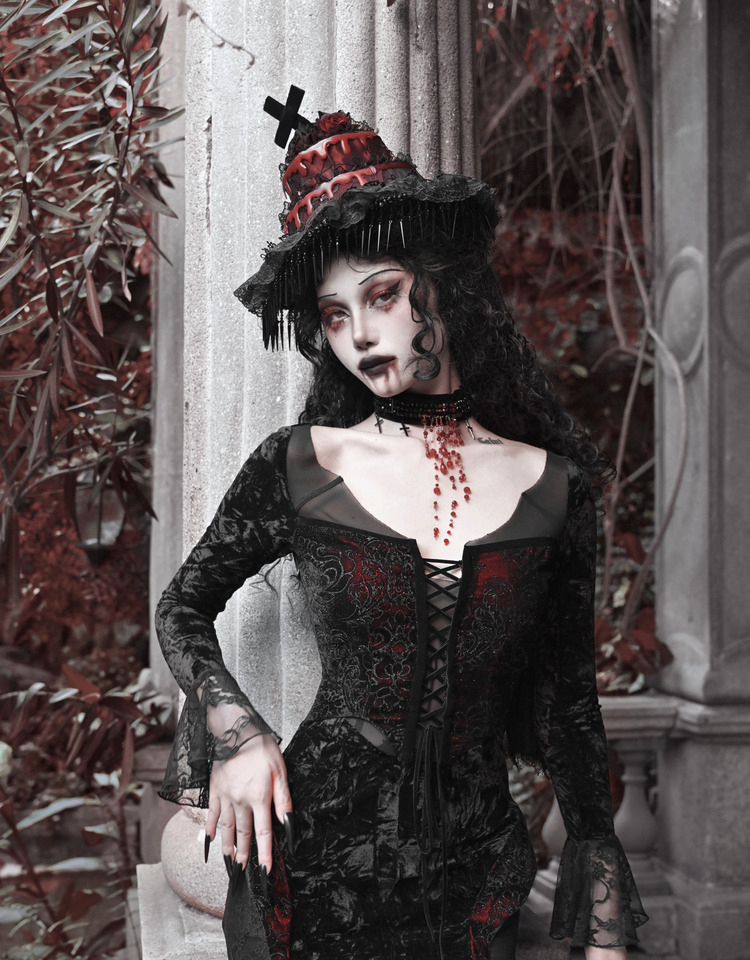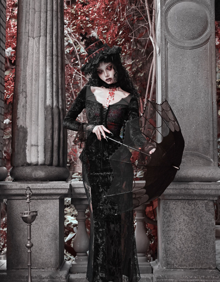Crimson Gothic Velvet Dress – Slim Bat-Sleeve Glitter Fishtail Gown