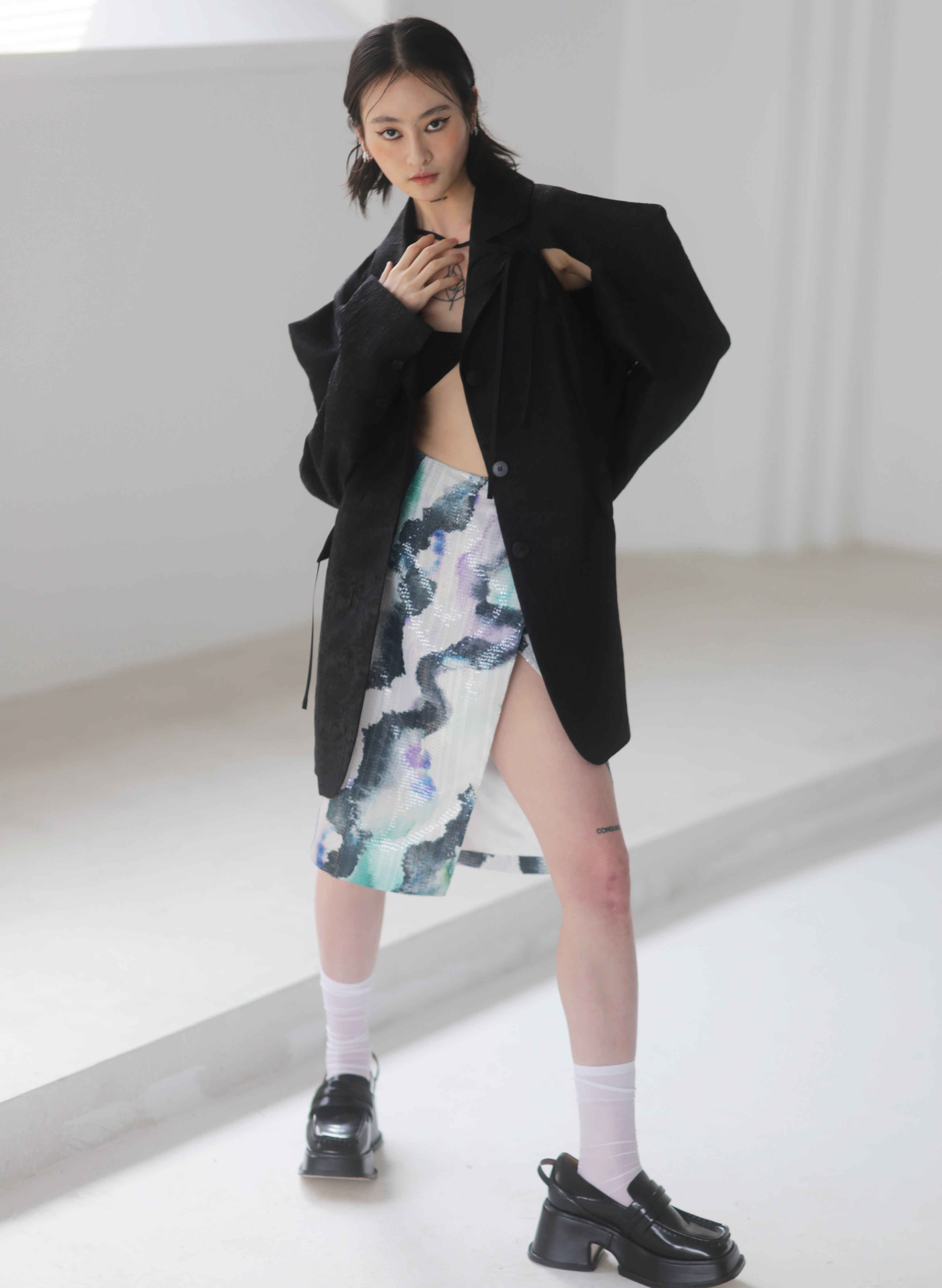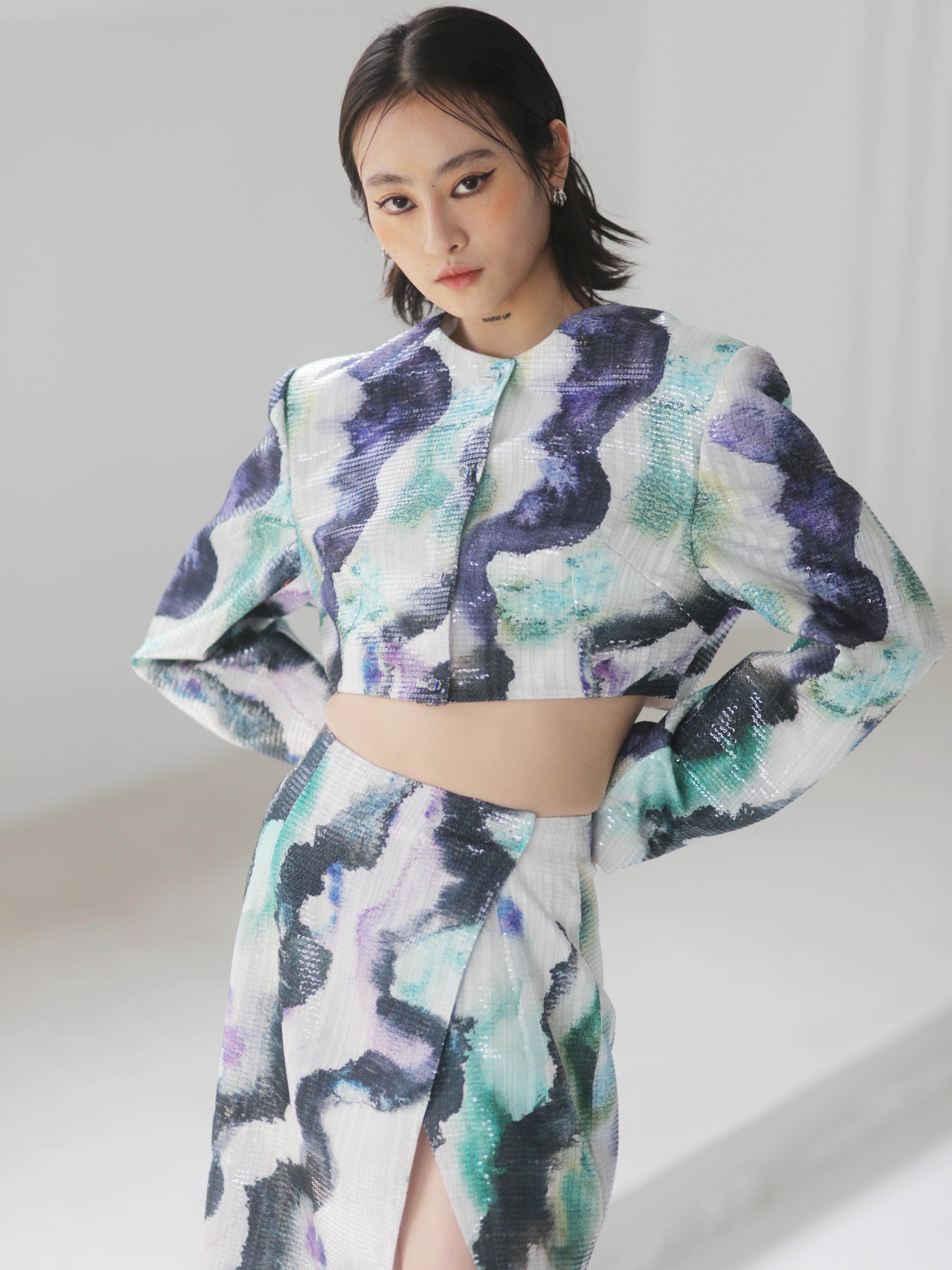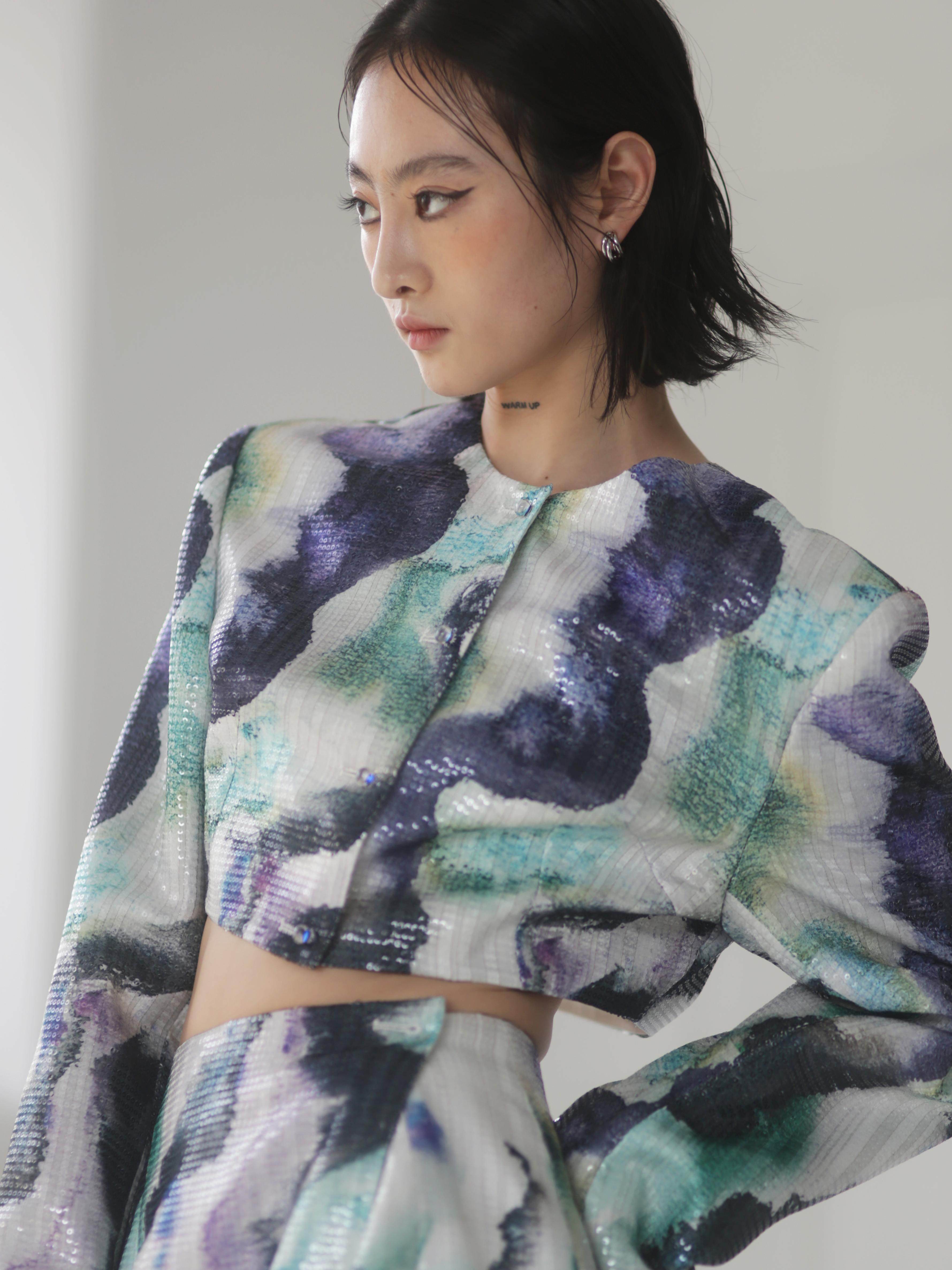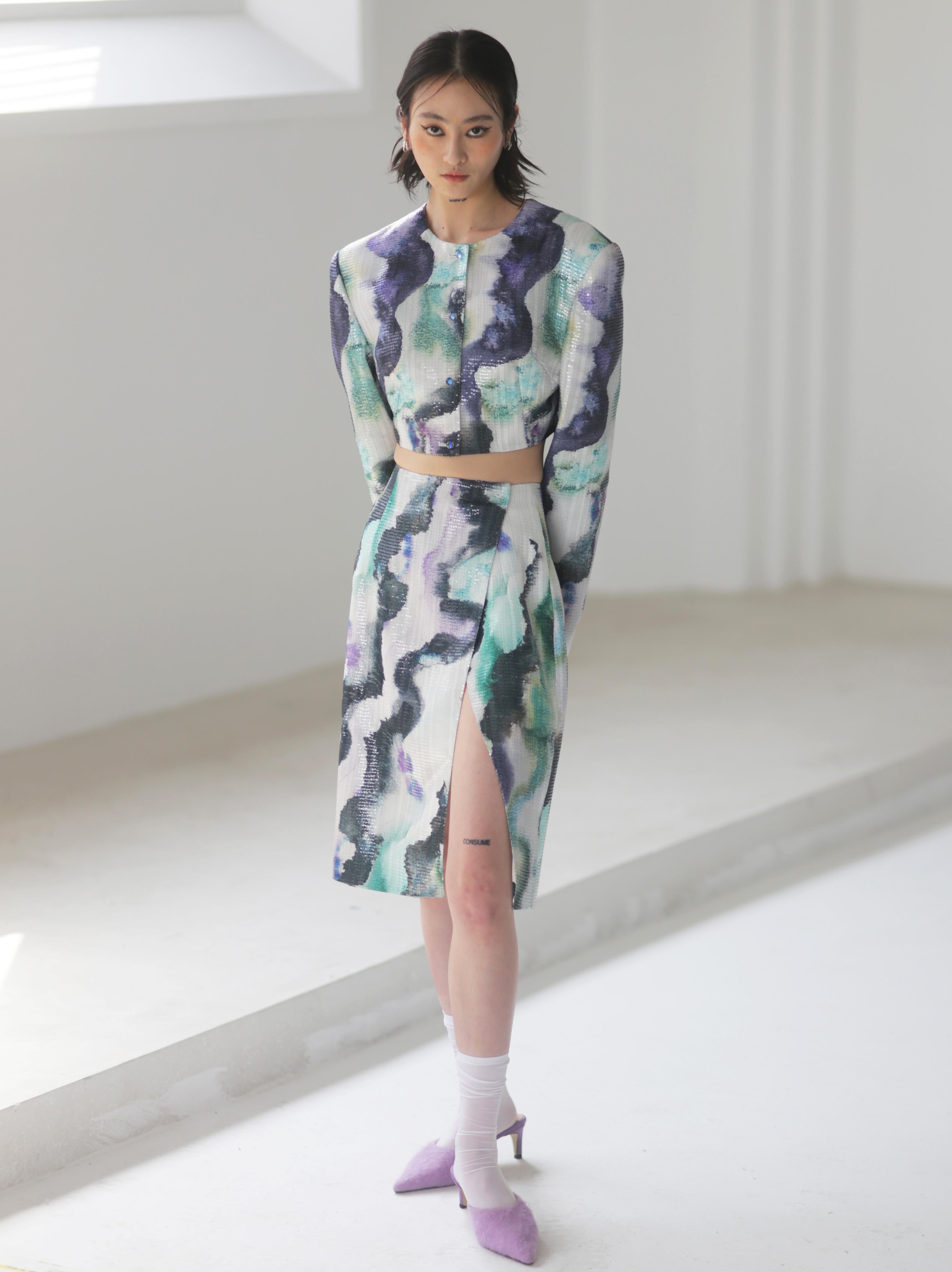 জলরঙের হ্যালো প্রিন্টেড সিকুইন সাইড স্লিট স্কার্ট