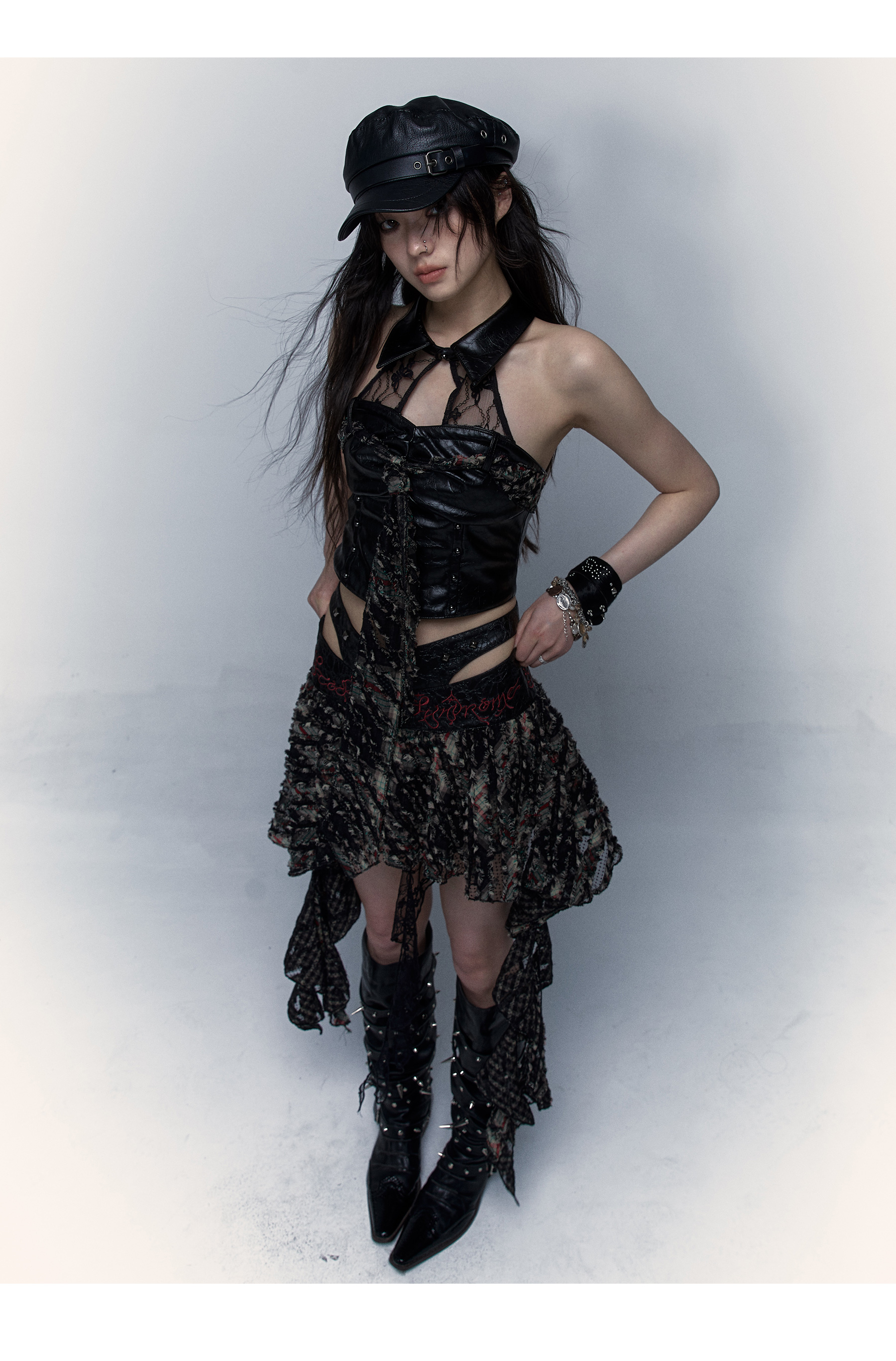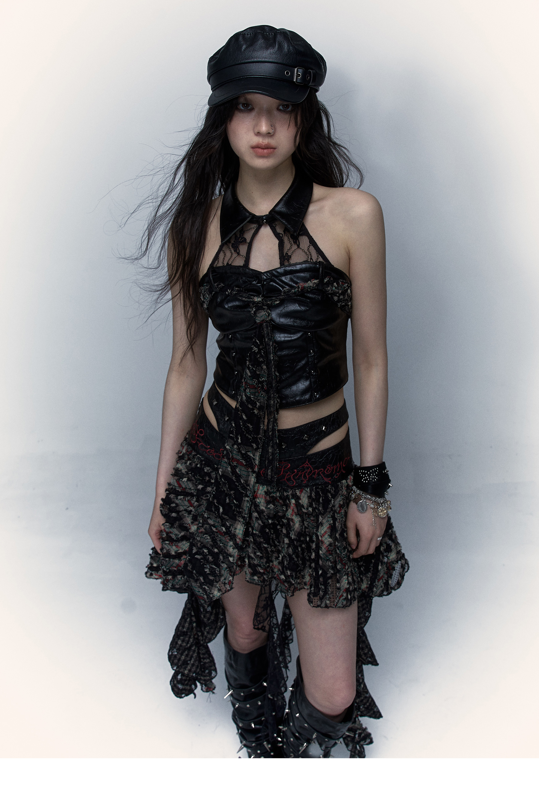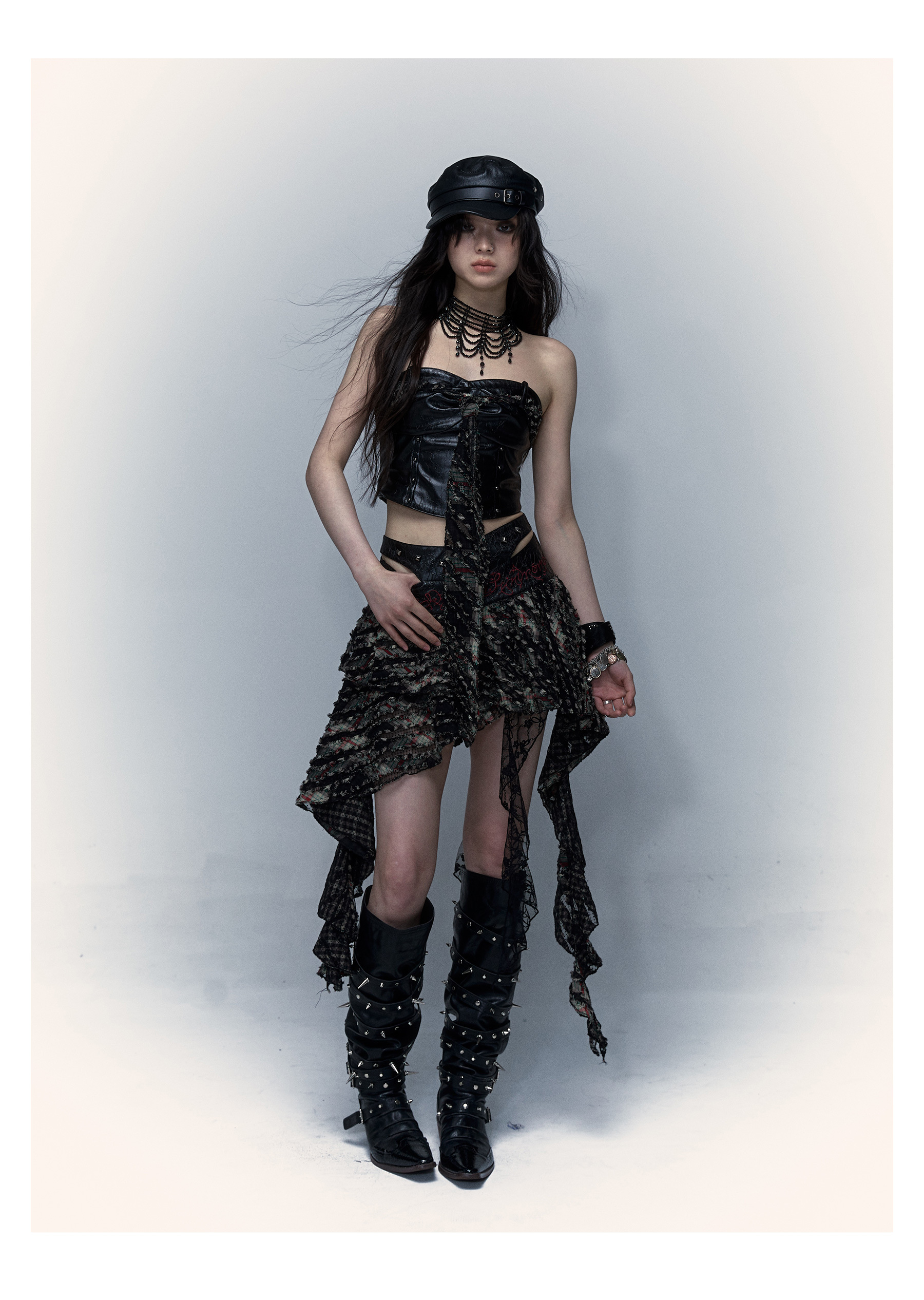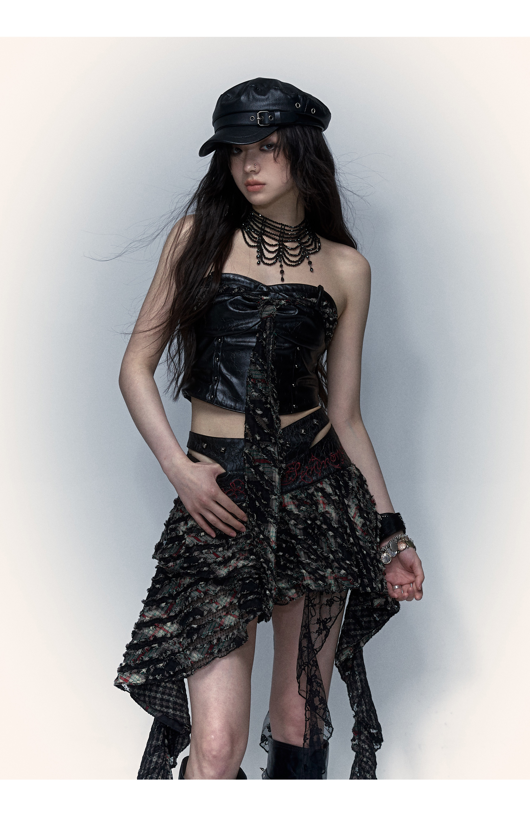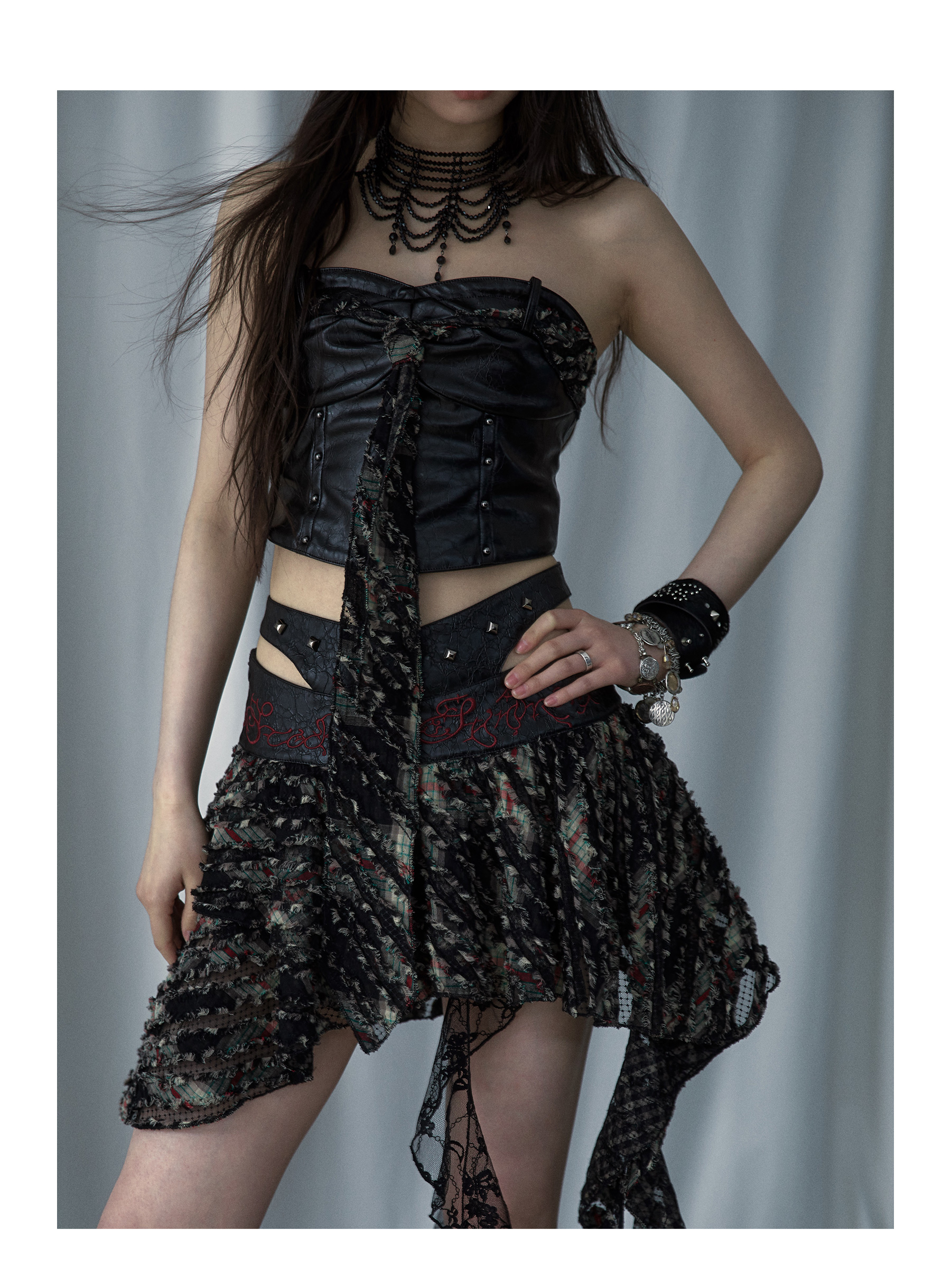 রক প্যাচওয়ার্ক লেদার টিউব টপ স্কার্ট | রেট্রো হেভি ইন্ডাস্ট্রি পাঙ্ক ডিজাইন