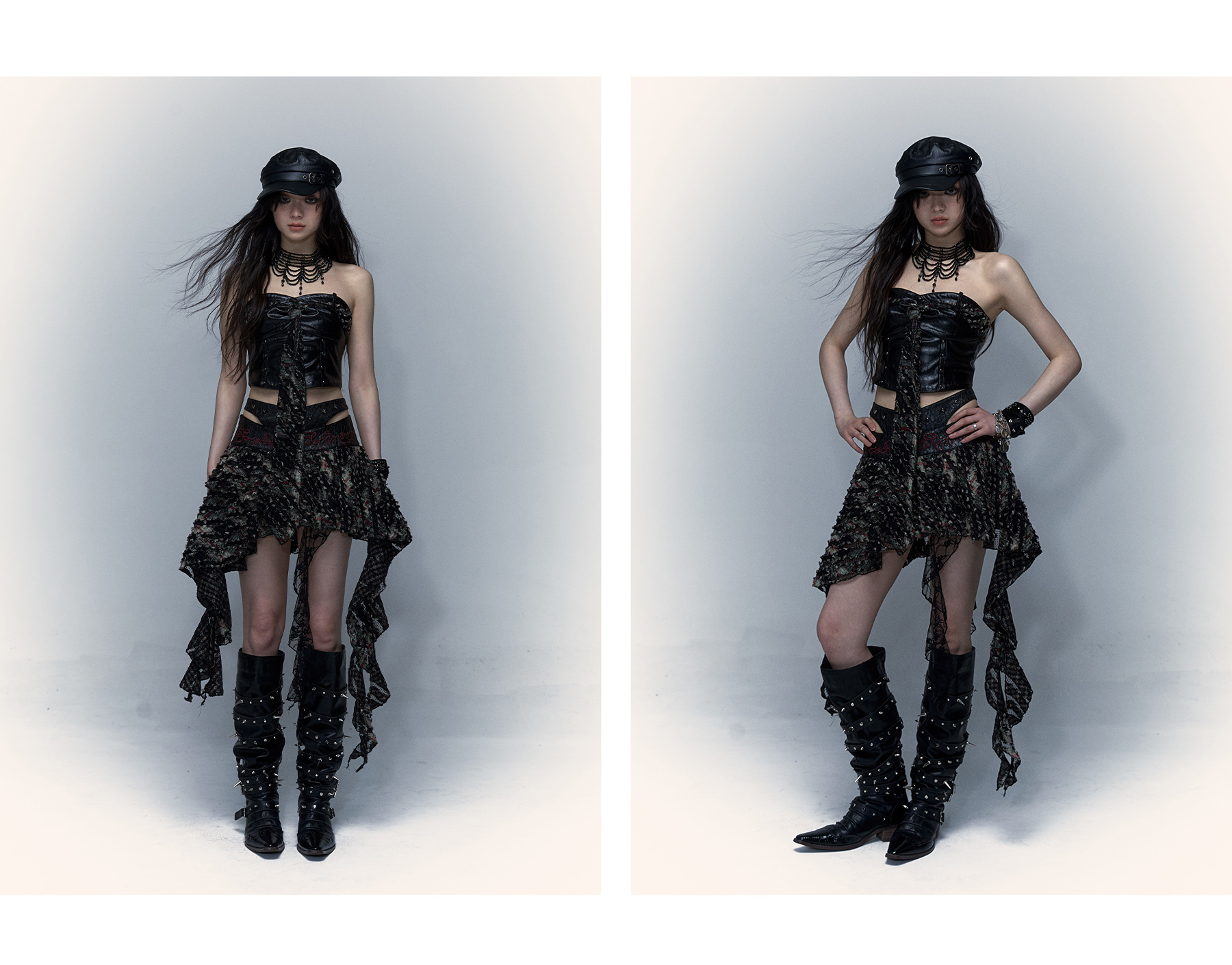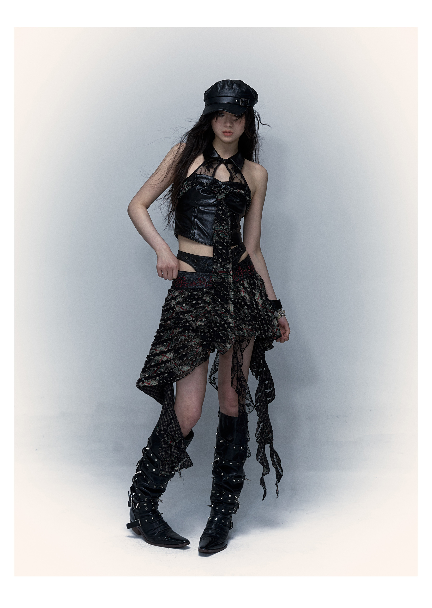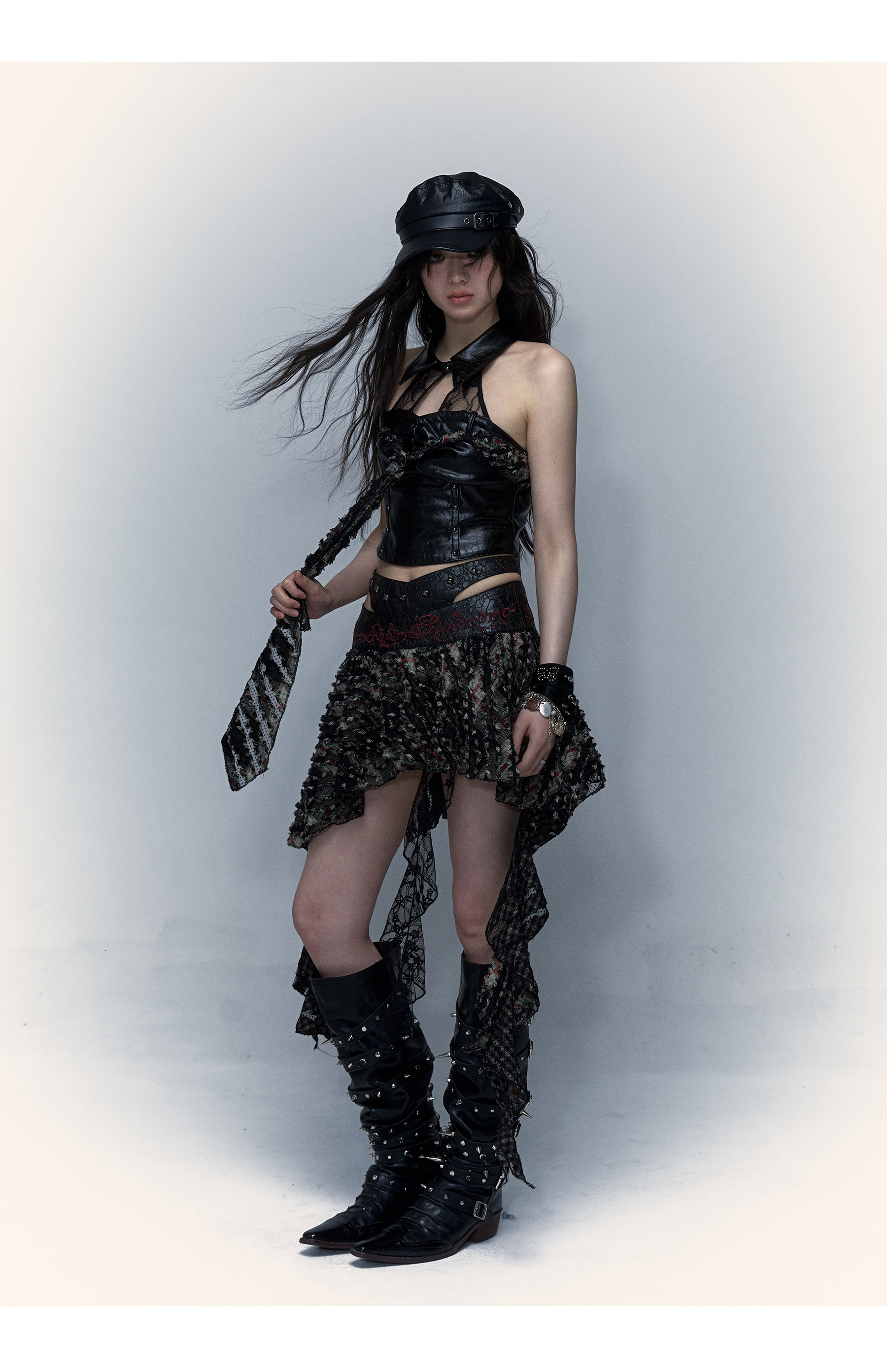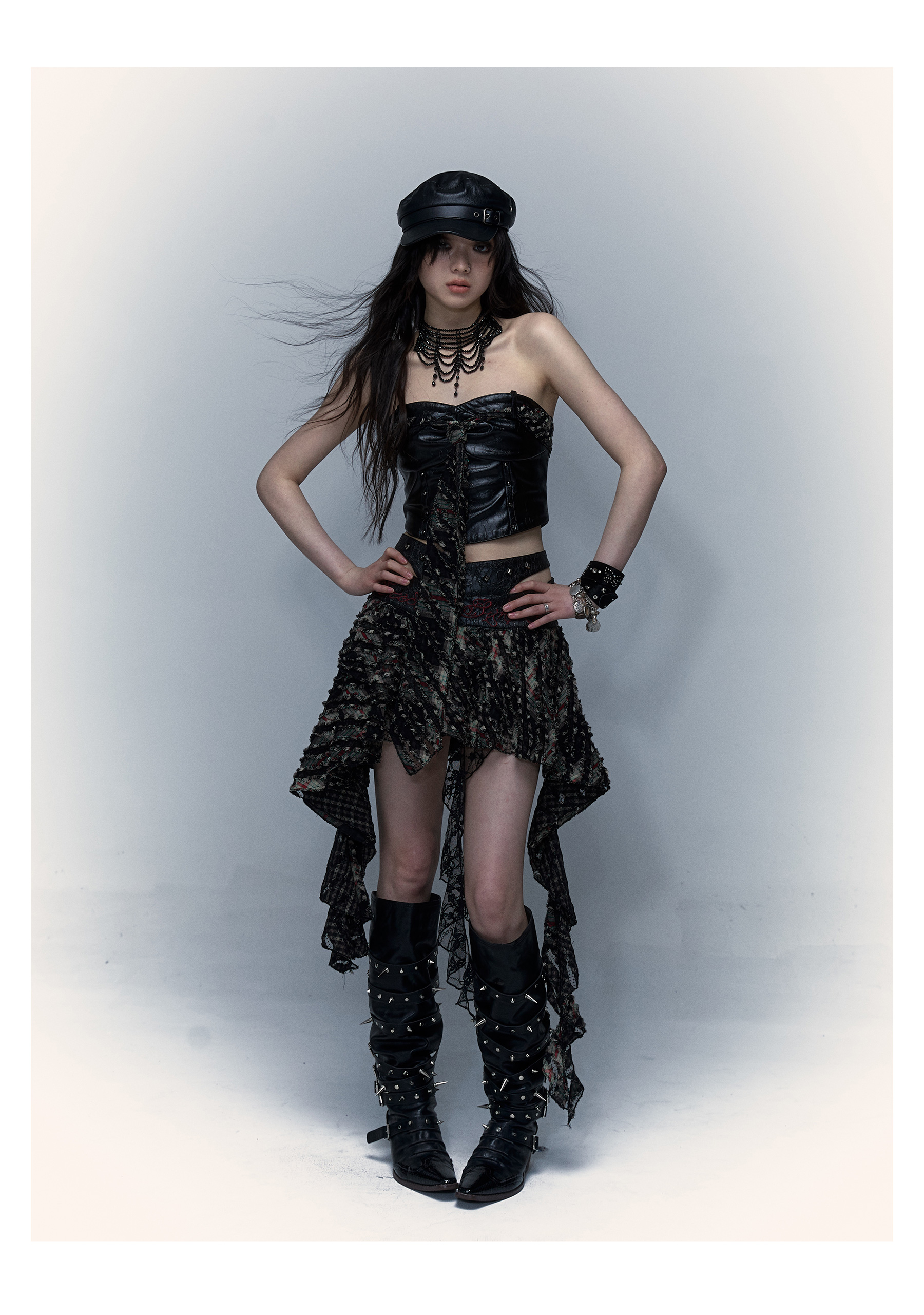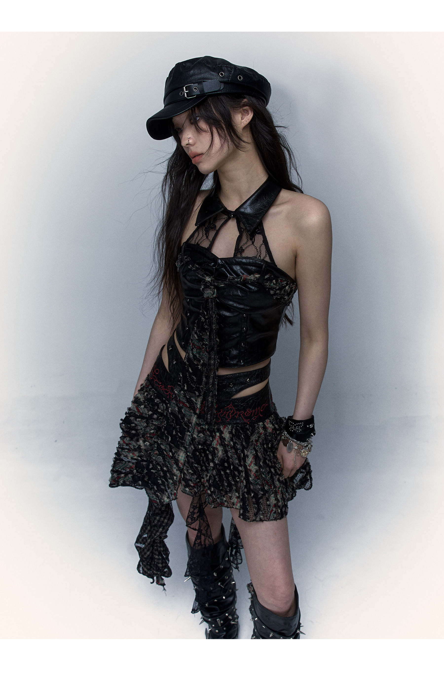 রক প্যাচওয়ার্ক লেদার টিউব টপ স্কার্ট | রেট্রো হেভি ইন্ডাস্ট্রি পাঙ্ক ডিজাইন