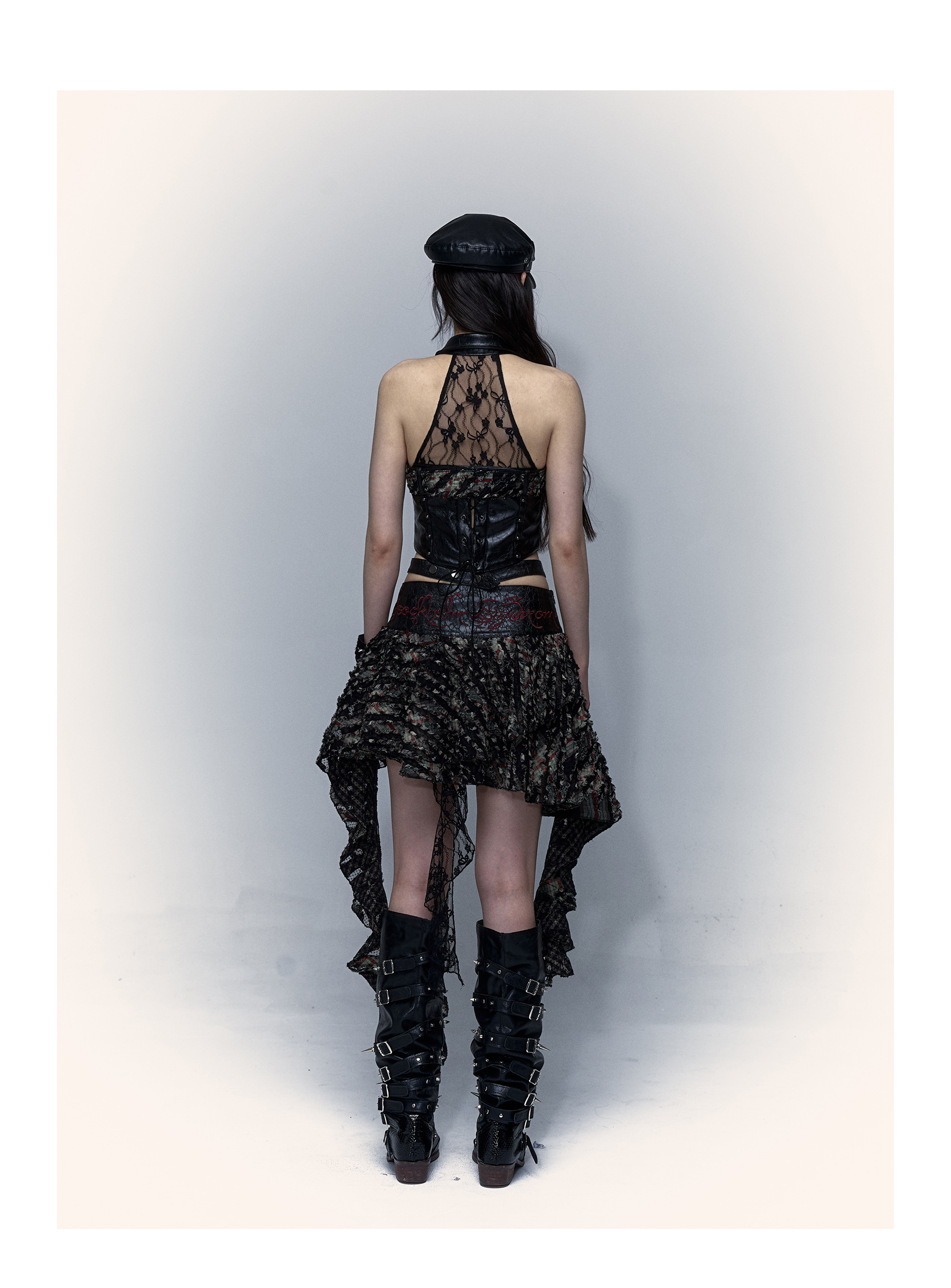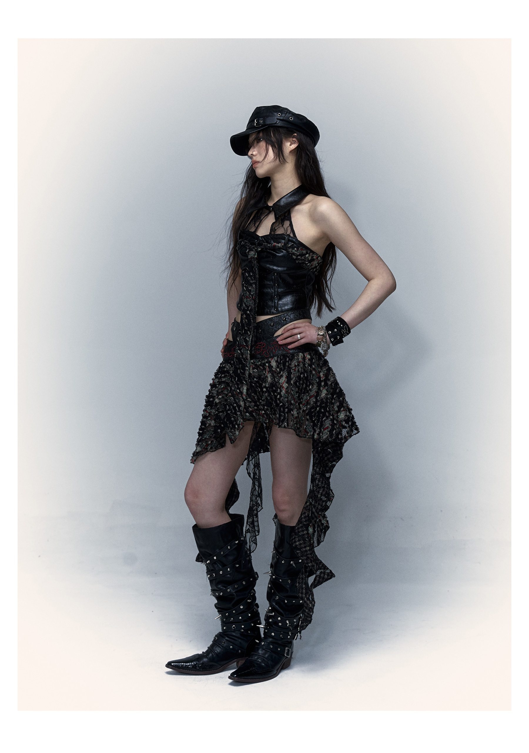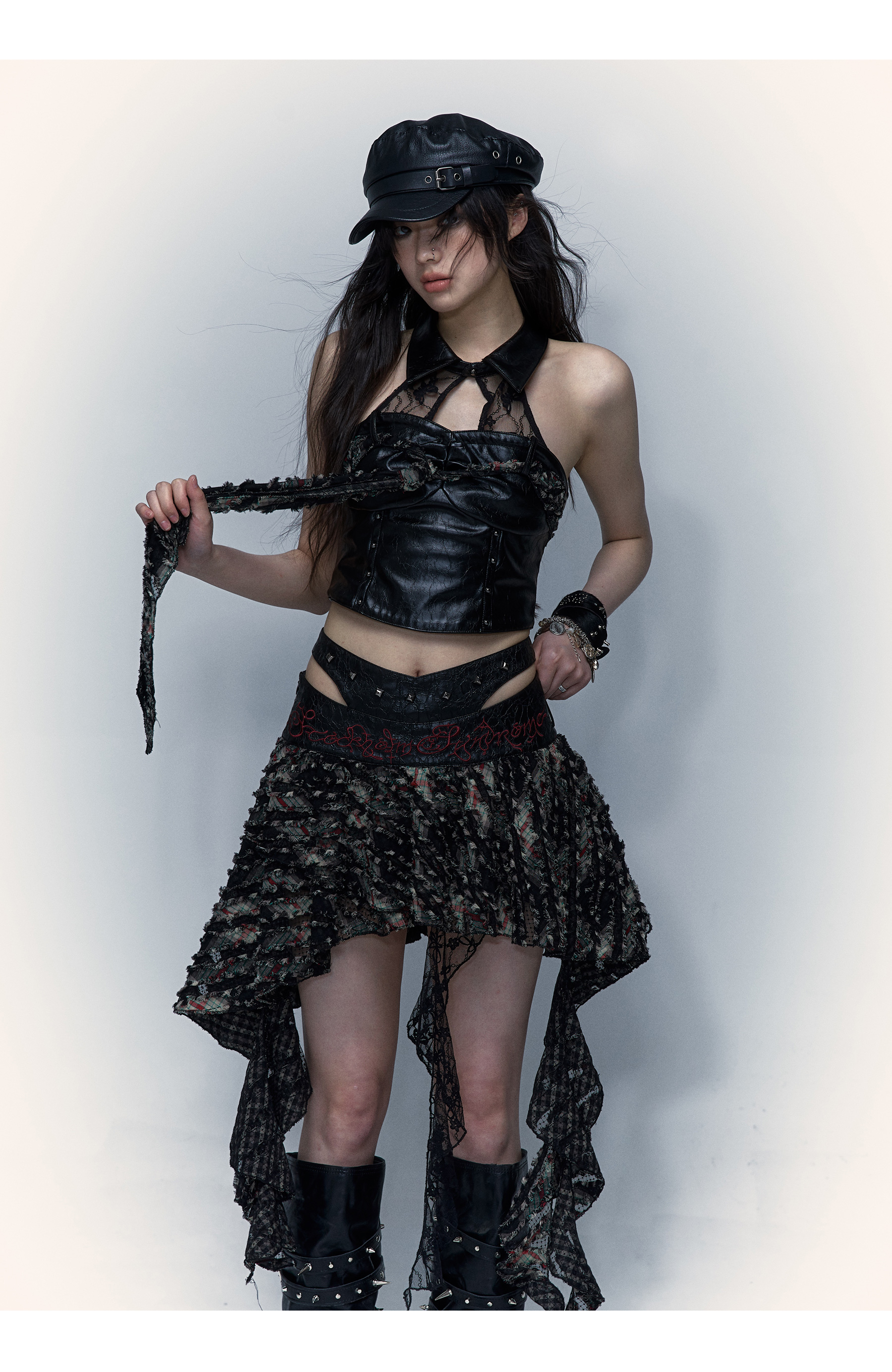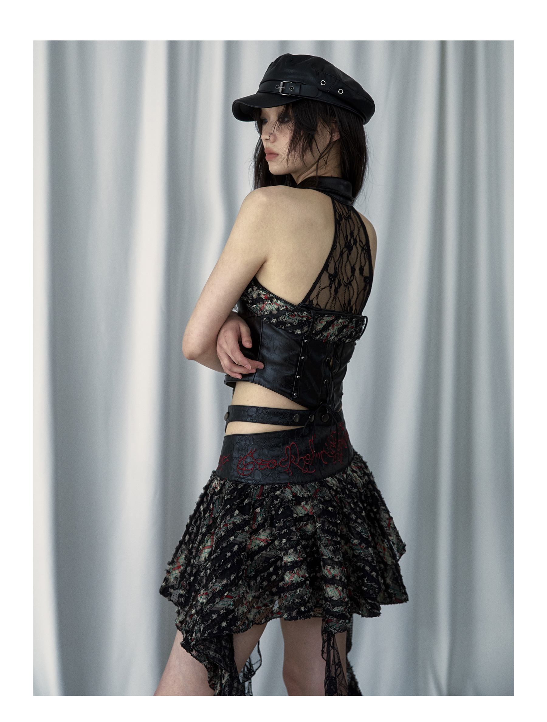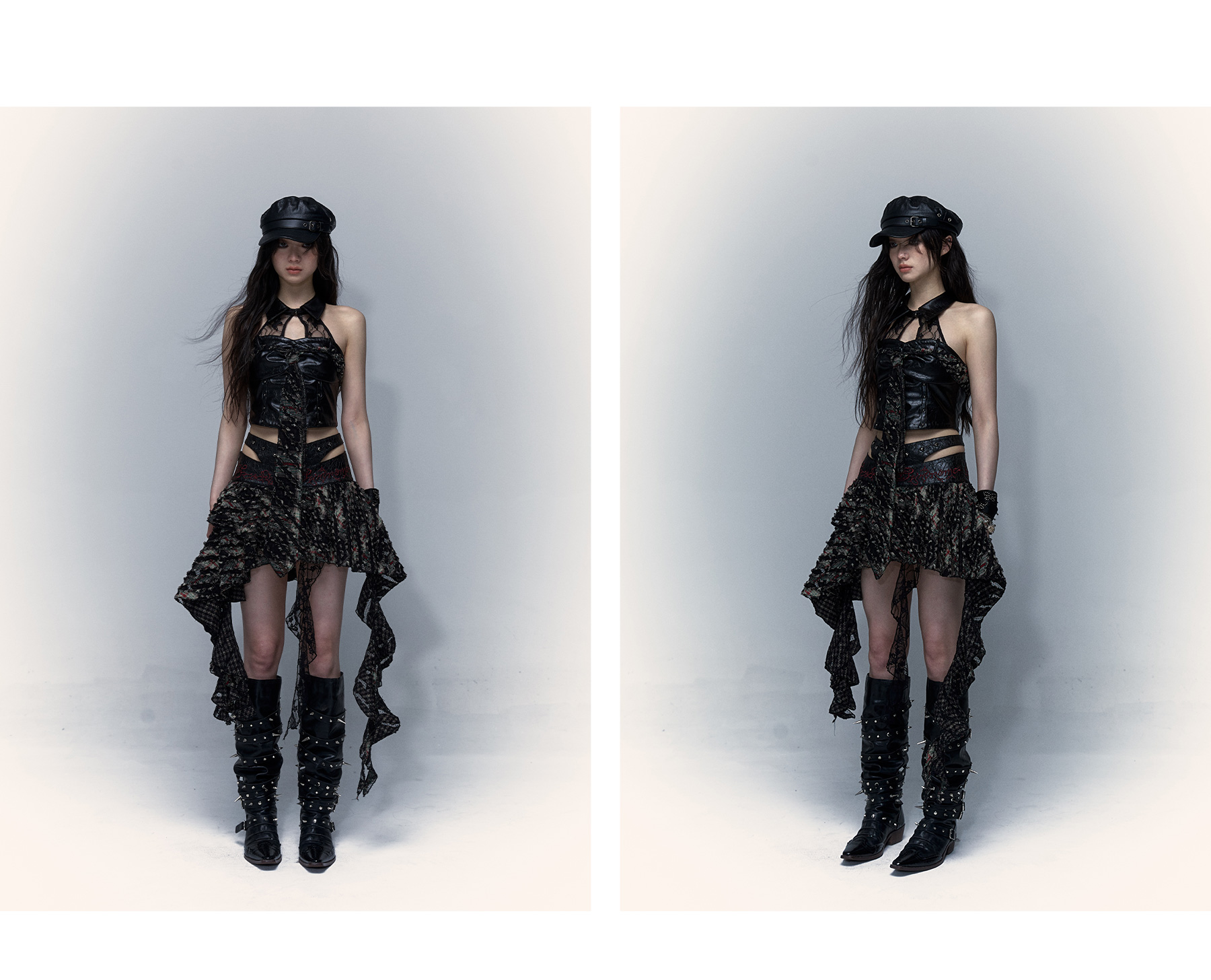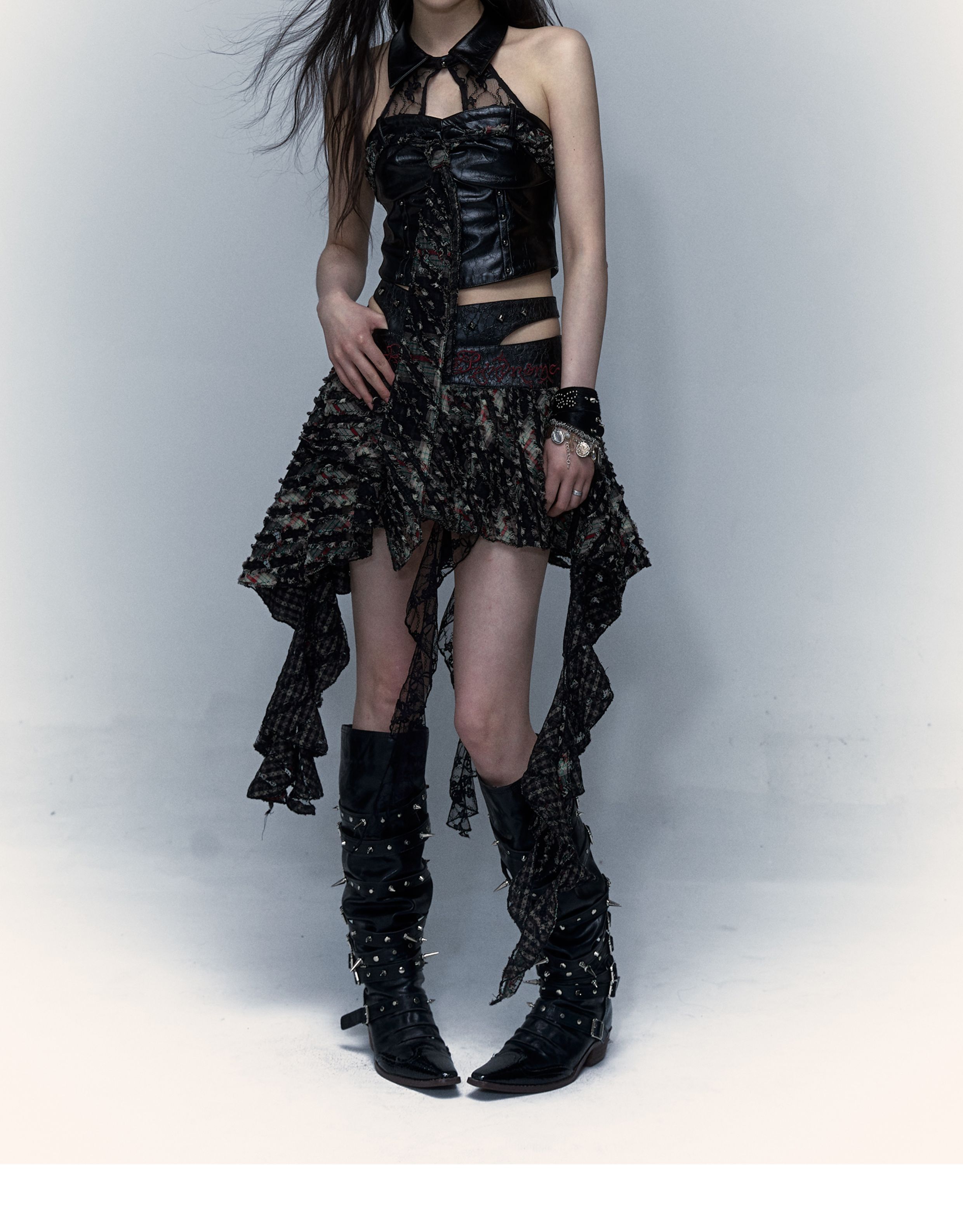 রক প্যাচওয়ার্ক লেদার টিউব টপ স্কার্ট | রেট্রো হেভি ইন্ডাস্ট্রি পাঙ্ক ডিজাইন