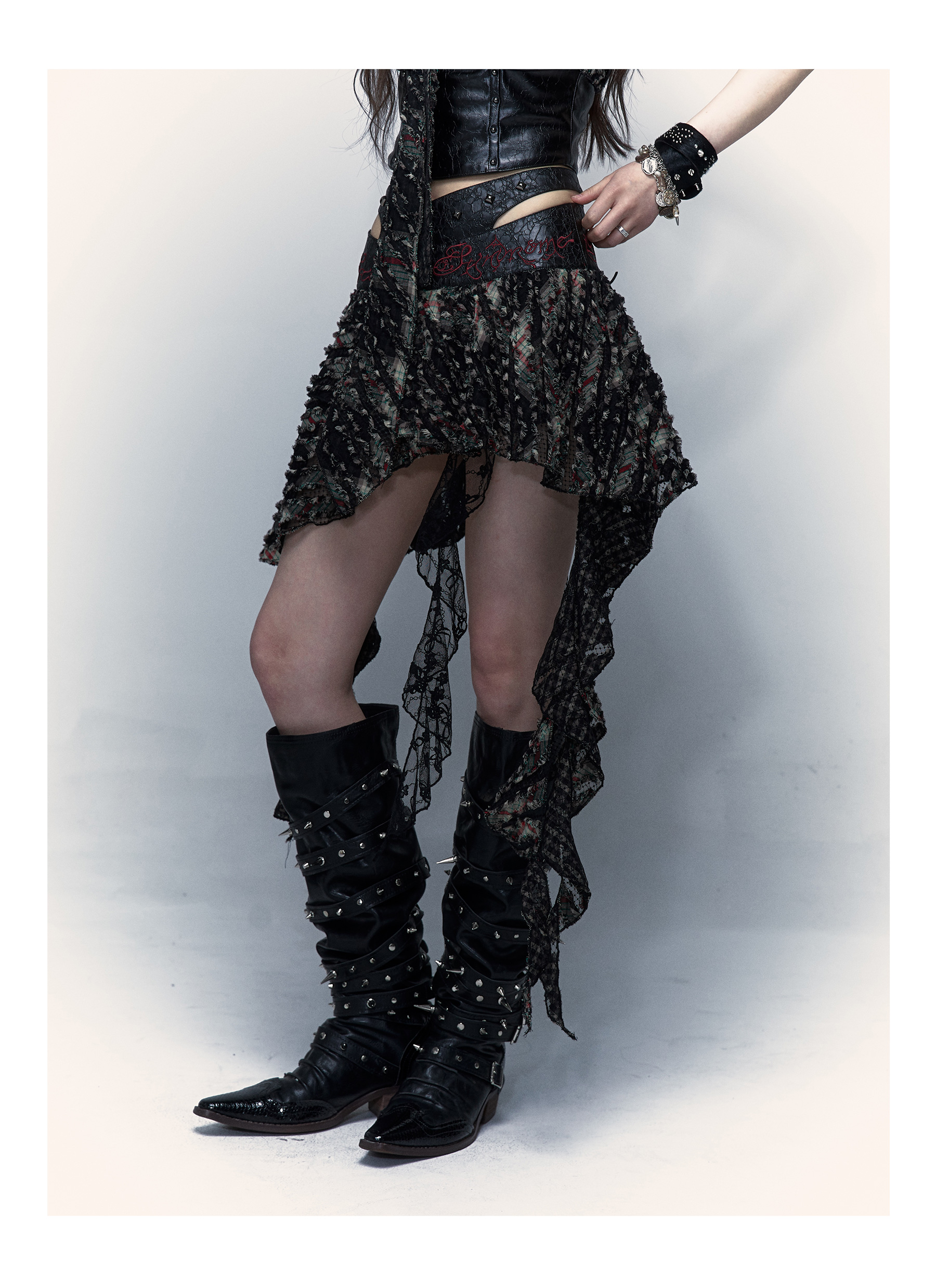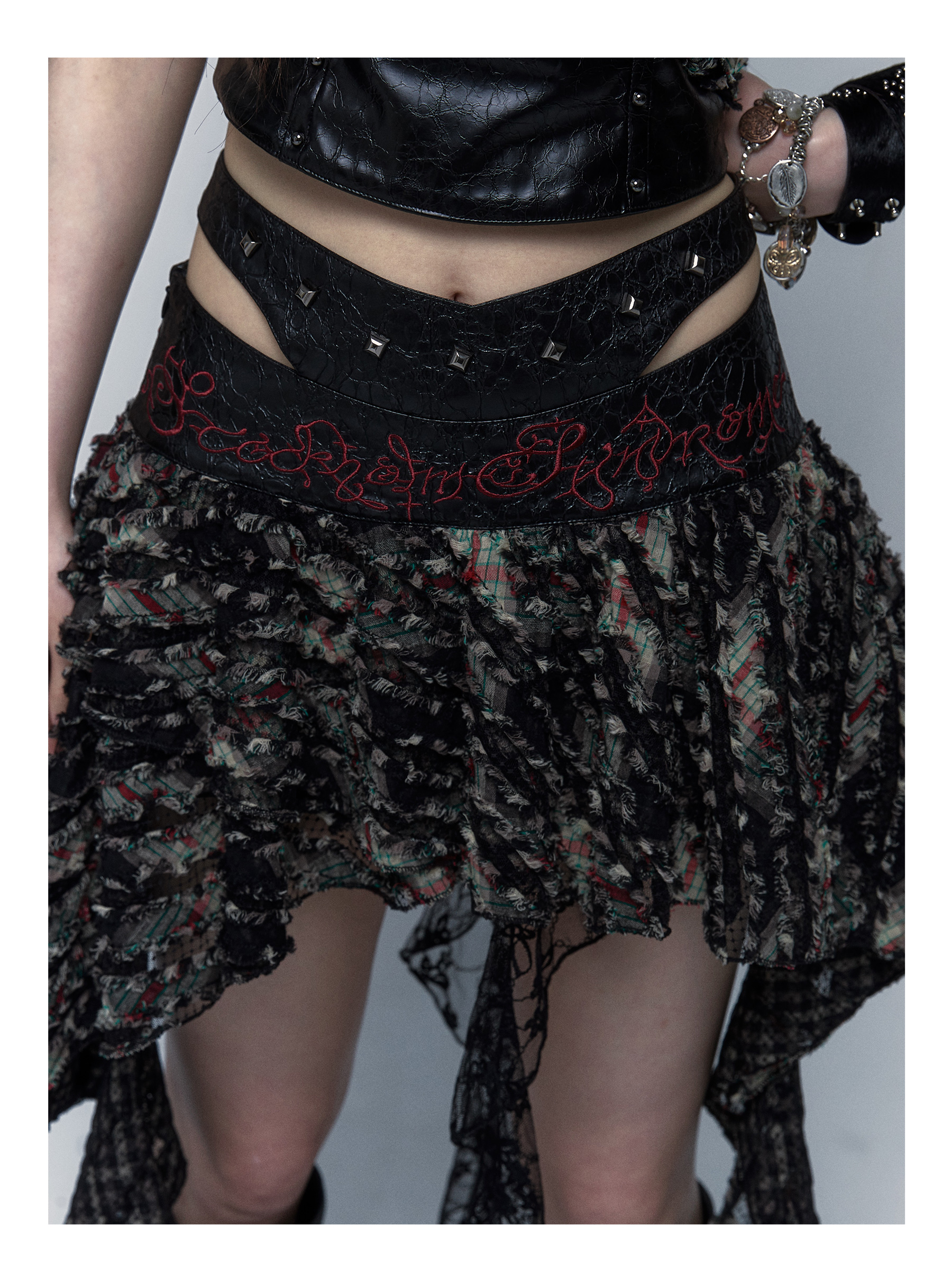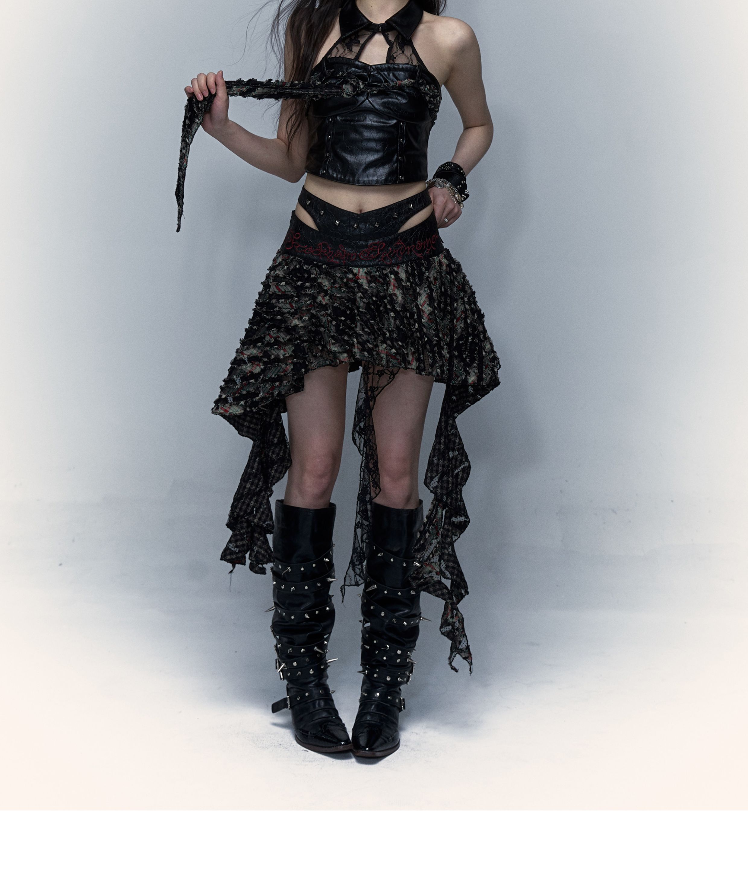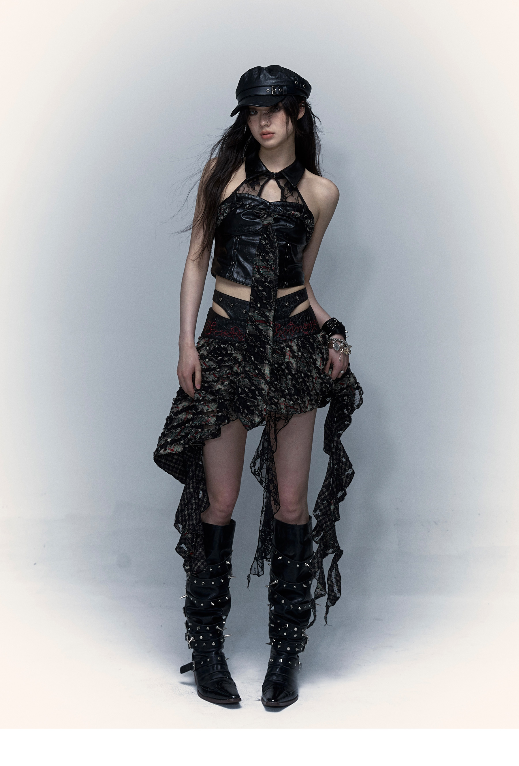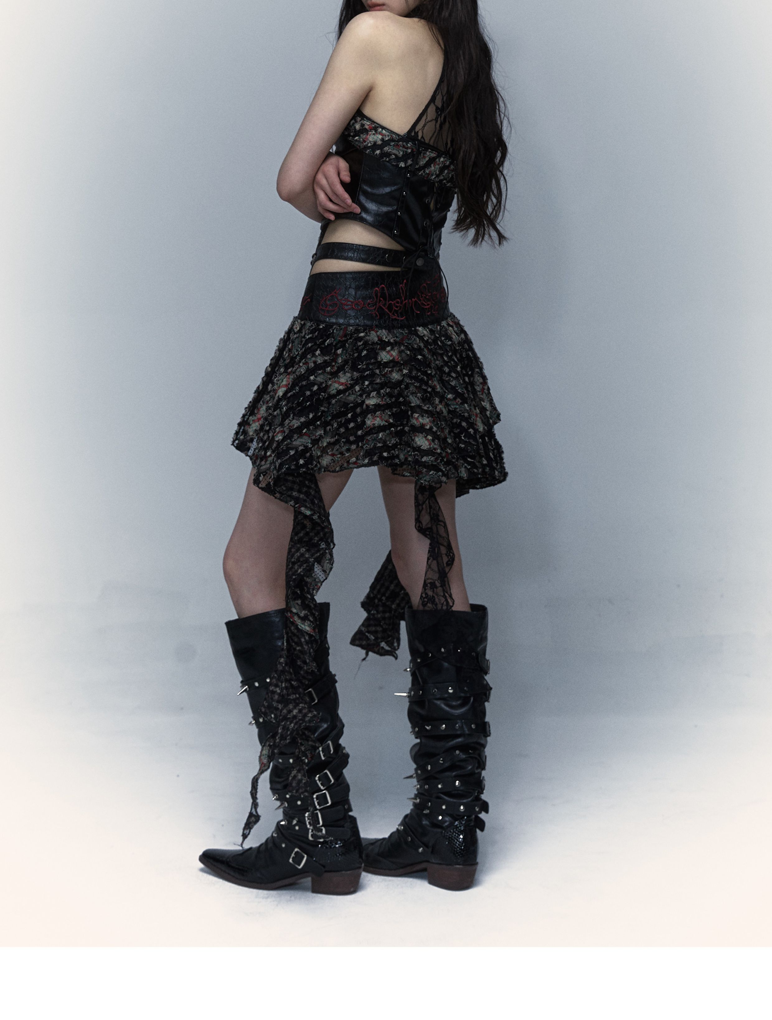 রক প্যাচওয়ার্ক লেদার টিউব টপ স্কার্ট | রেট্রো হেভি ইন্ডাস্ট্রি পাঙ্ক ডিজাইন