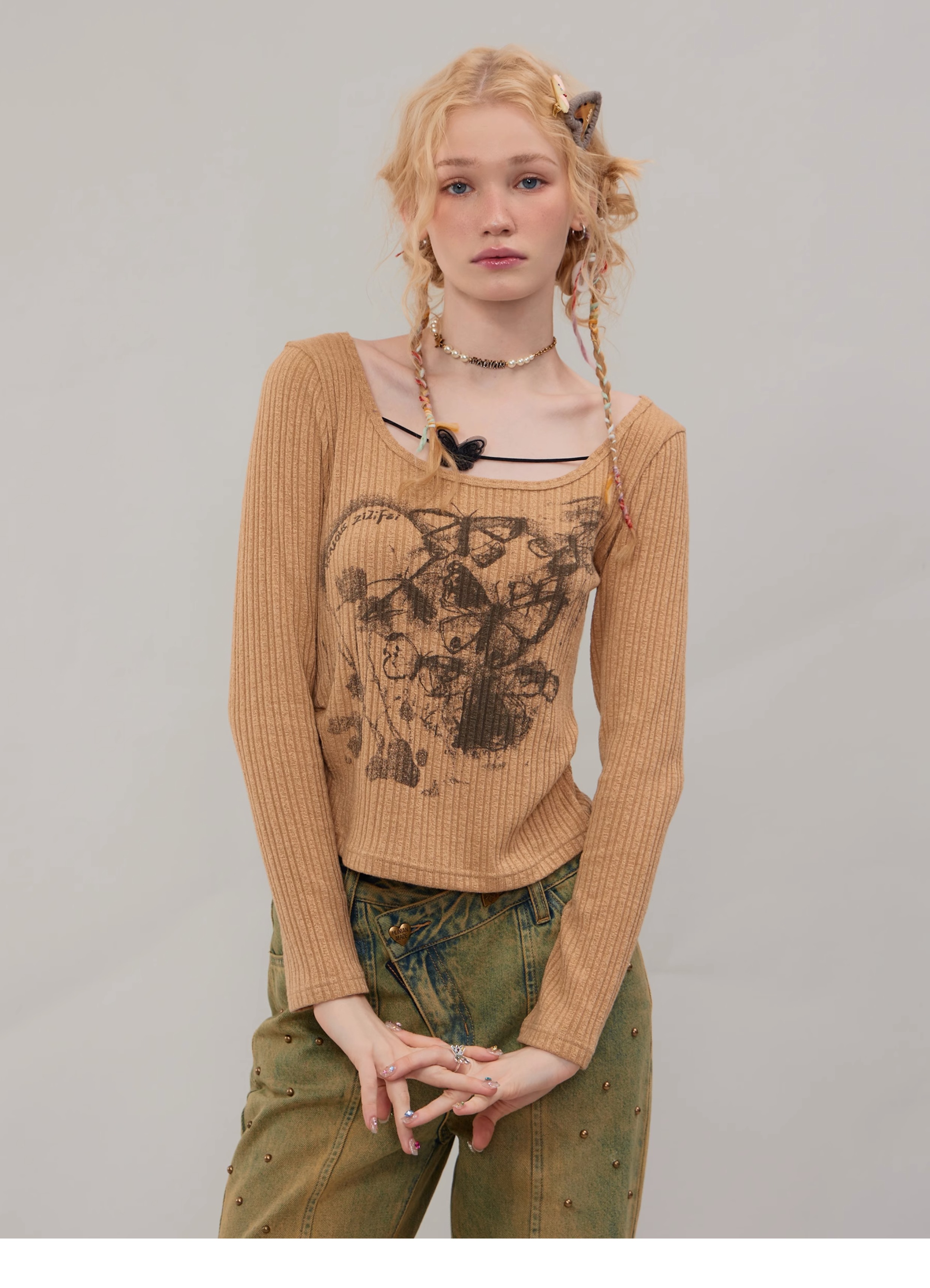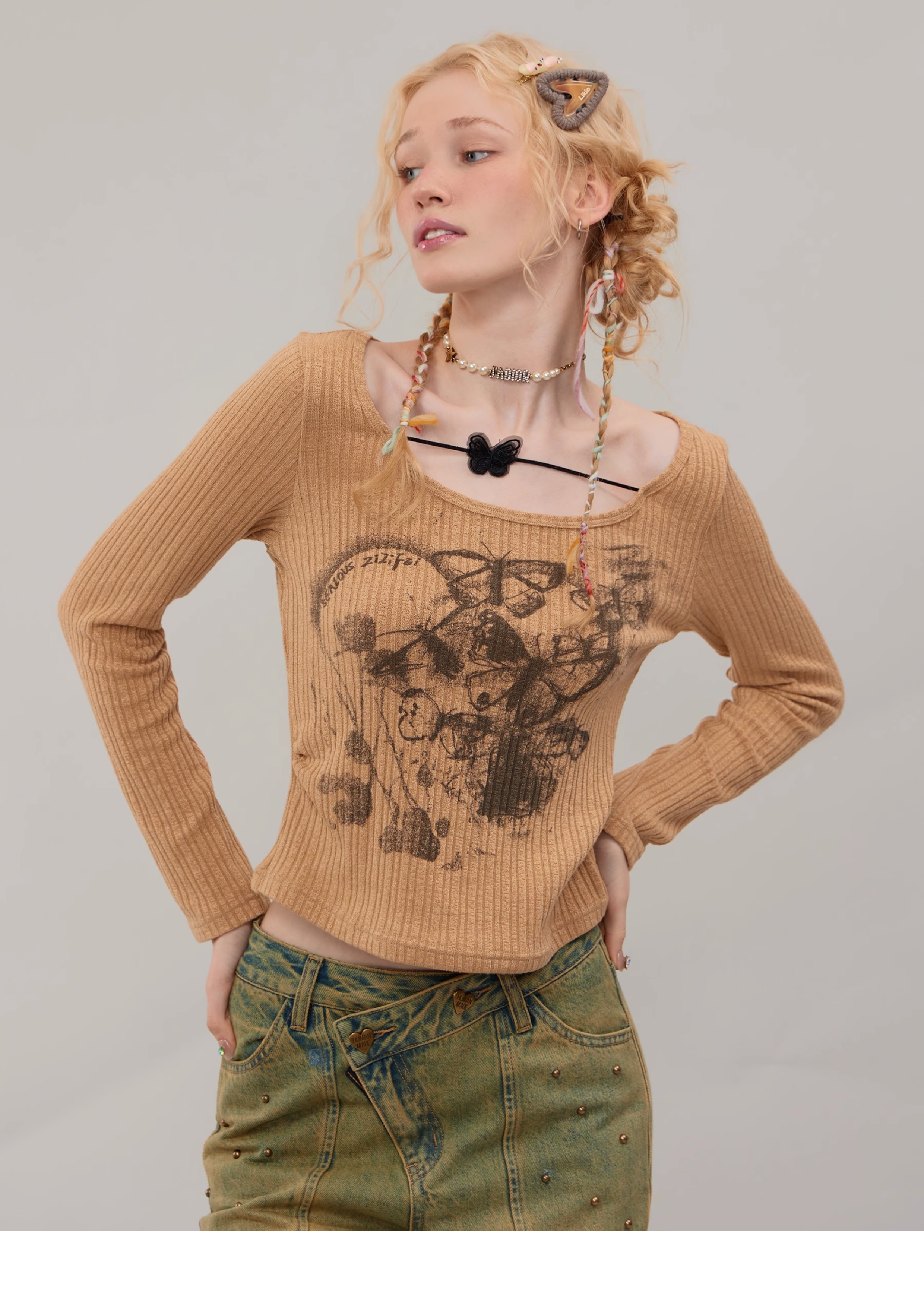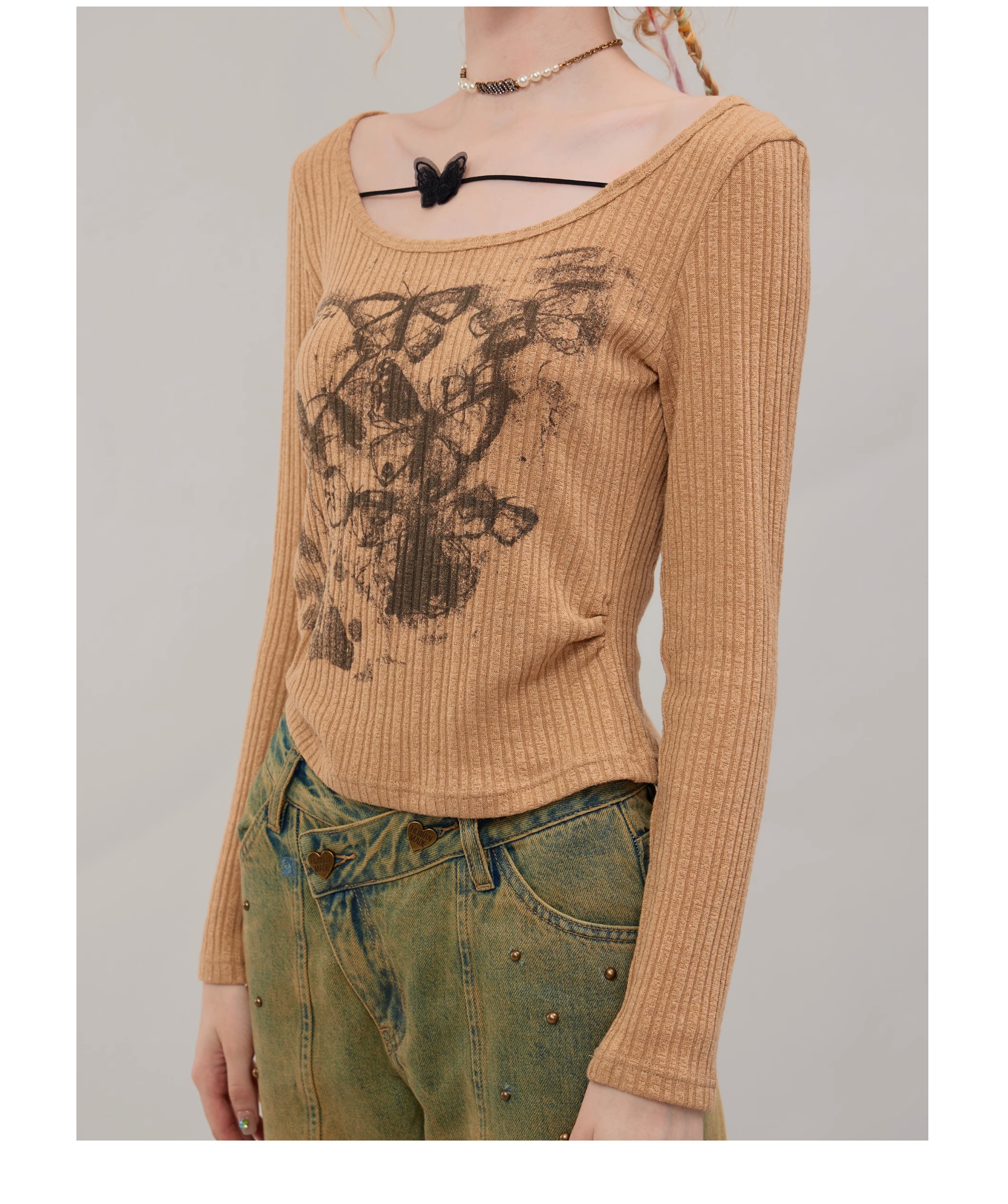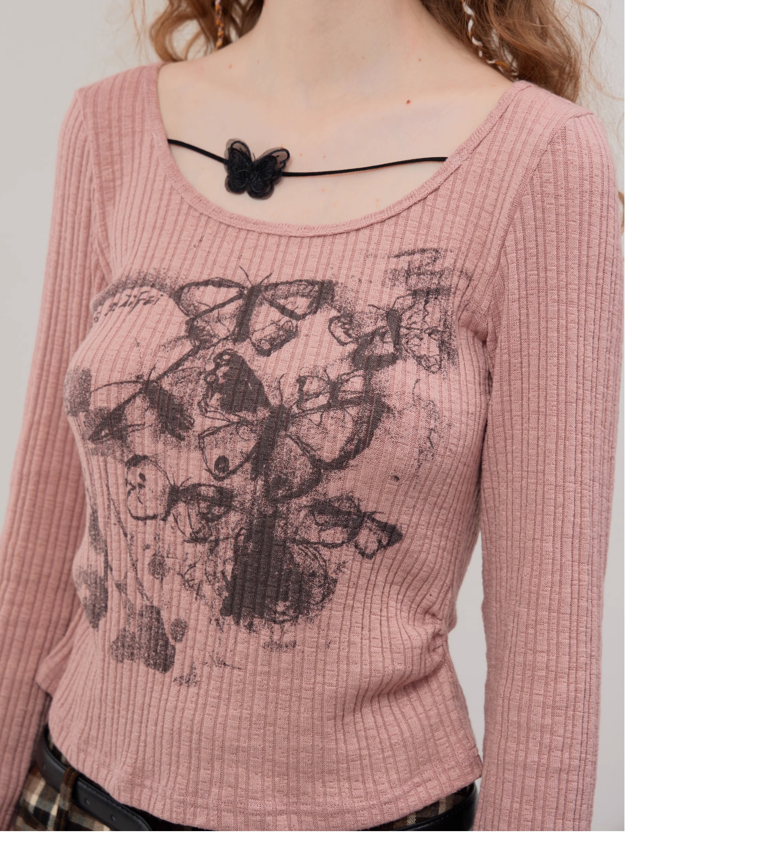 বাটারফ্লাই প্রিন্ট স্লিম ফিট নিট টপ | বসন্ত/শরতের জন্য লম্বা হাতা রেট্রো ডিজাইন