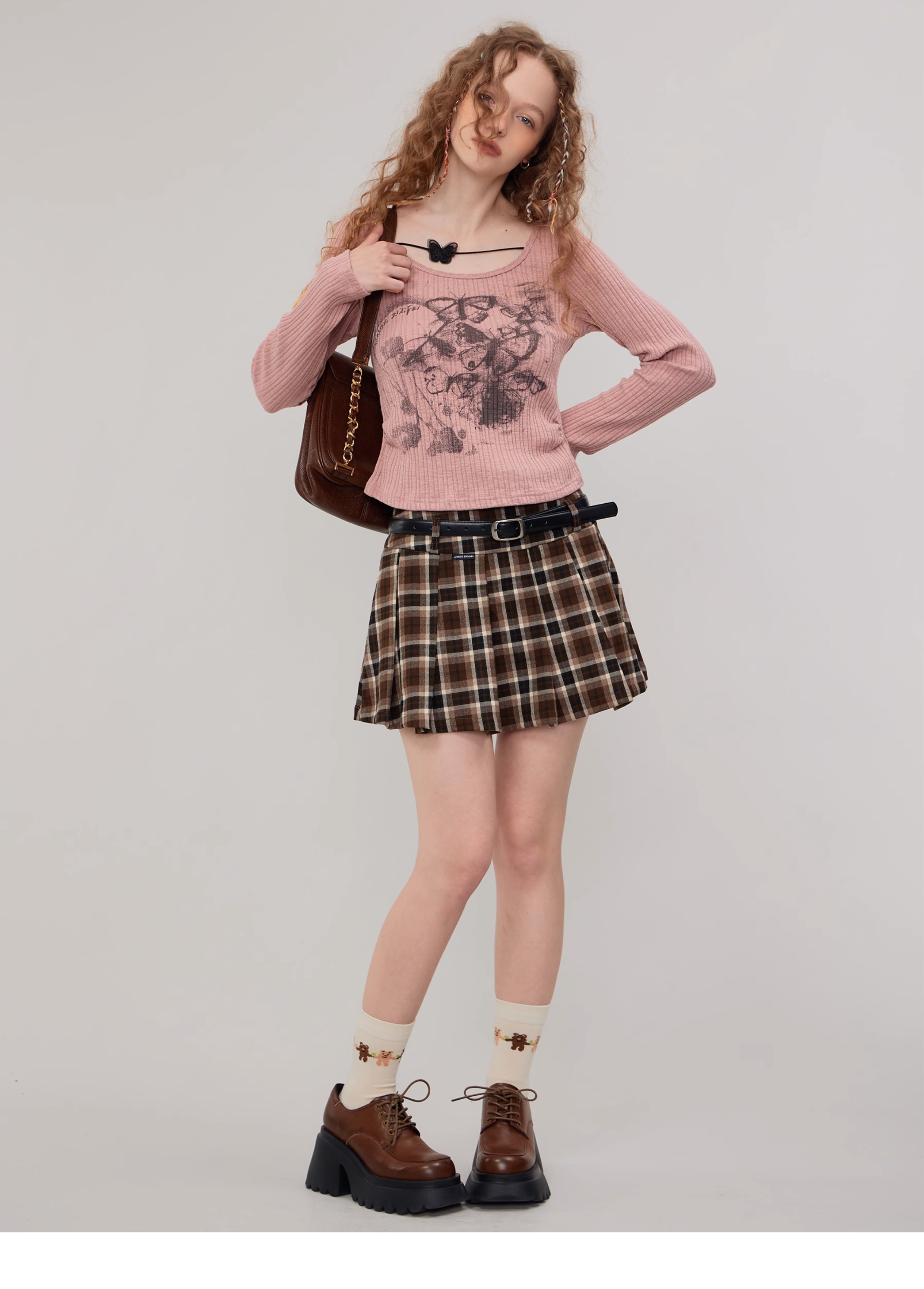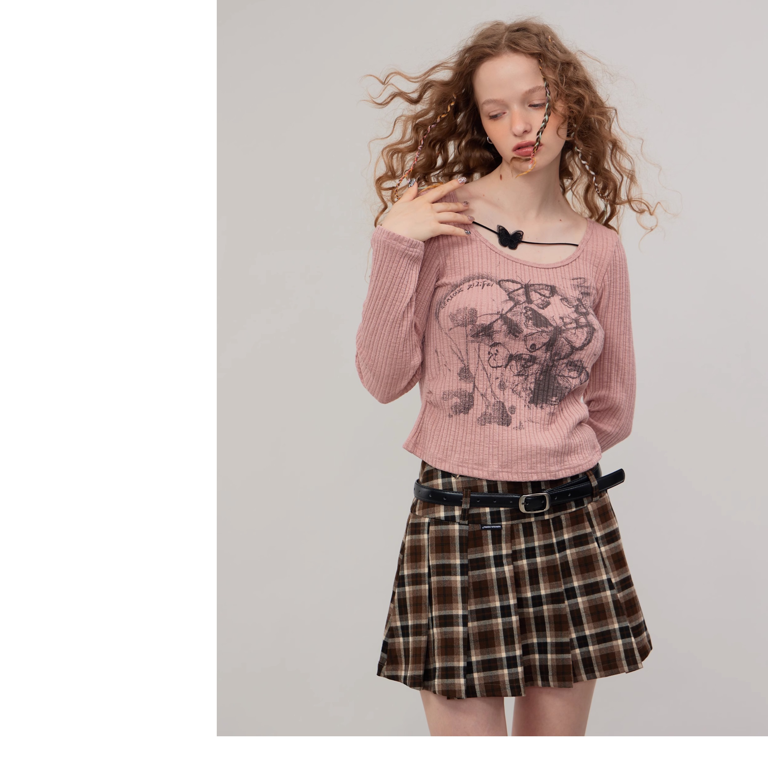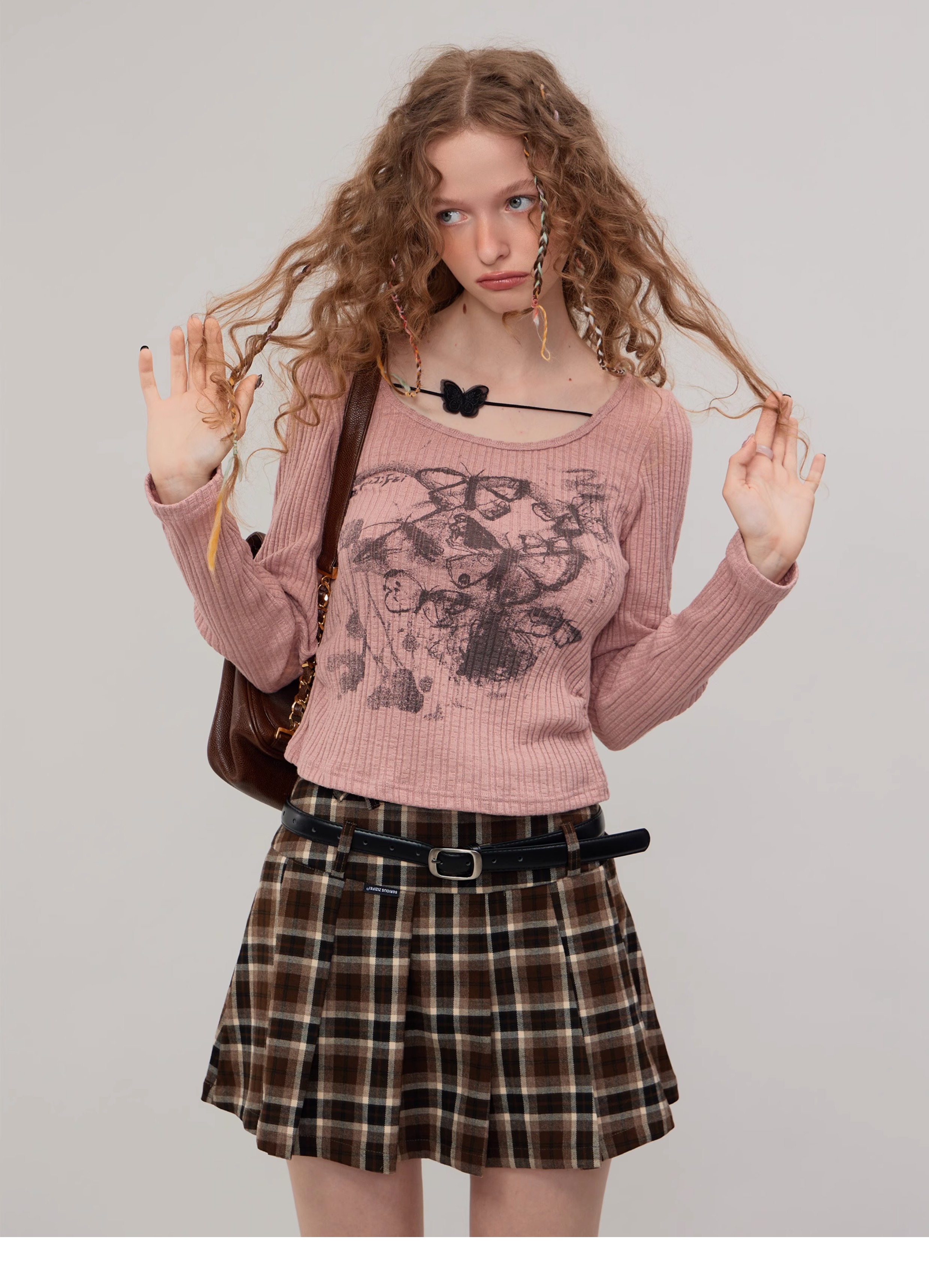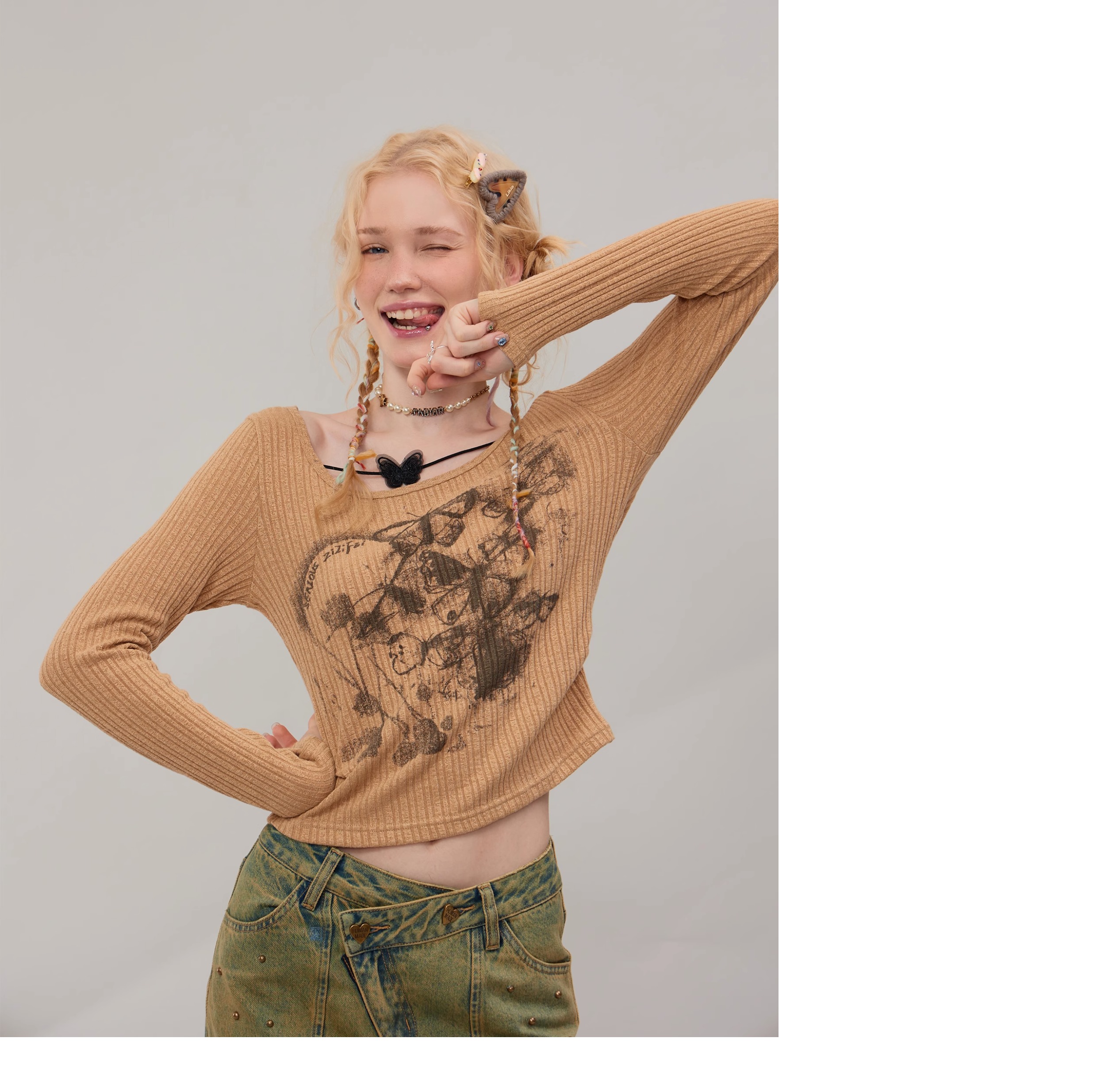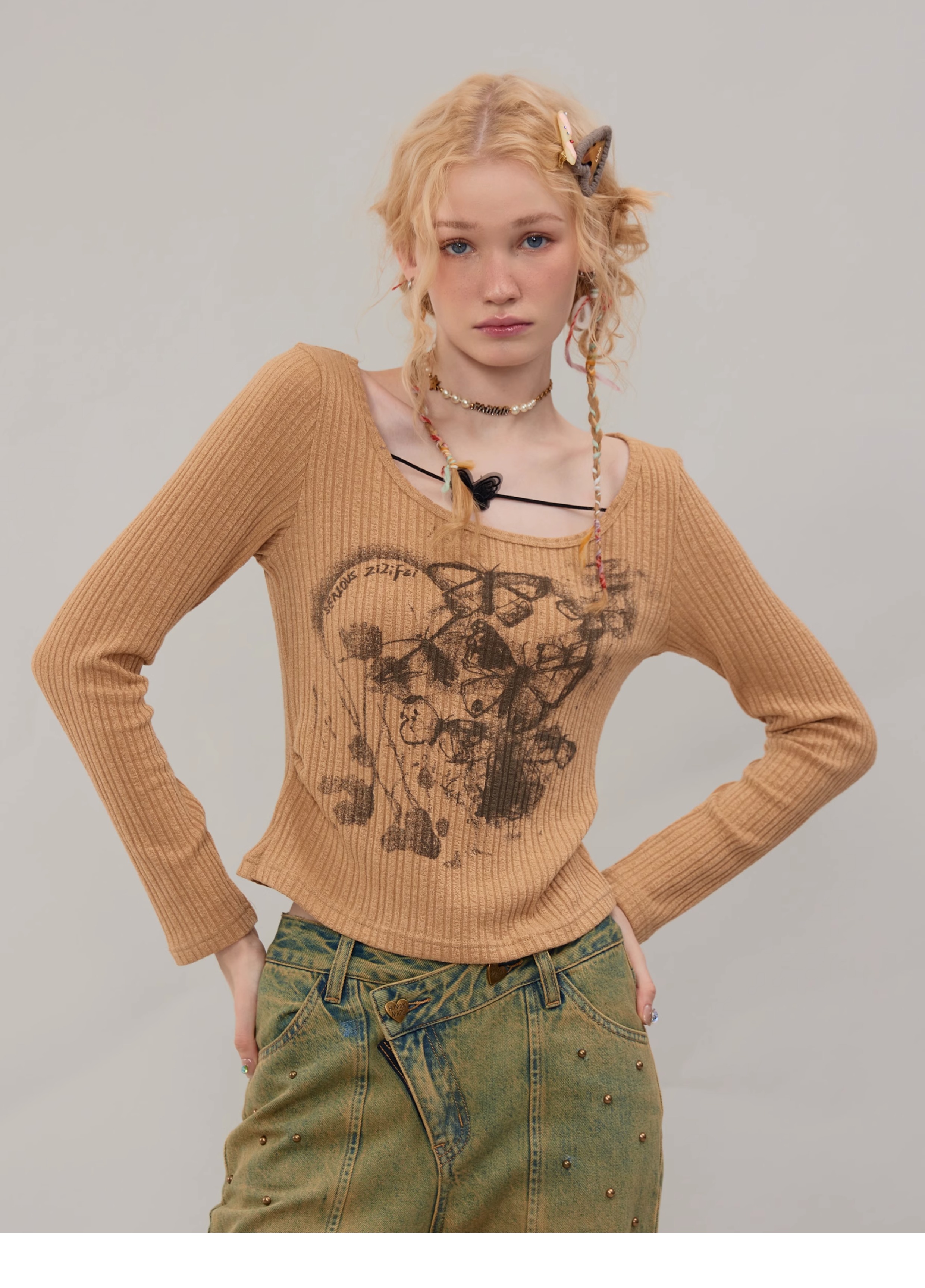 বাটারফ্লাই প্রিন্ট স্লিম ফিট নিট টপ | বসন্ত/শরতের জন্য লম্বা হাতা রেট্রো ডিজাইন