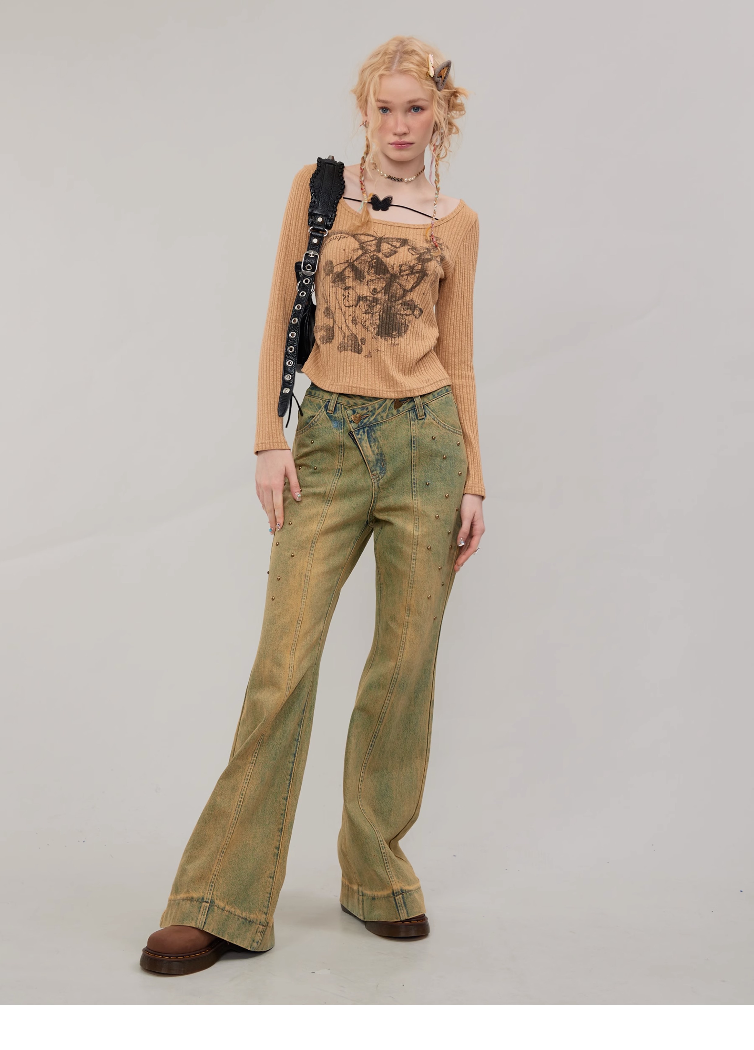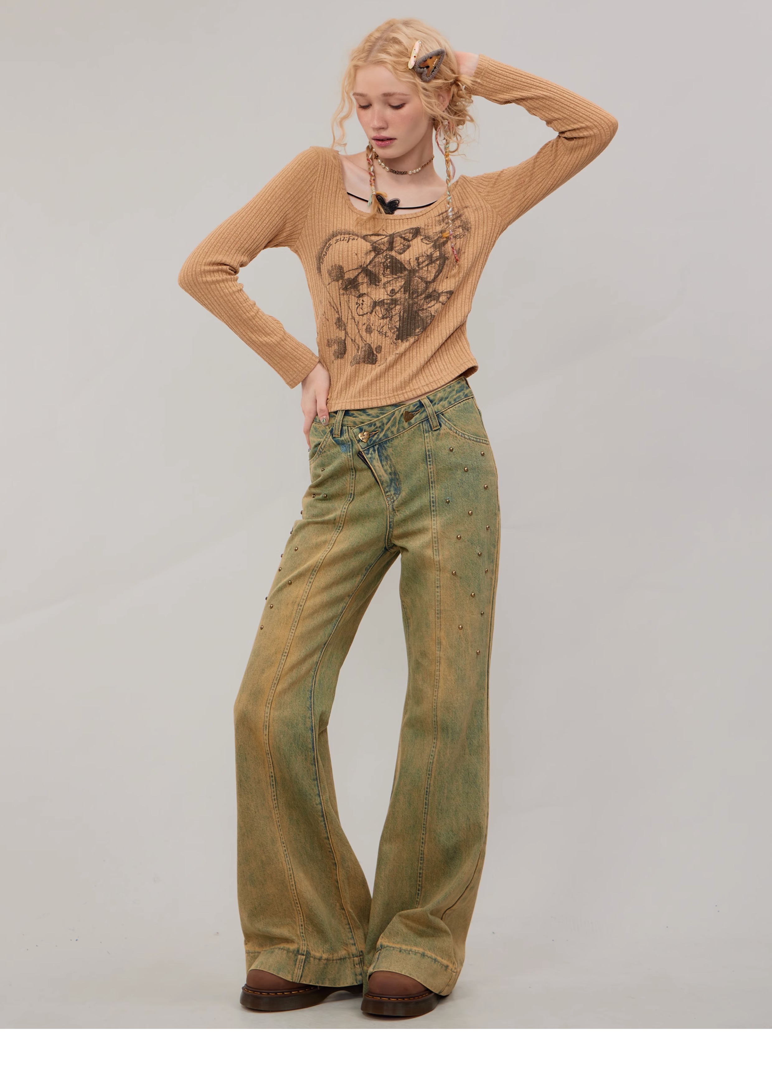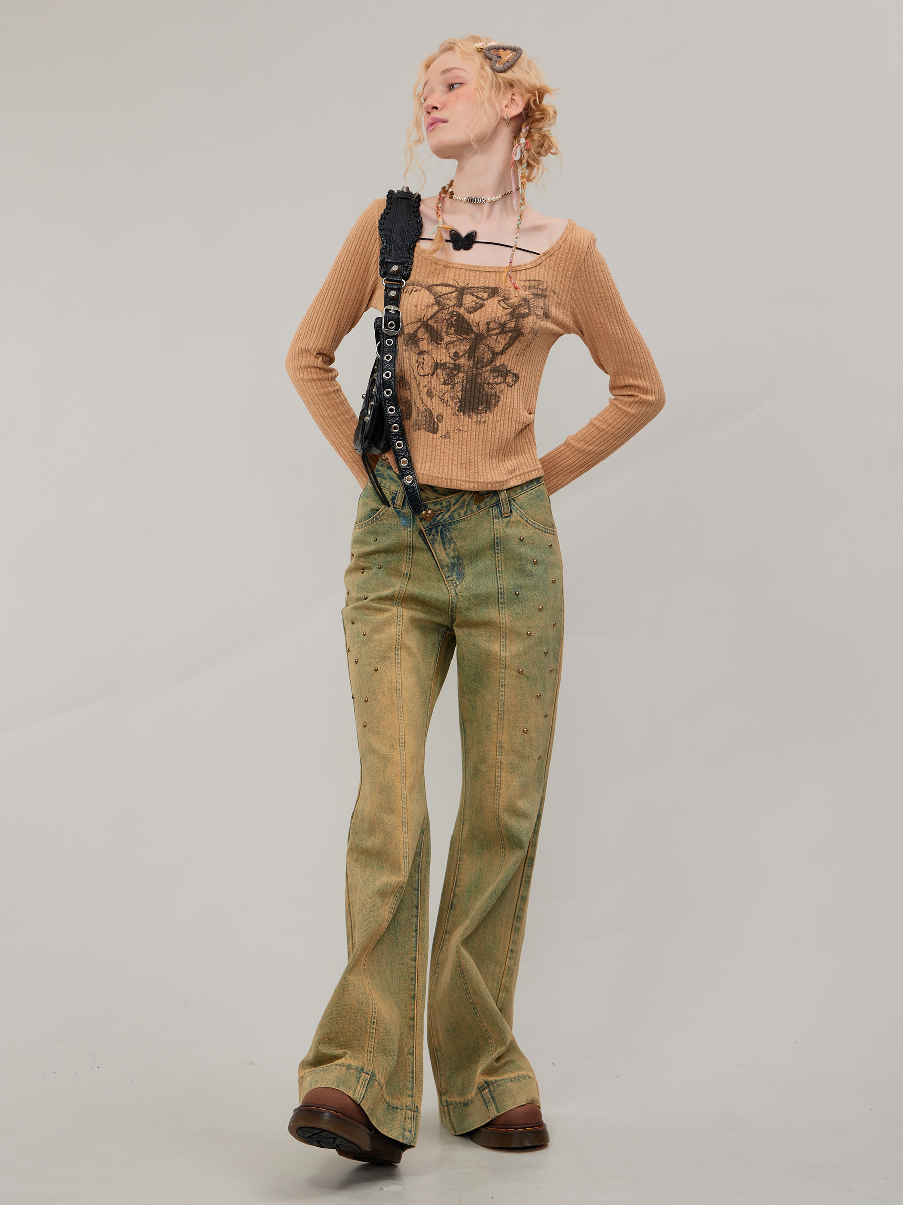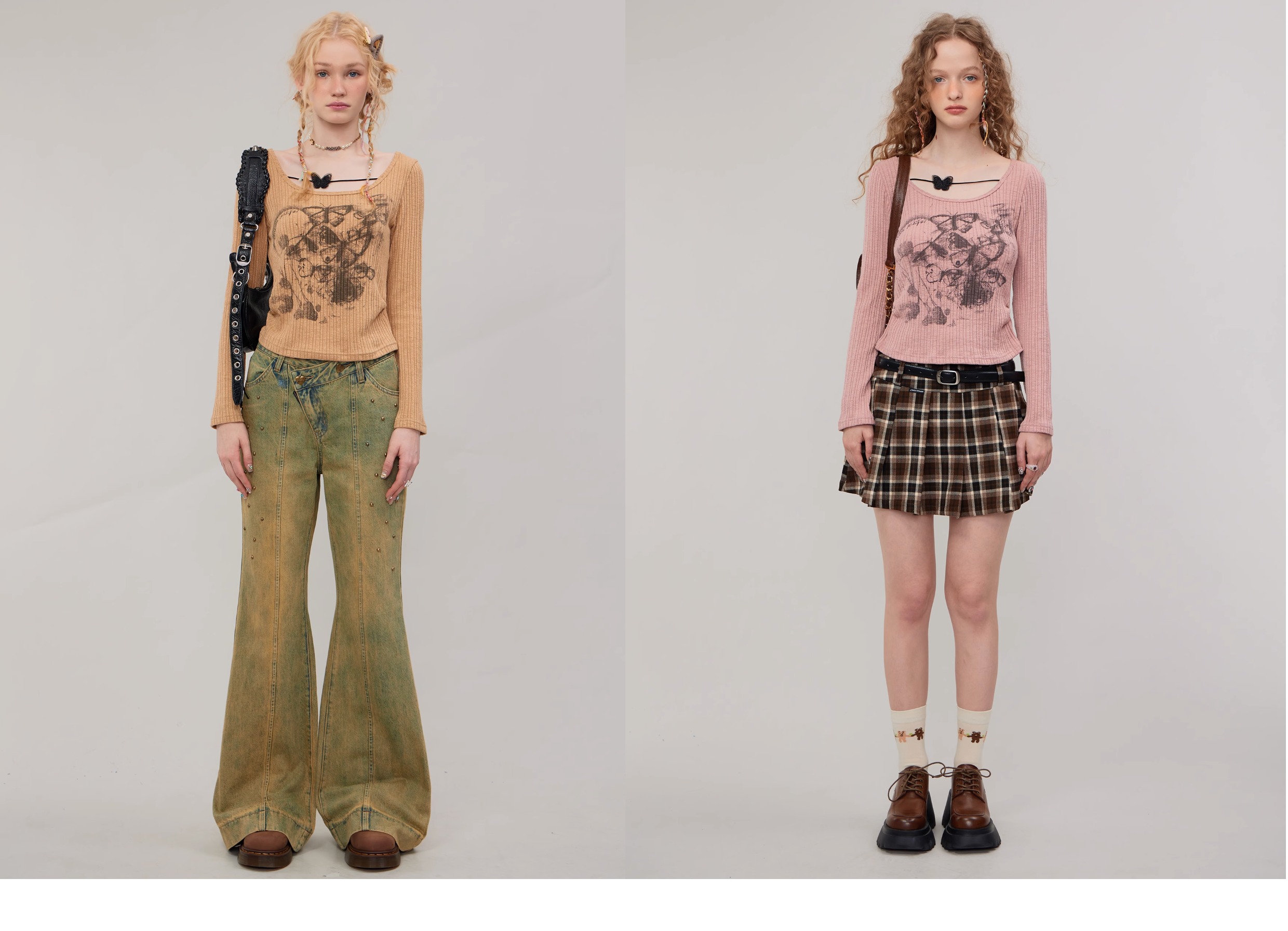 বাটারফ্লাই প্রিন্ট স্লিম ফিট নিট টপ | বসন্ত/শরতের জন্য লম্বা হাতা রেট্রো ডিজাইন