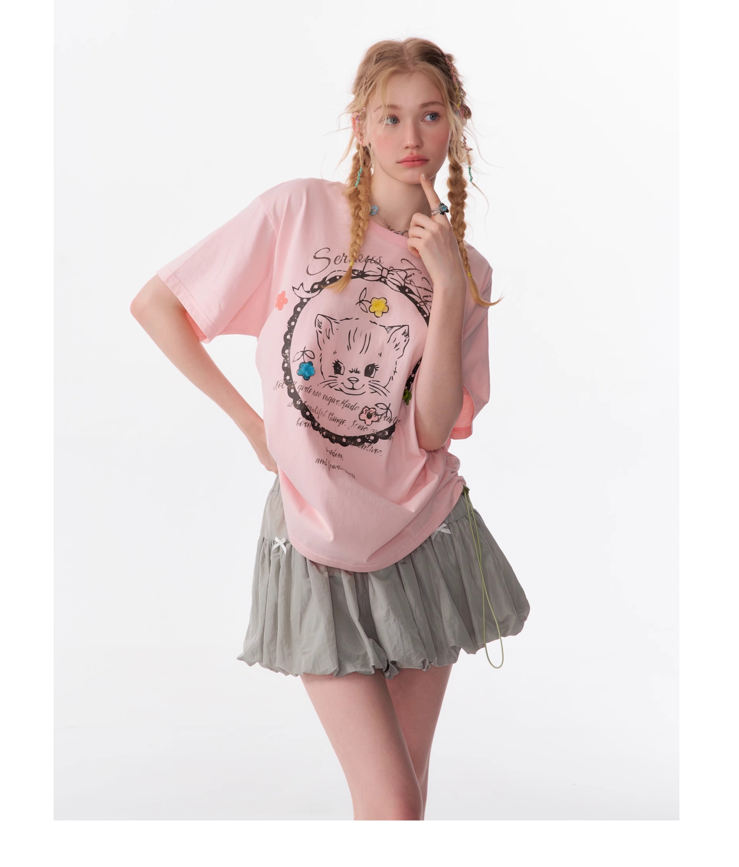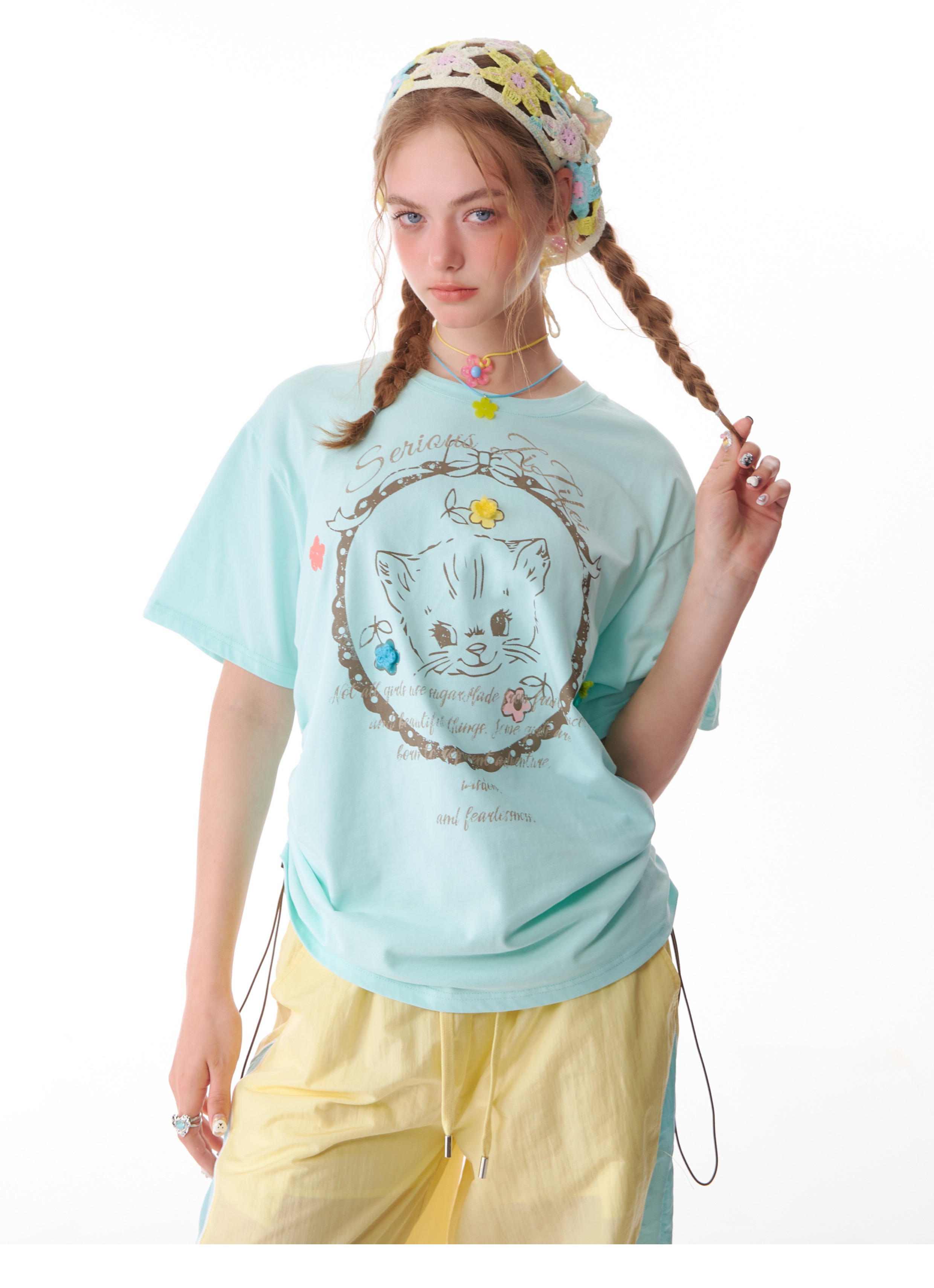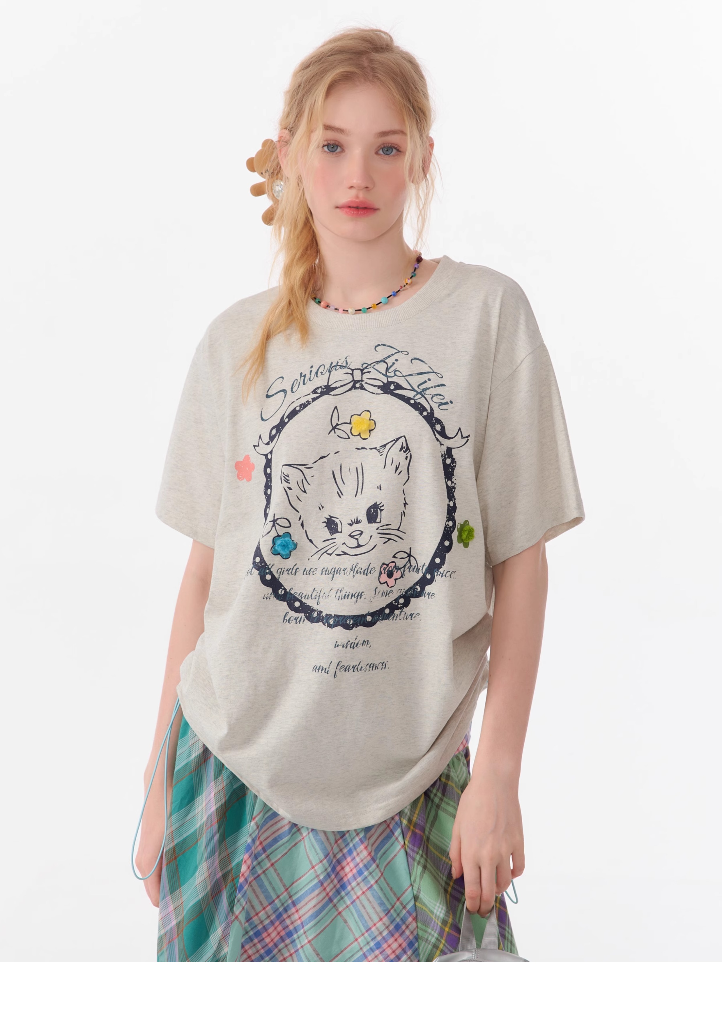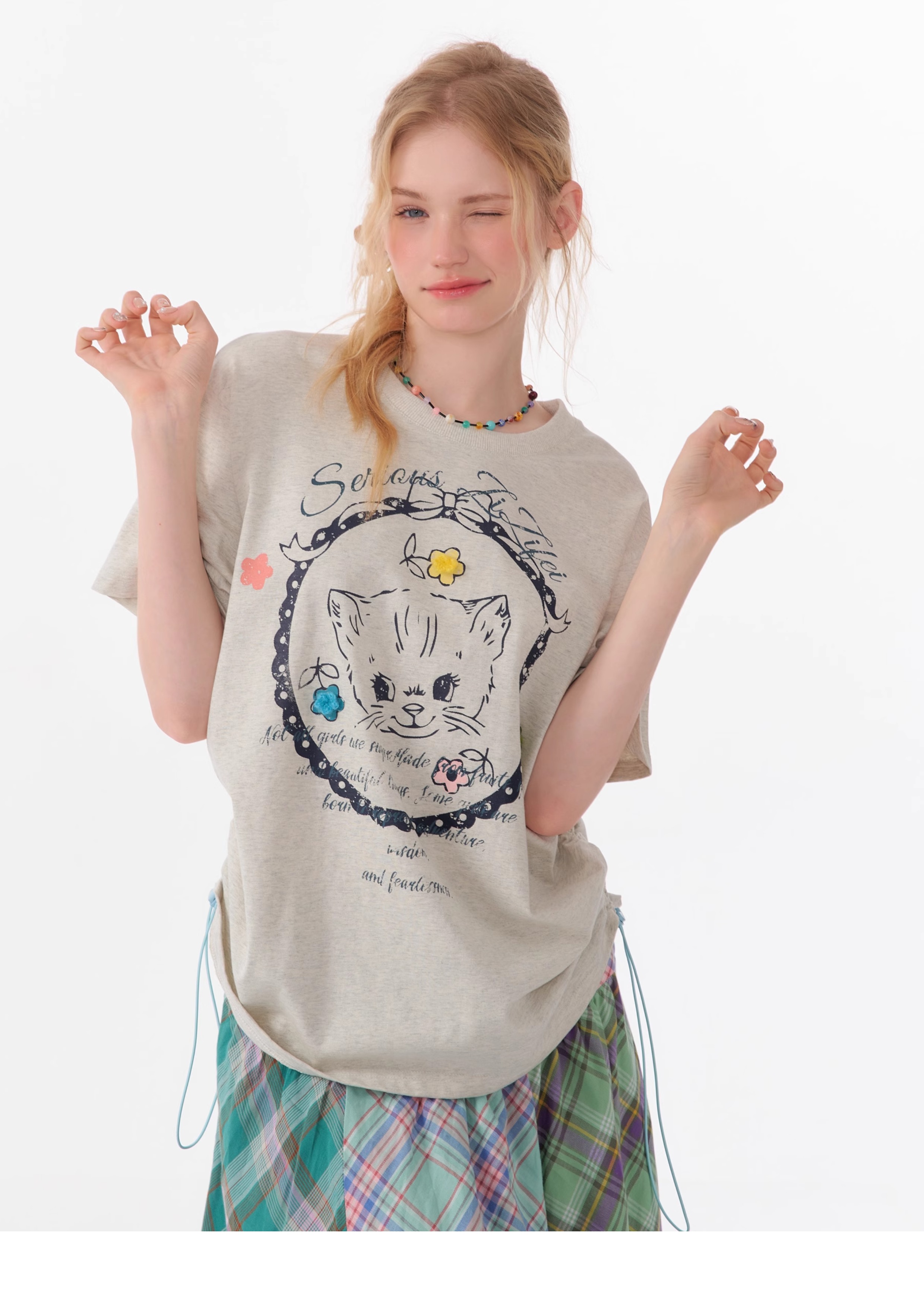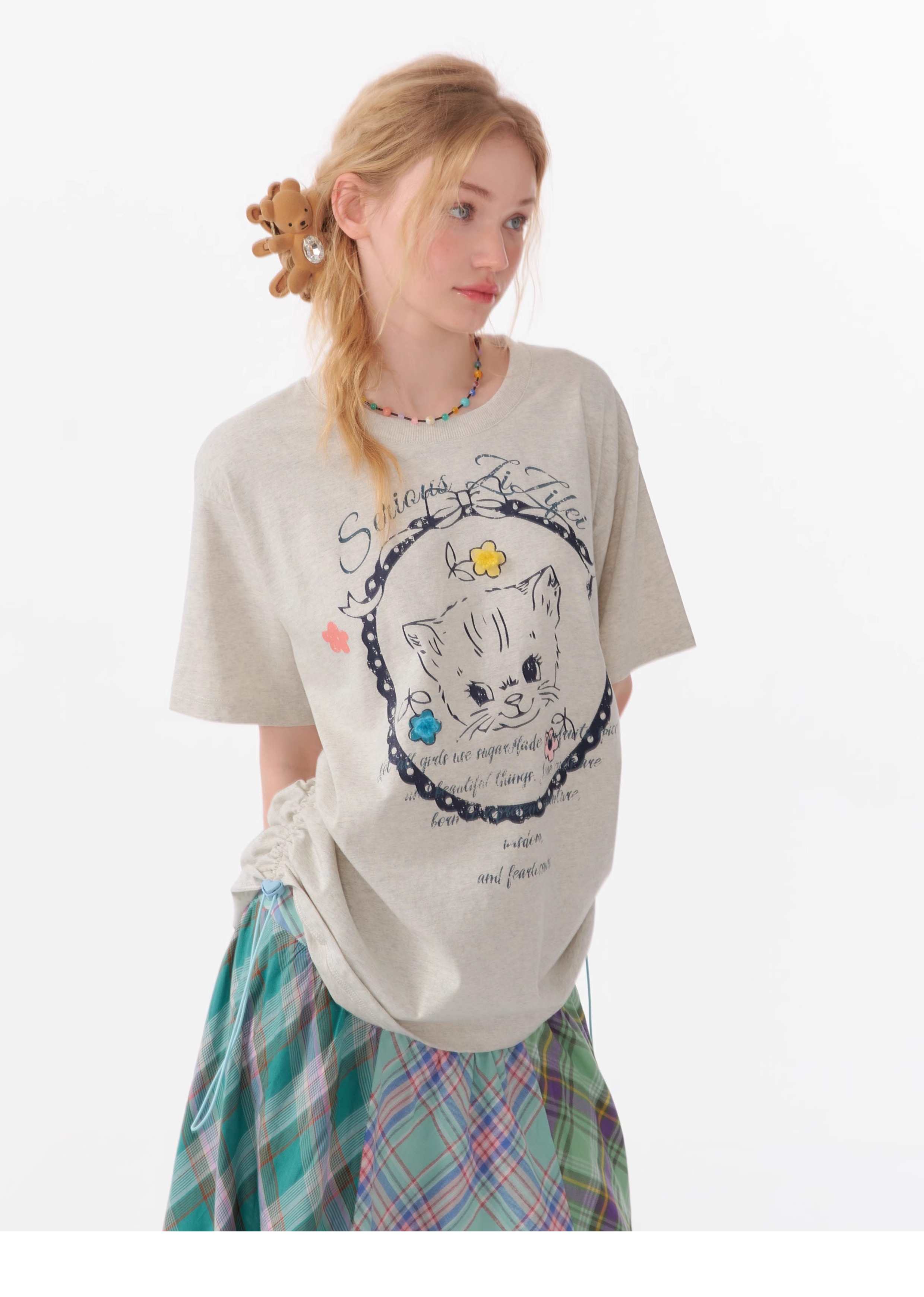 গ্রীষ্মের জন্য ক্যাট প্রিন্ট ঢিলেঢালা টি-শার্ট |
