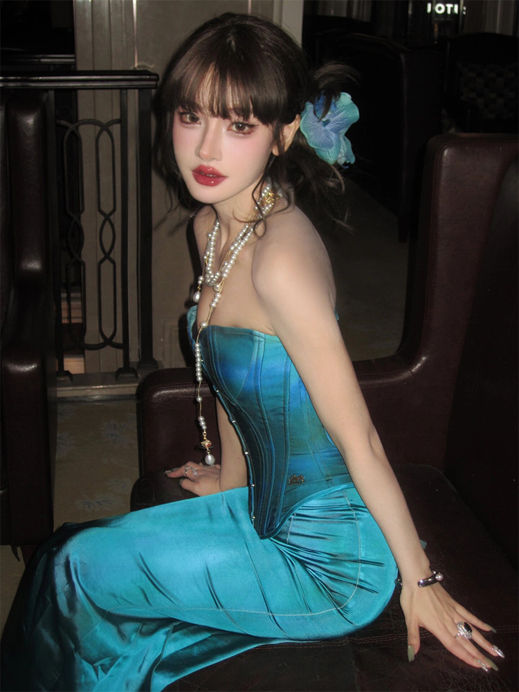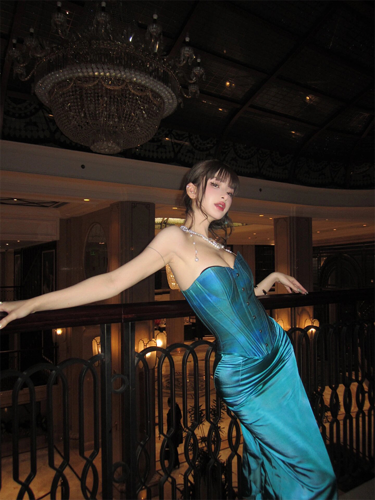 Blue Herringbone Bandeau Gown – Light Luxury New Year & Engagement Look