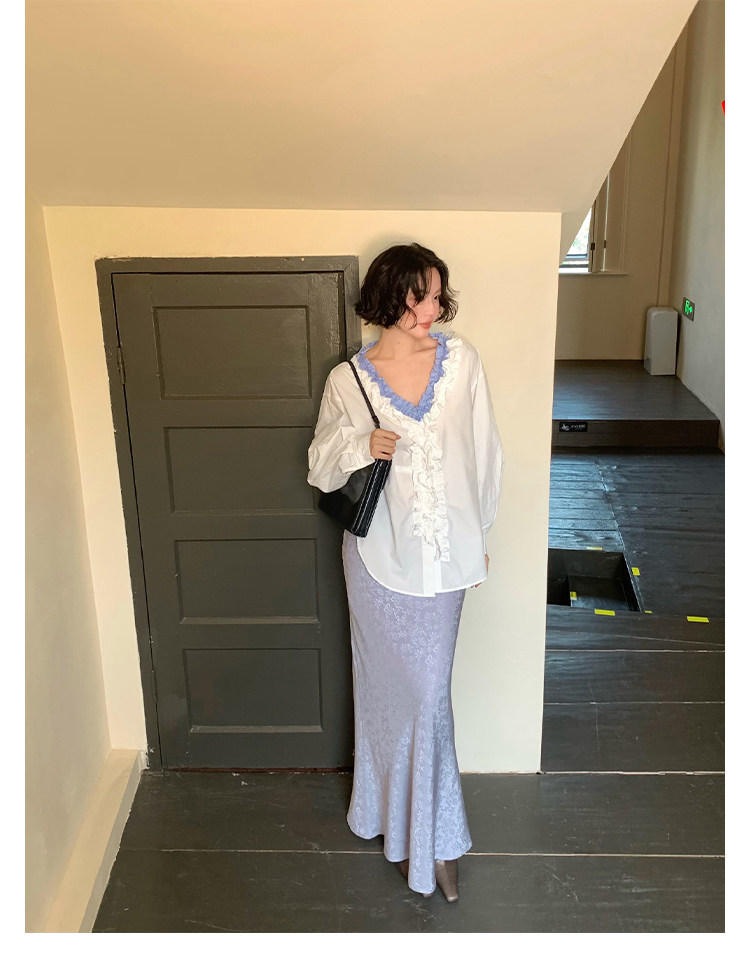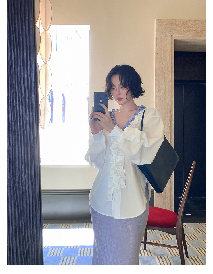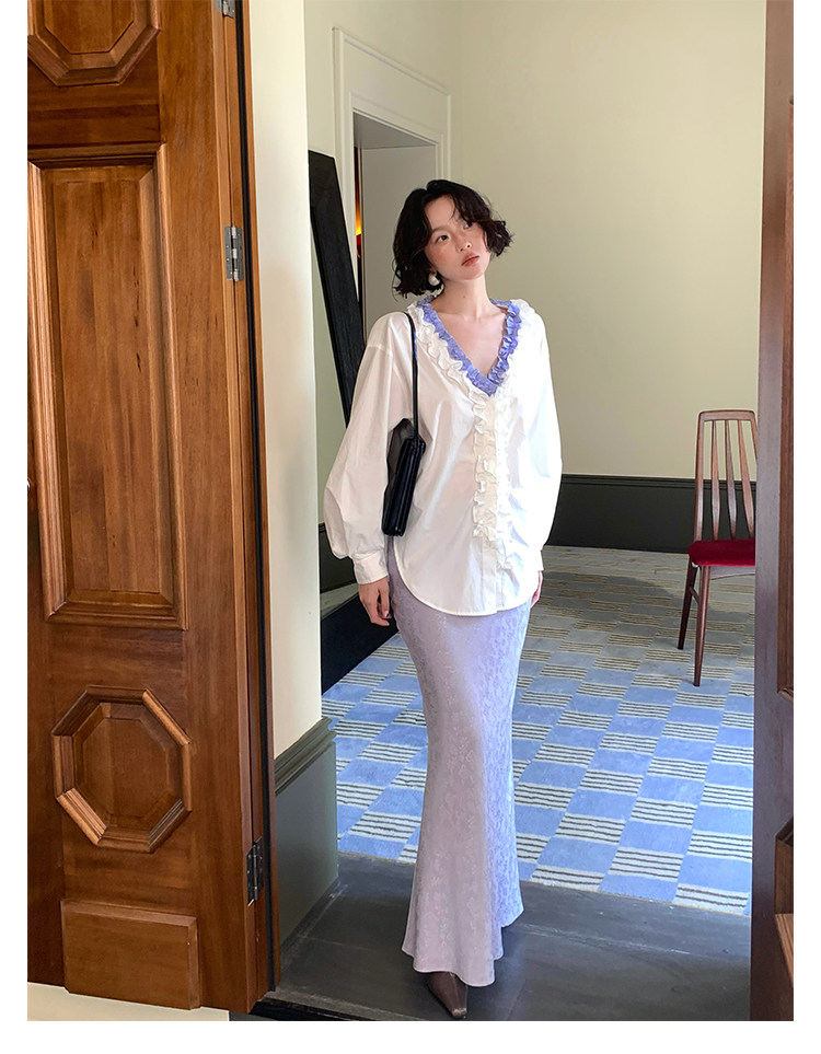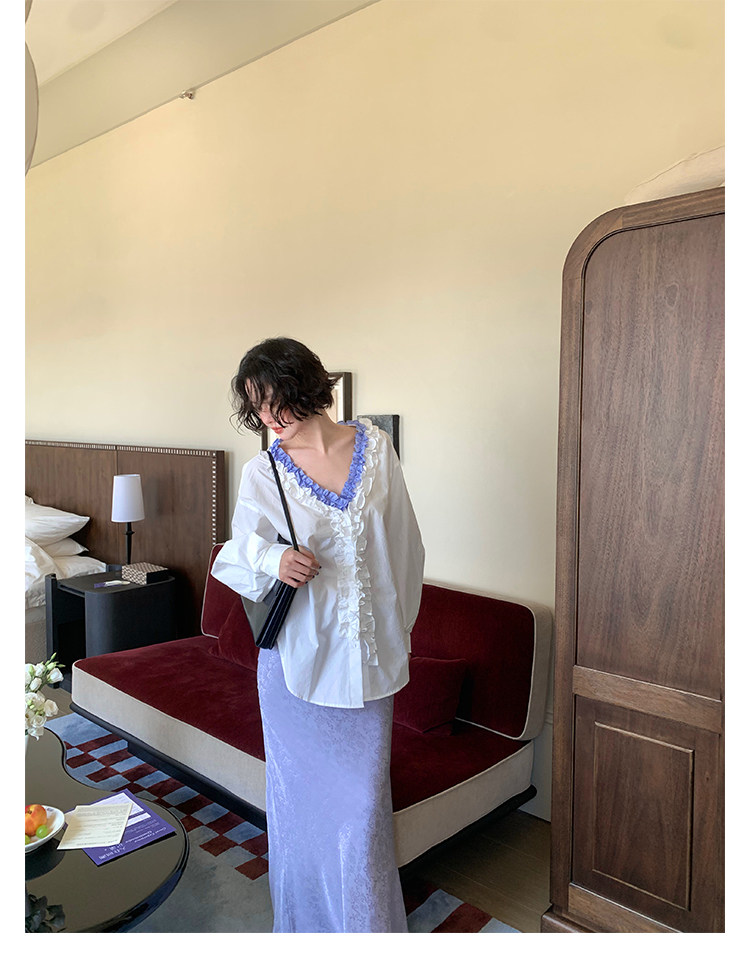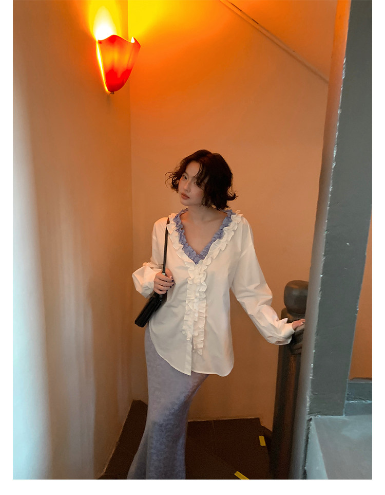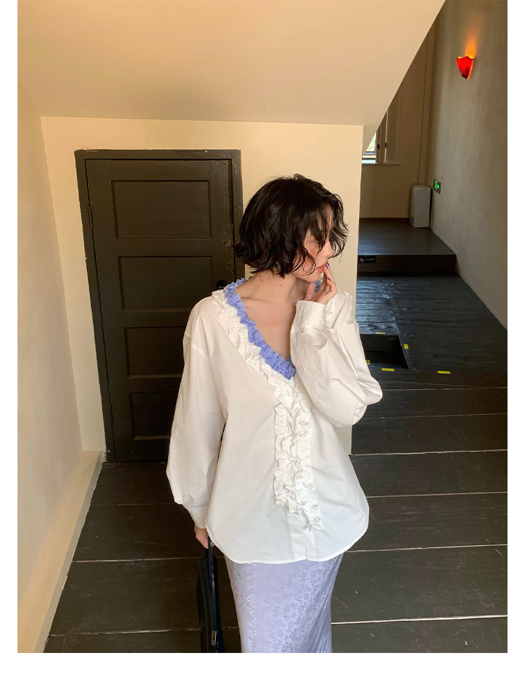 French Retro Color-Block Faux Two-Piece Lace V-Neck Shirt – Autumn Style