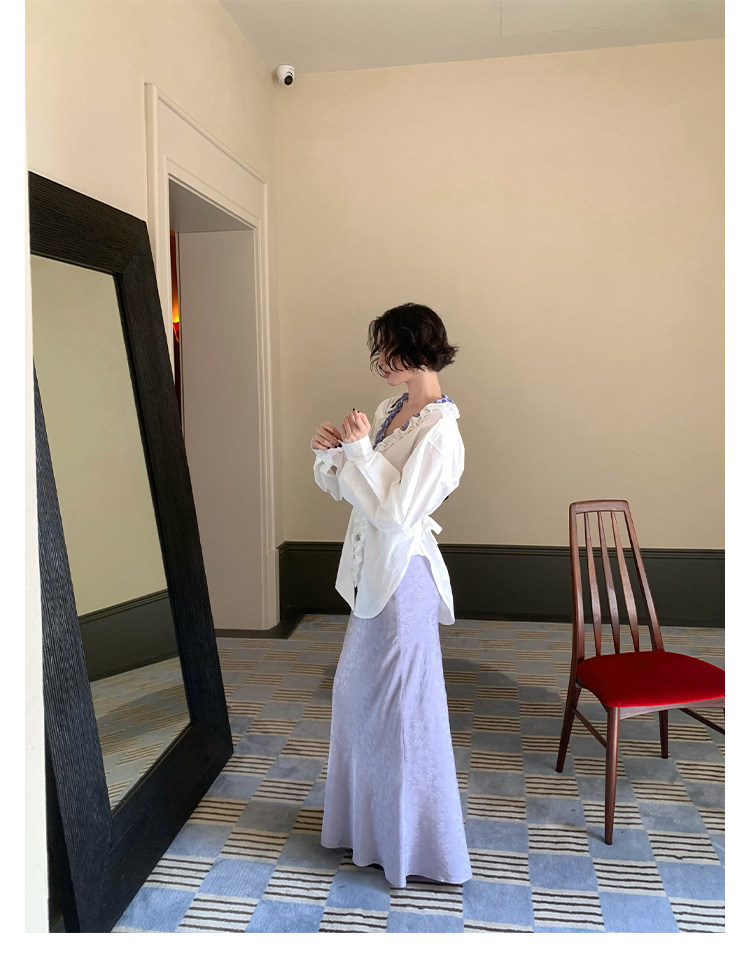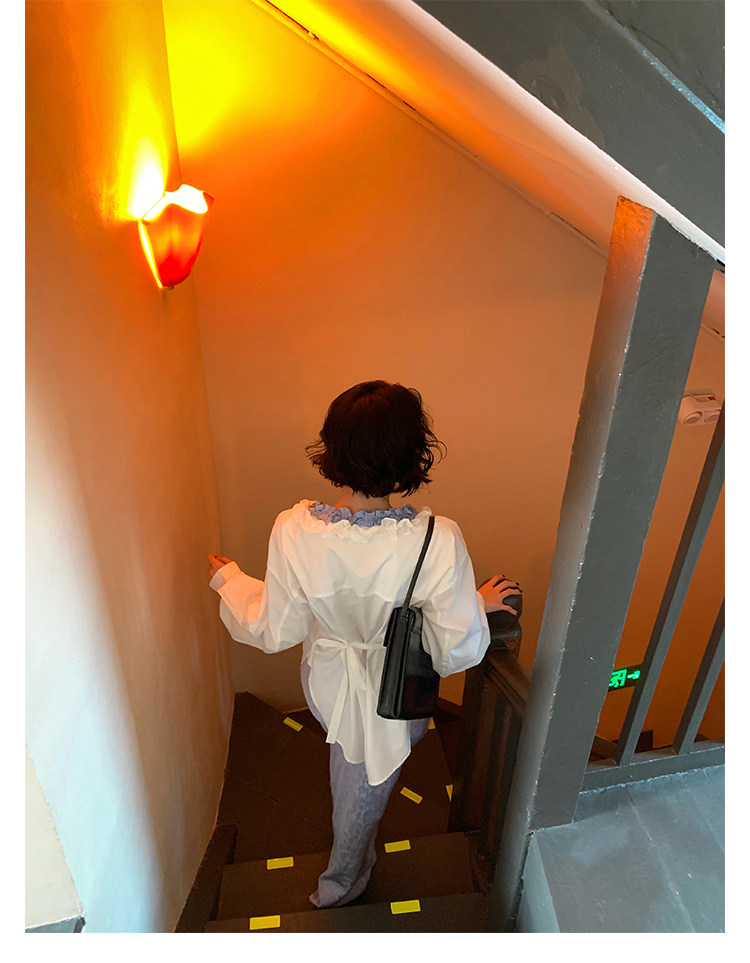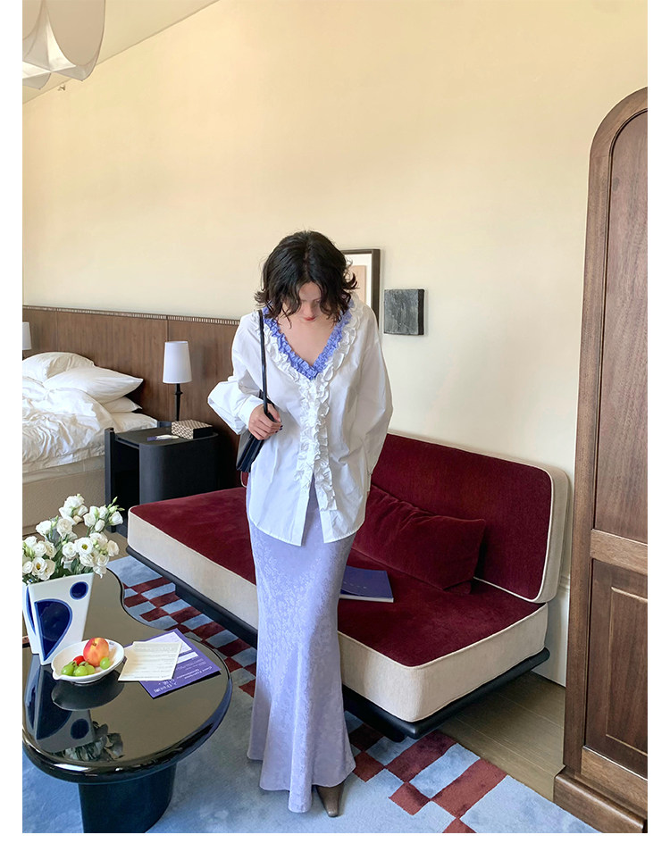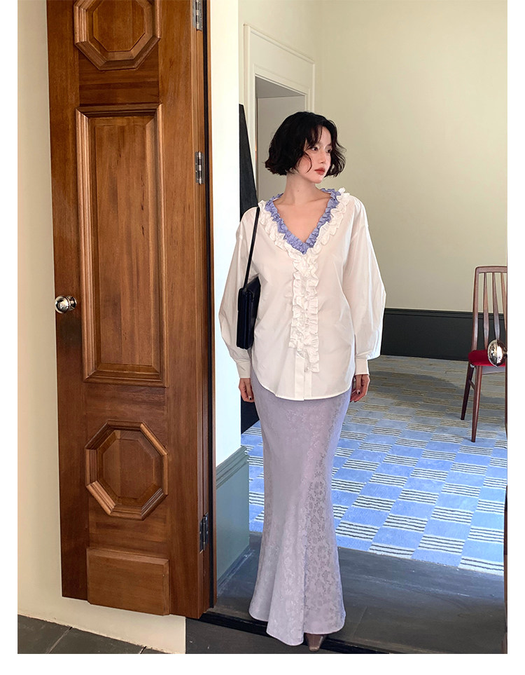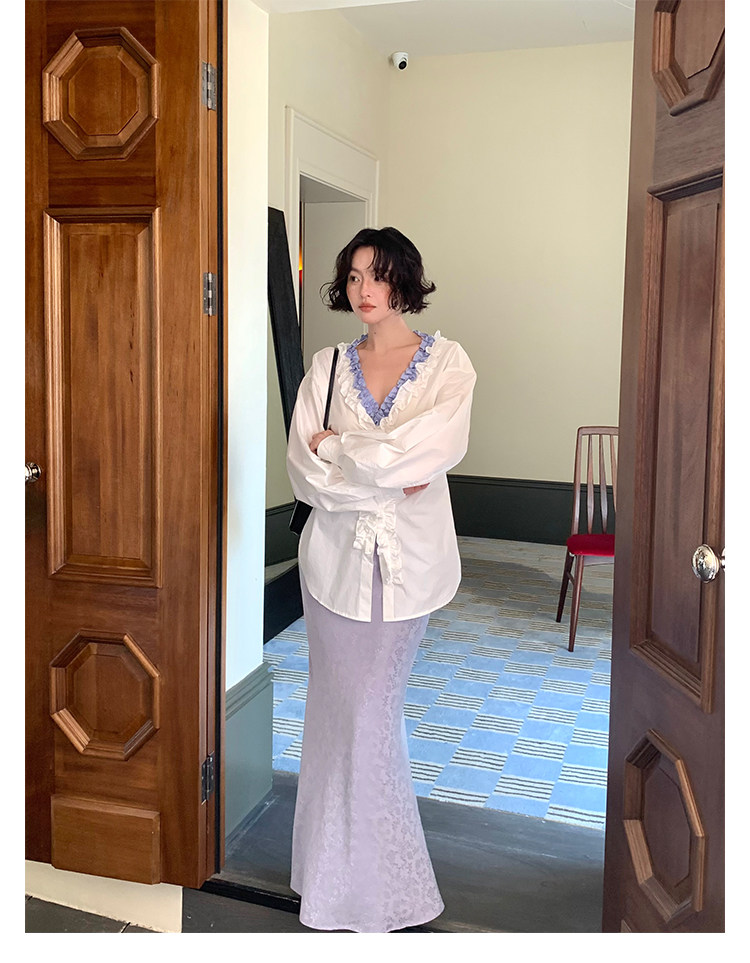 French Retro Color-Block Faux Two-Piece Lace V-Neck Shirt – Autumn Style