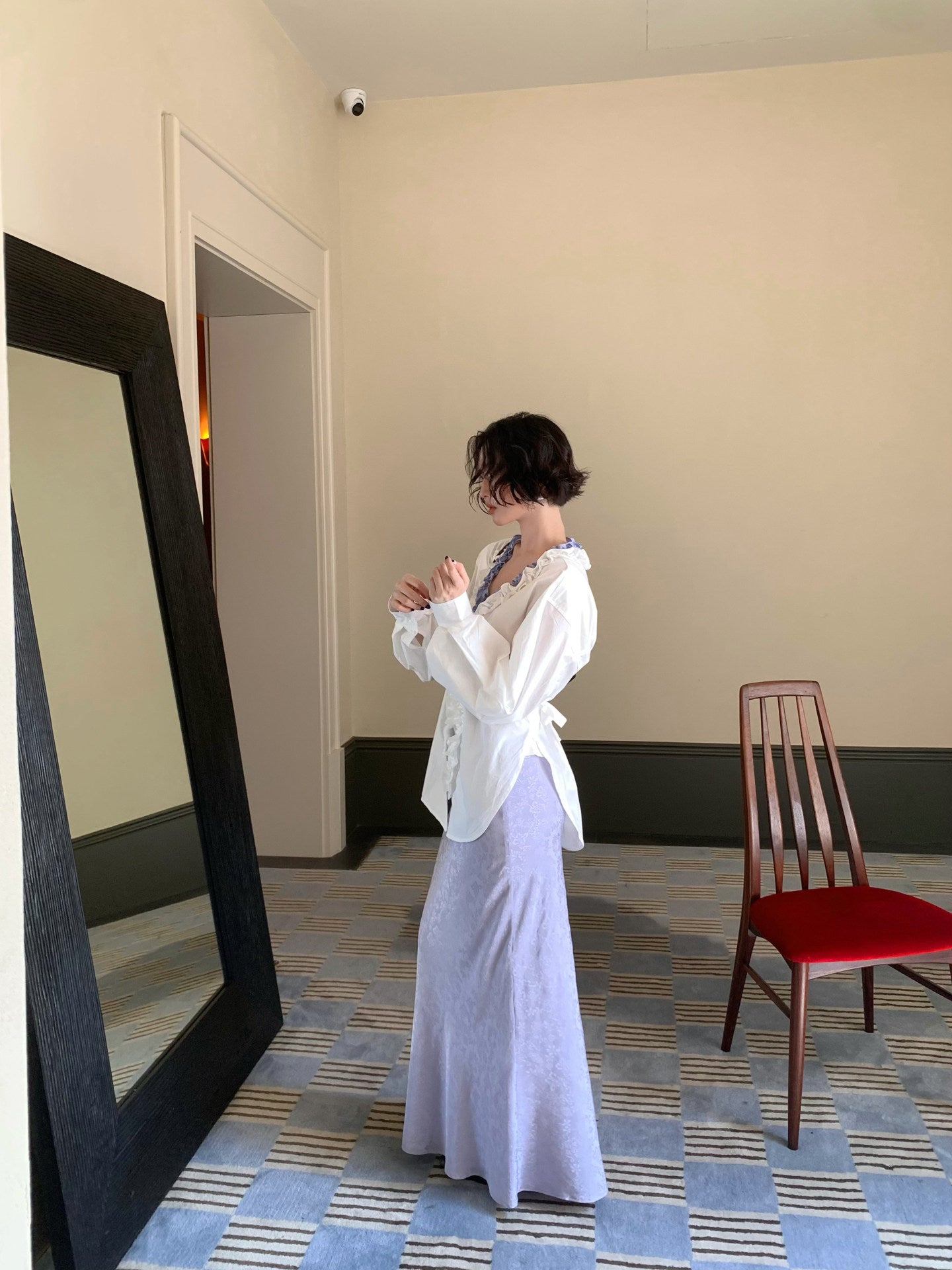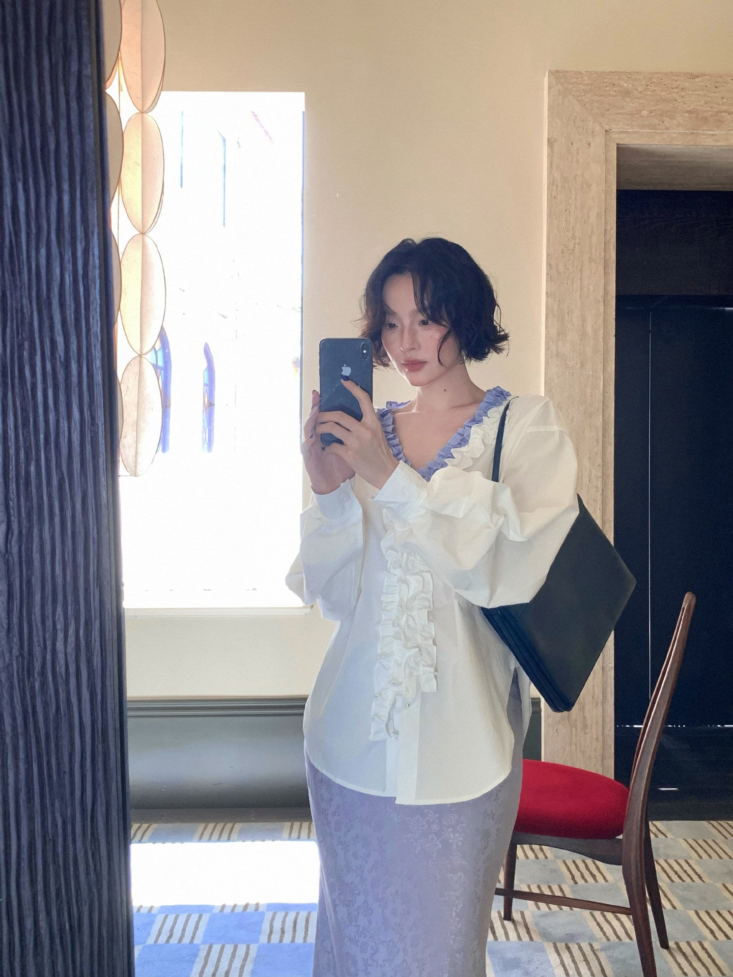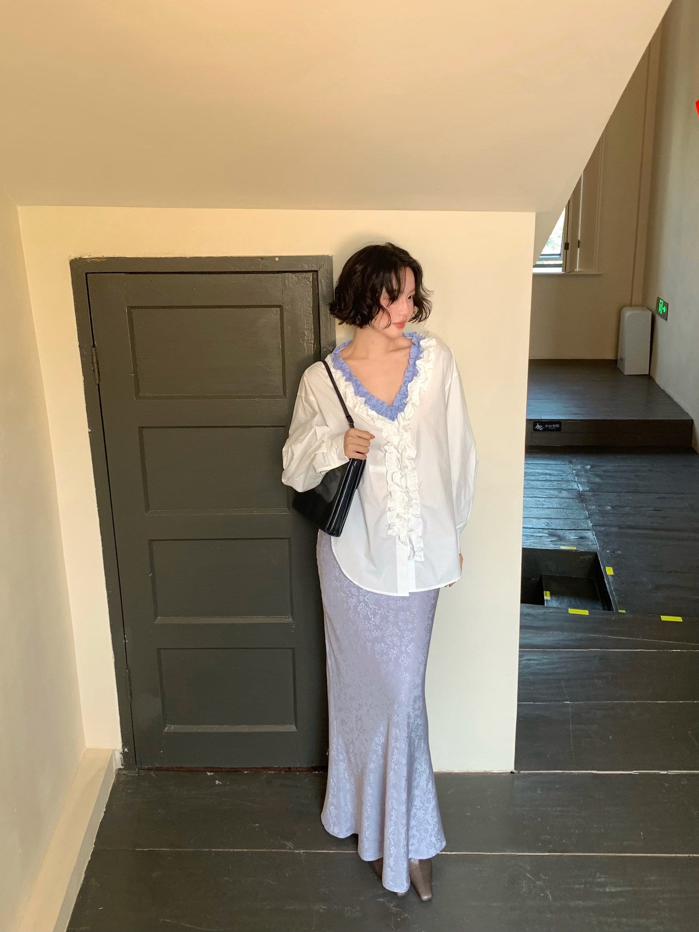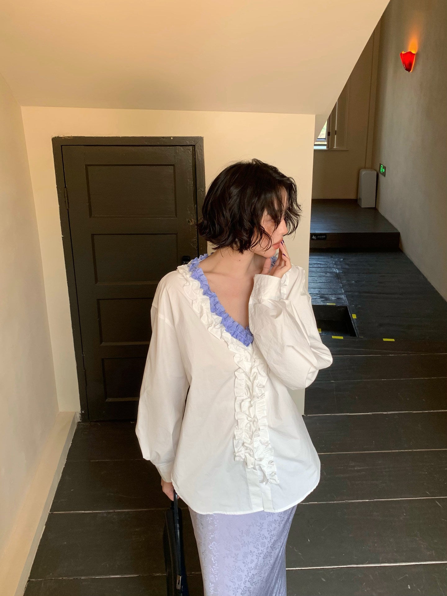 French Retro Color-Block Faux Two-Piece Lace V-Neck Shirt – Autumn Style