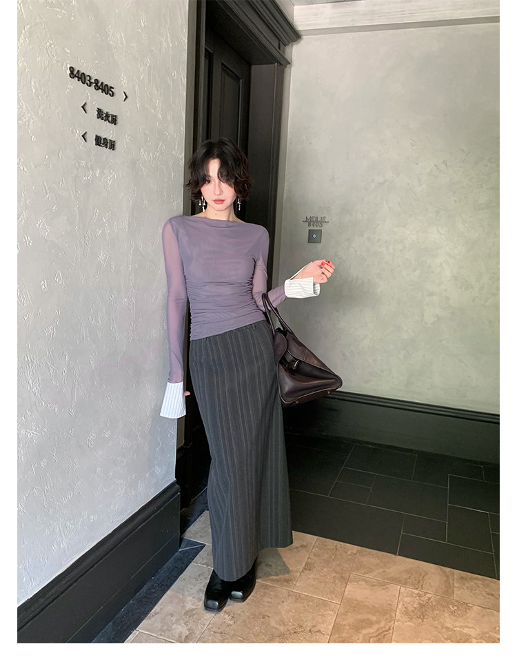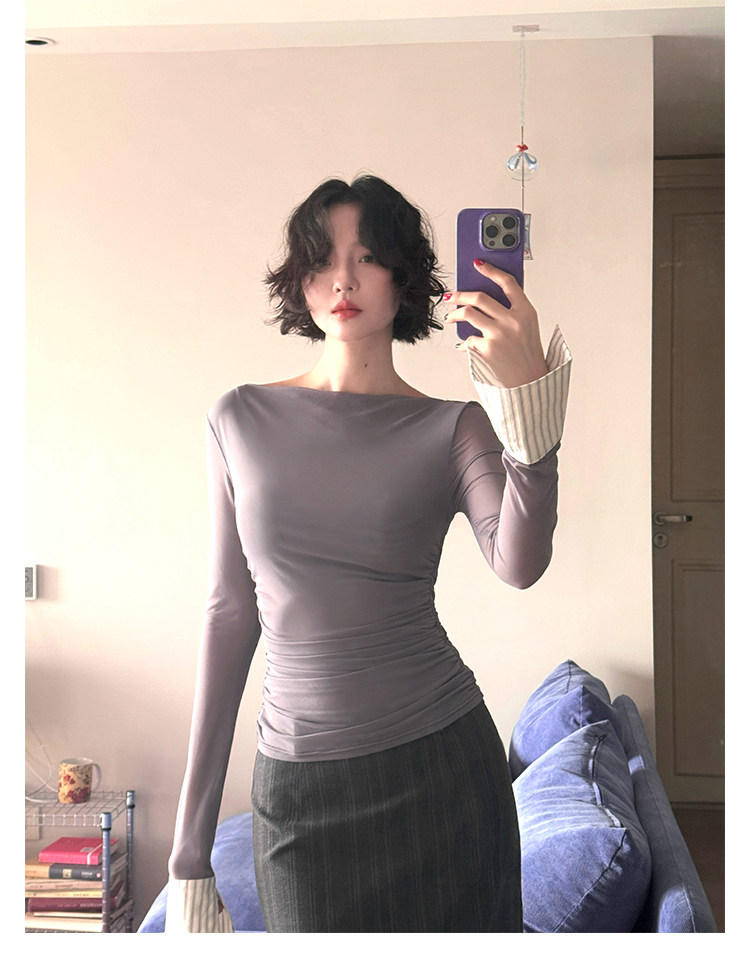 Grey Rhyme Off-Neck Sheer Long-Sleeve Top – Elegant Hong Kong Retro Autumn Wear