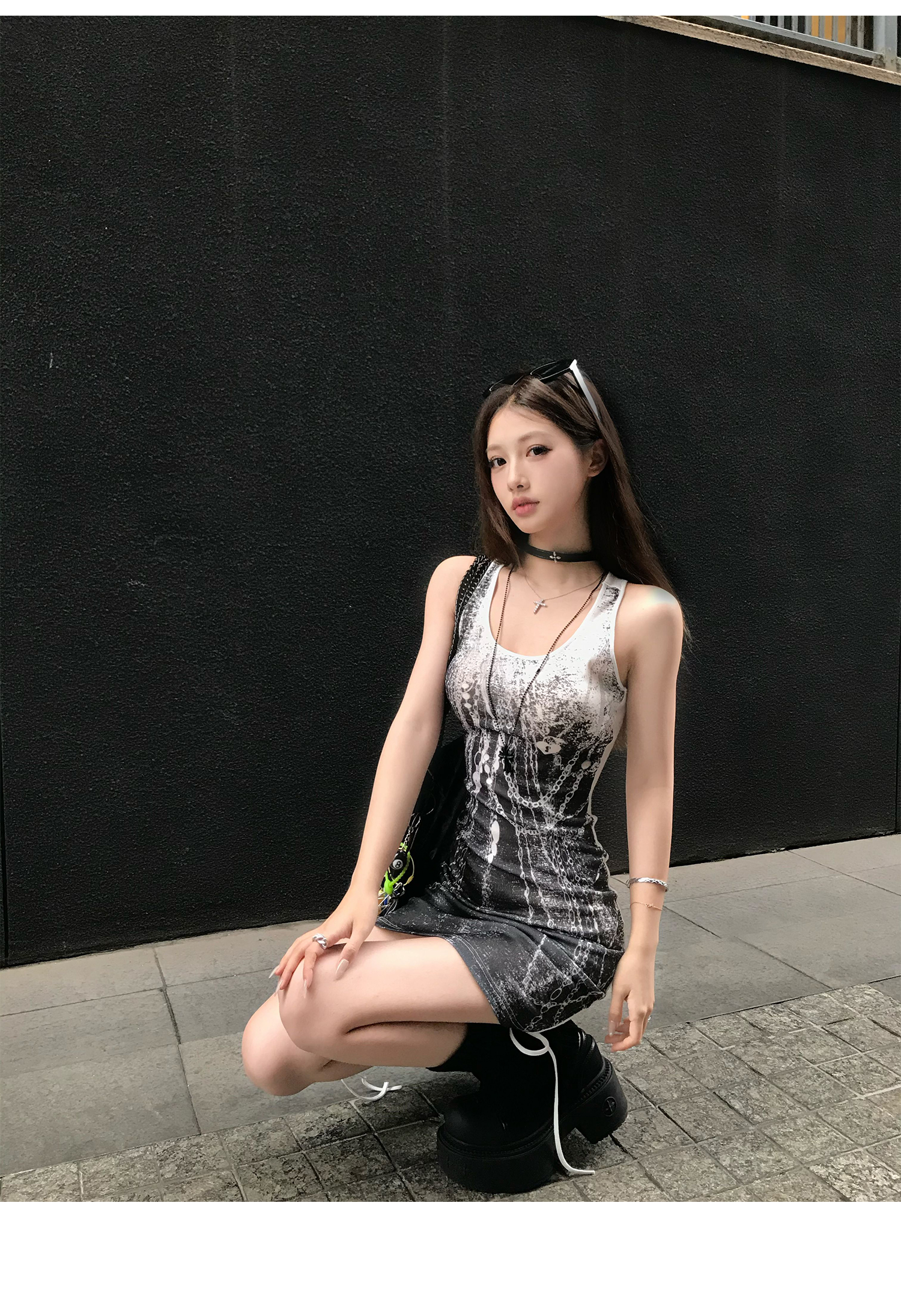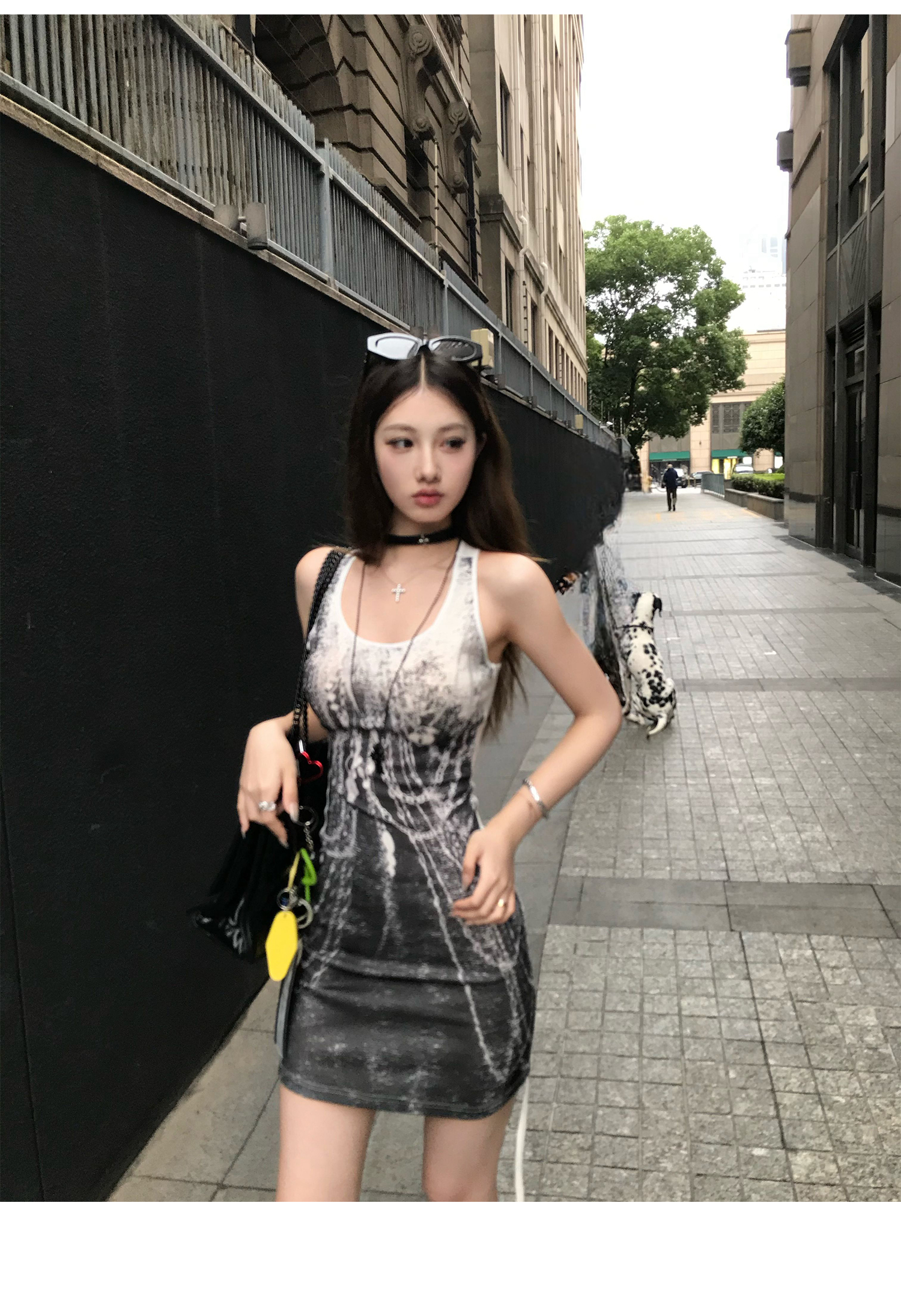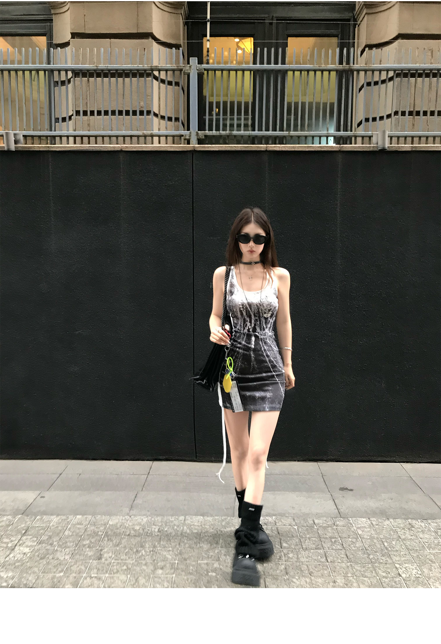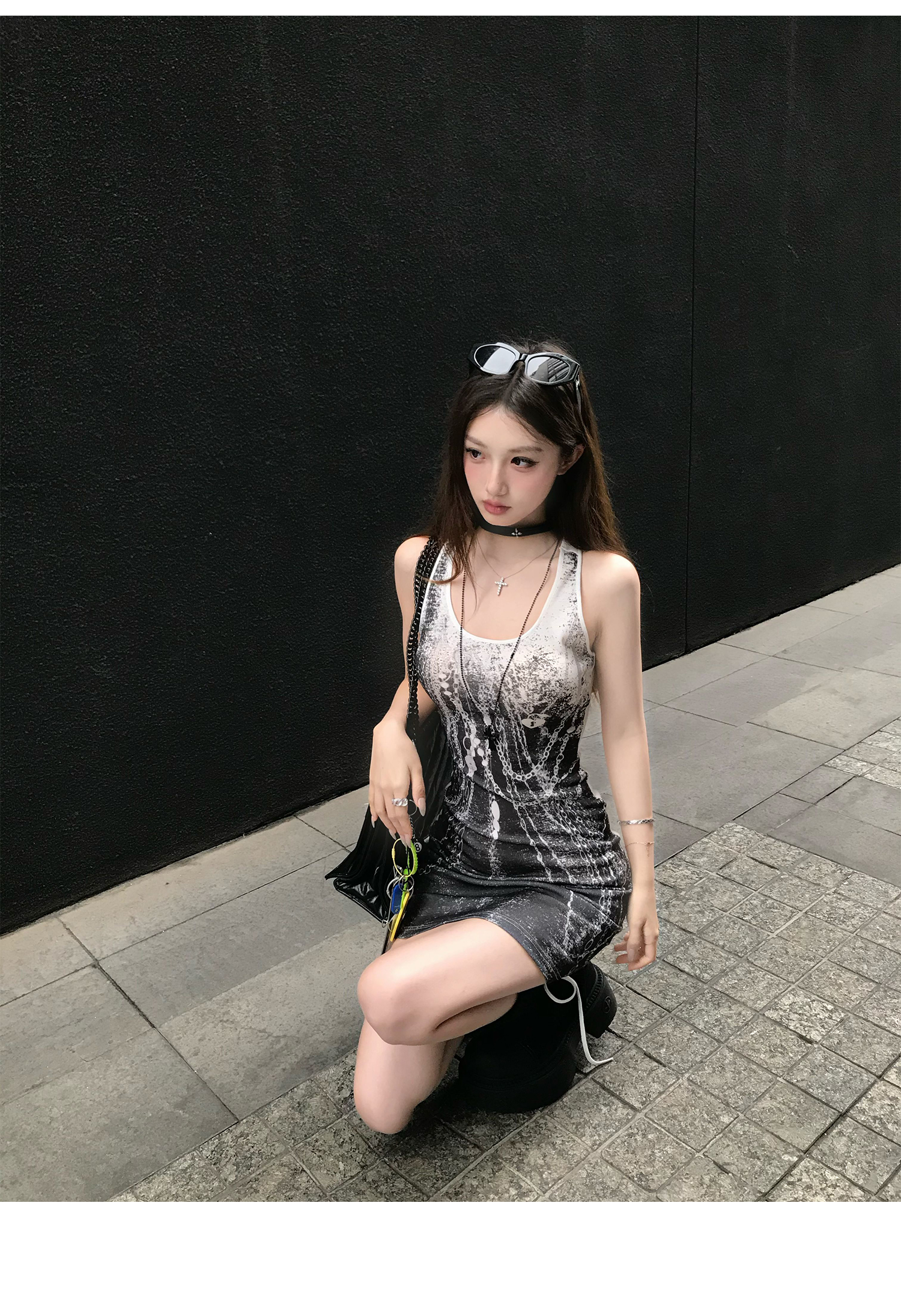 Hong Kong Style Slim Fit Sleeveless Printed Dress - Summer Vest Skirt