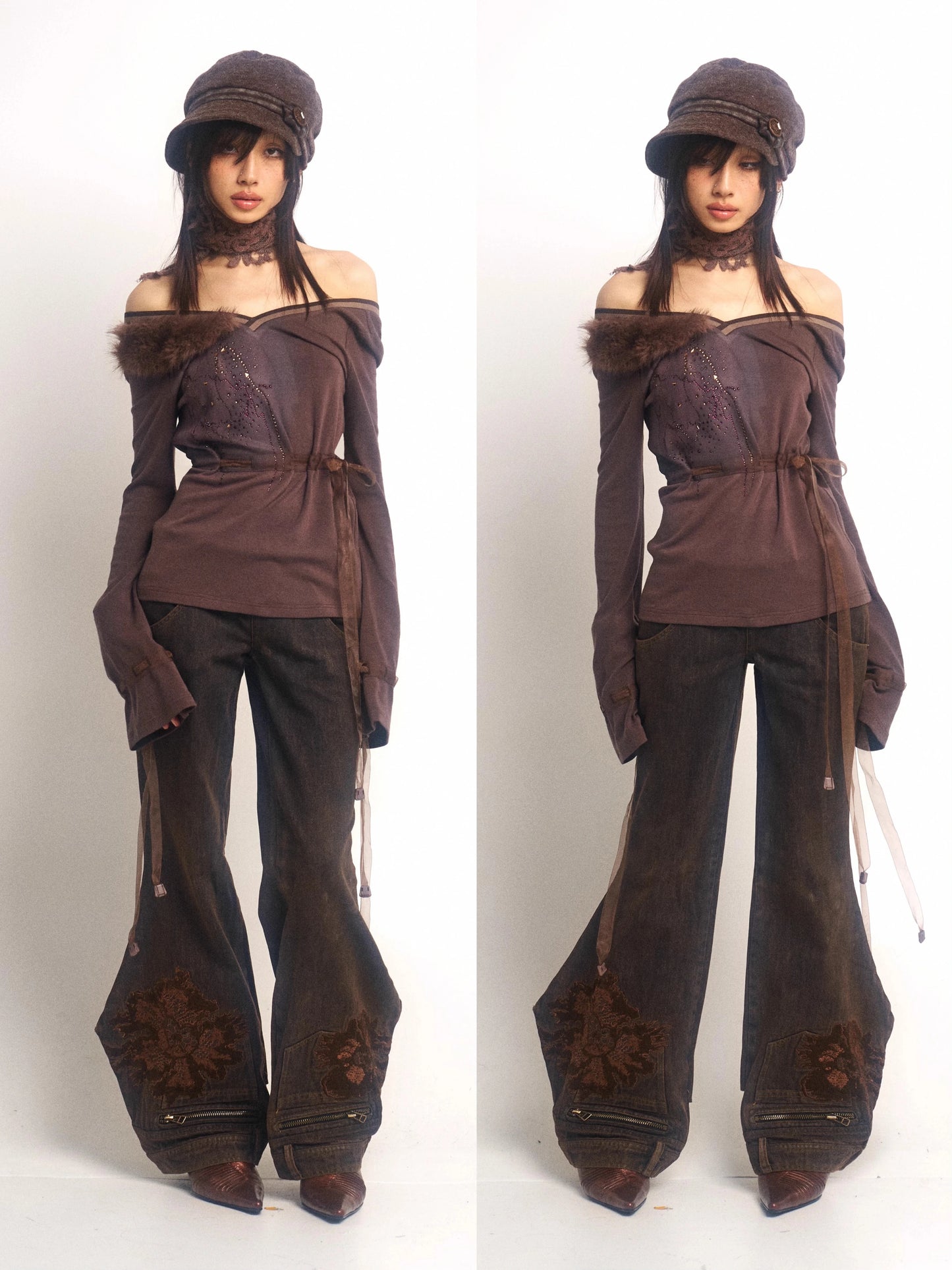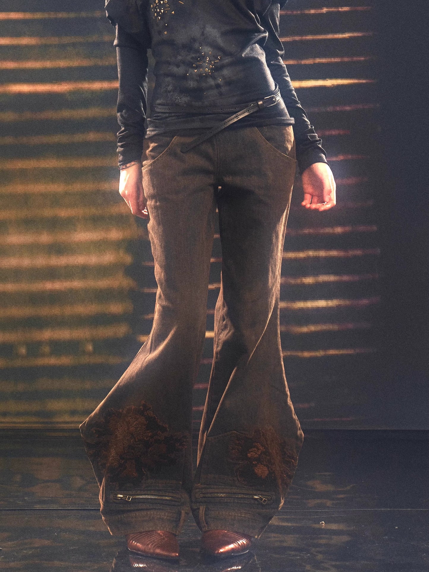 Lace Embroidery Washed Jeans – Waistband Cuff Detail