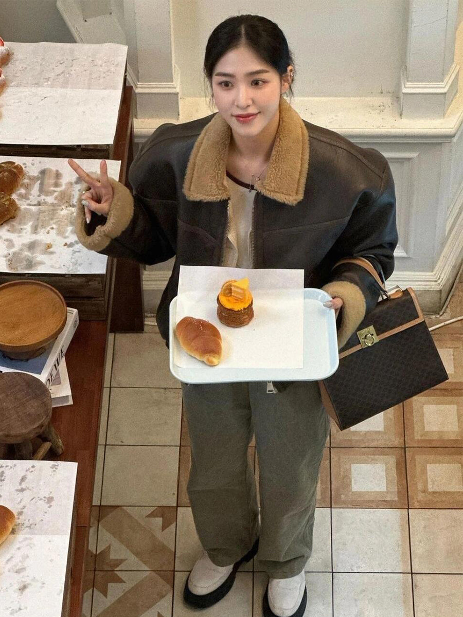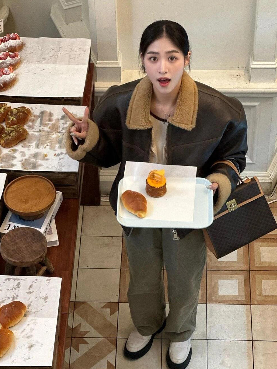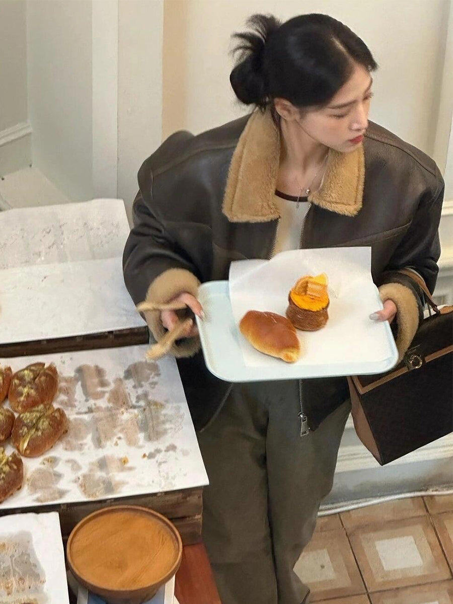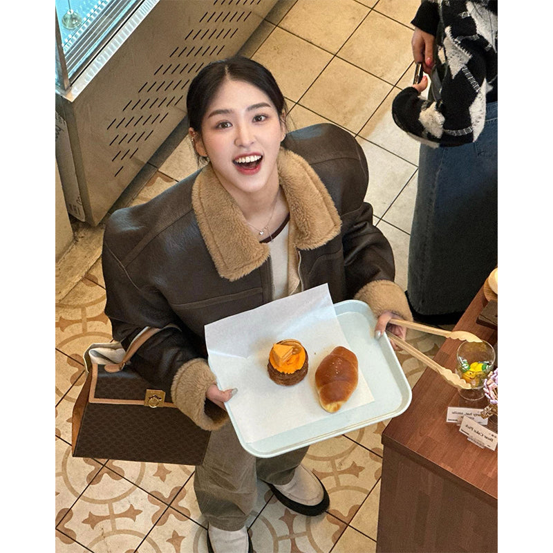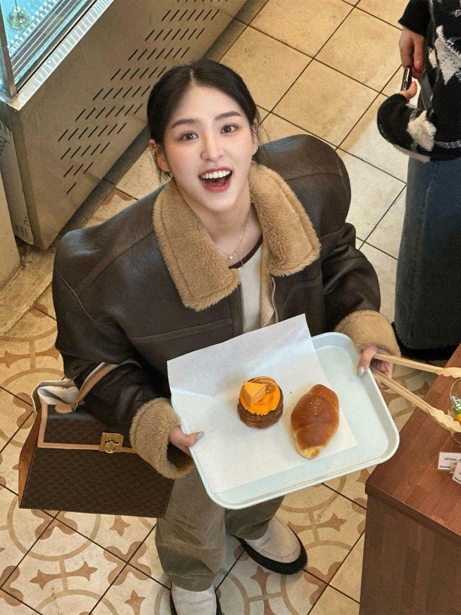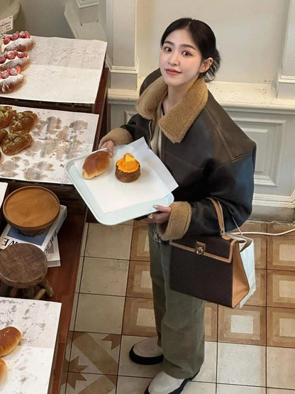 Lamb Wool Leather Jacket – Thickened Fur-Lined Brown Velvet Coat