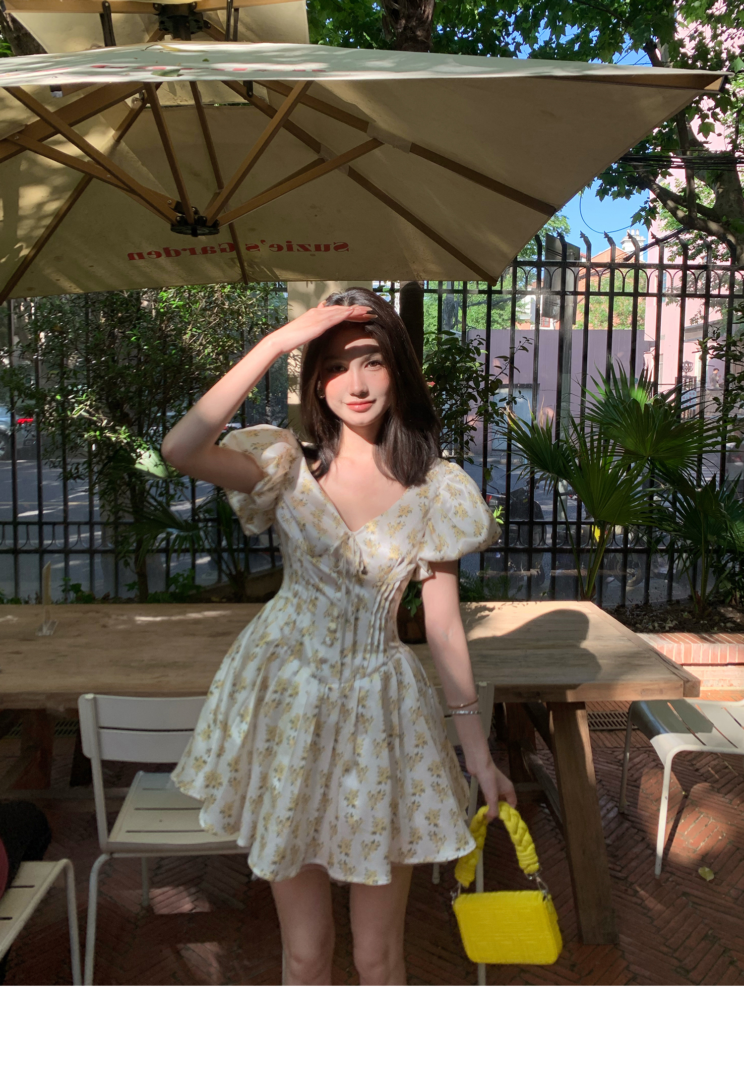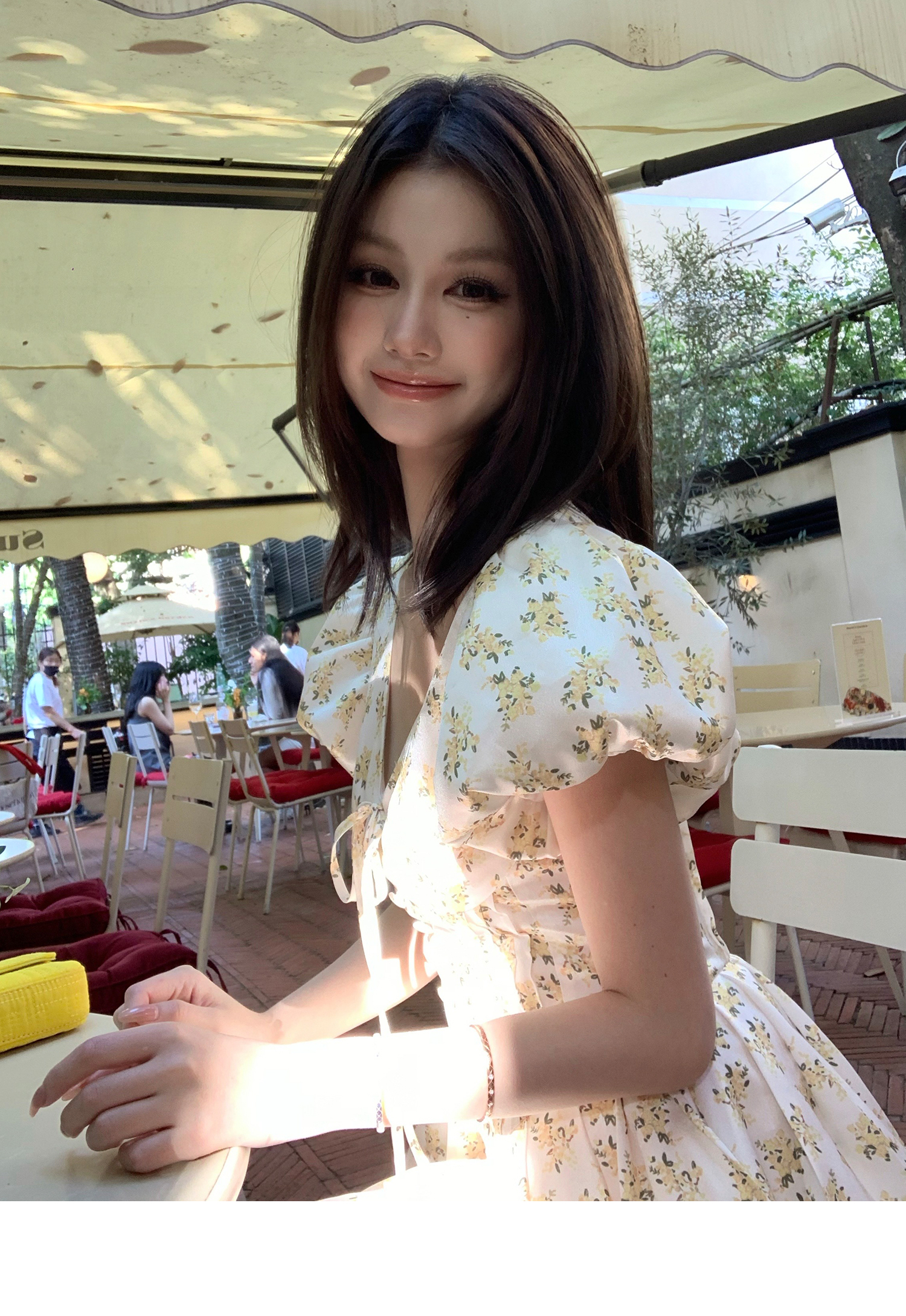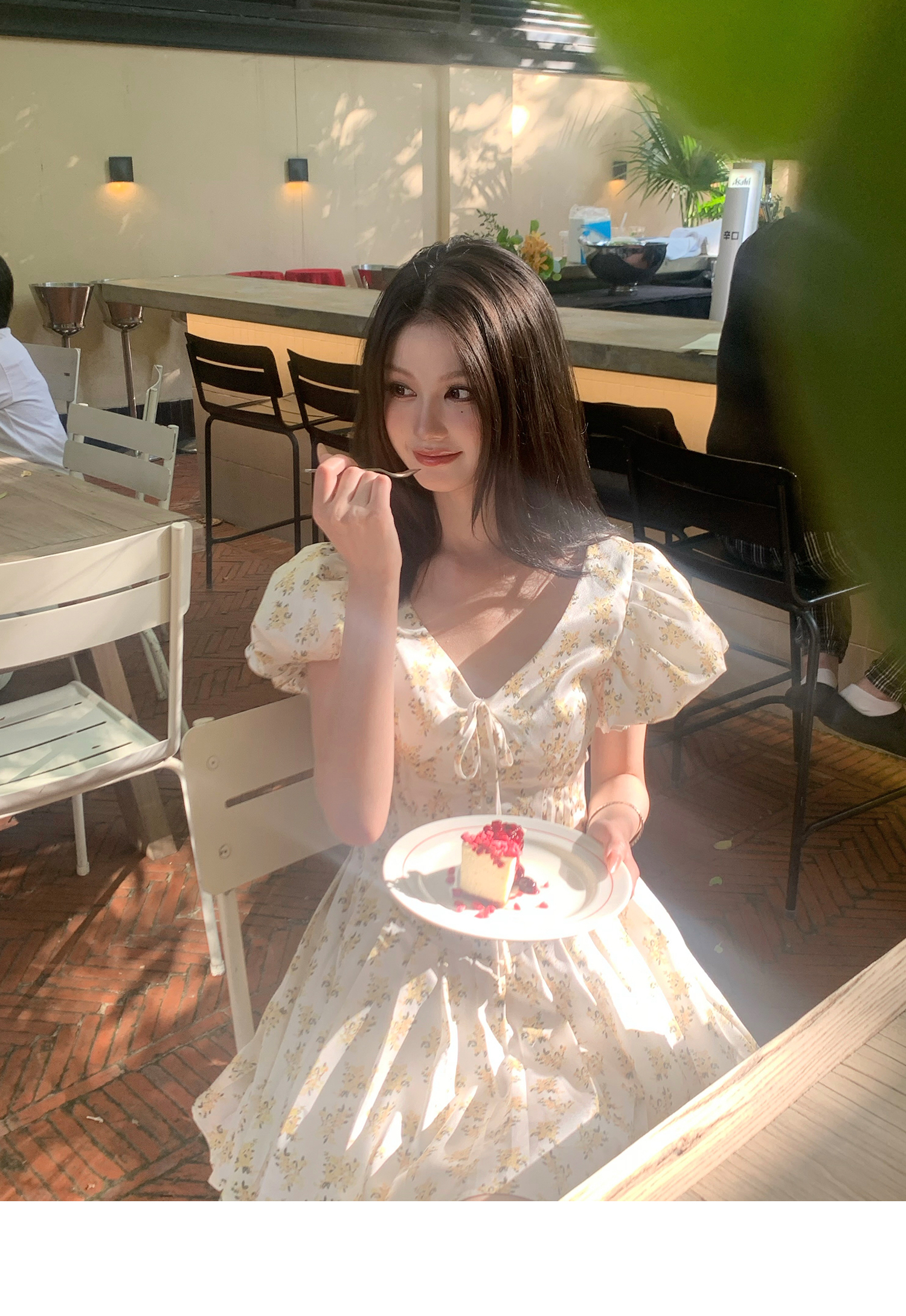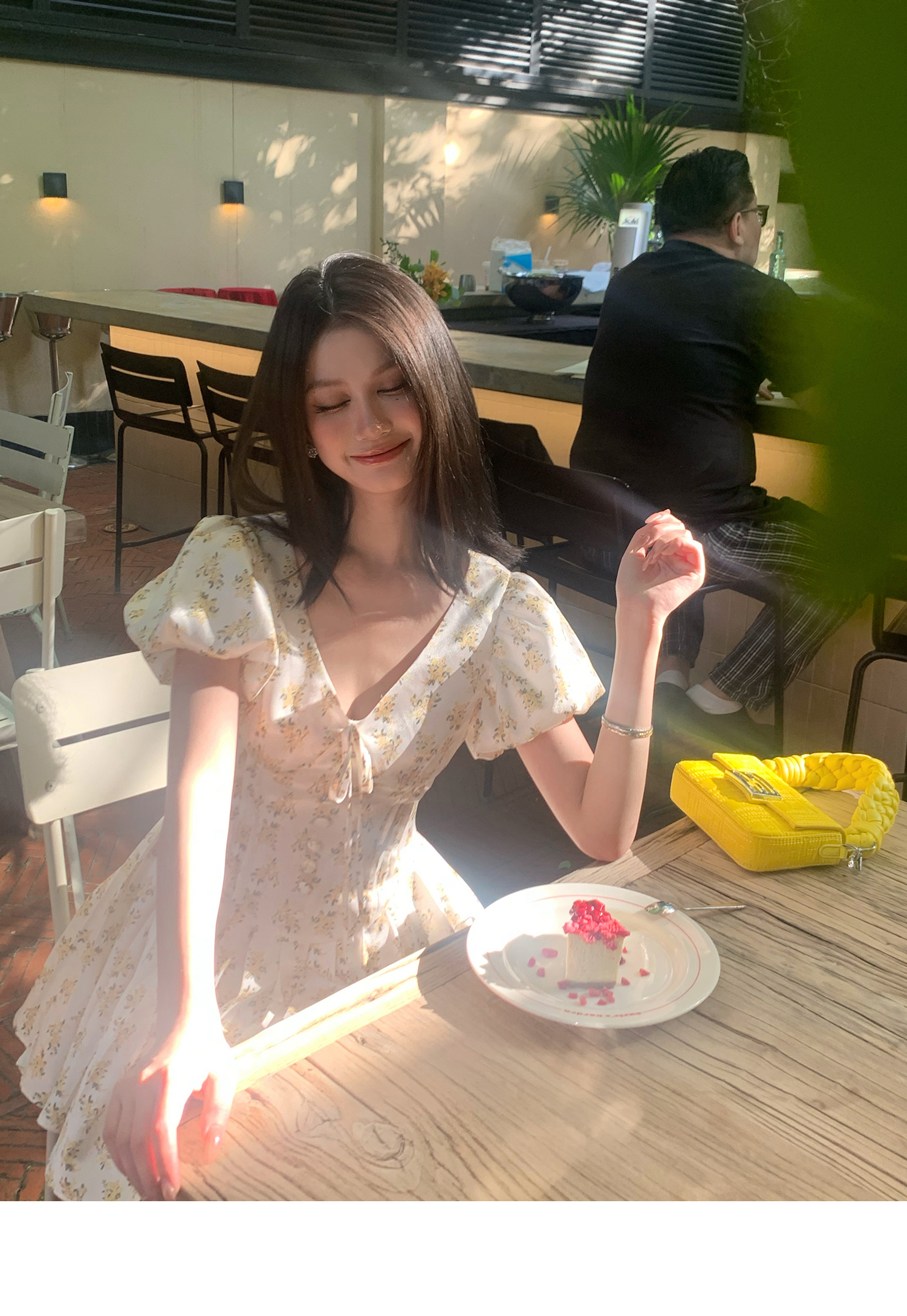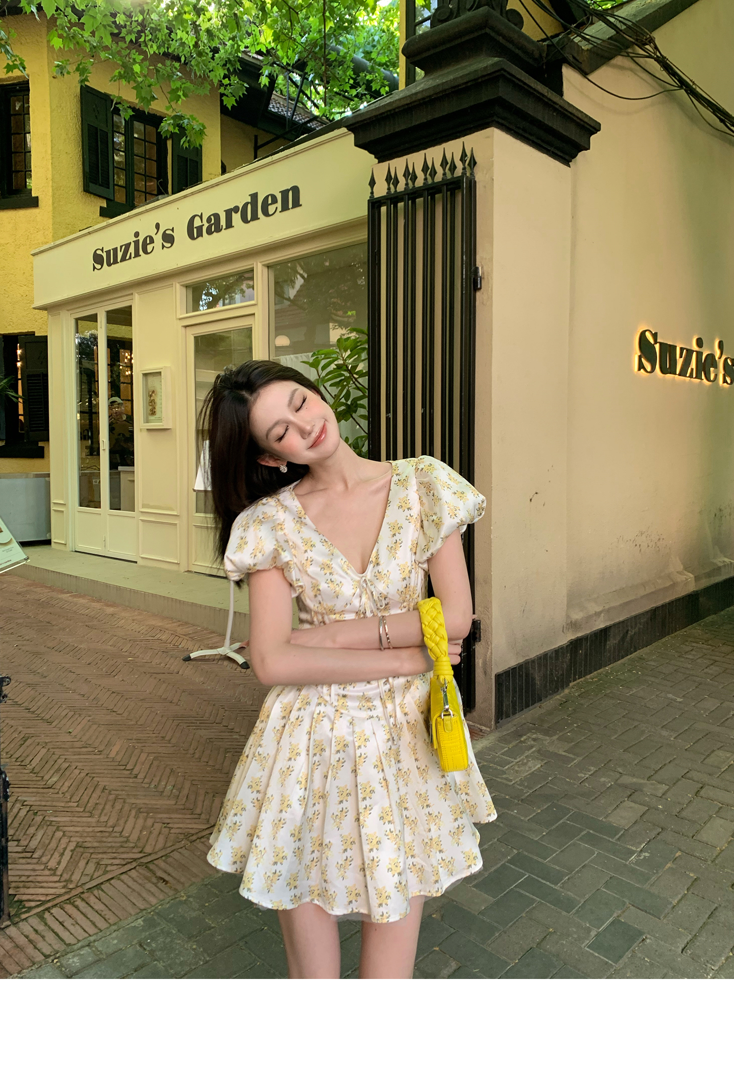 [Late Night Philadelphia] Slimming Puff Sleeve French Umbrella Skirt - Summer Floral Design