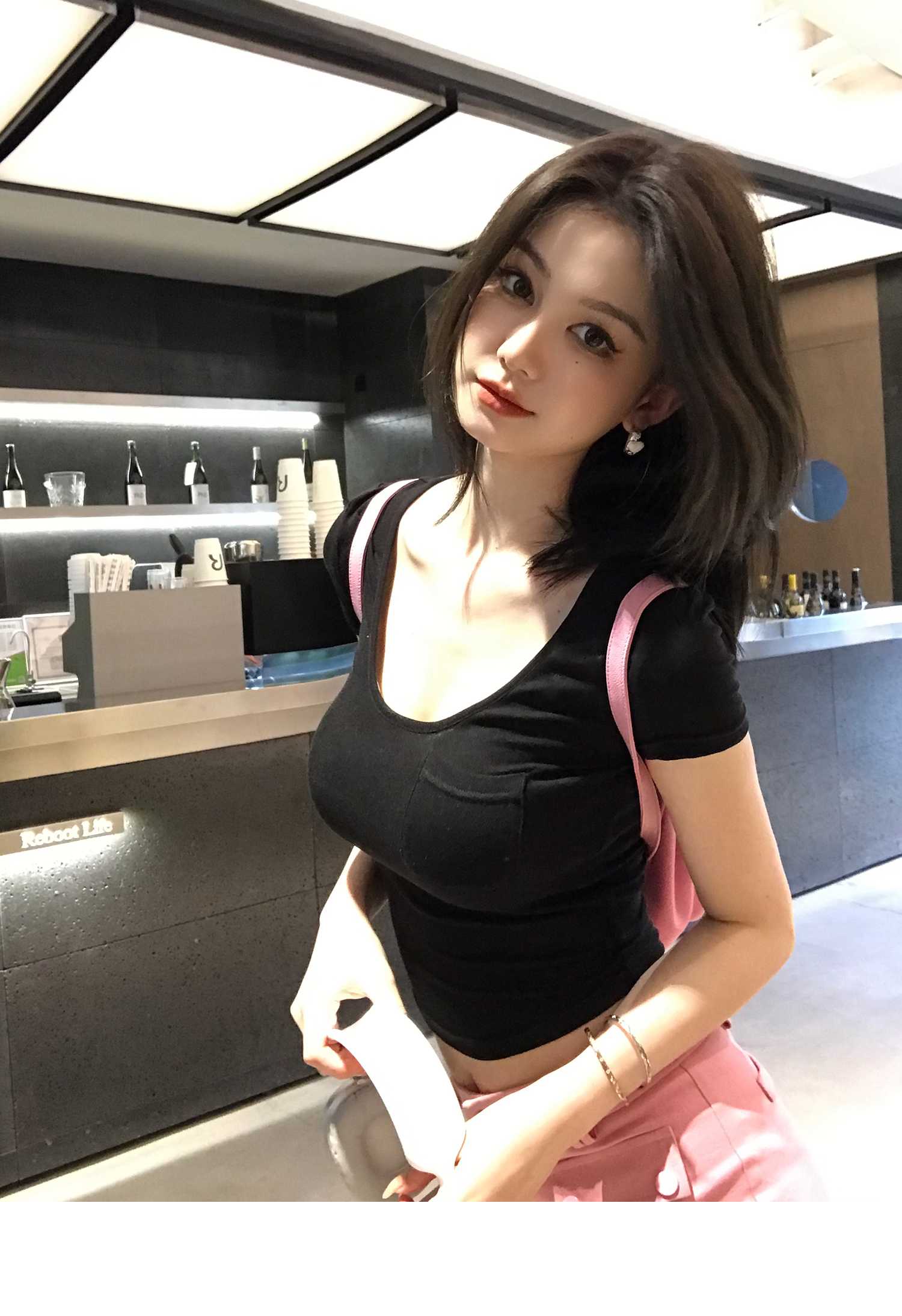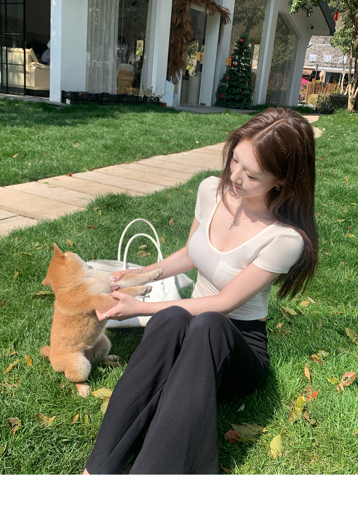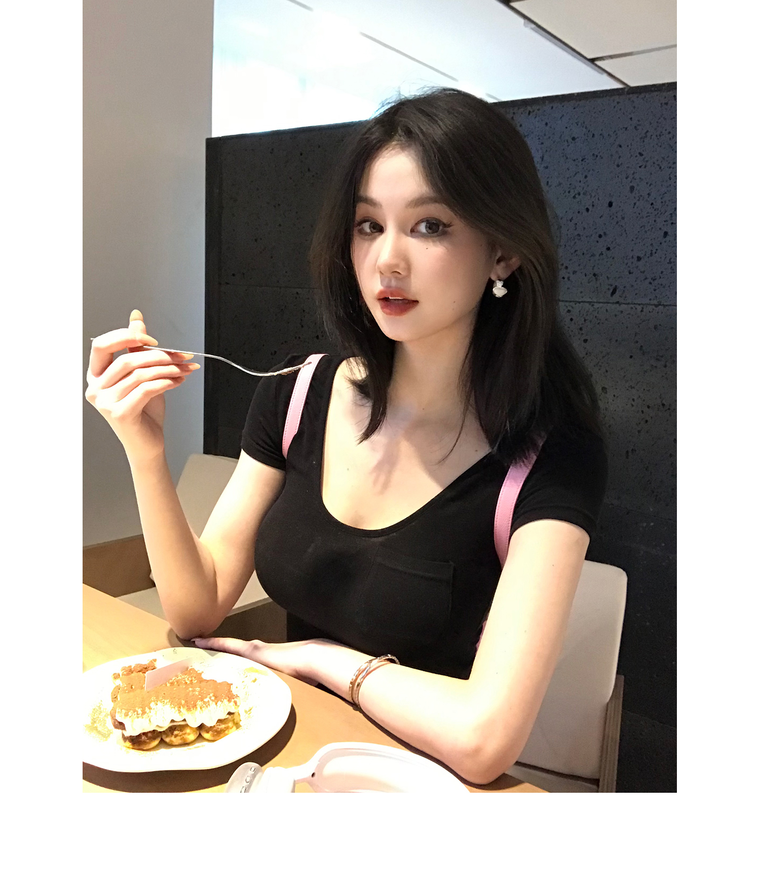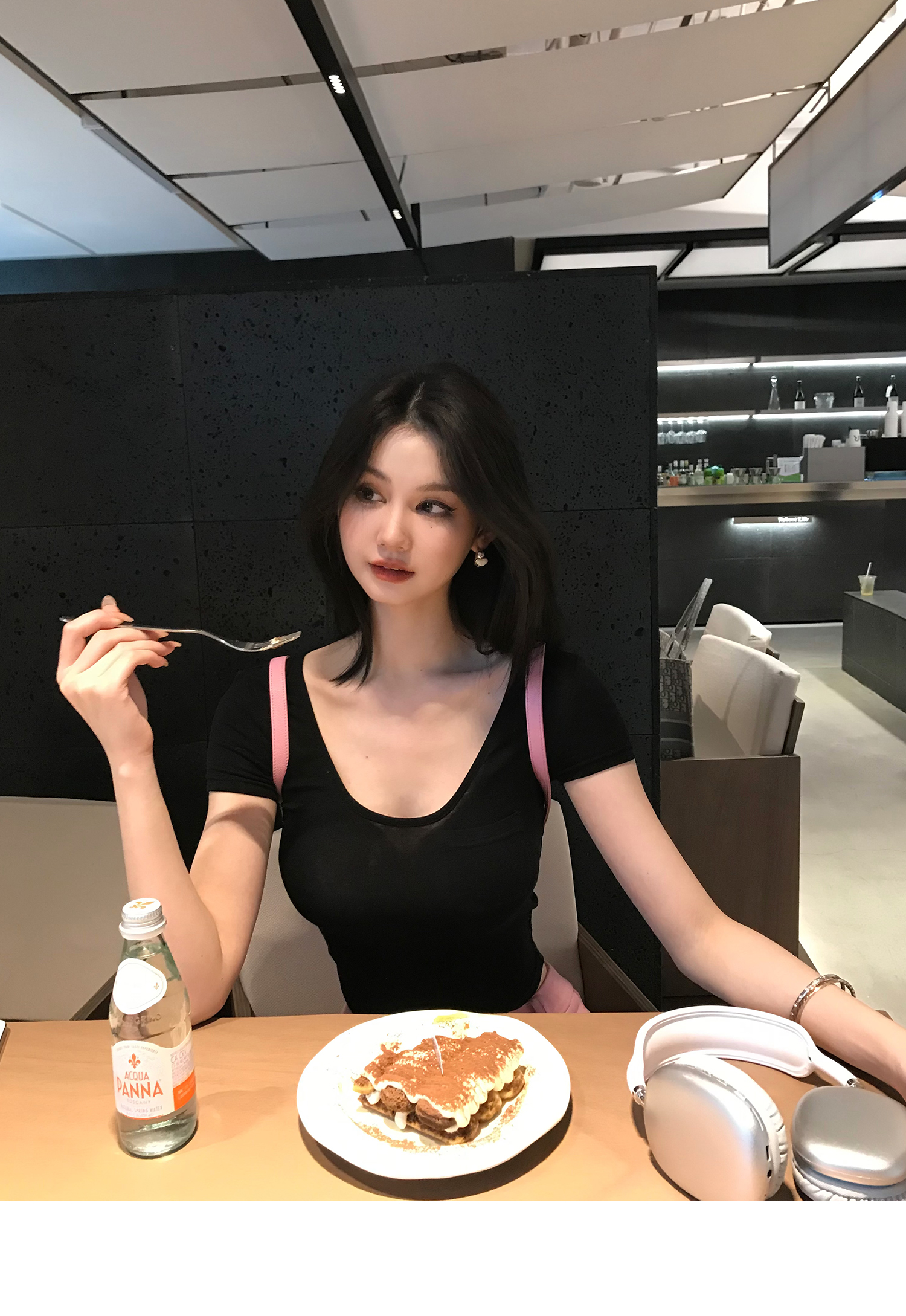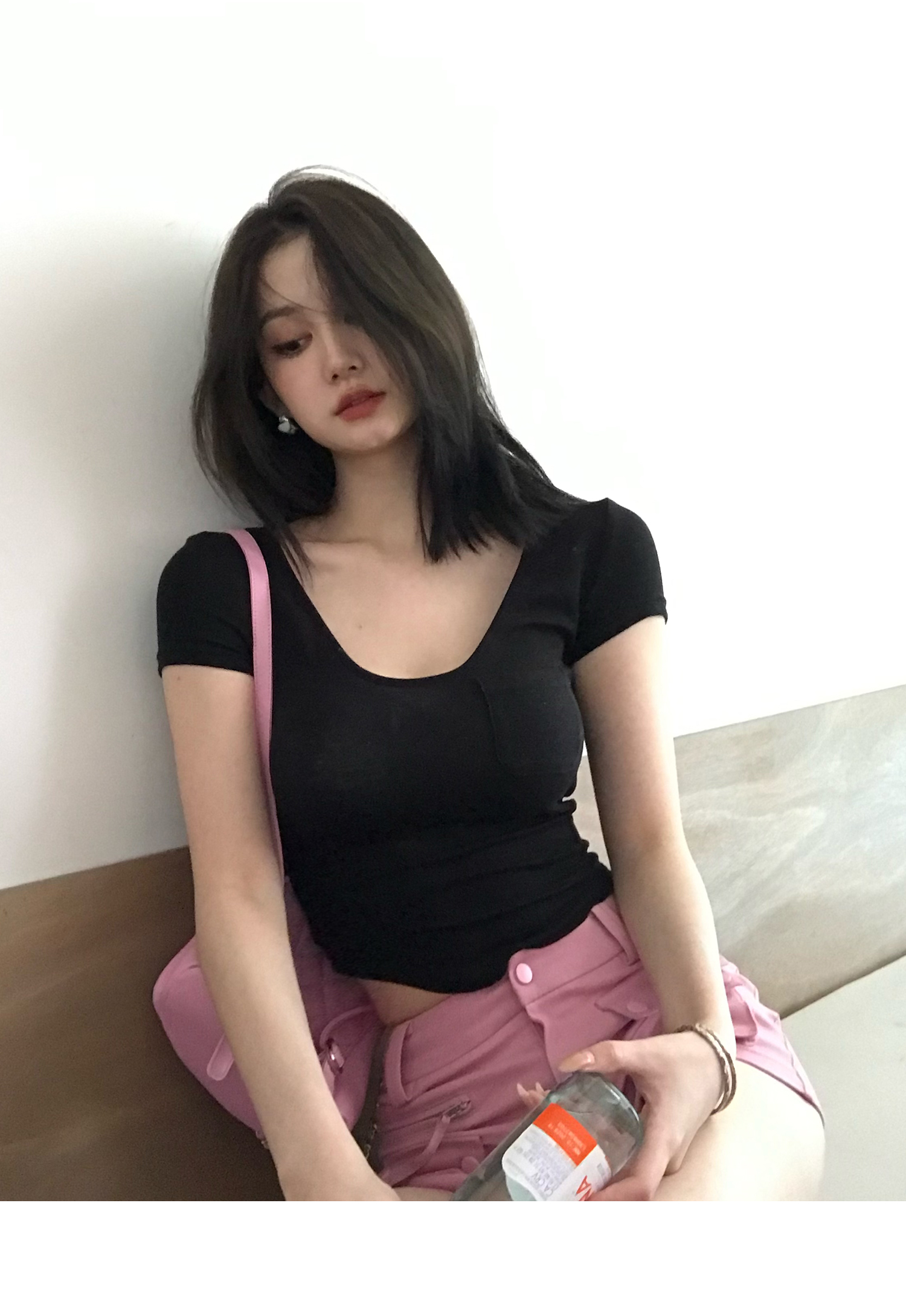 [Light Oxygen Mask Tee] Pure Desire U-Neck Short-Sleeve Slim Fit Top
