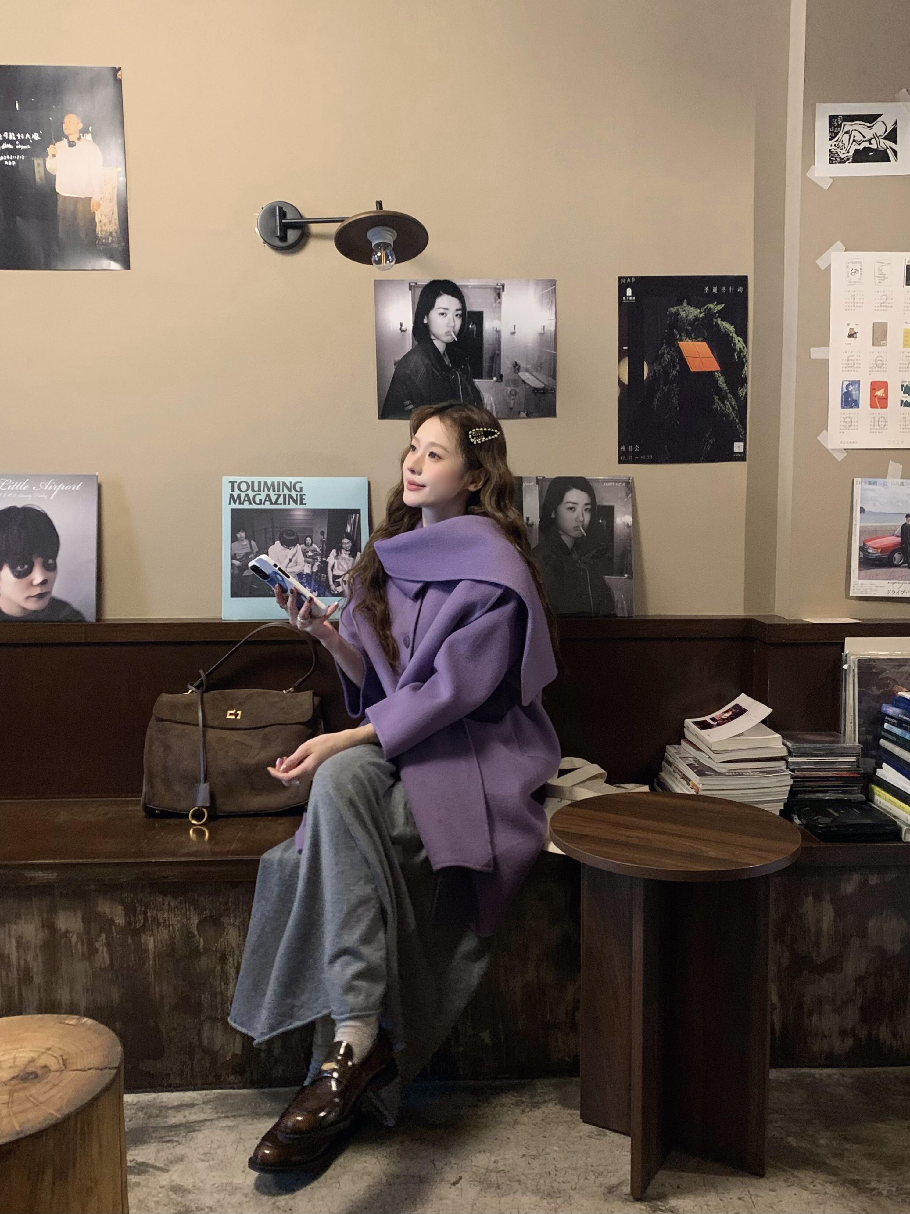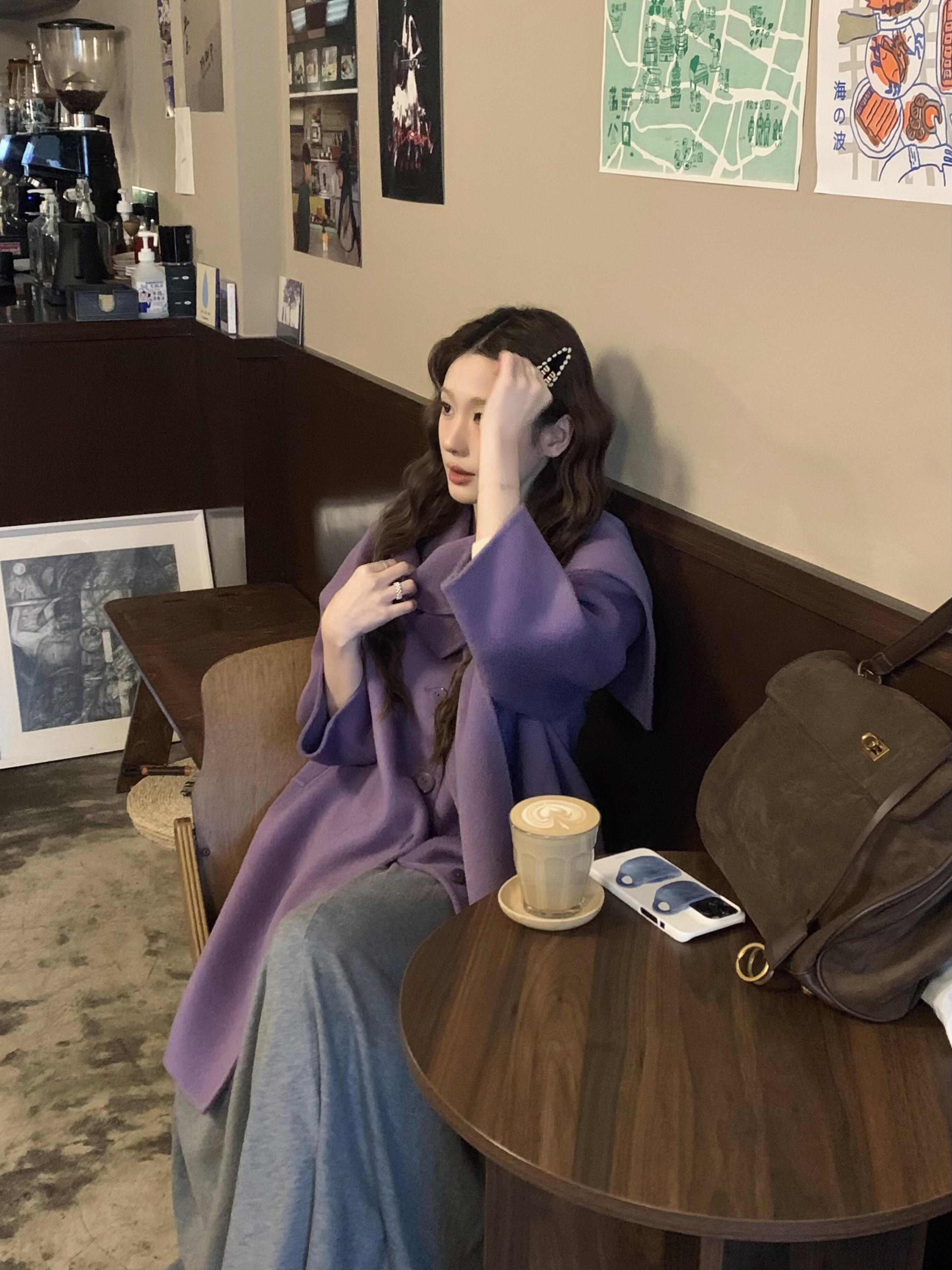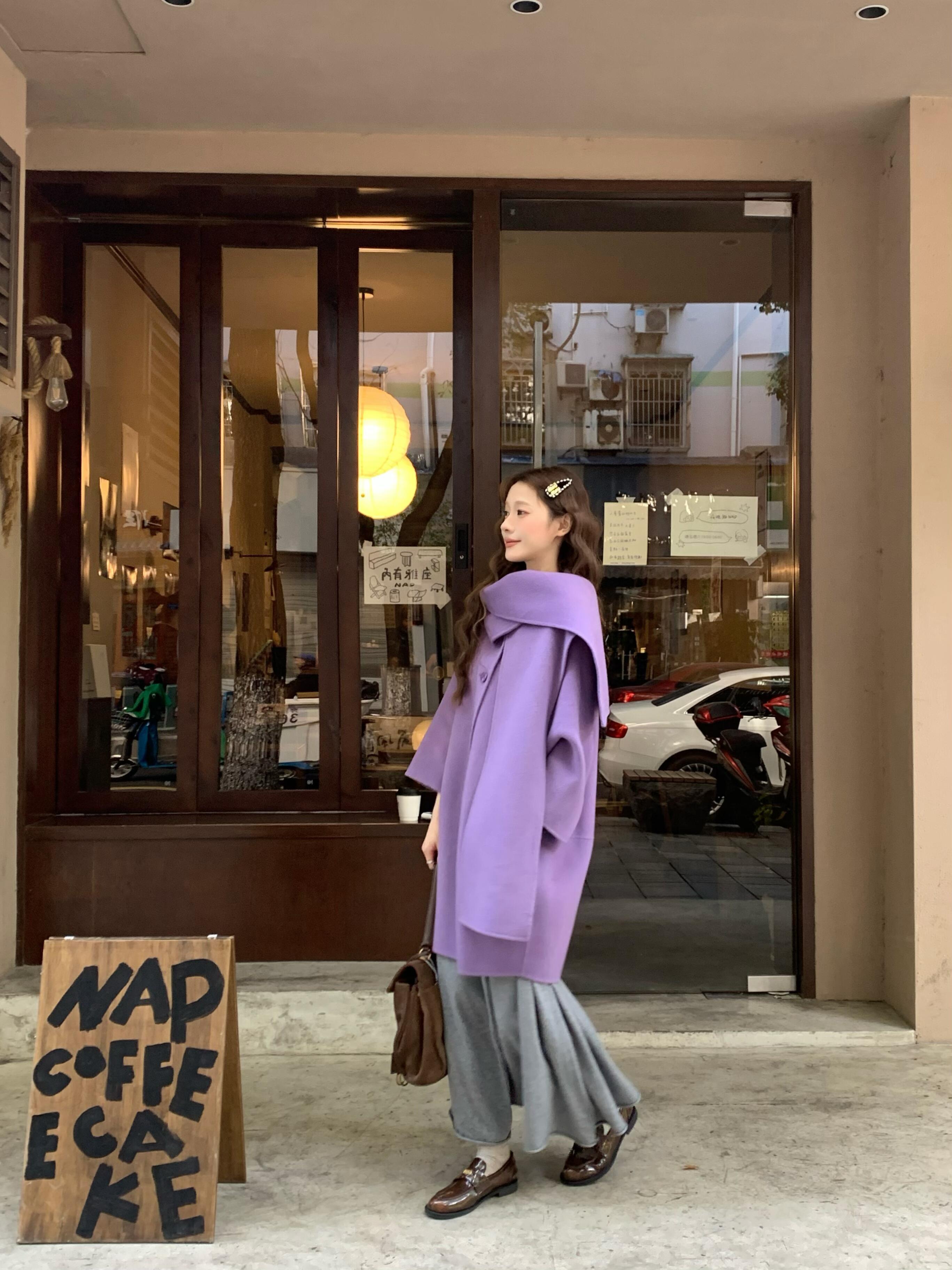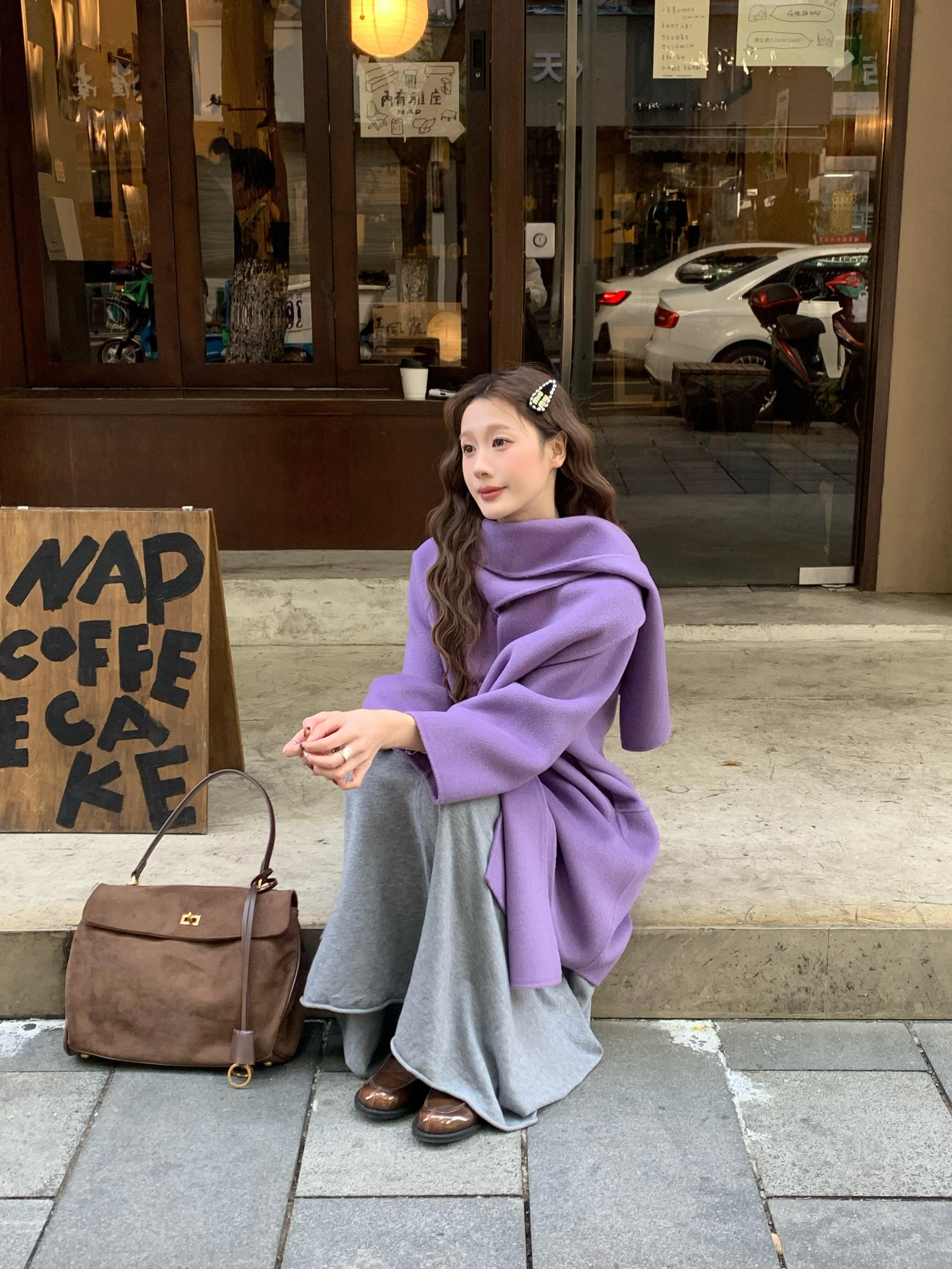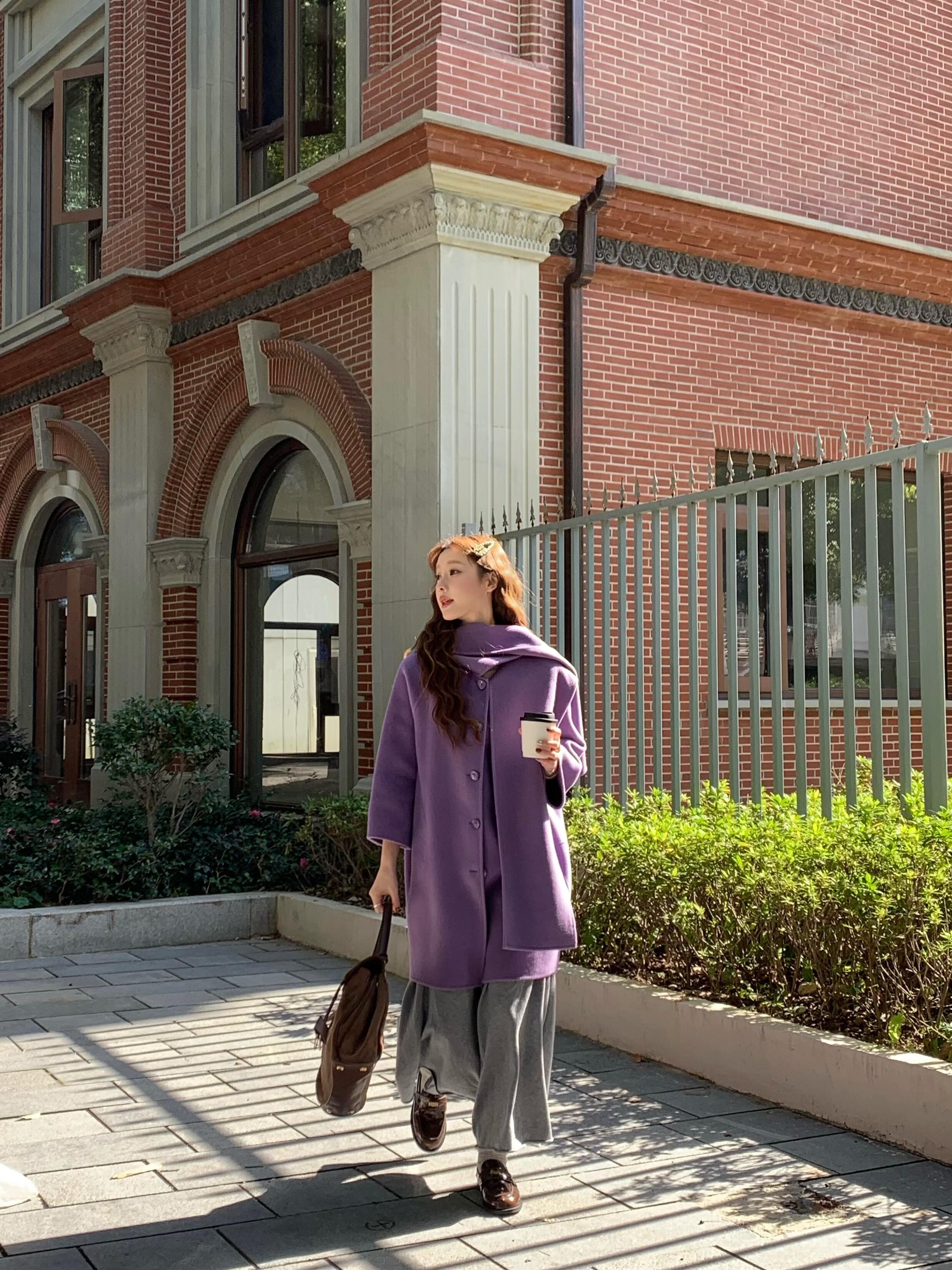 Purple Scarf Cashmere Coat – Elegant Double-Sided Woolen Outerwear