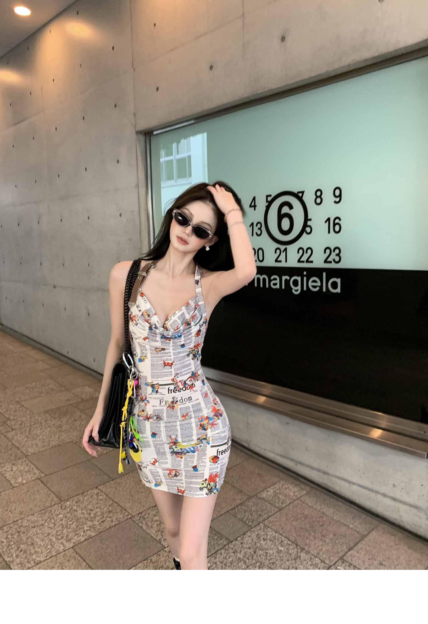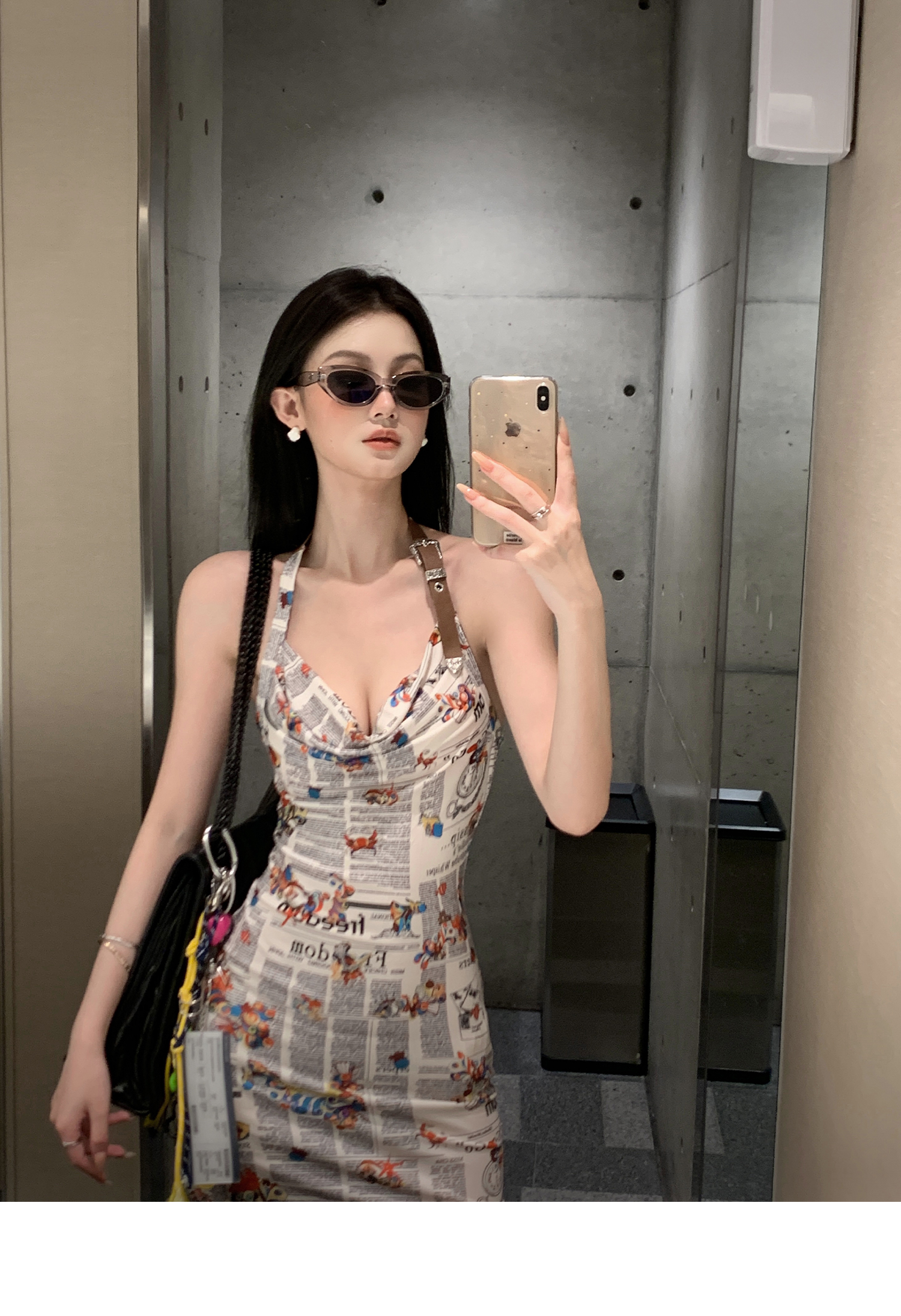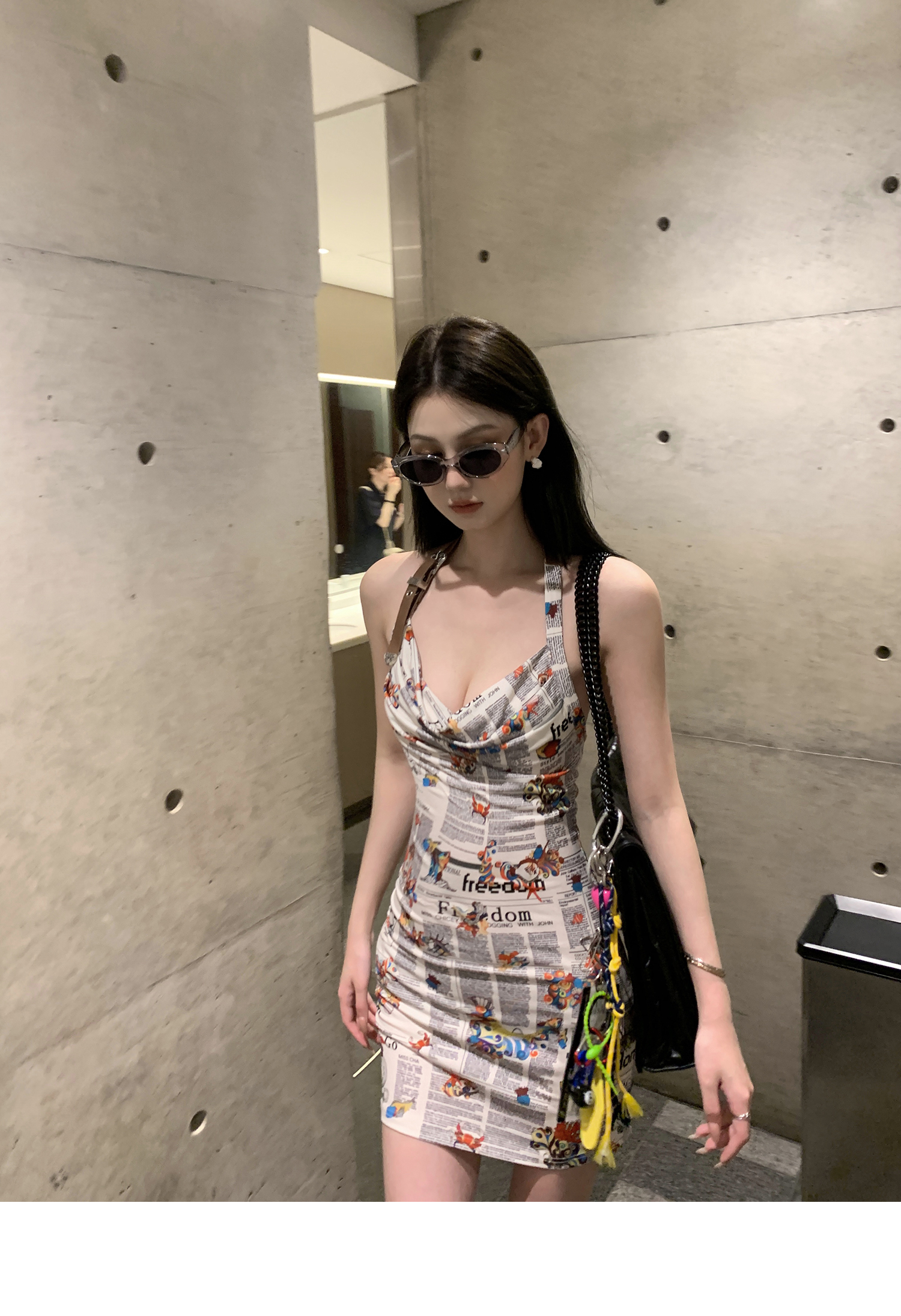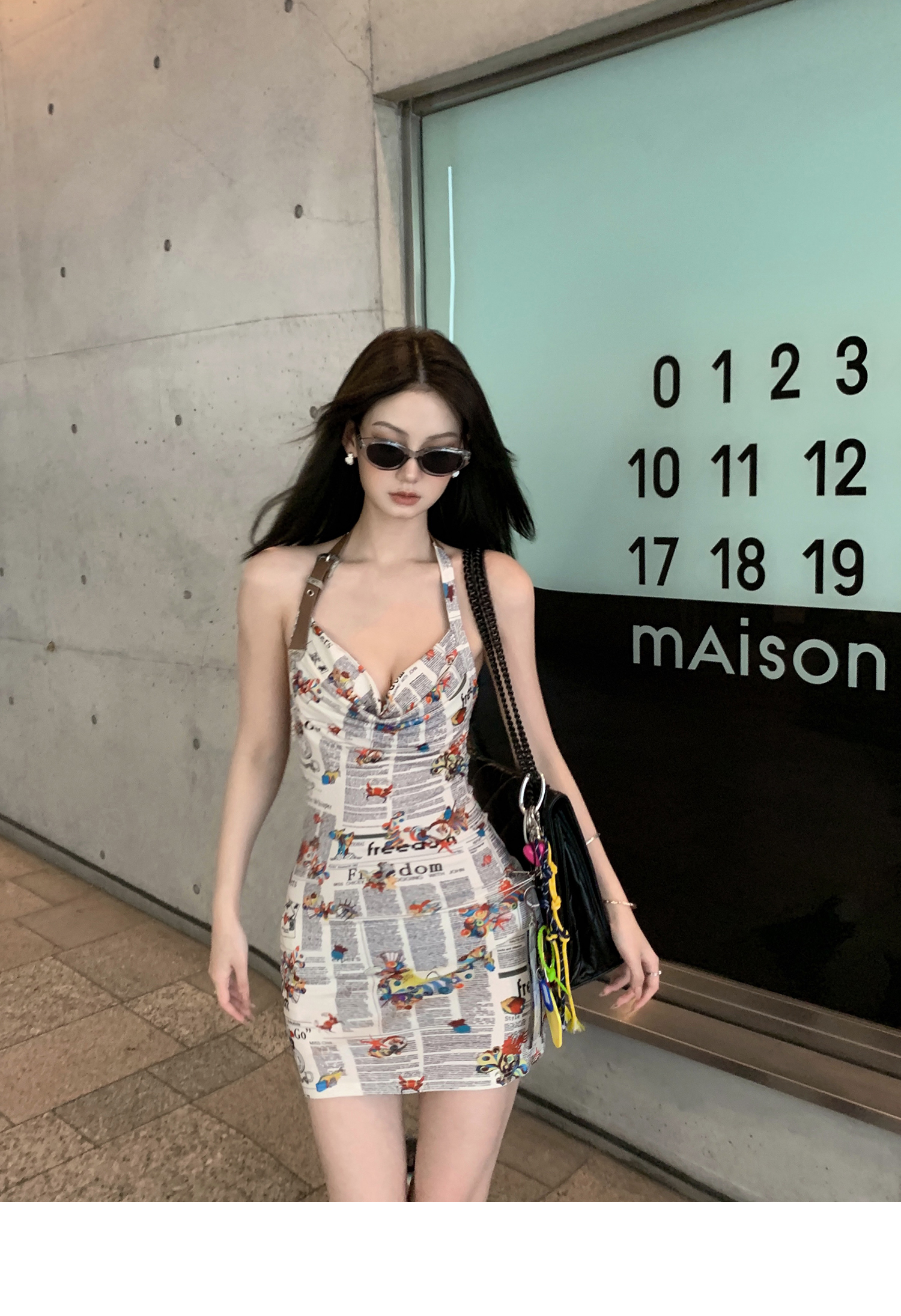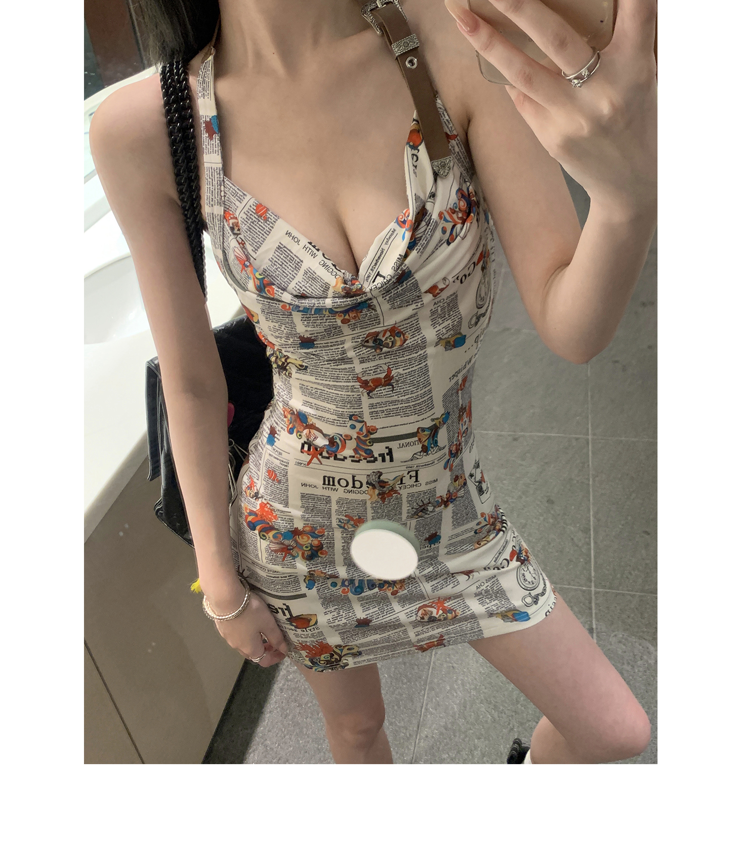 [Mermaid Curve] Retro Newspaper Printed Spicy Girl Strap Dress - Summer Edition