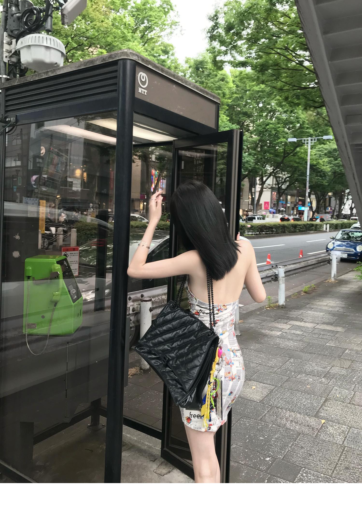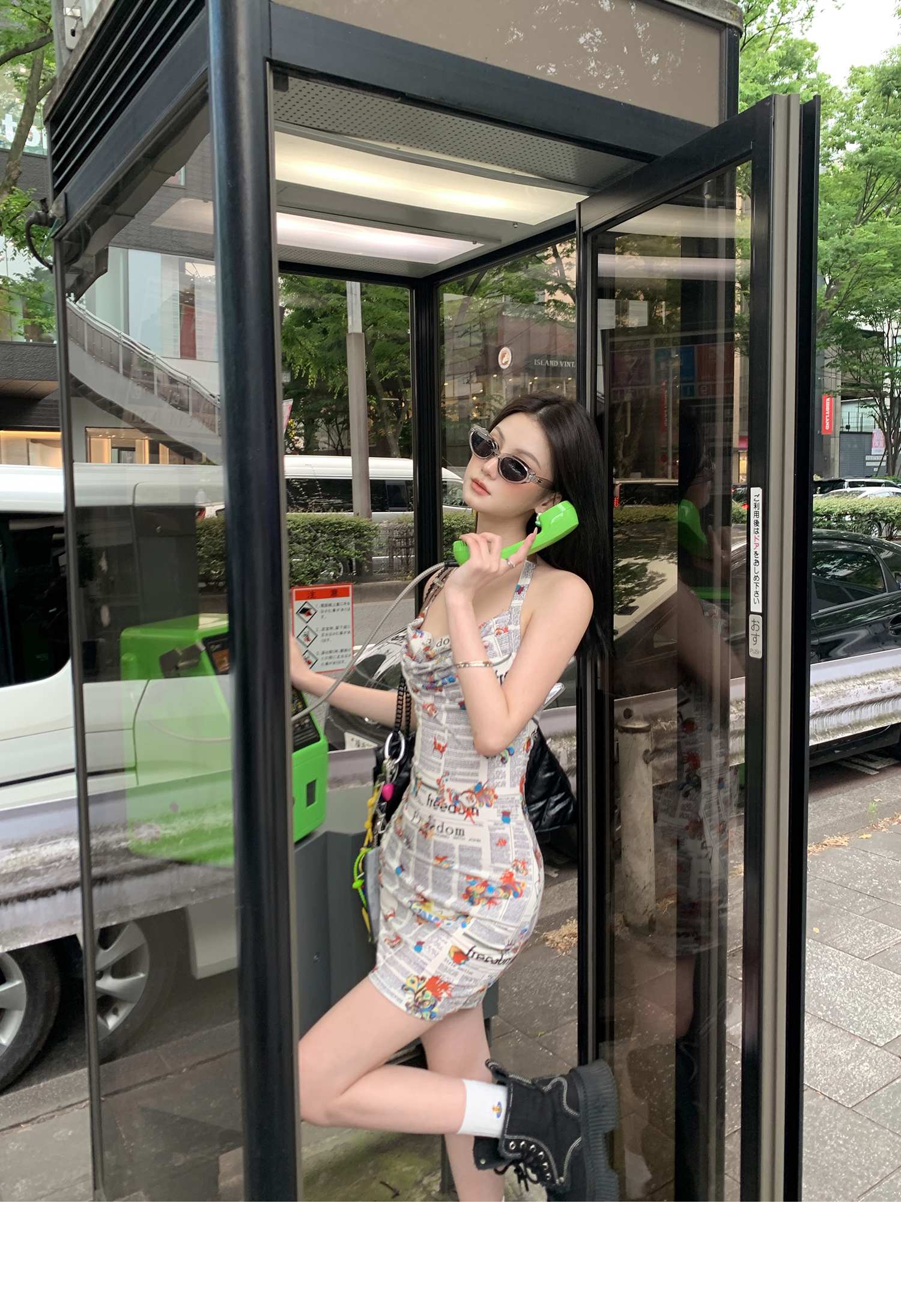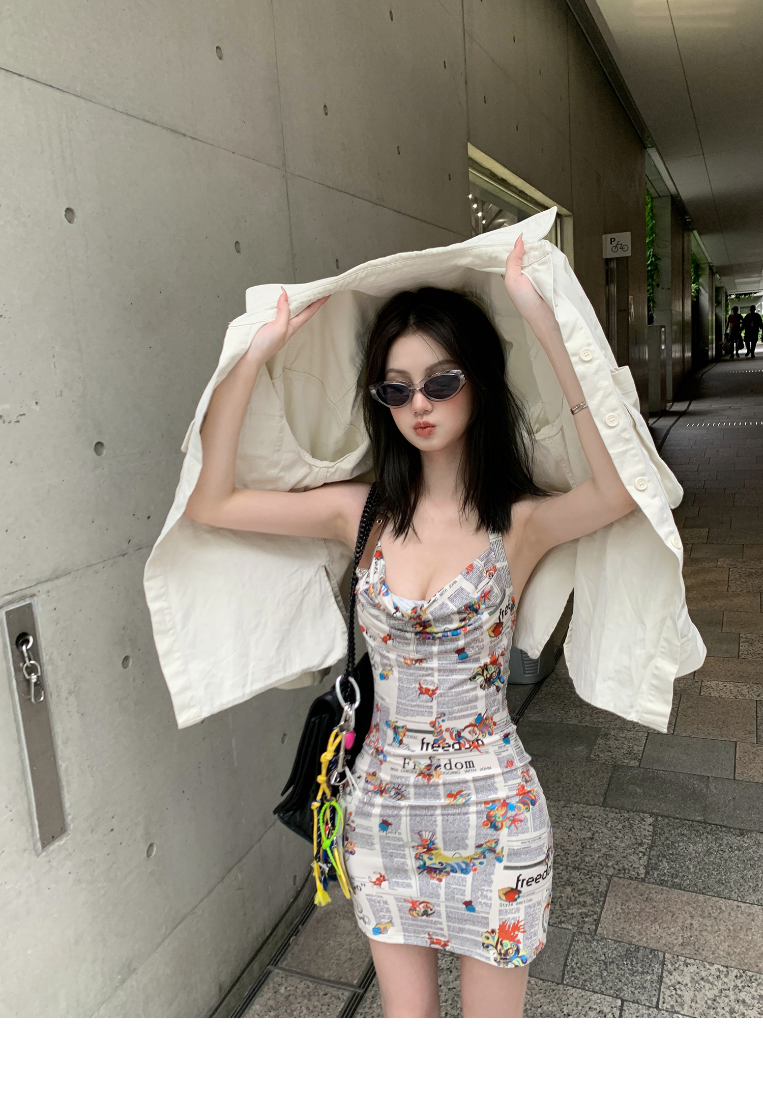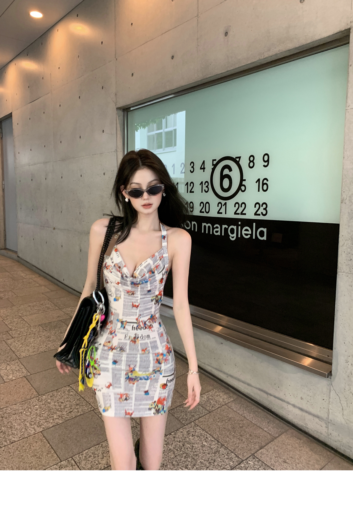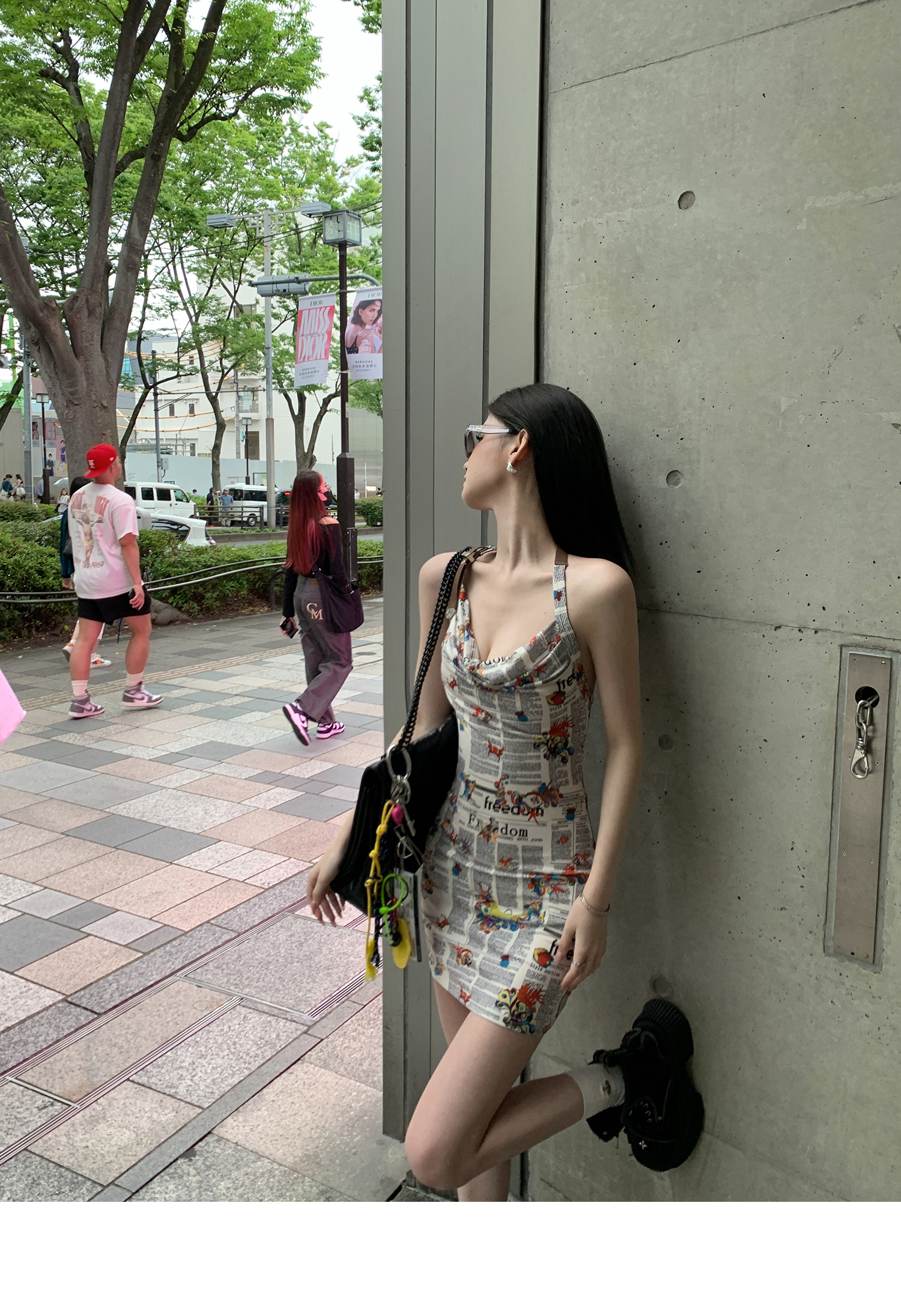 [Mermaid Curve] Retro Newspaper Printed Spicy Girl Strap Dress - Summer Edition