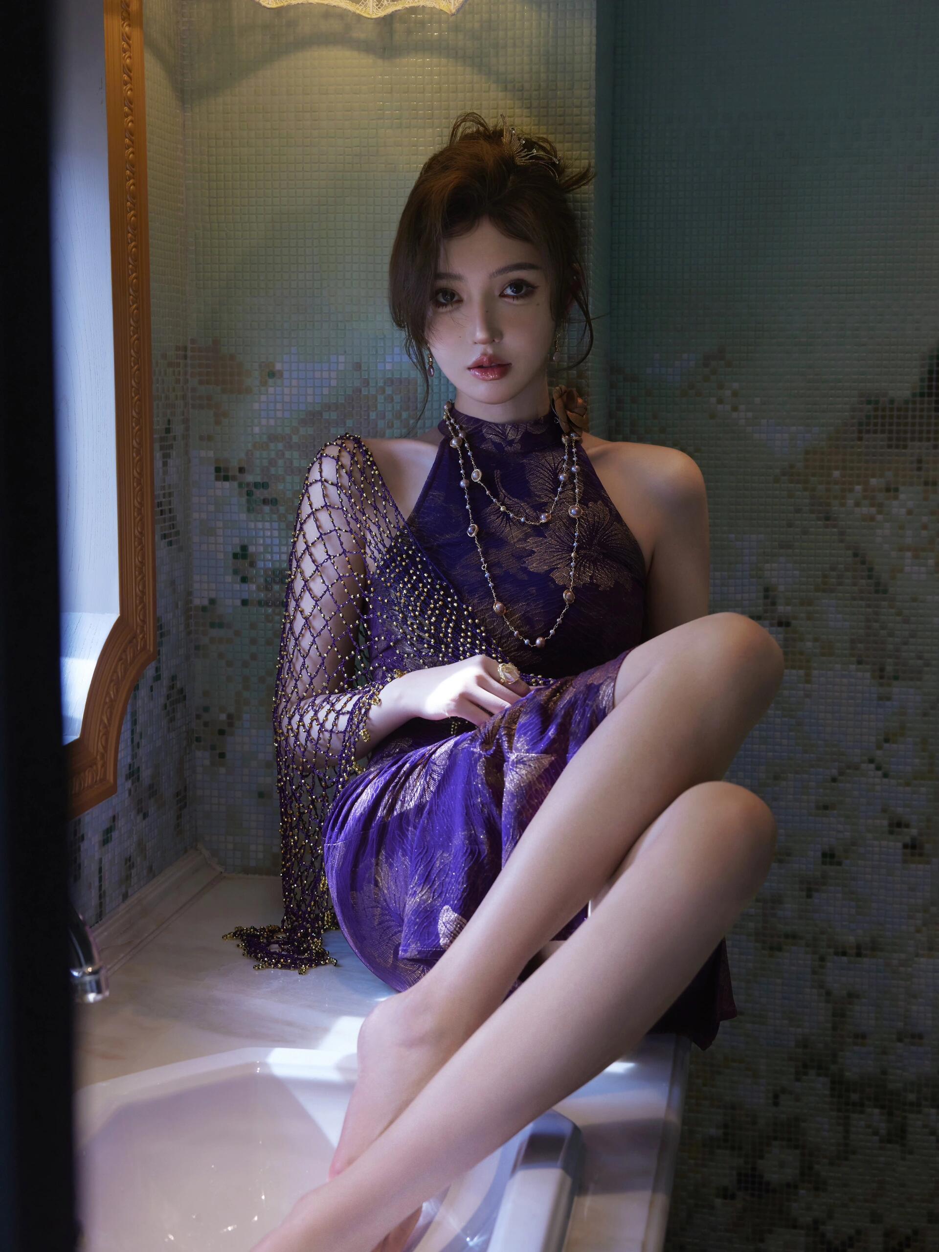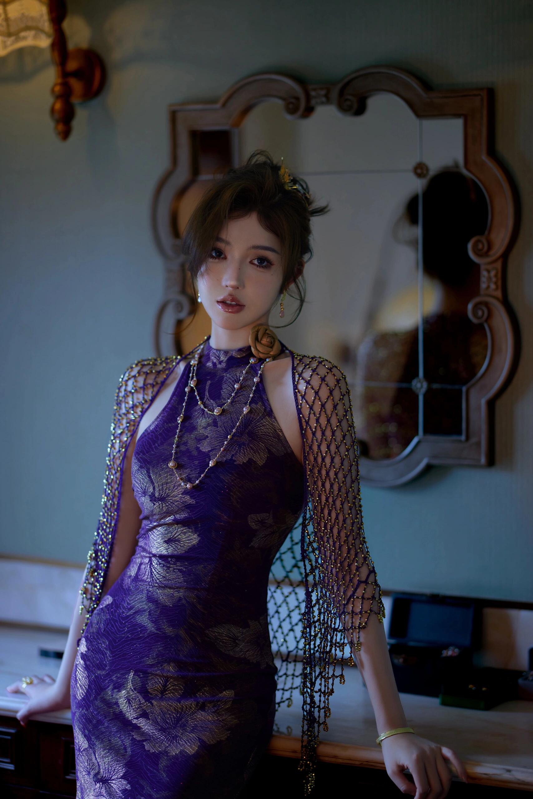 Modern Cheongsam – High-End Purple Jacquard Hip-Wrap Dress