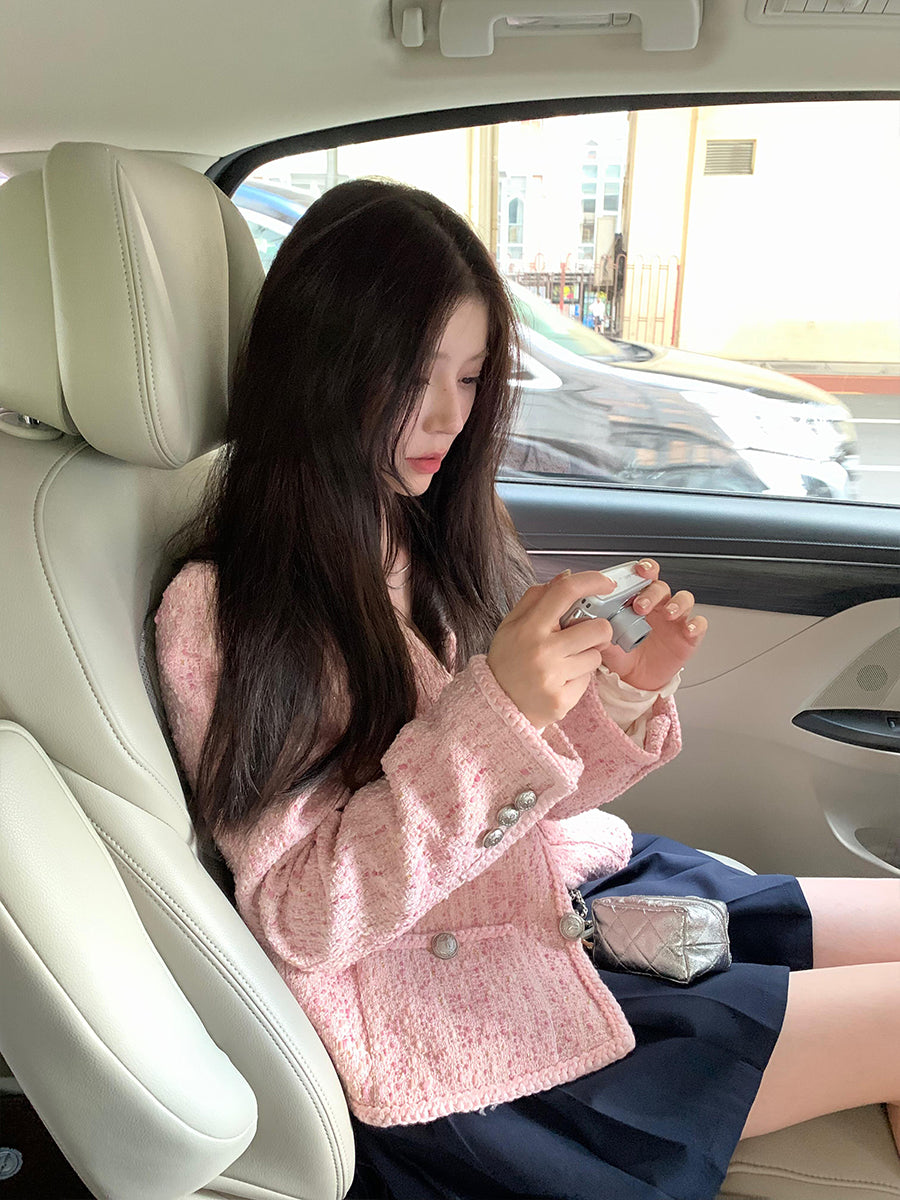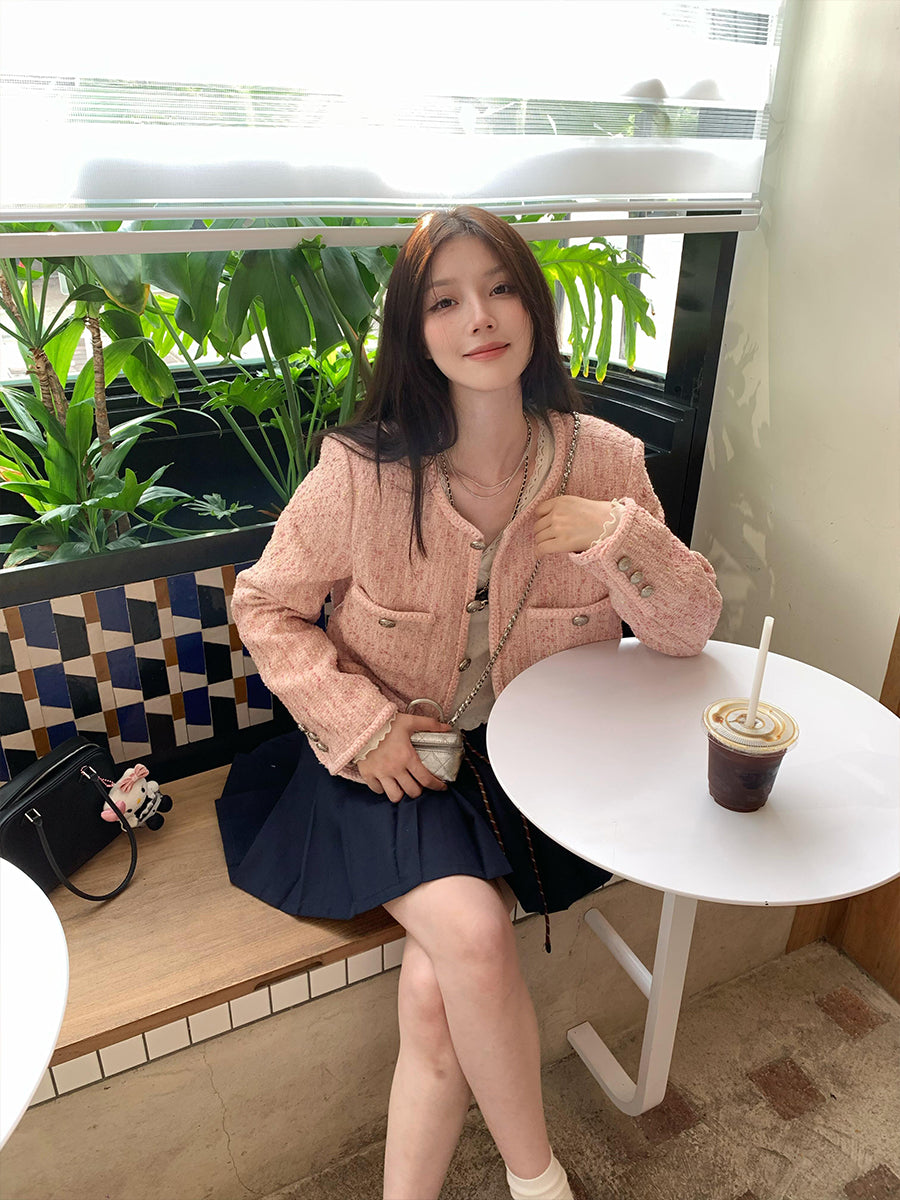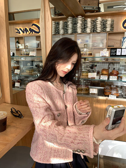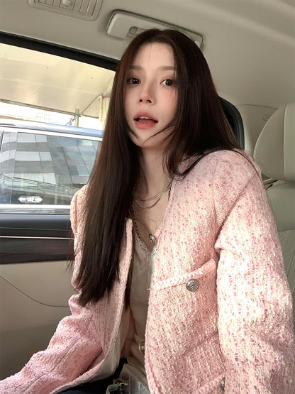 Pink Tweed Jacket – Chic Short Single-Breasted Celebrity-Inspired Coat
