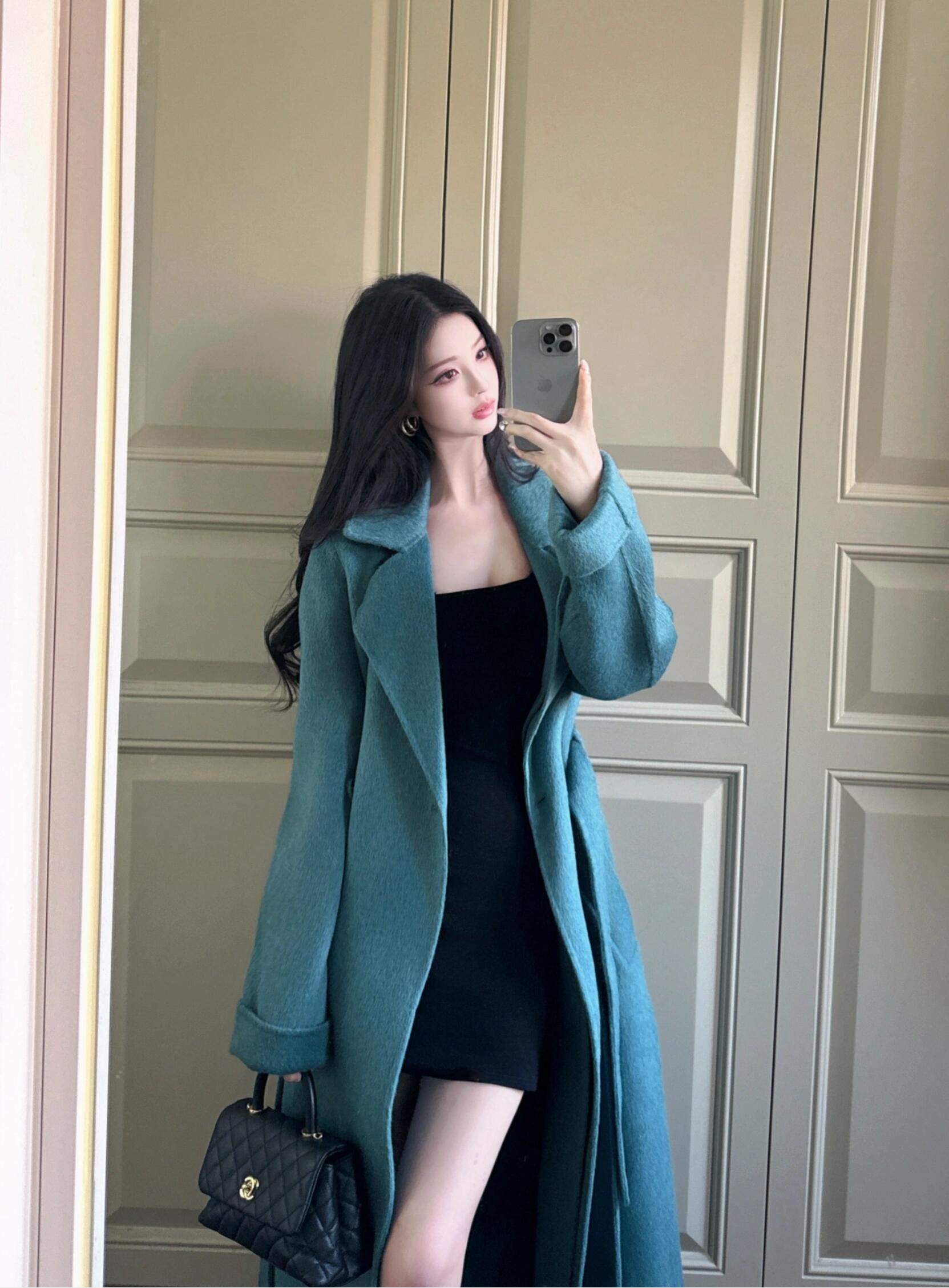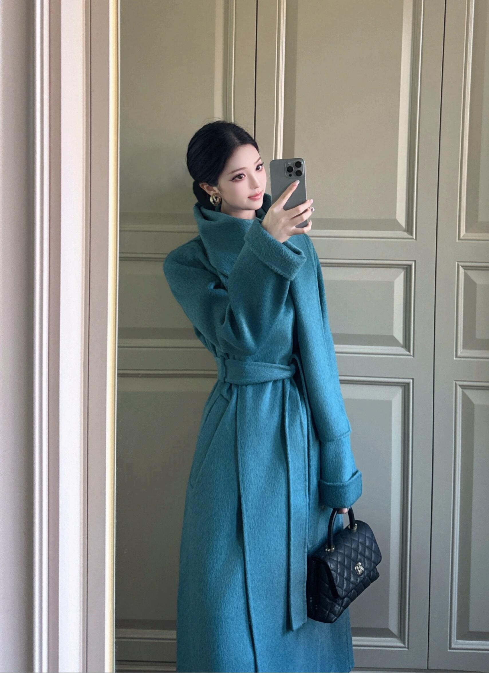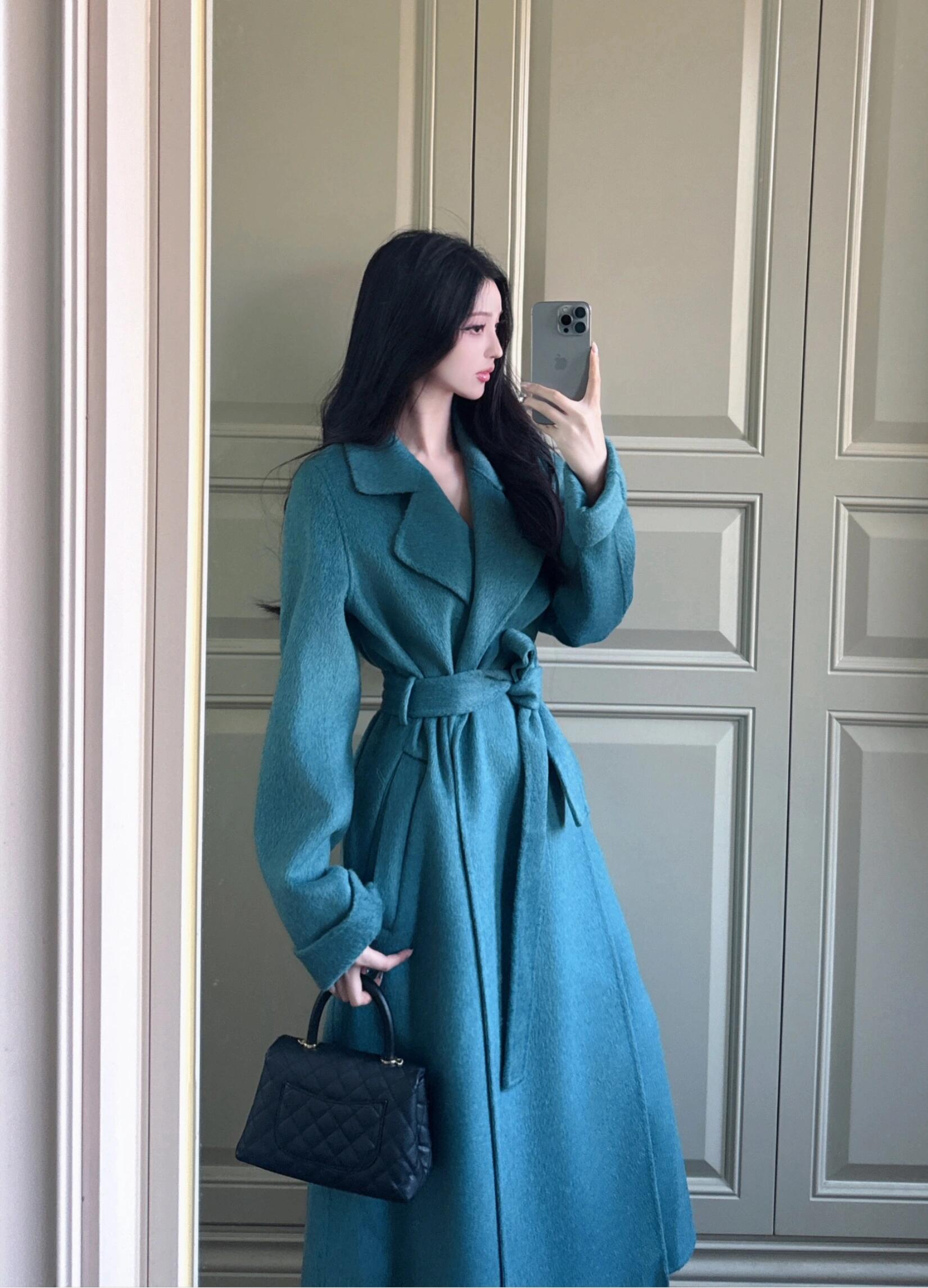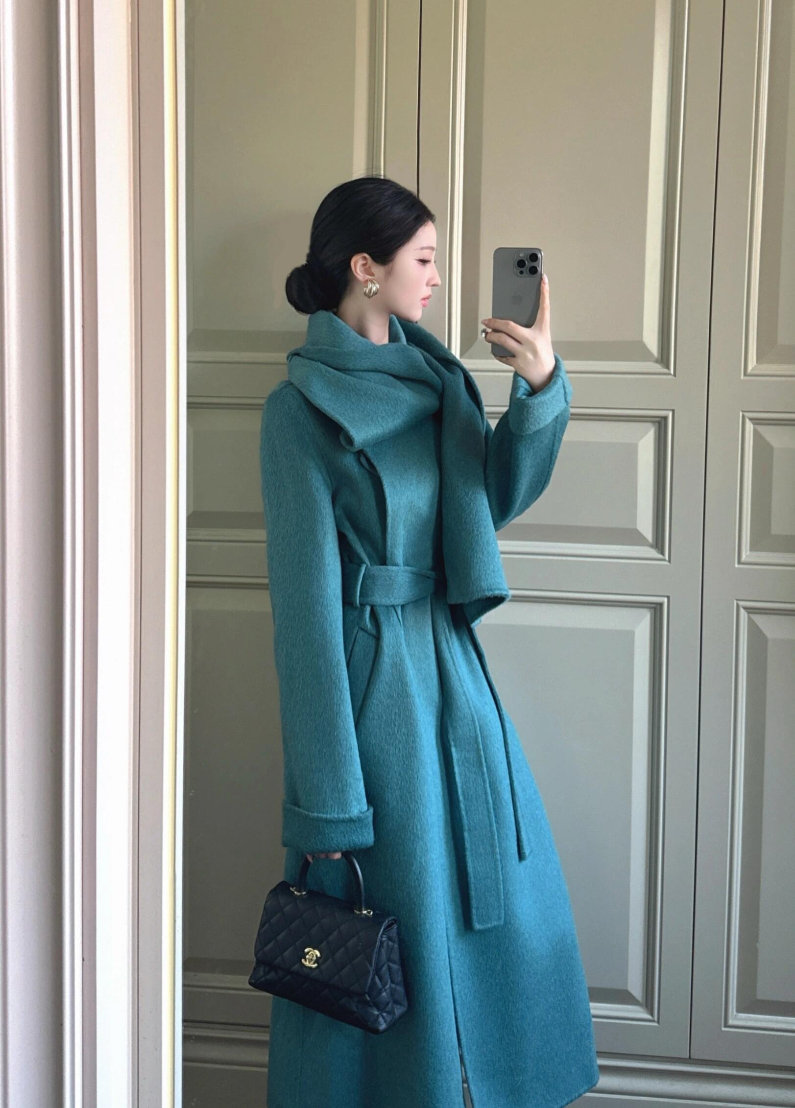 Blue Reversible Cashmere Coat – Long Celebrity Scarf Collar Wool Jacket