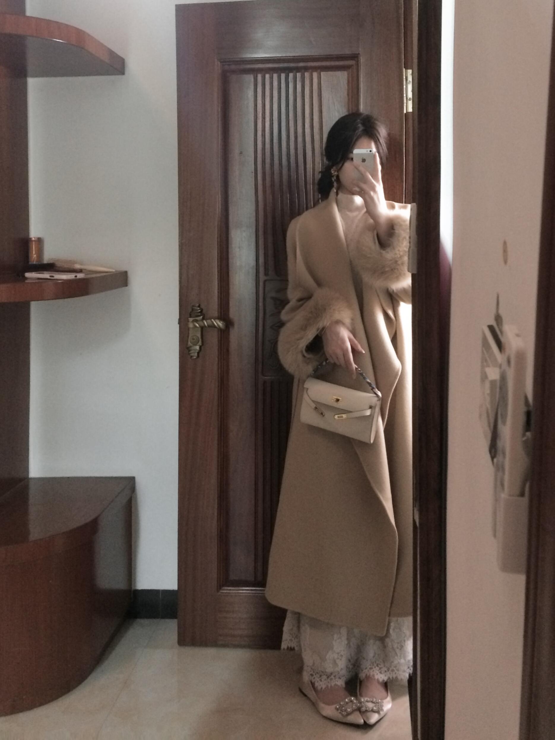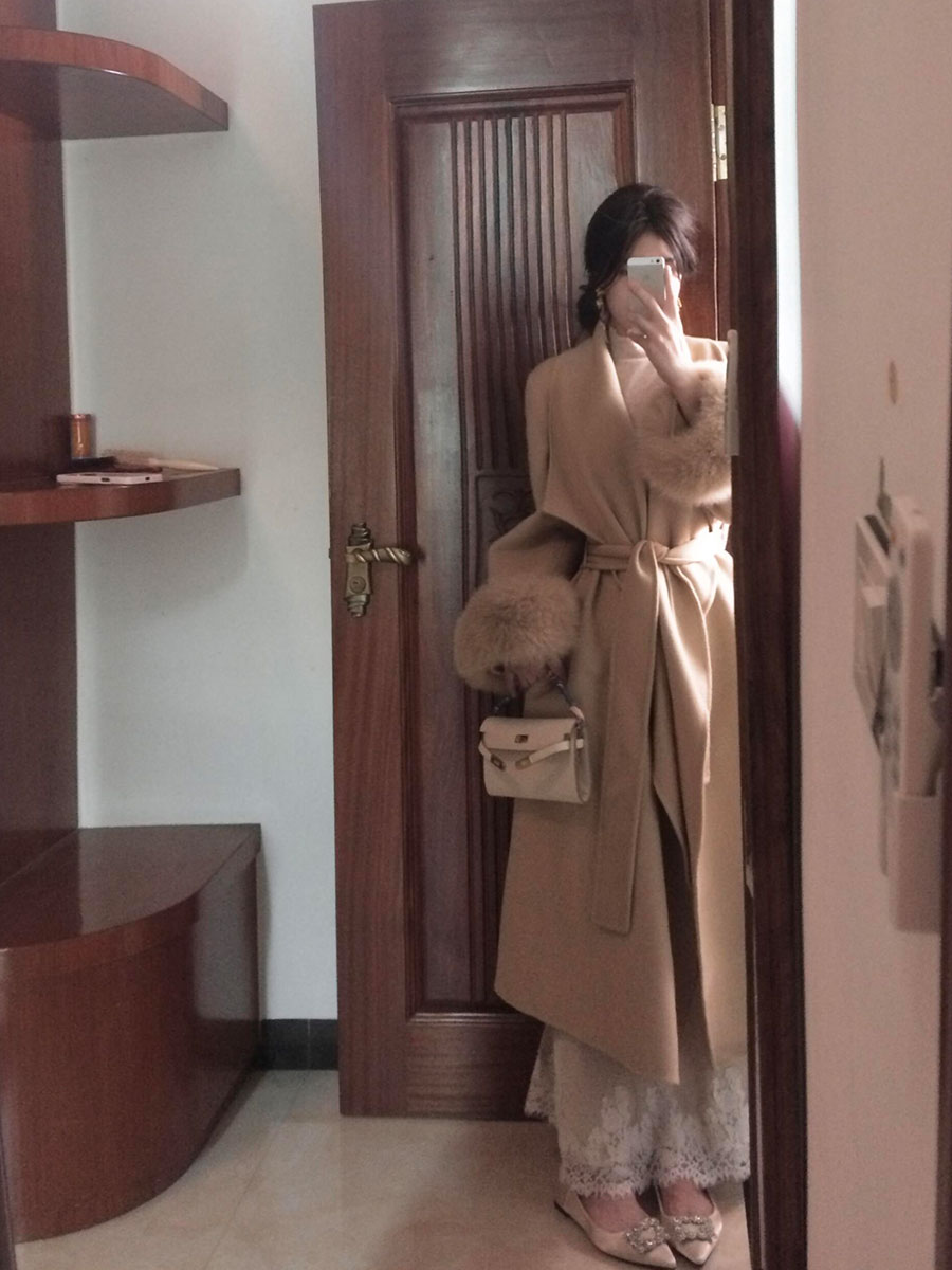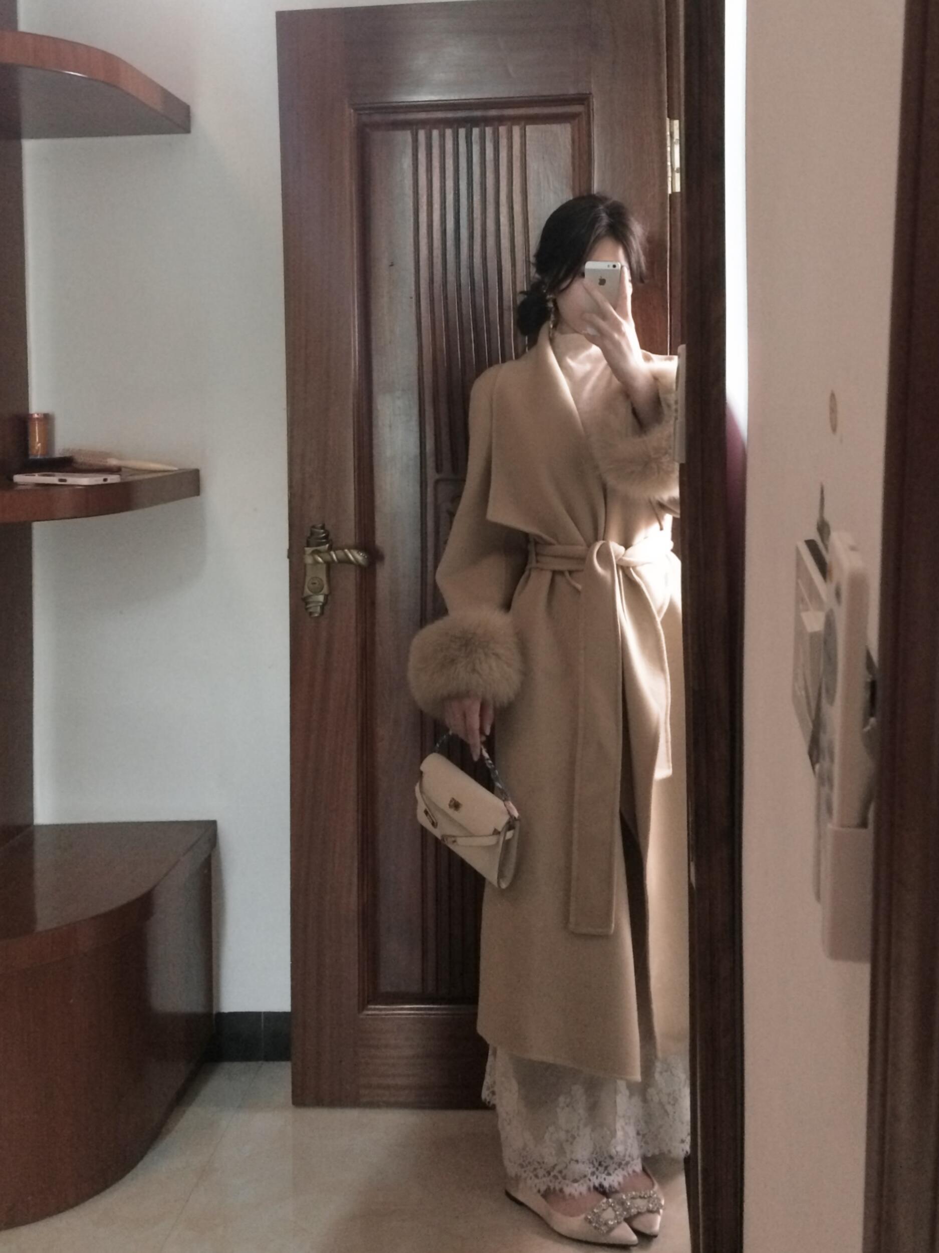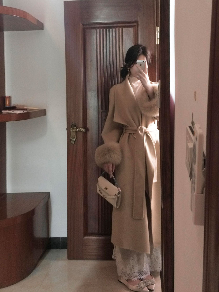 Reversible Cashmere Coat – Stylish Mid-Length Woolen Coat with Fox Fur Cuffs