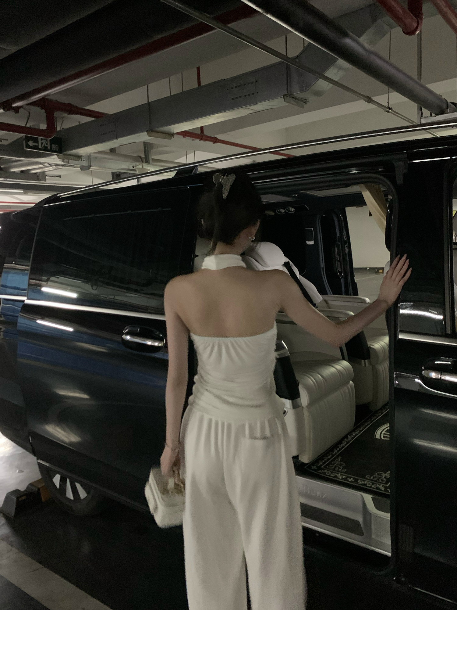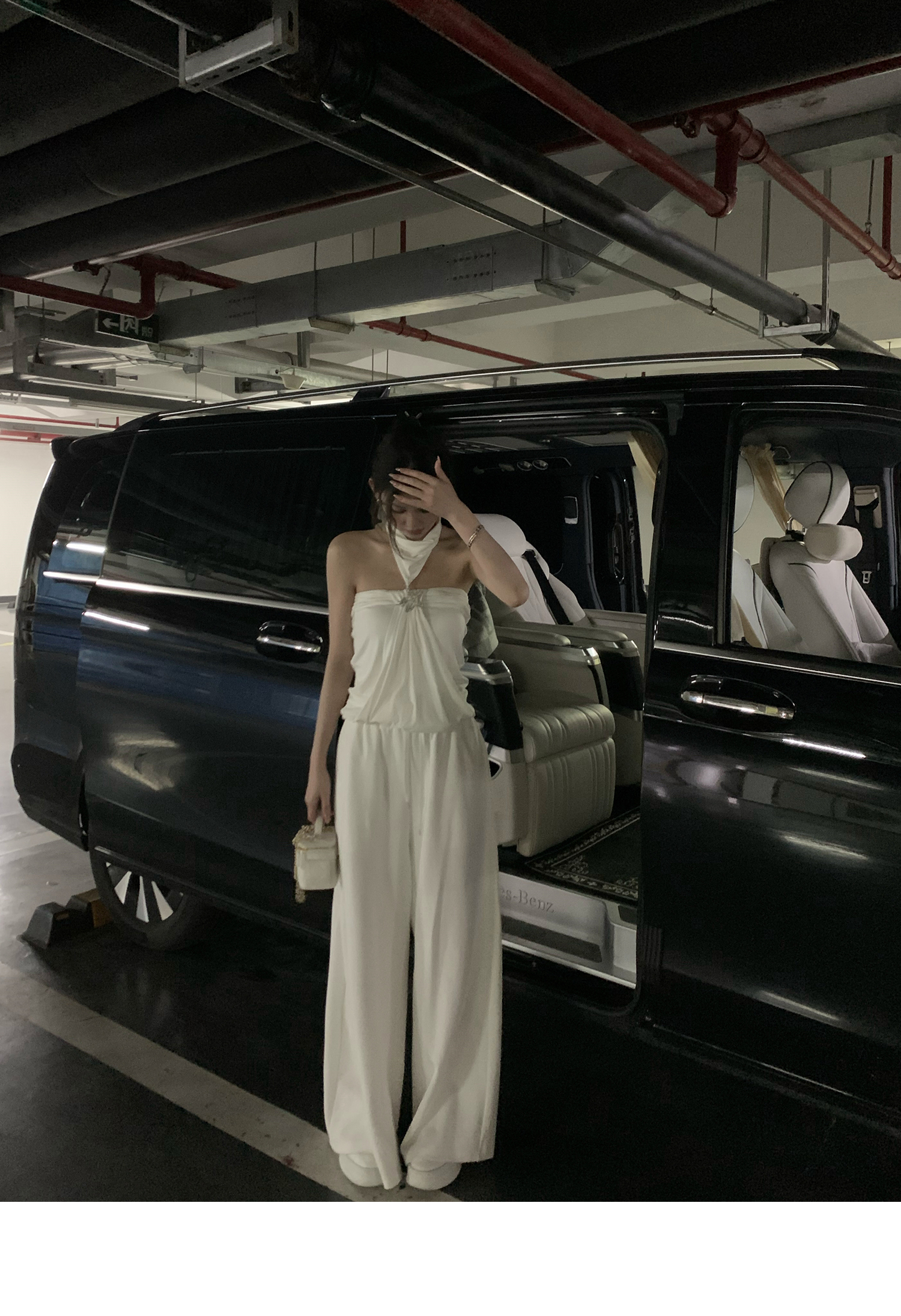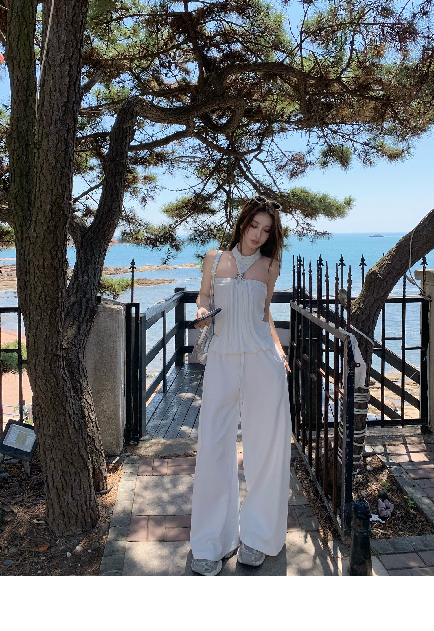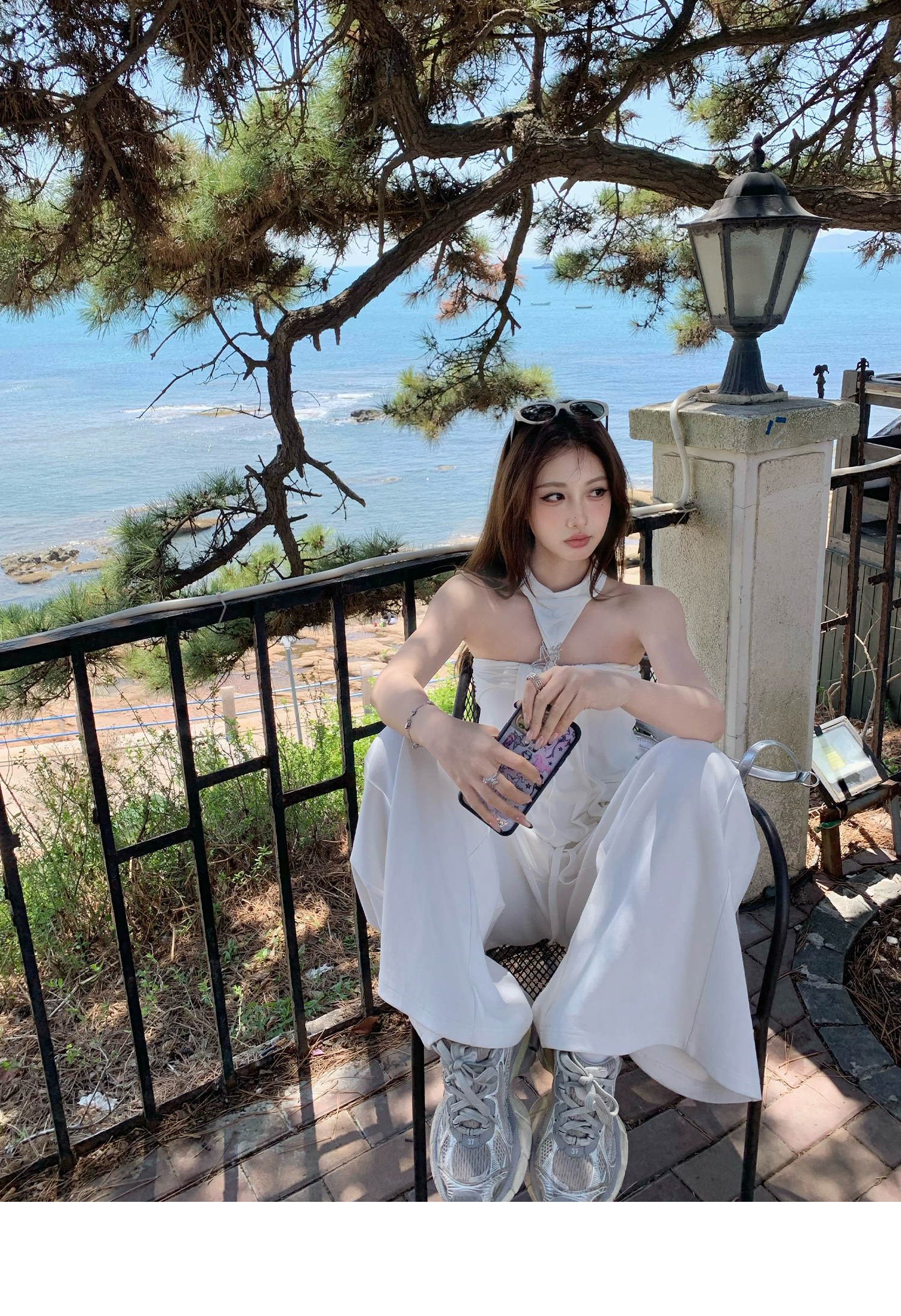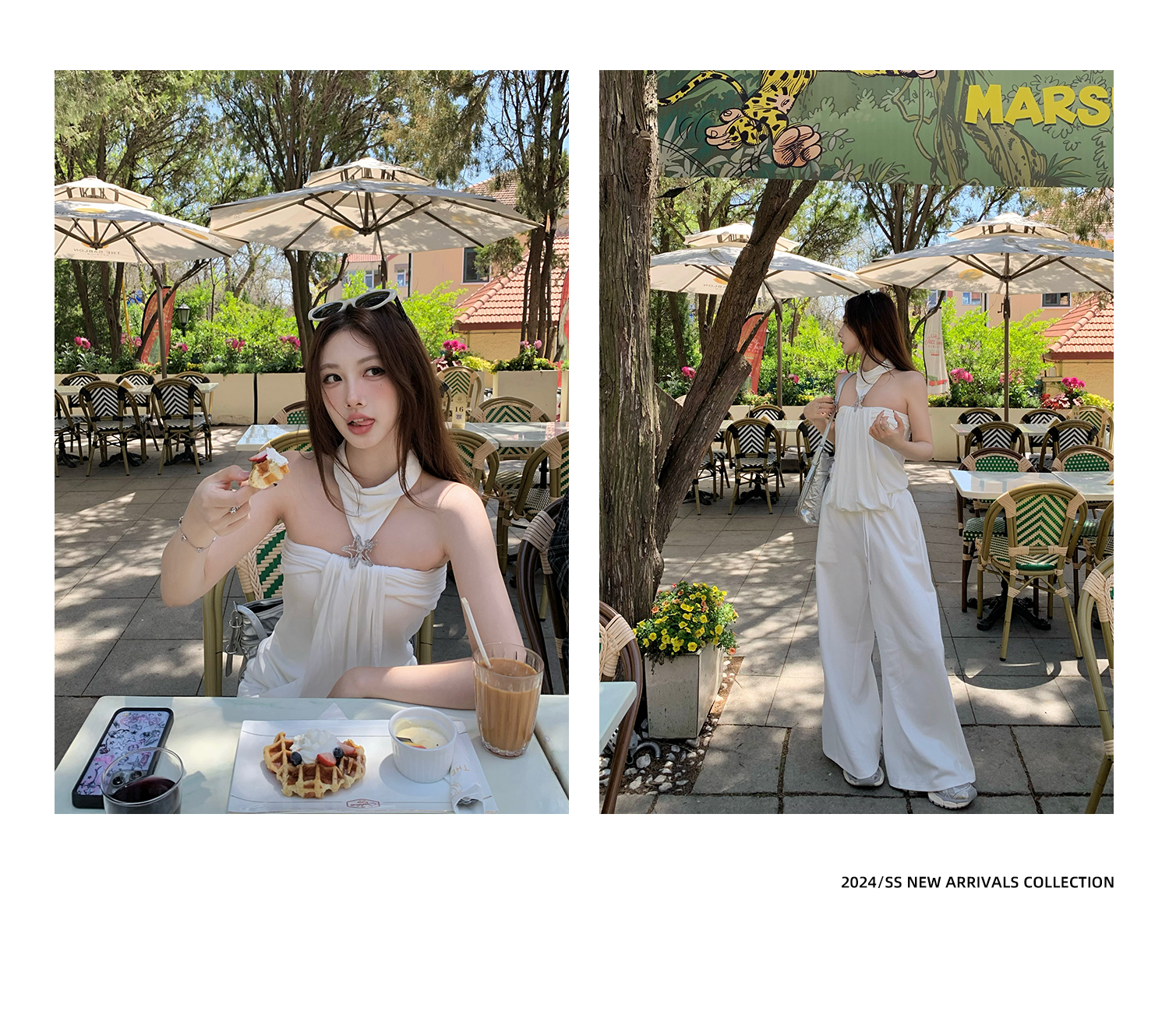 [Rose Accent] White Summer Two-Piece Set - Stylish Wide-Leg Pants