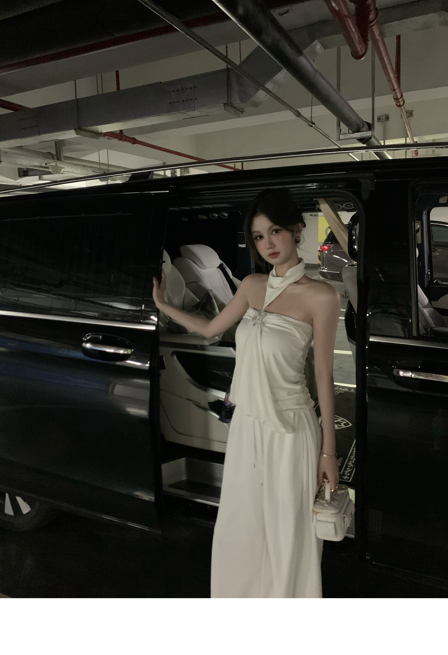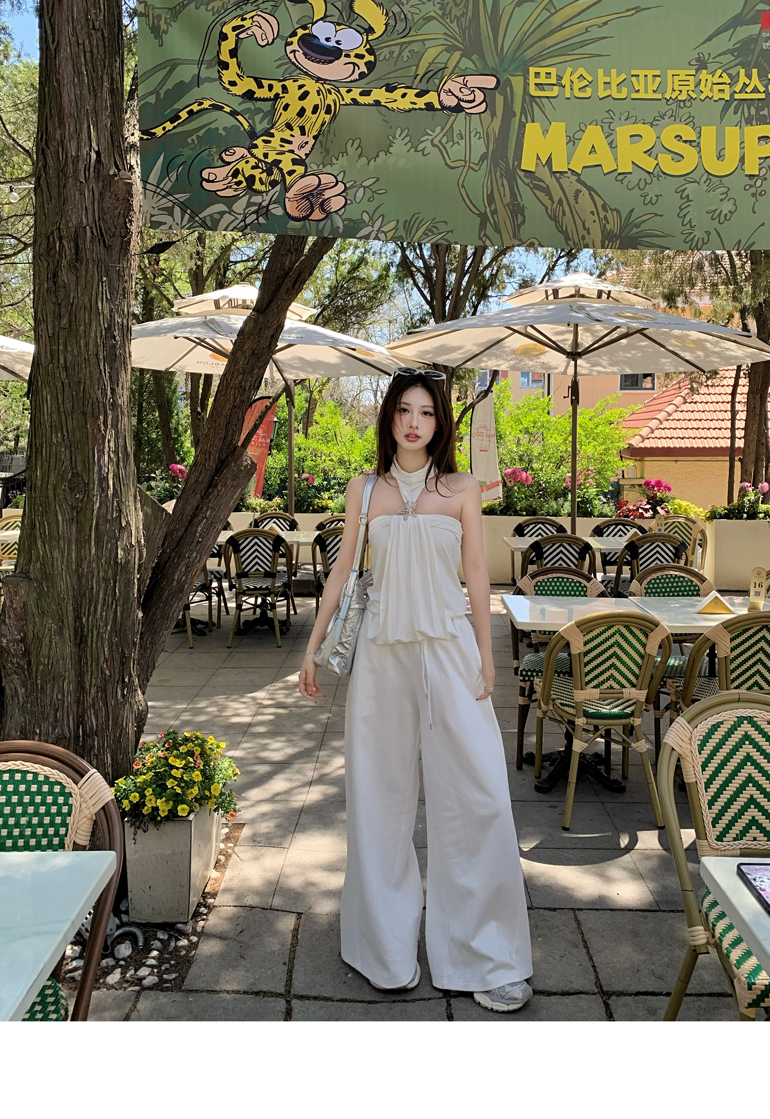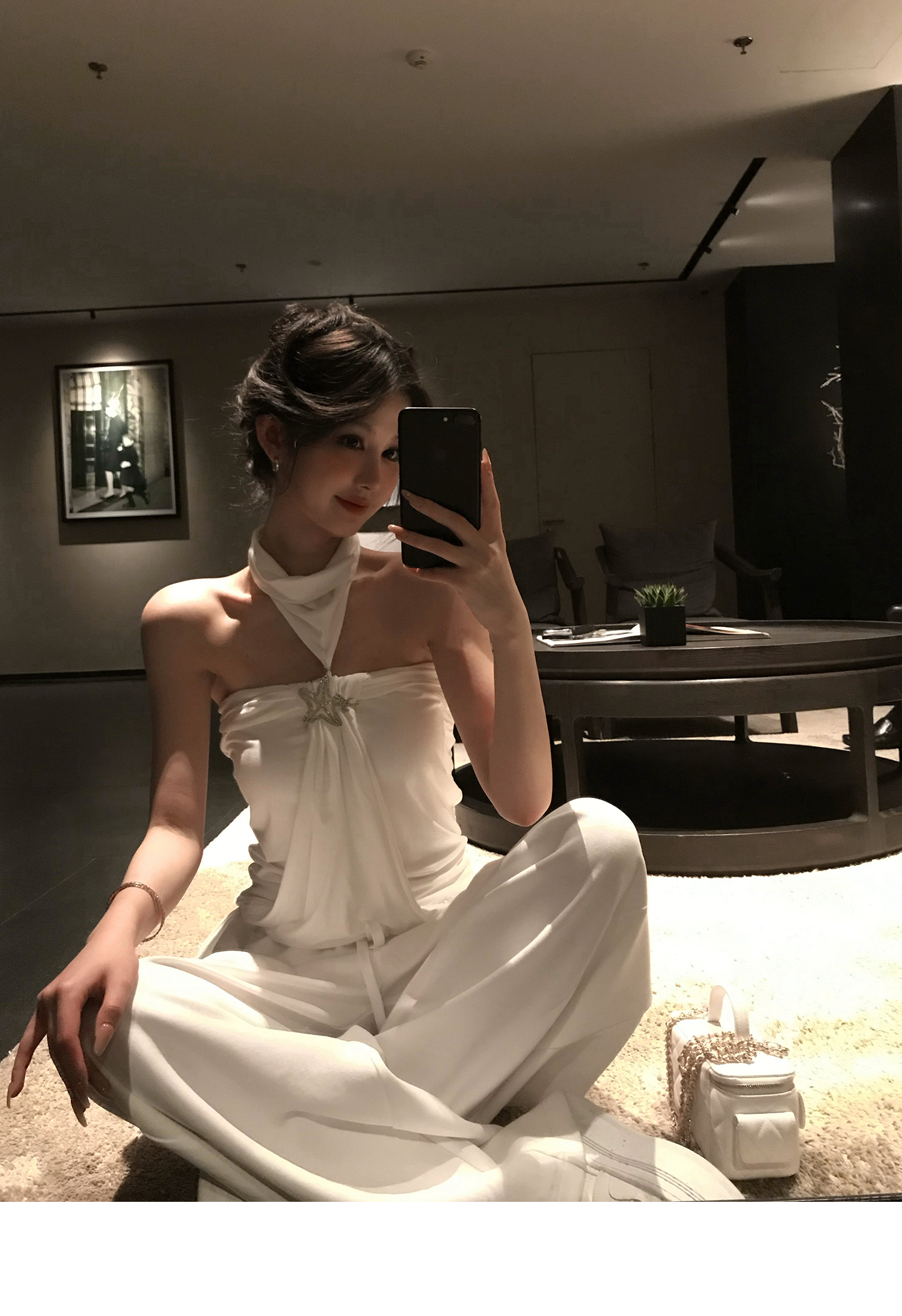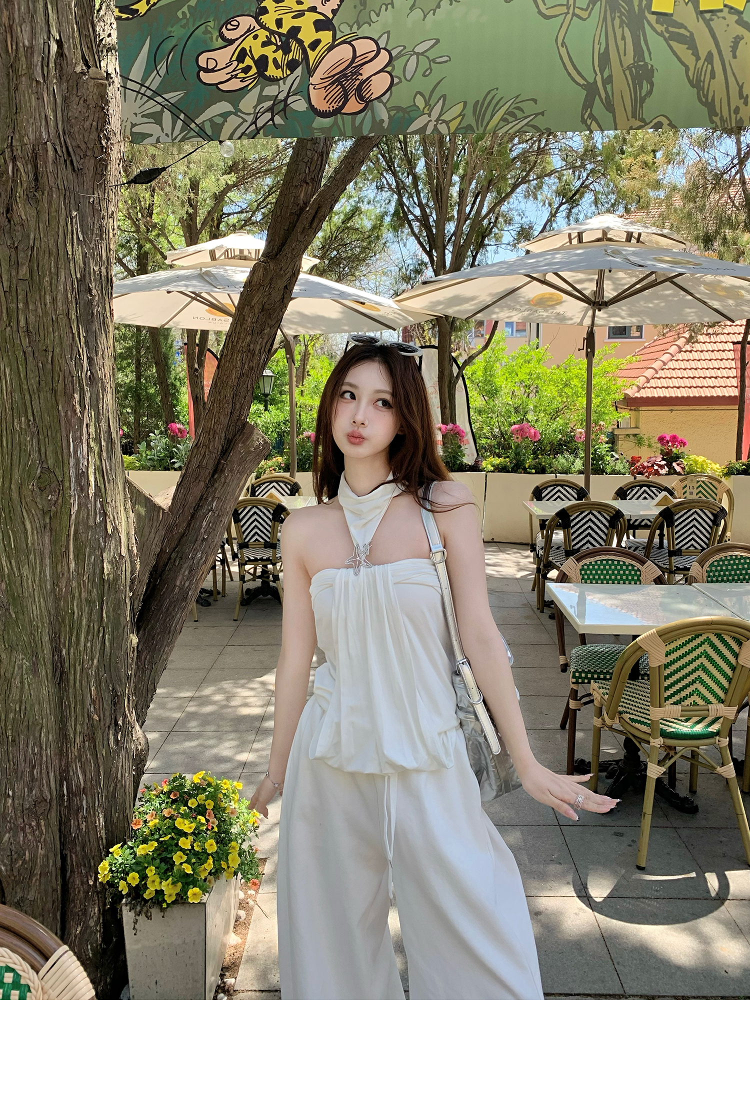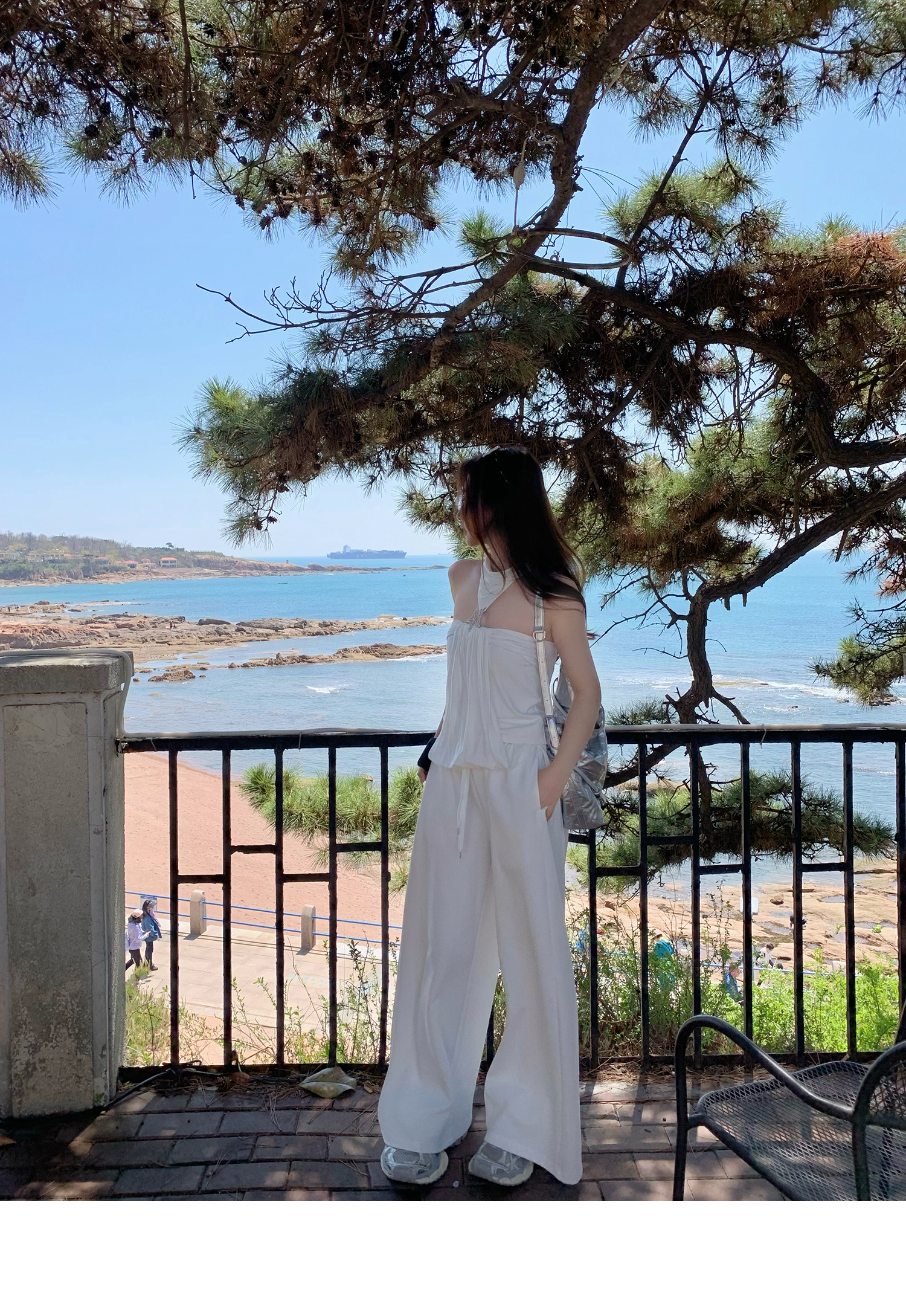[Rose Accent] White Summer Two-Piece Set - Stylish Wide-Leg Pants