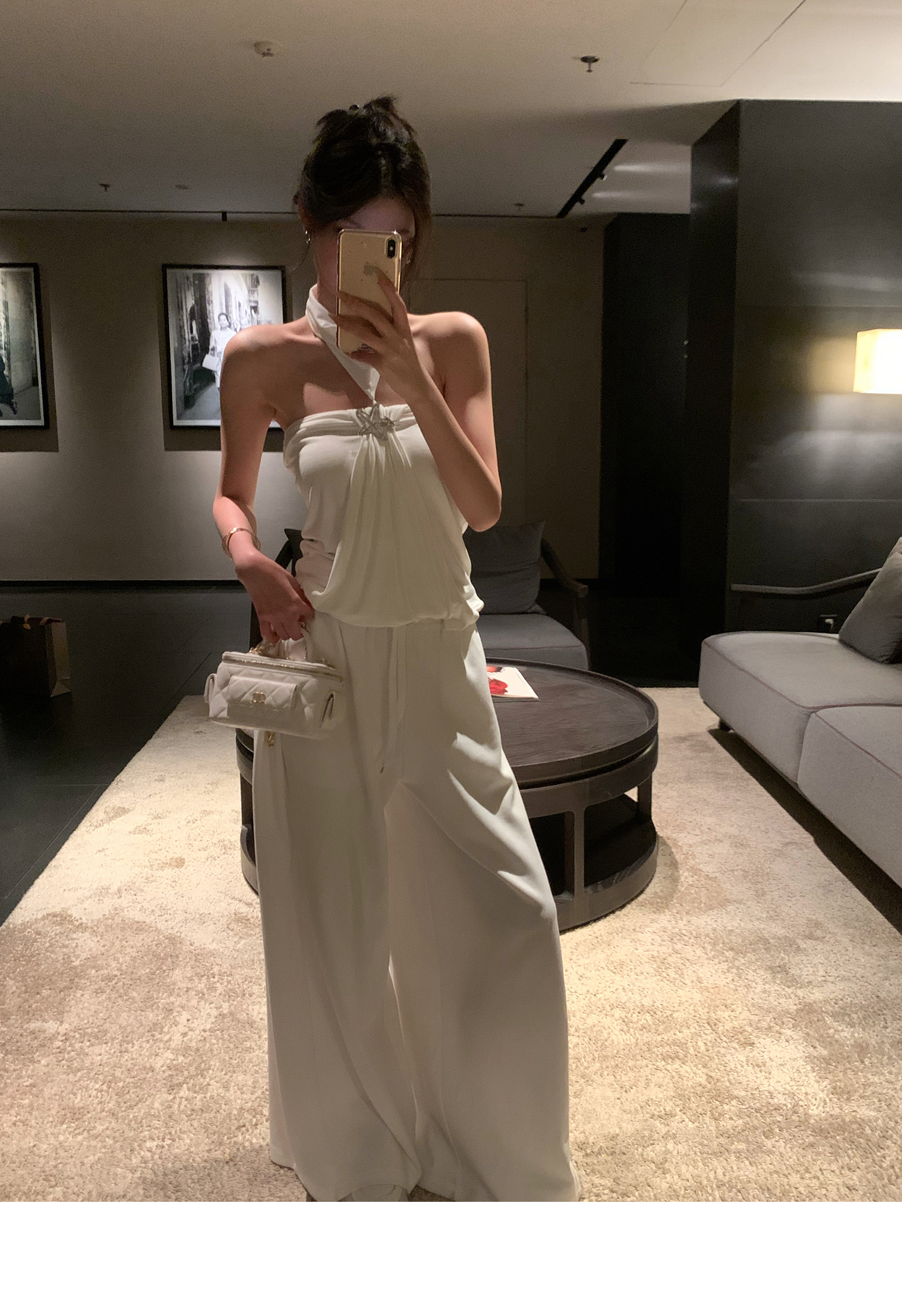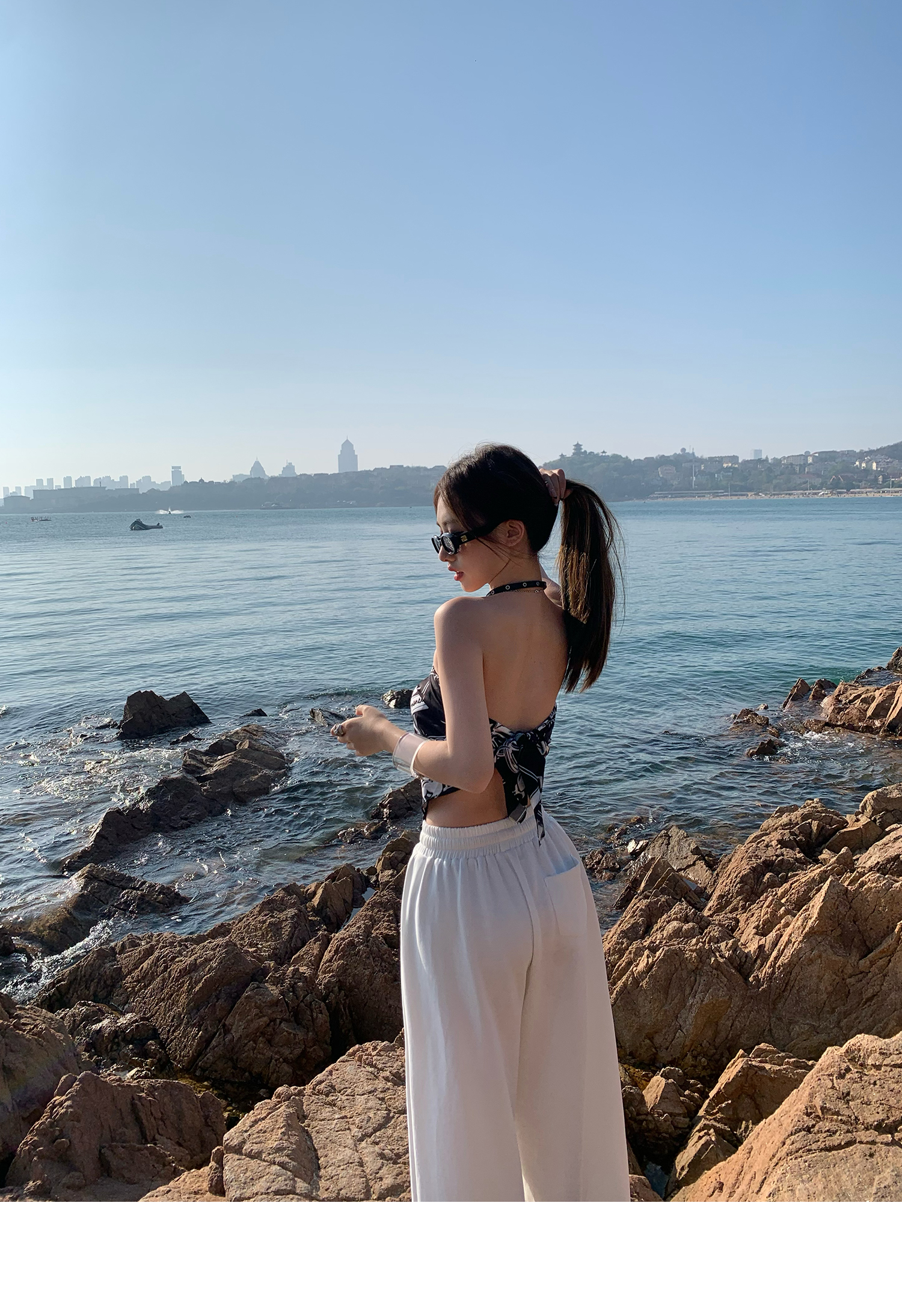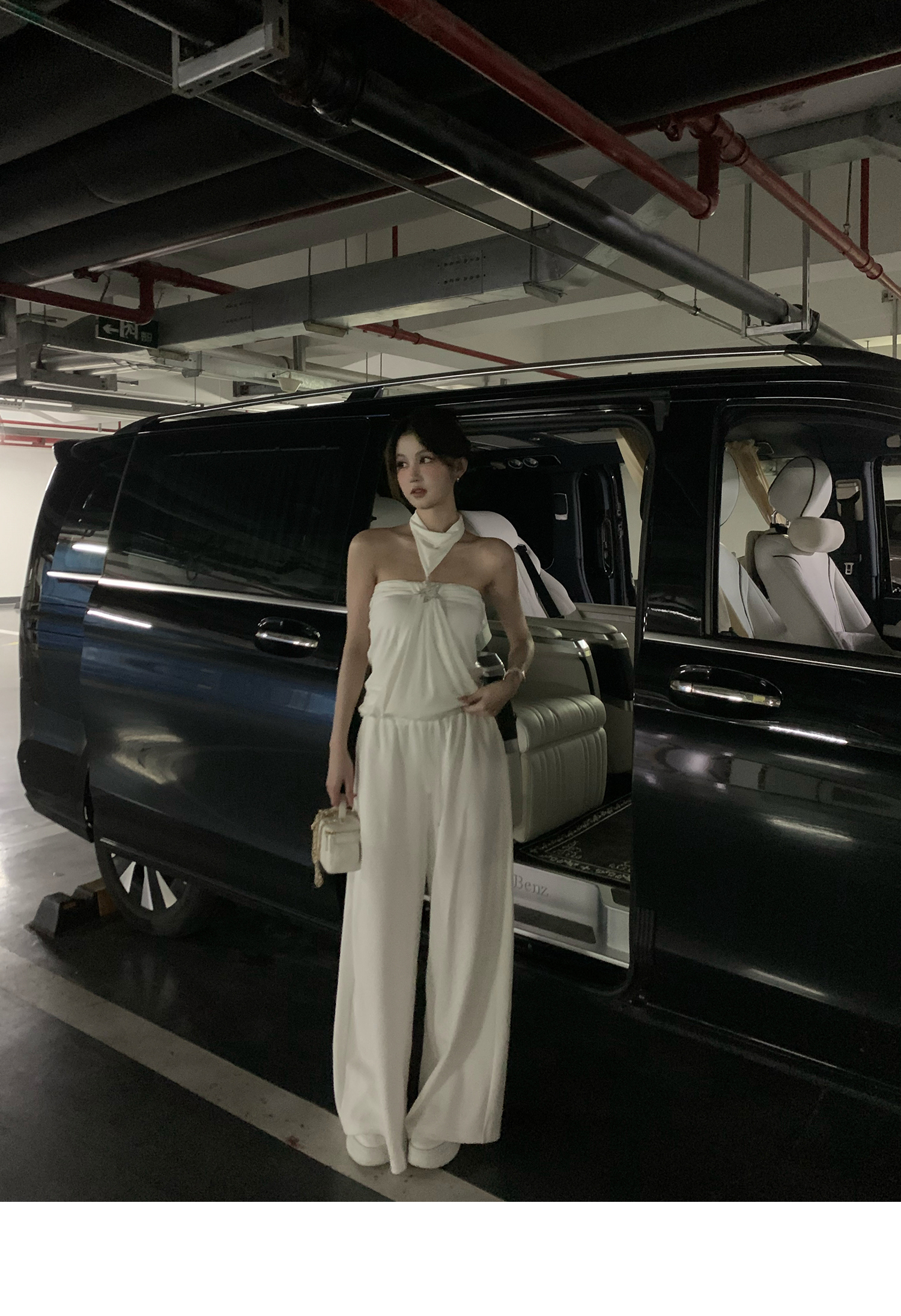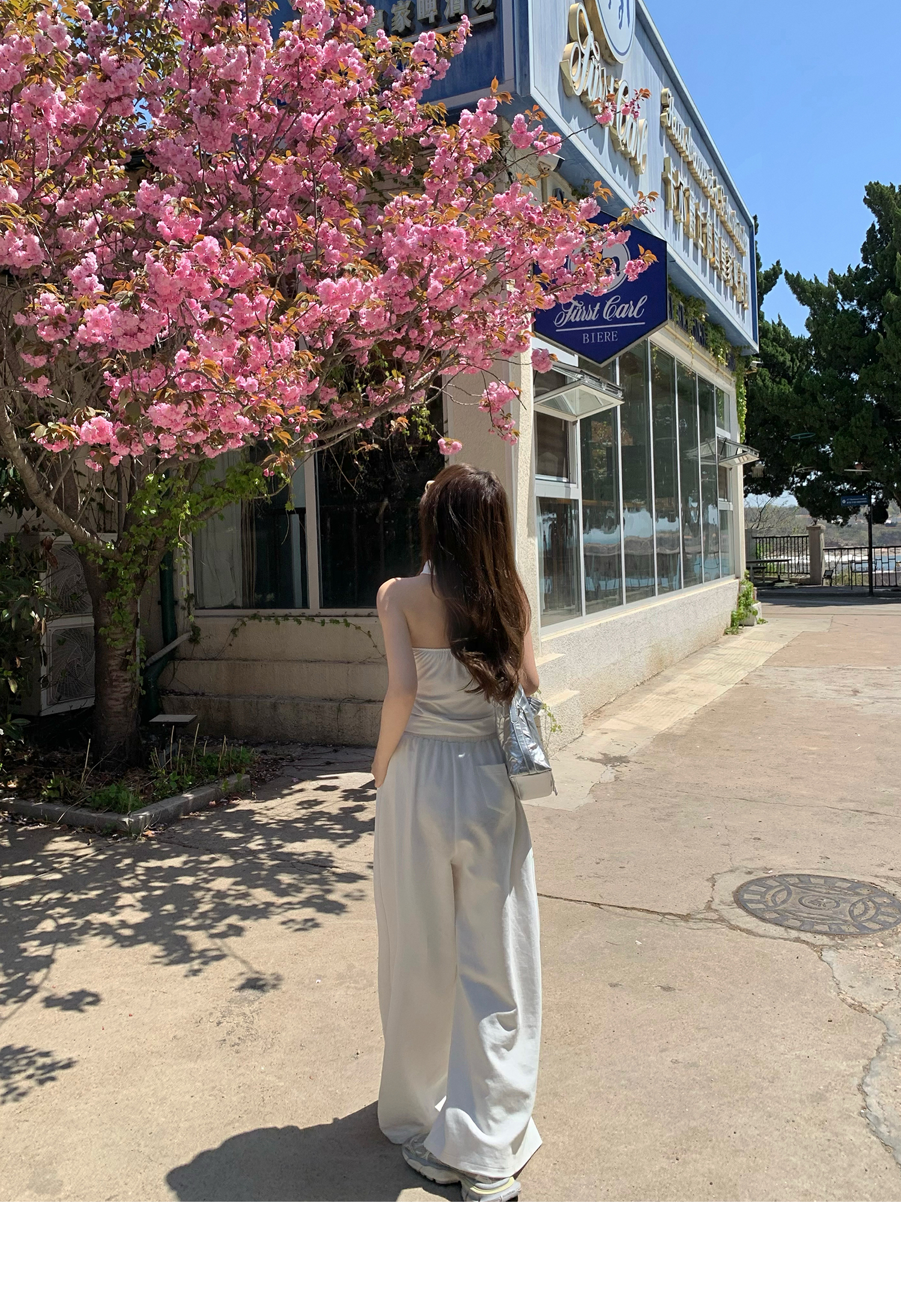 [Rose Accent] White Summer Two-Piece Set - Stylish Wide-Leg Pants