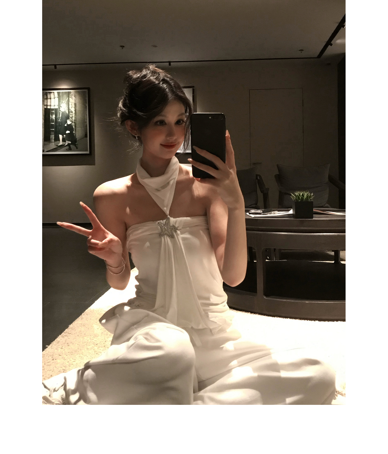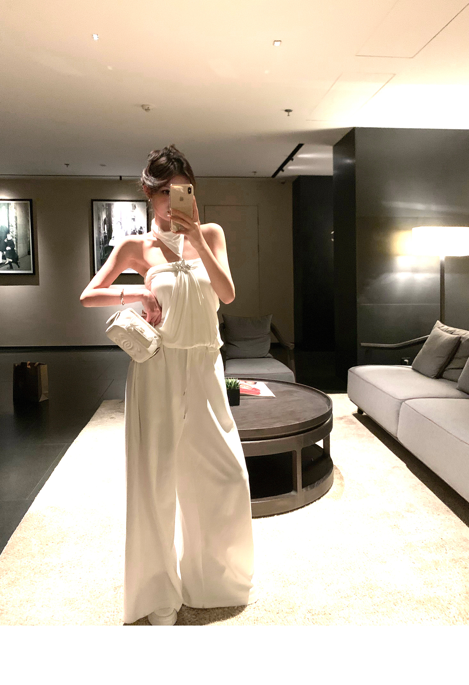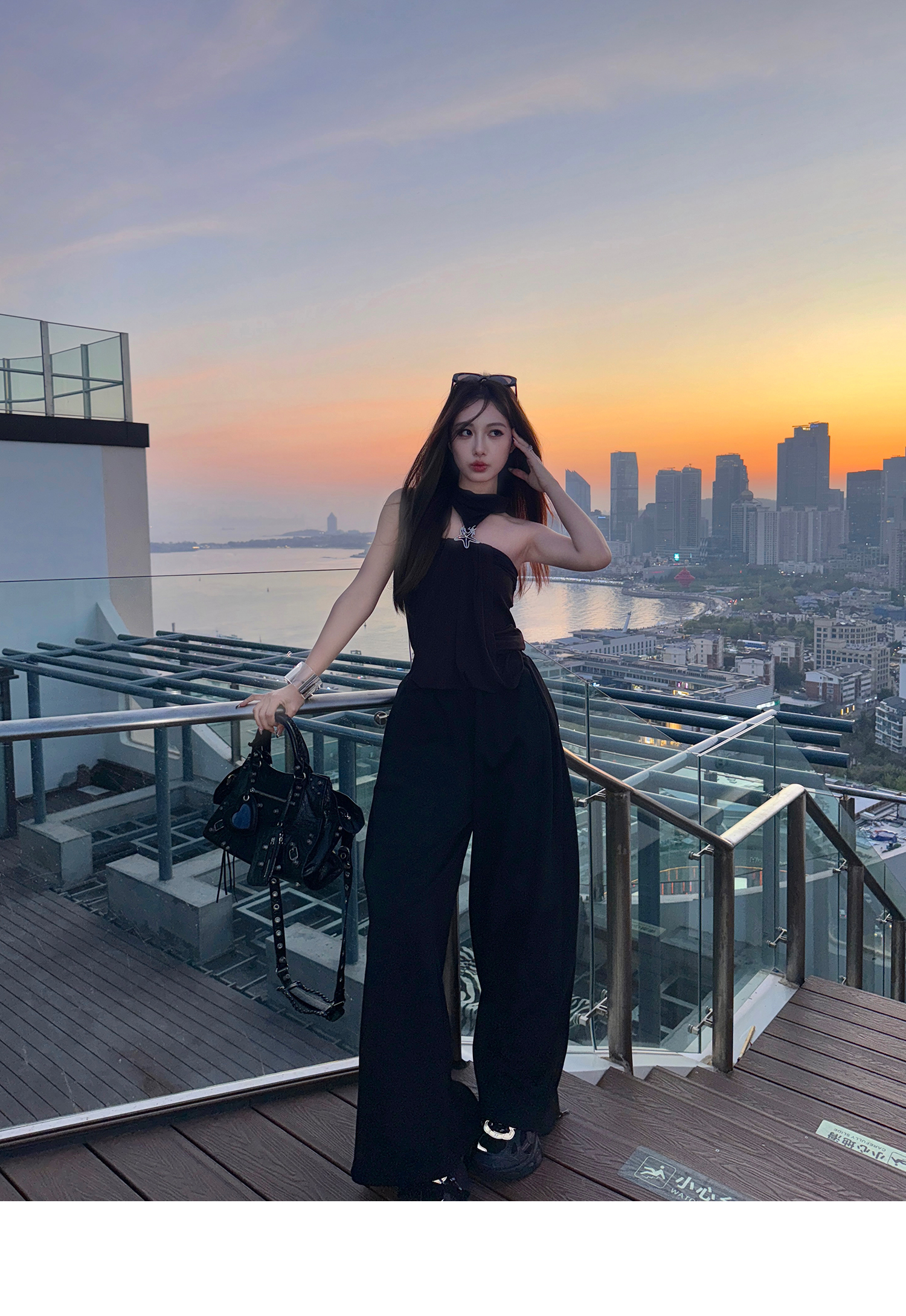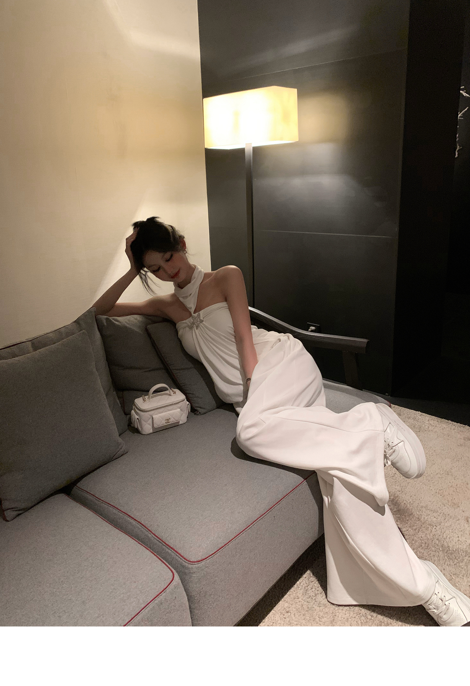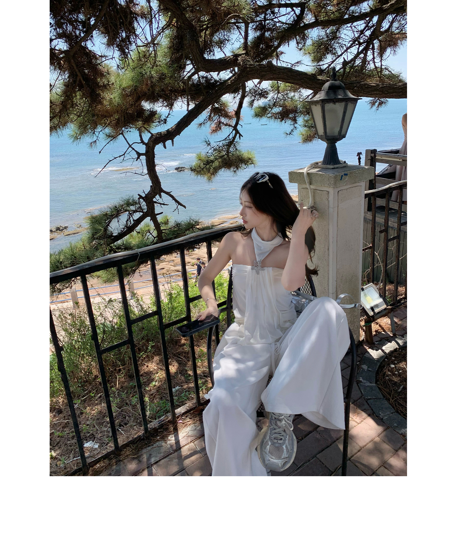 [Rose Accent] White Summer Two-Piece Set - Stylish Wide-Leg Pants