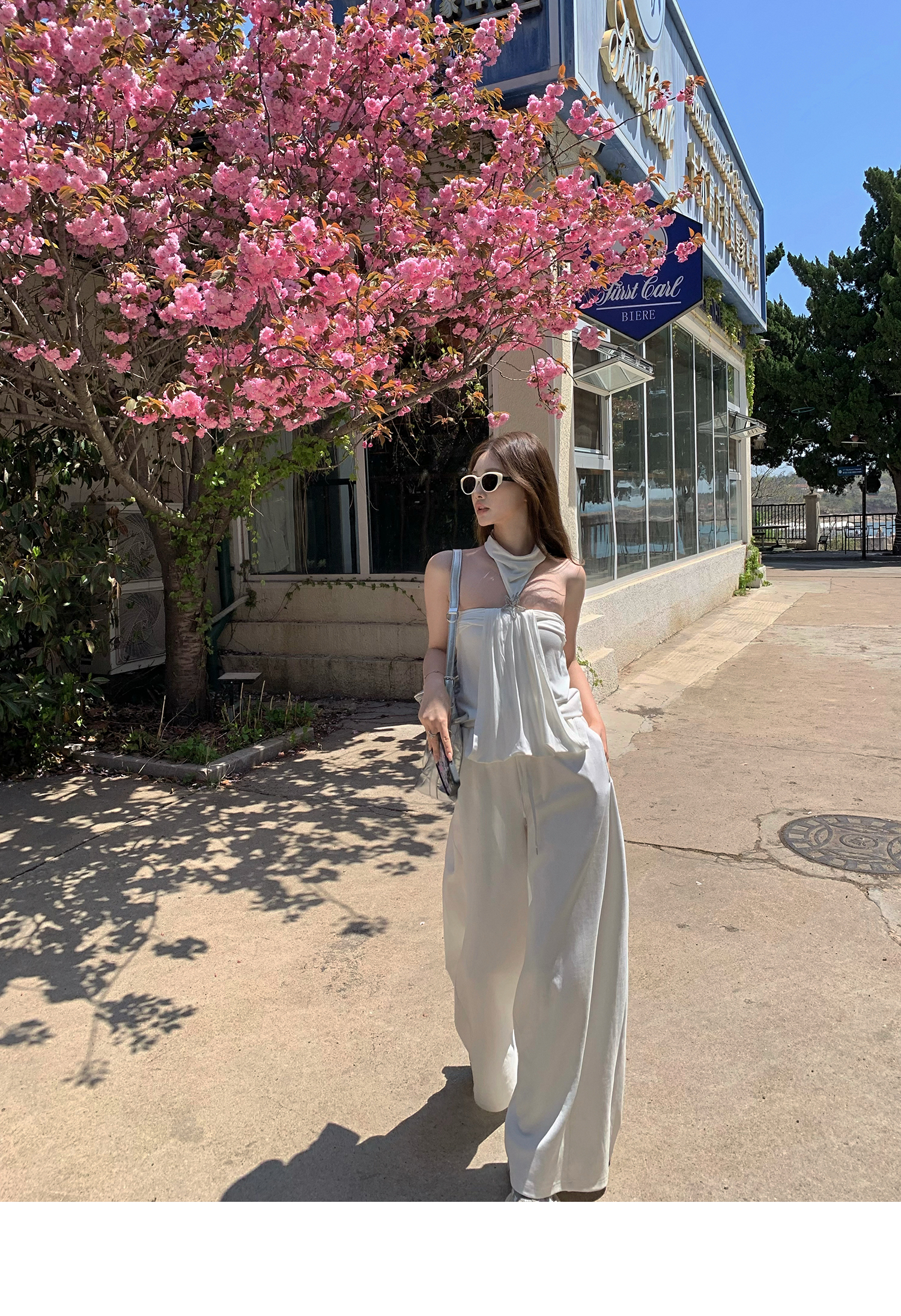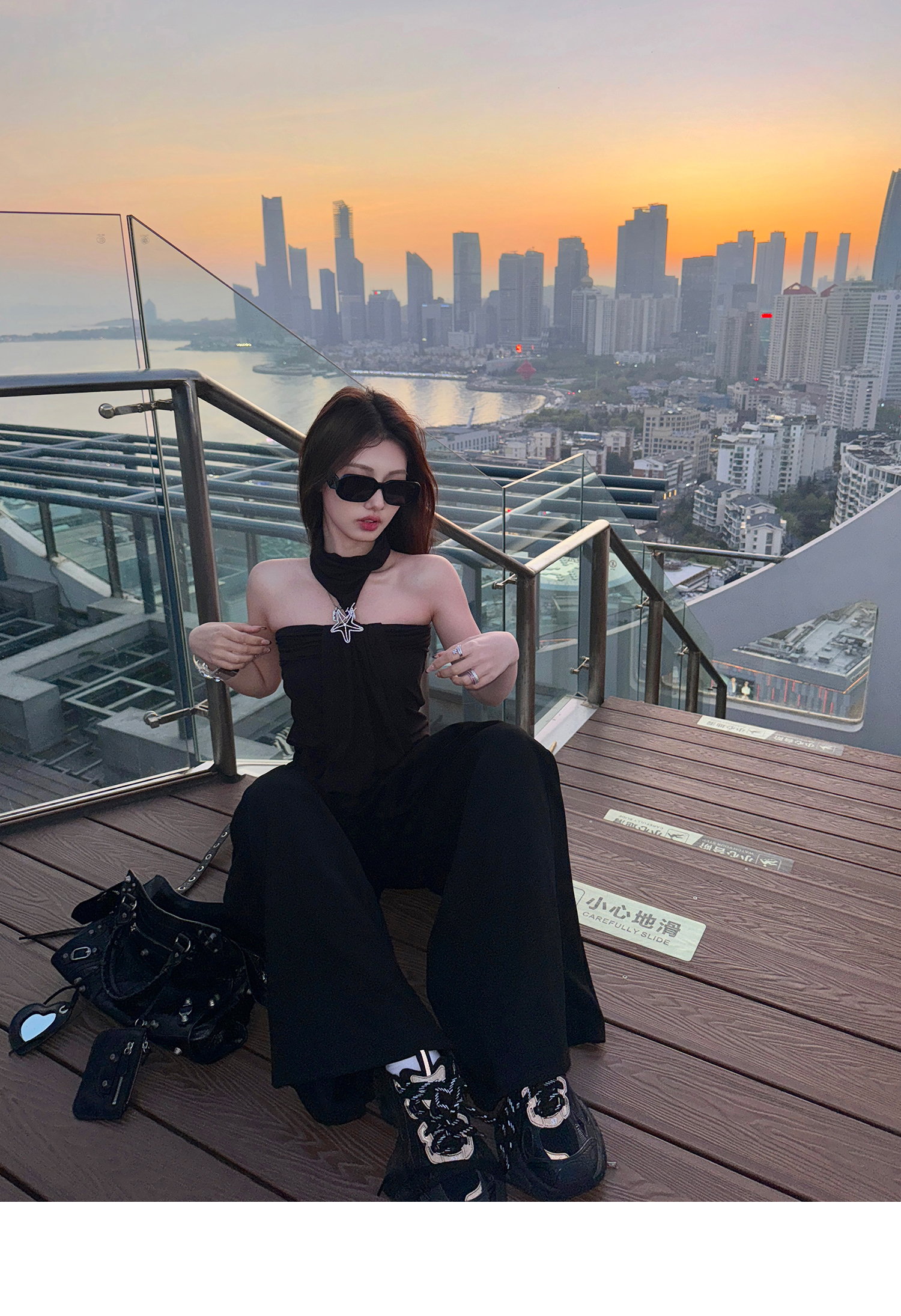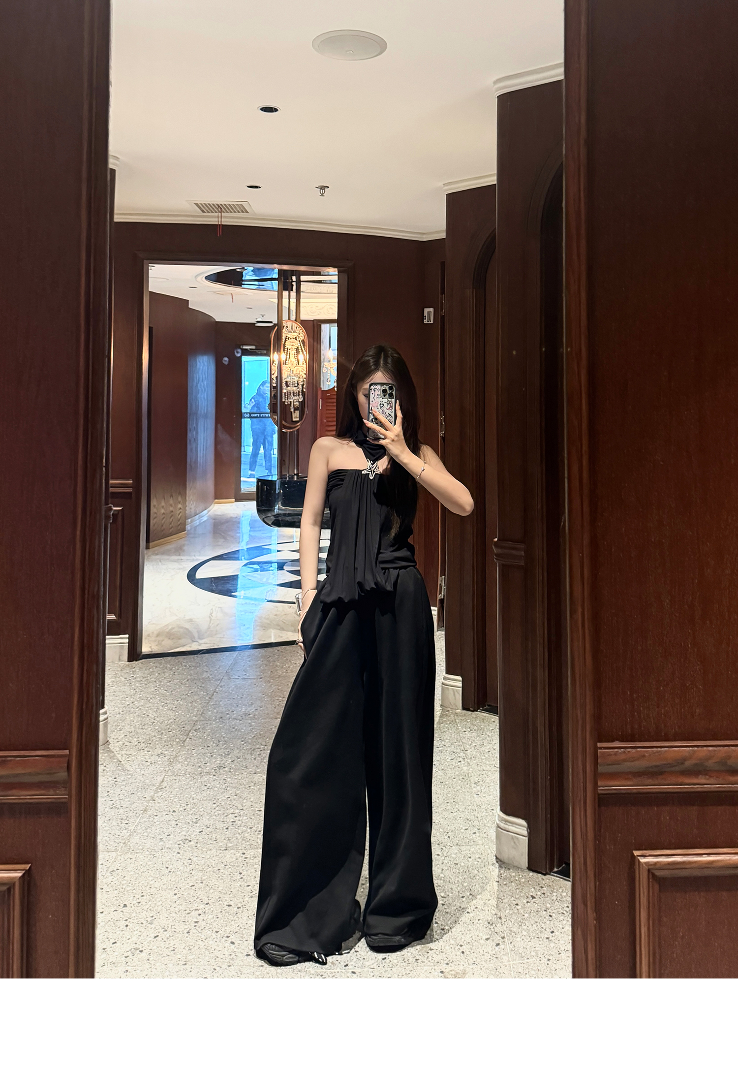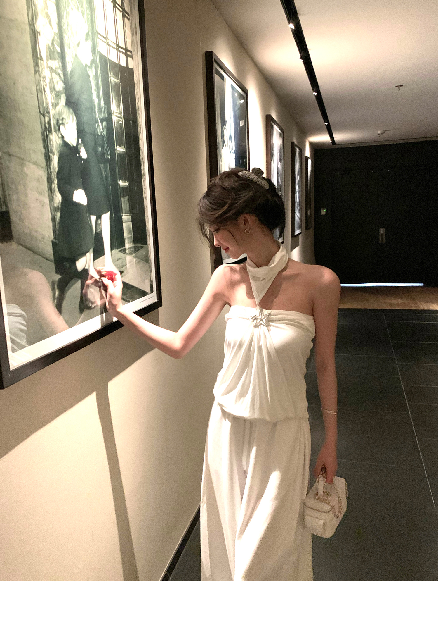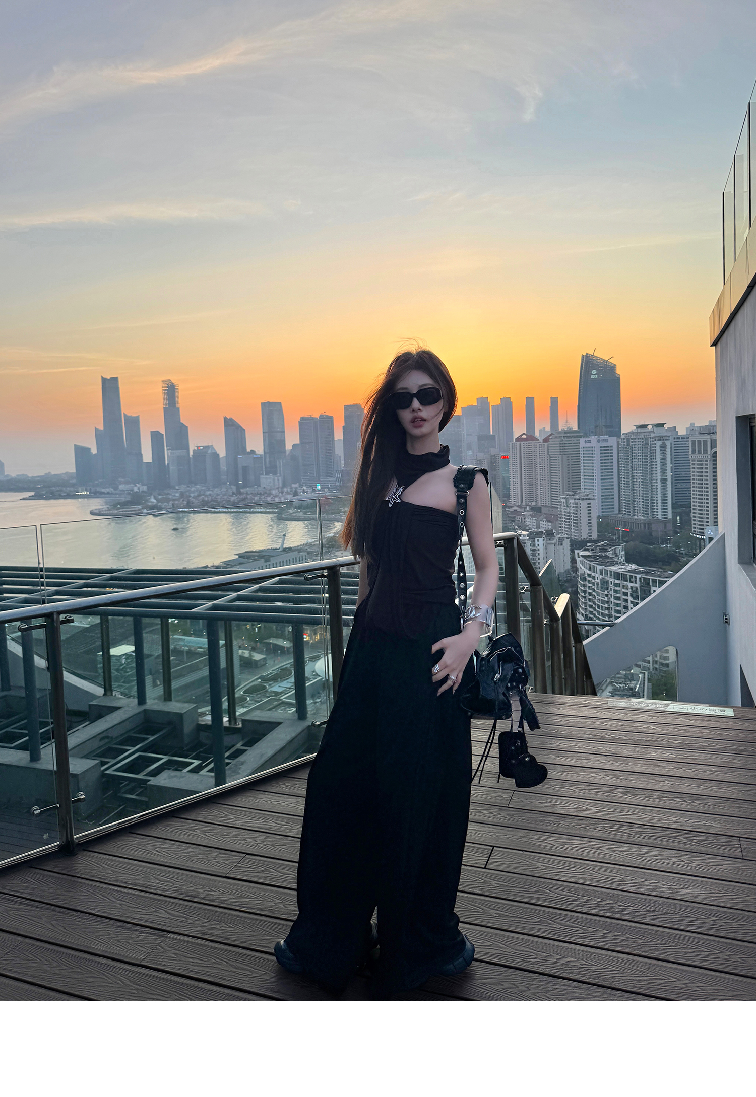 [Rose Accent] White Summer Two-Piece Set - Stylish Wide-Leg Pants