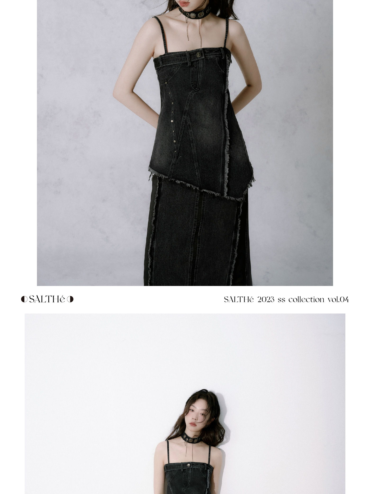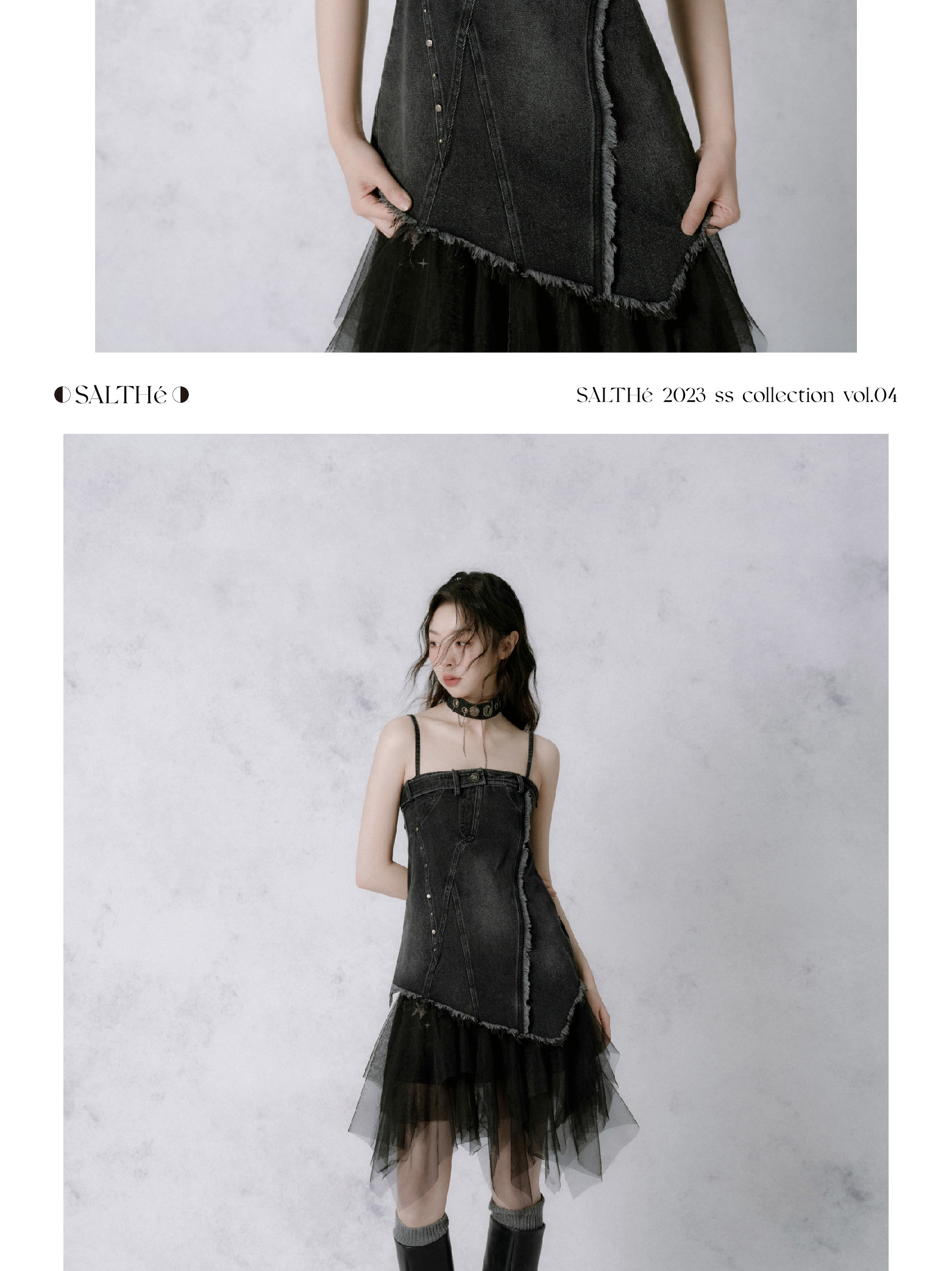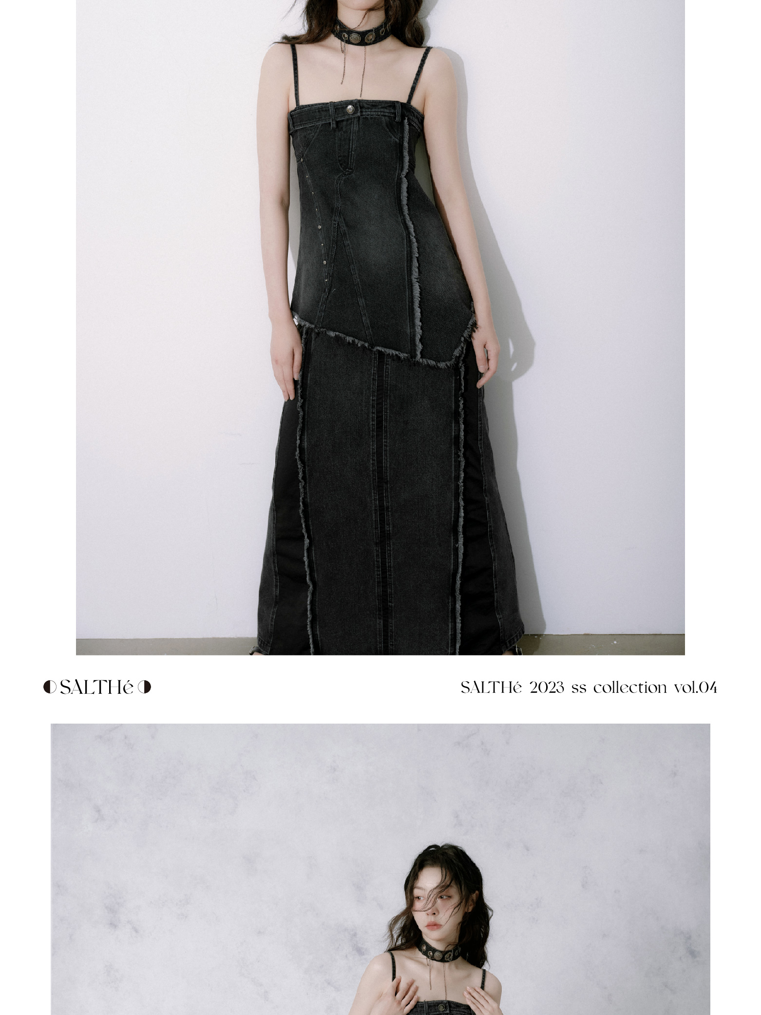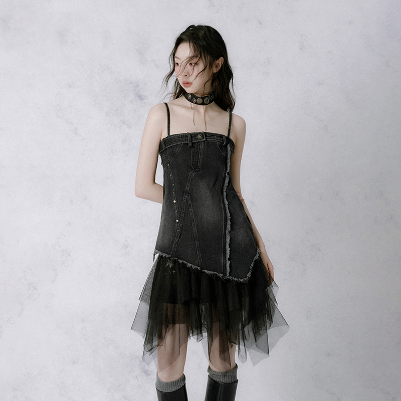 Waste Soil Denim Ragged Edge Splicing Black Sling Dress