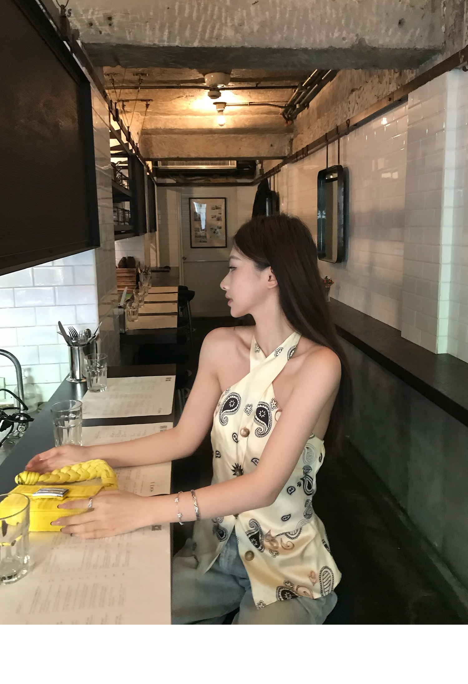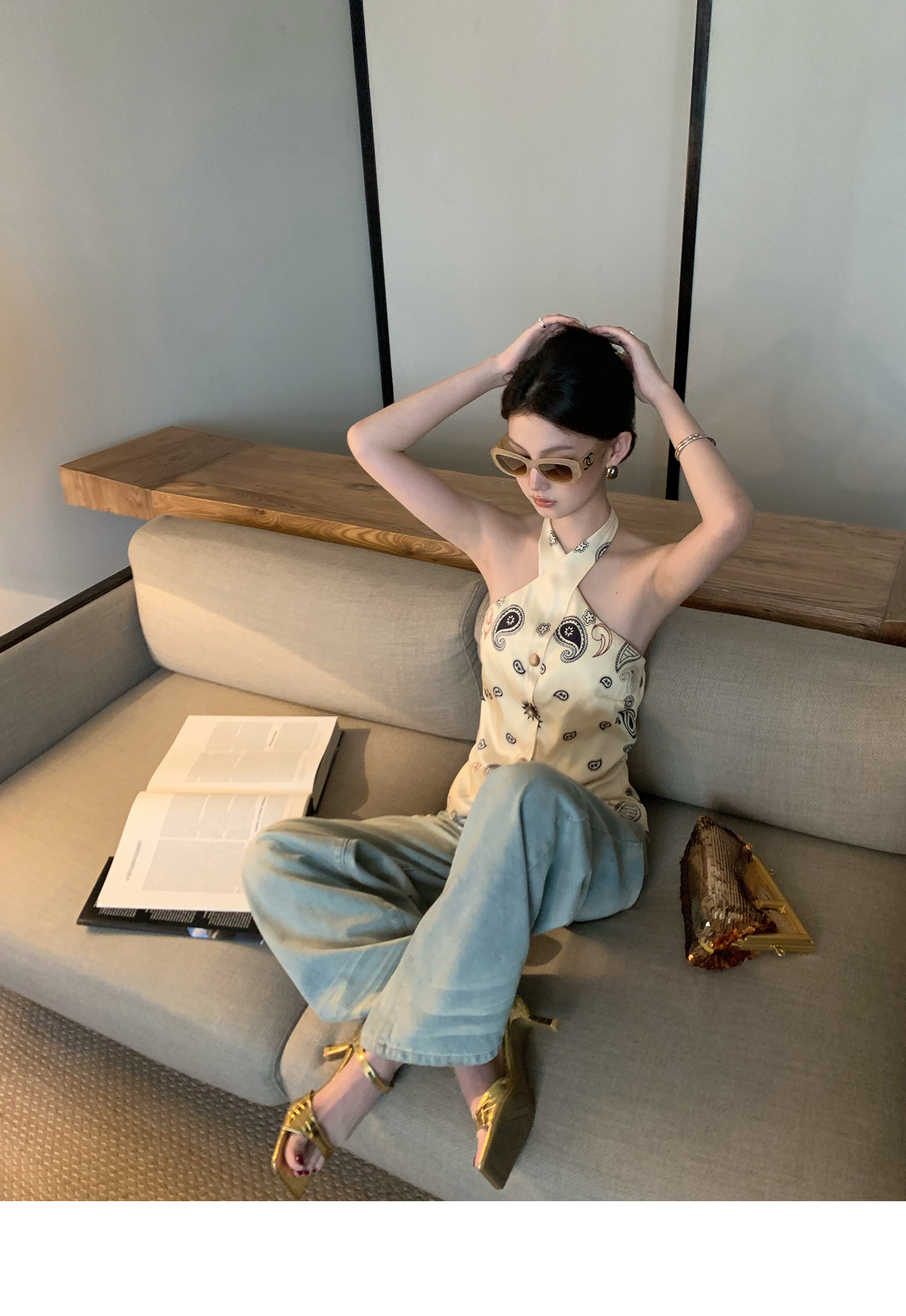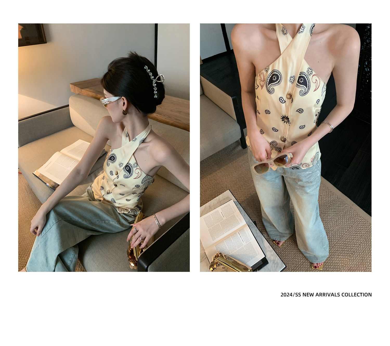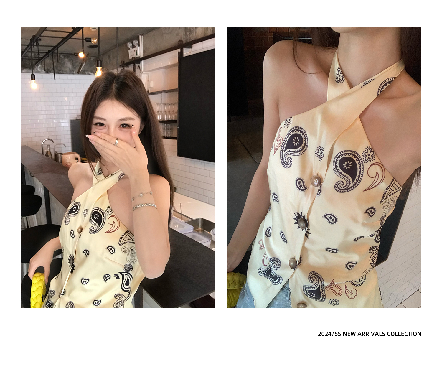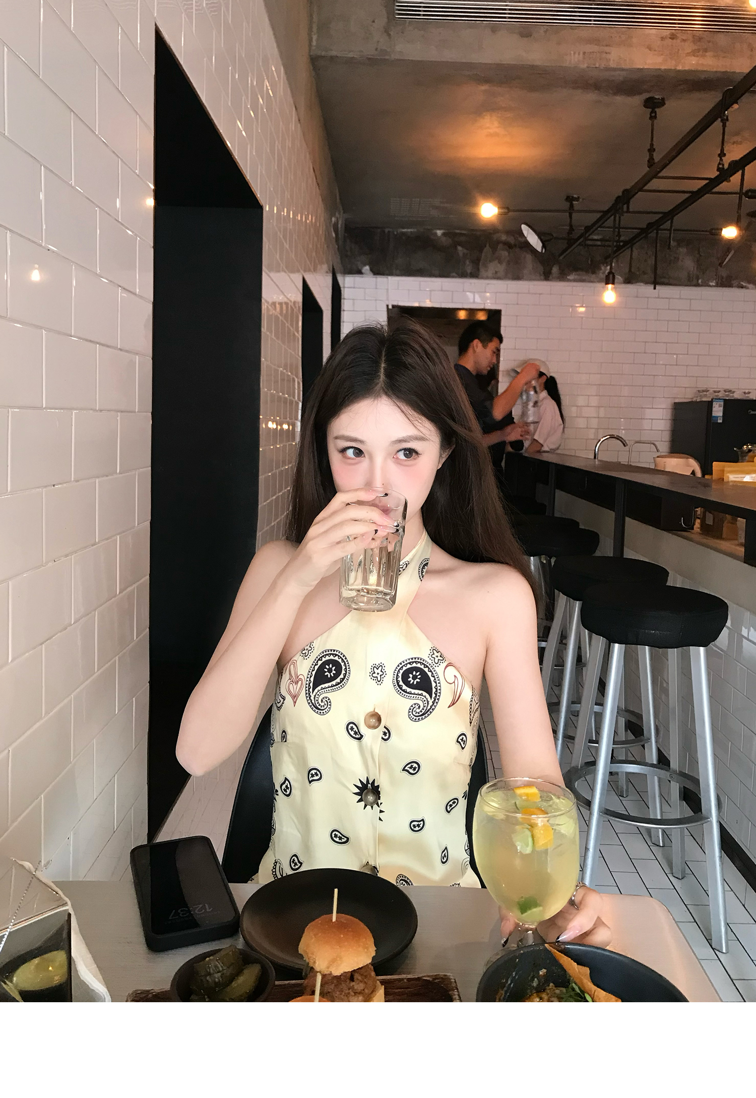 [Sister's Date Night] Cross Halterneck Sleeveless Top + Waist-Cinching Strapless Print Tank