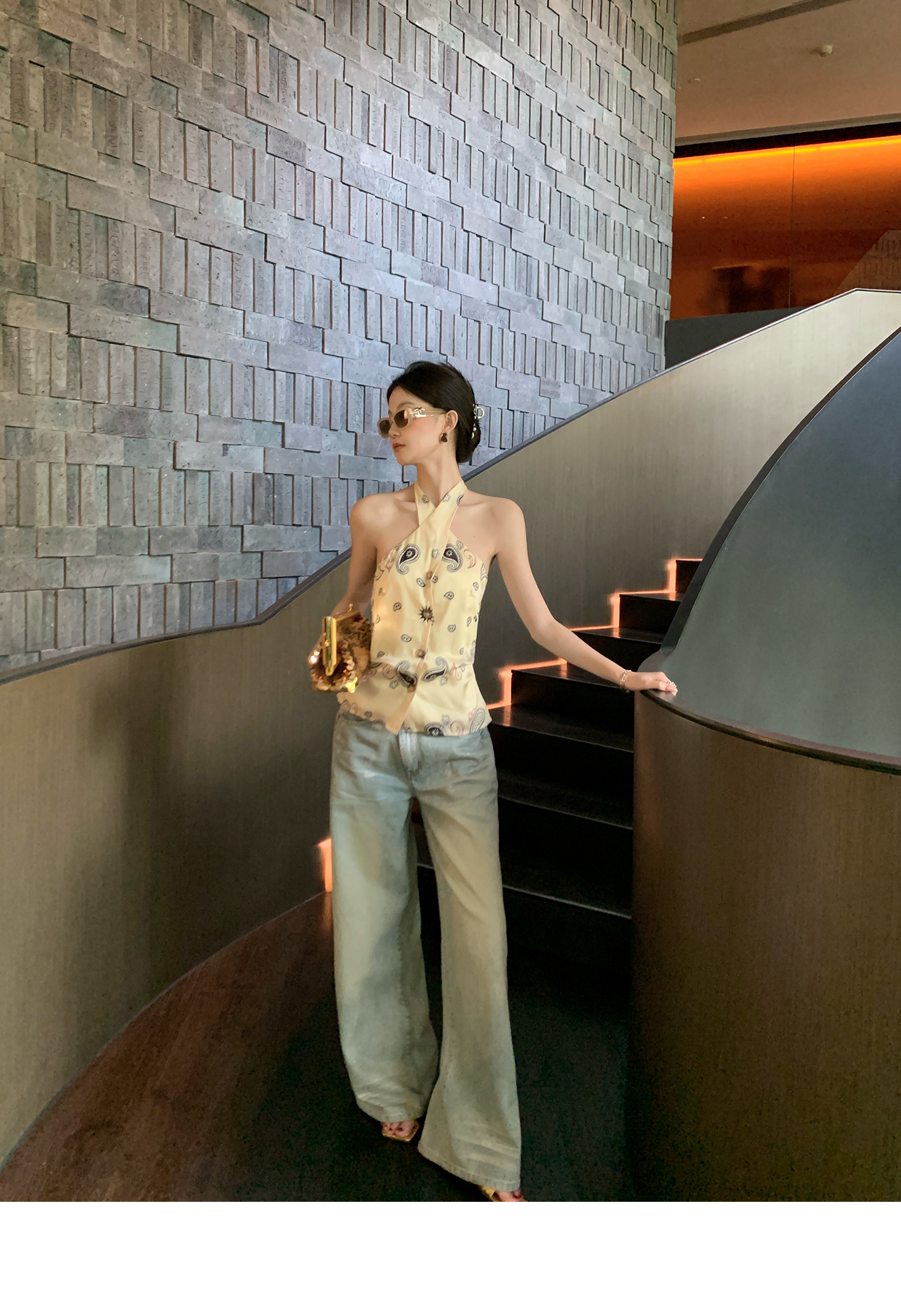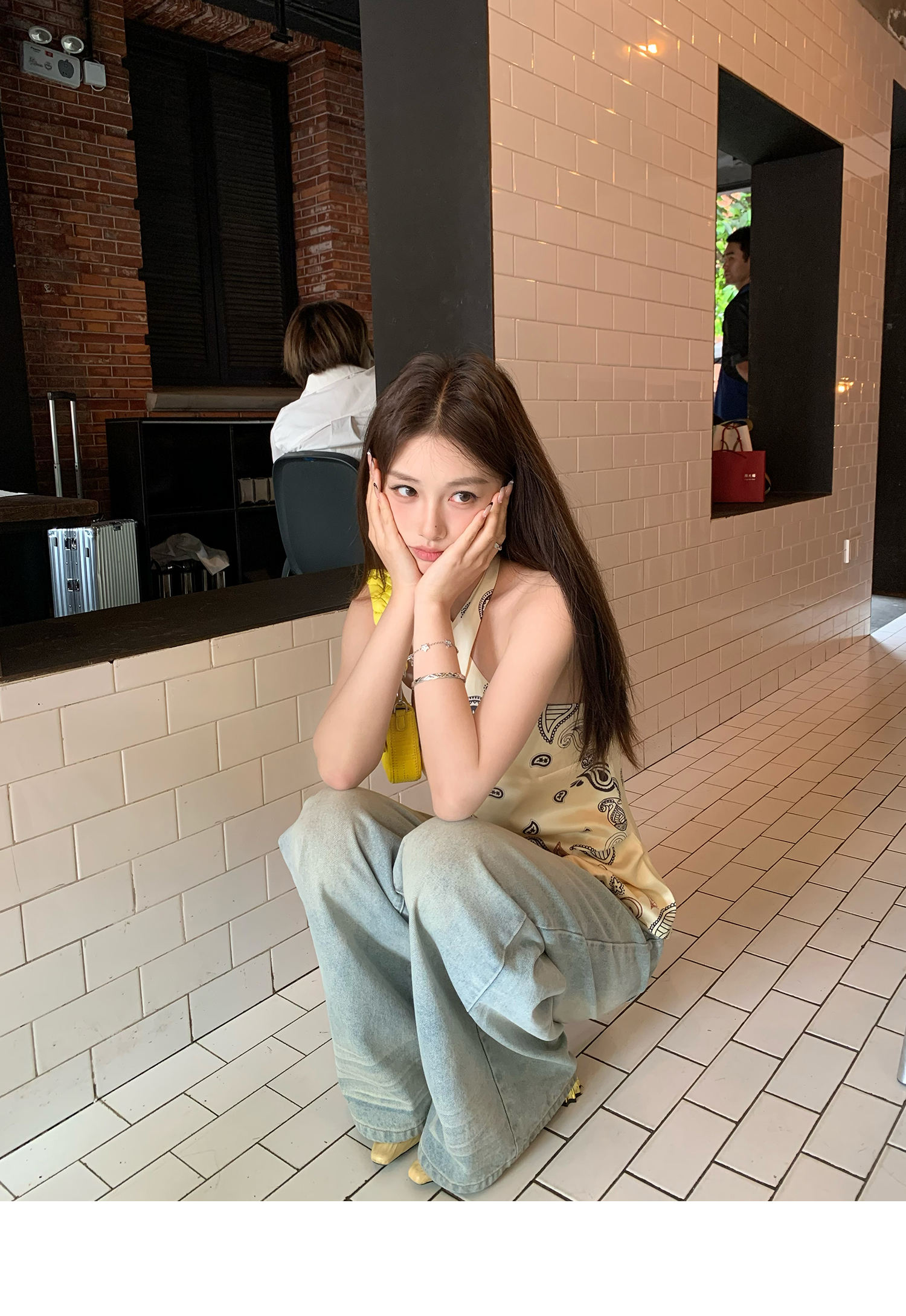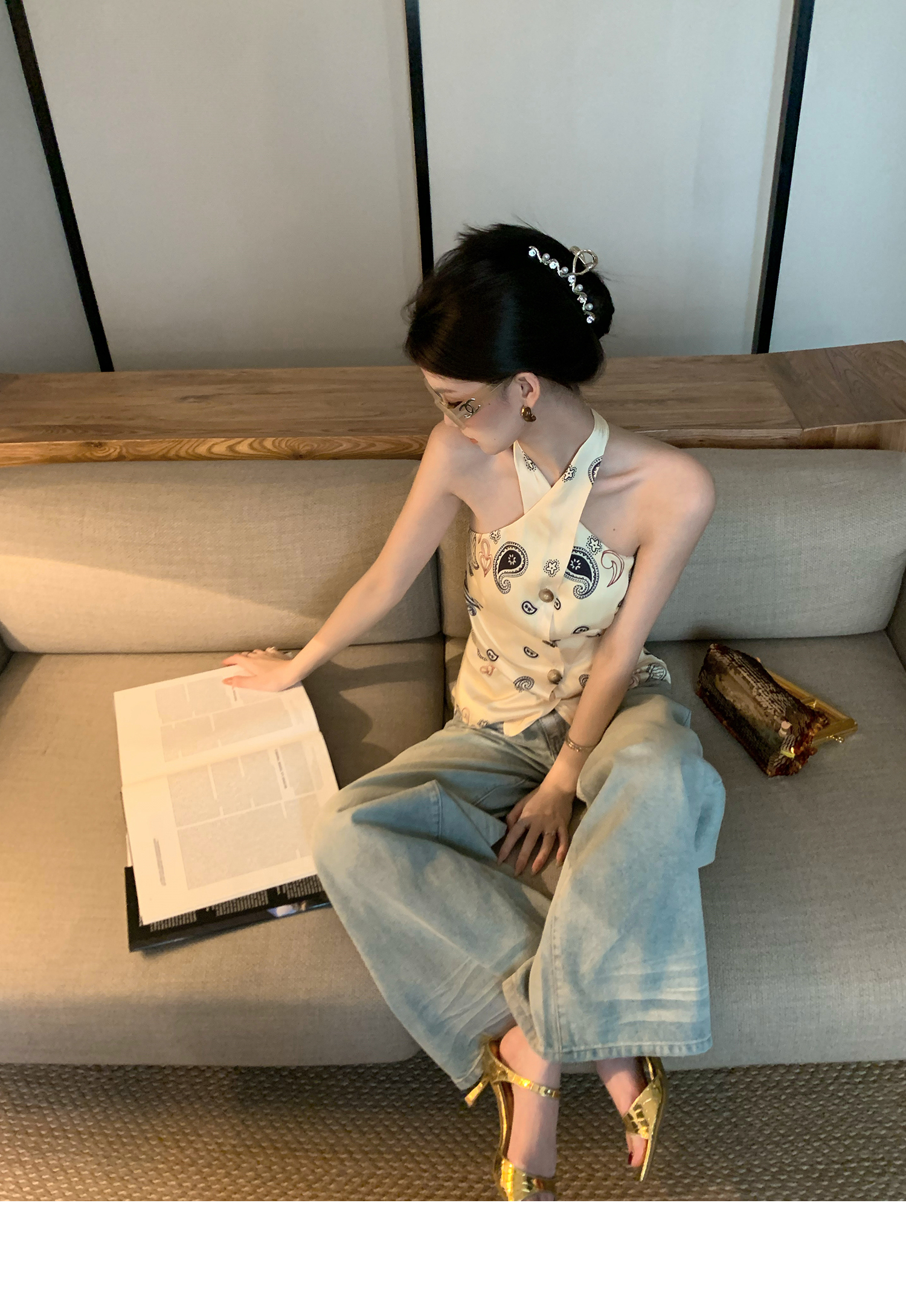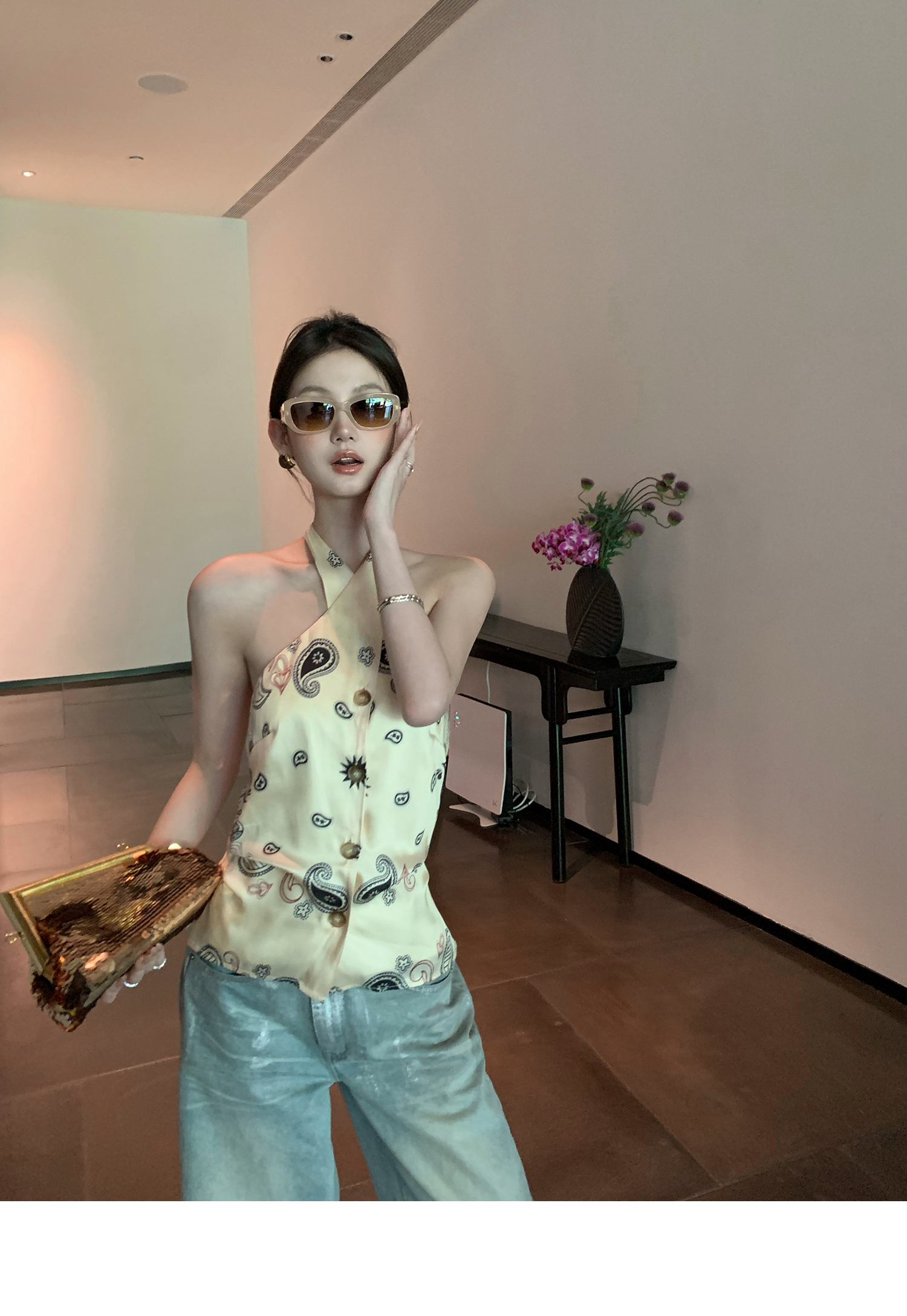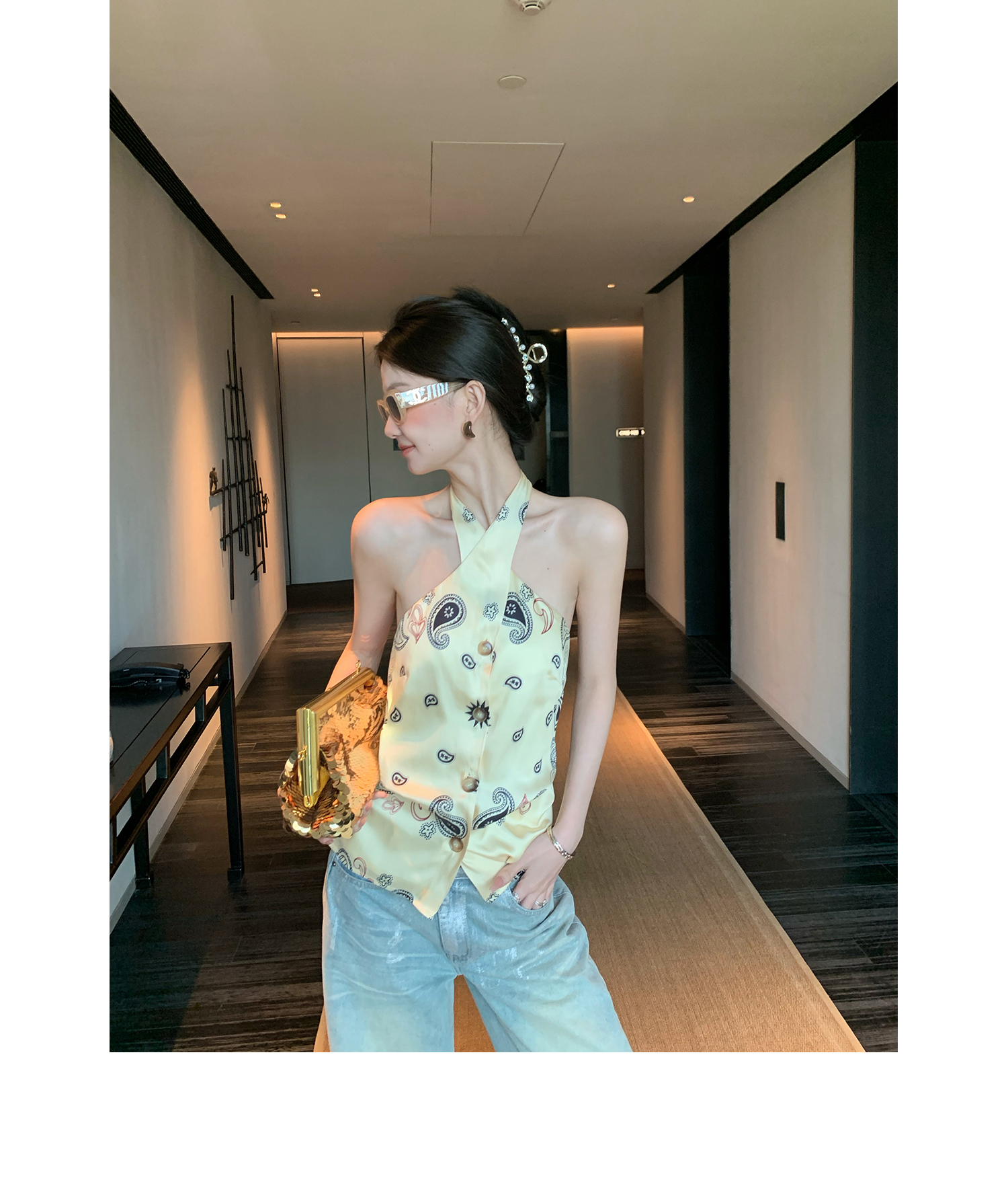 [Sister's Date Night] Cross Halterneck Sleeveless Top + Waist-Cinching Strapless Print Tank