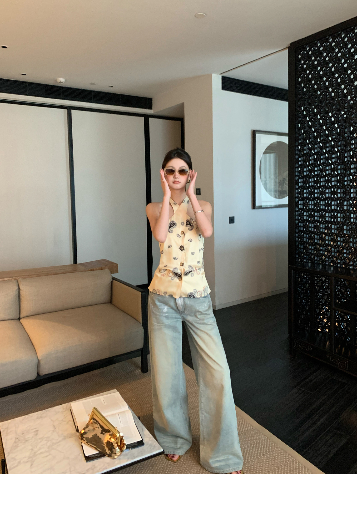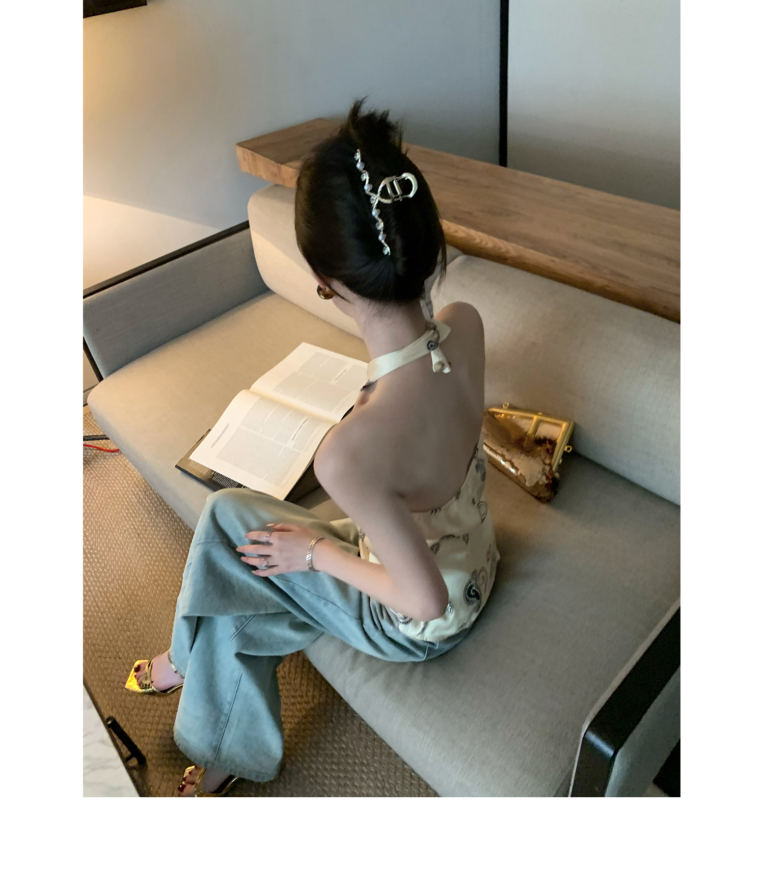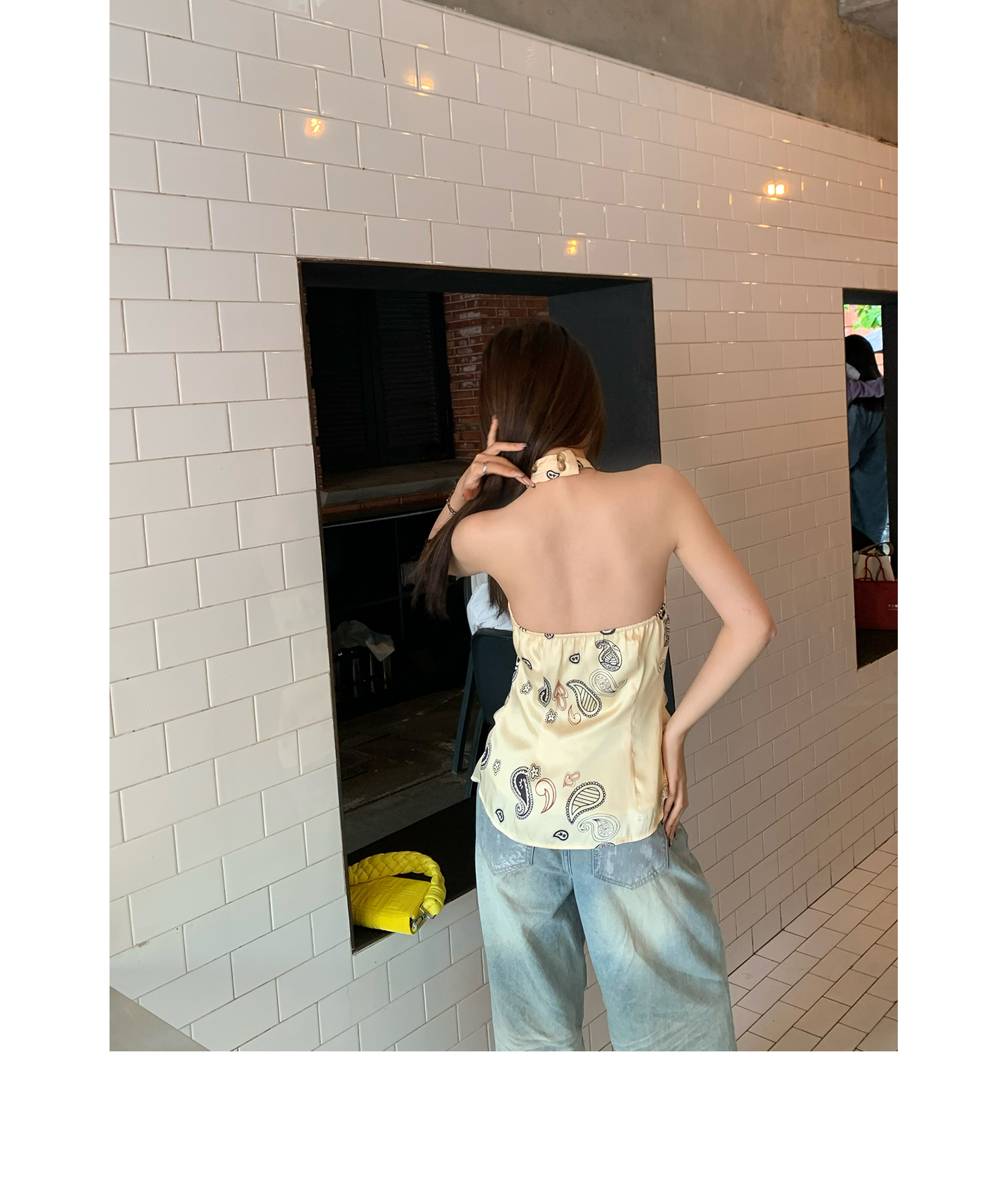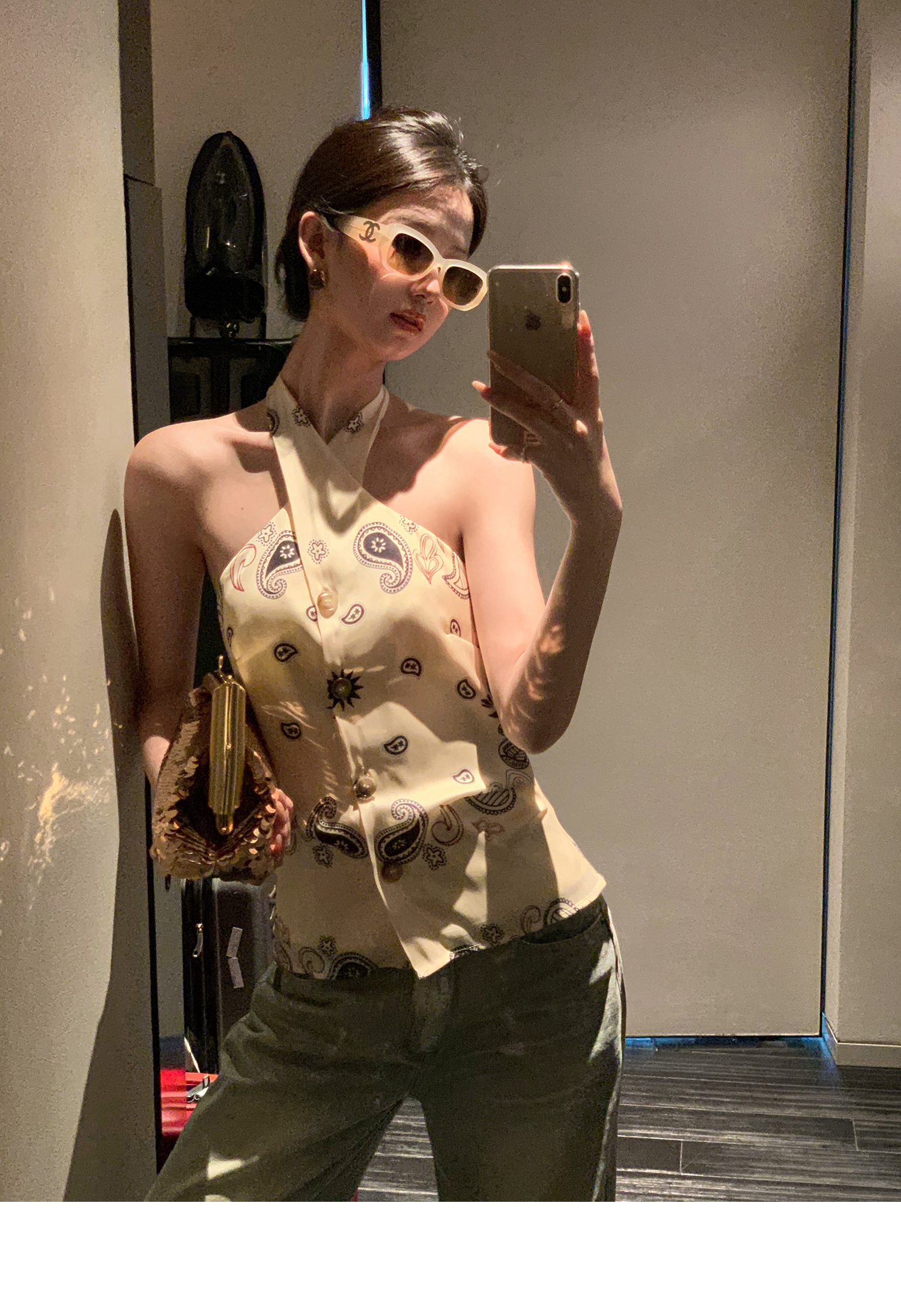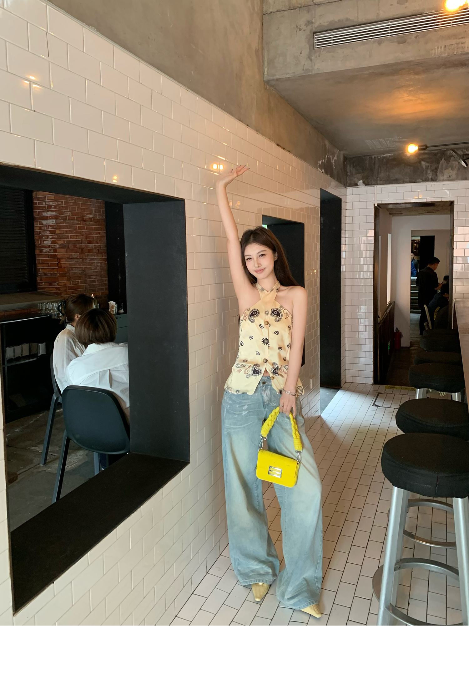 [Sister's Date Night] Cross Halterneck Sleeveless Top + Waist-Cinching Strapless Print Tank