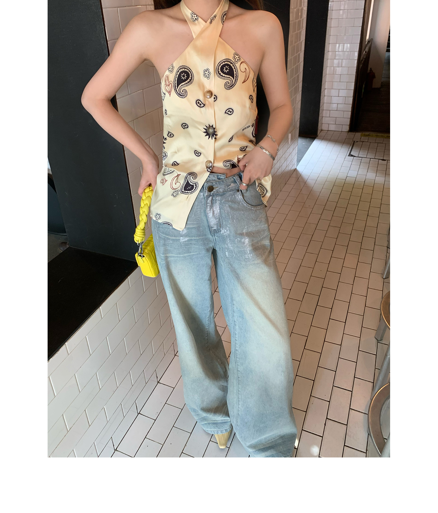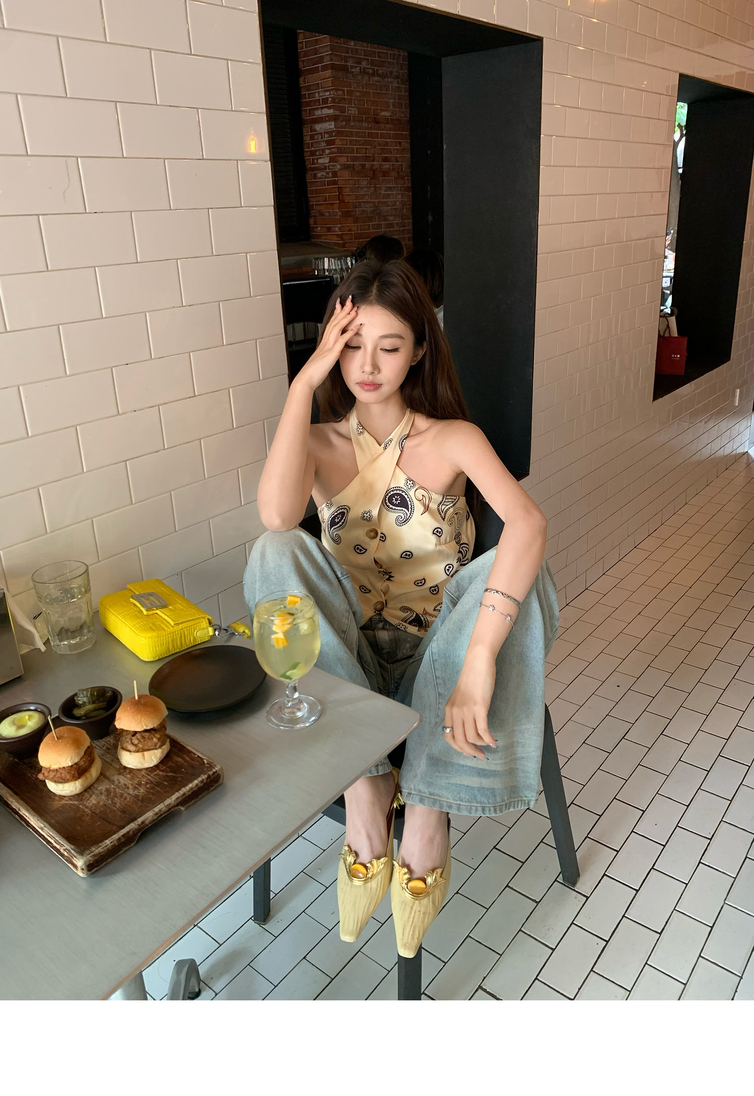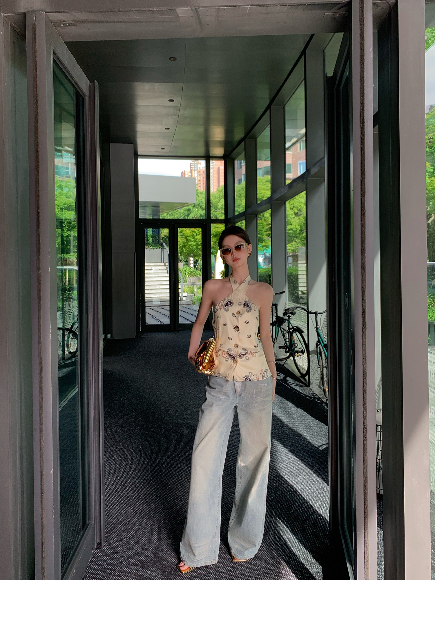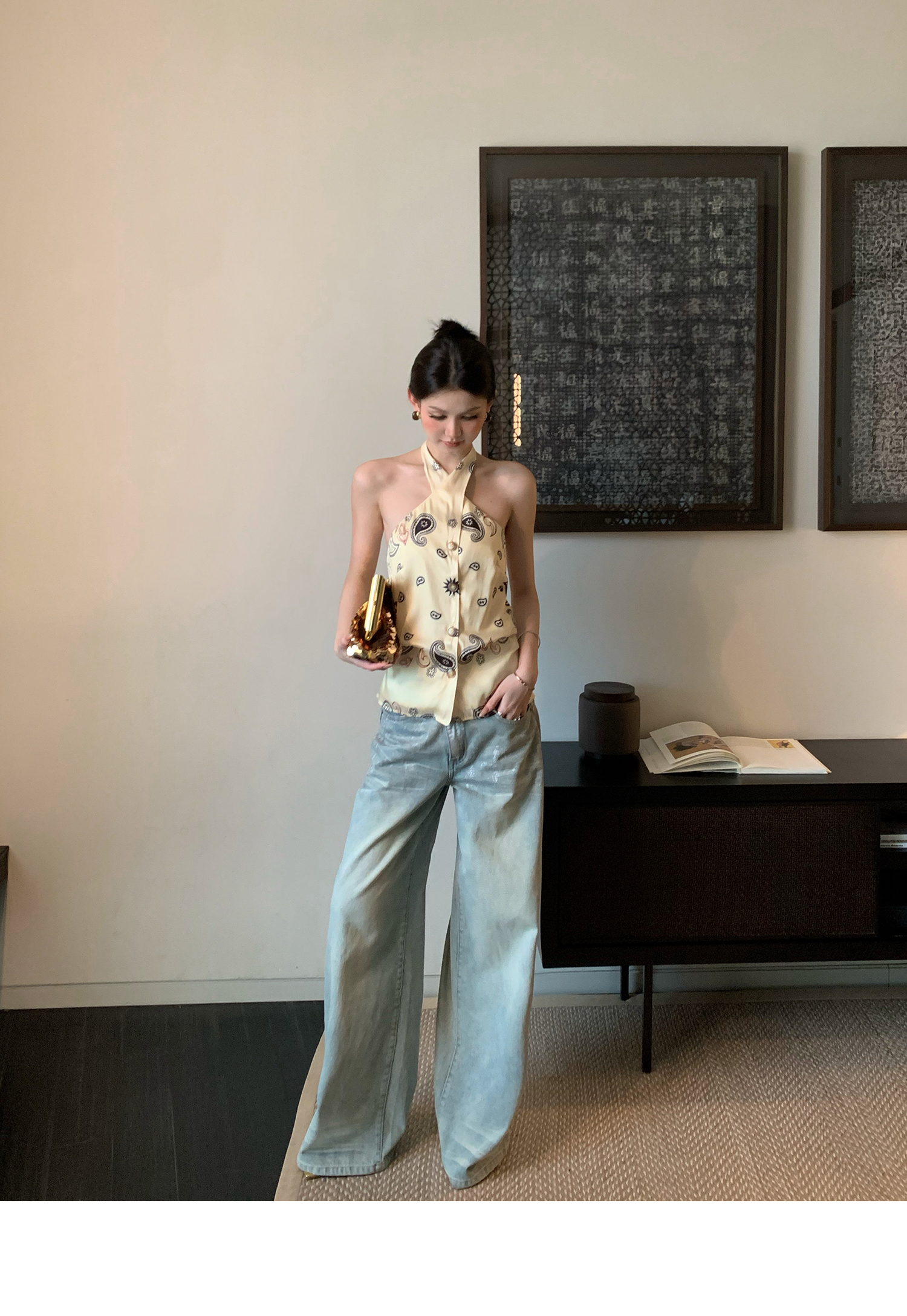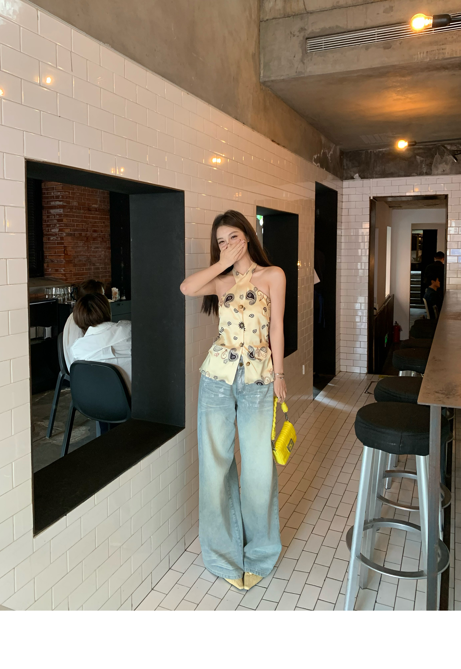[Sister's Date Night] Cross Halterneck Sleeveless Top + Waist-Cinching Strapless Print Tank