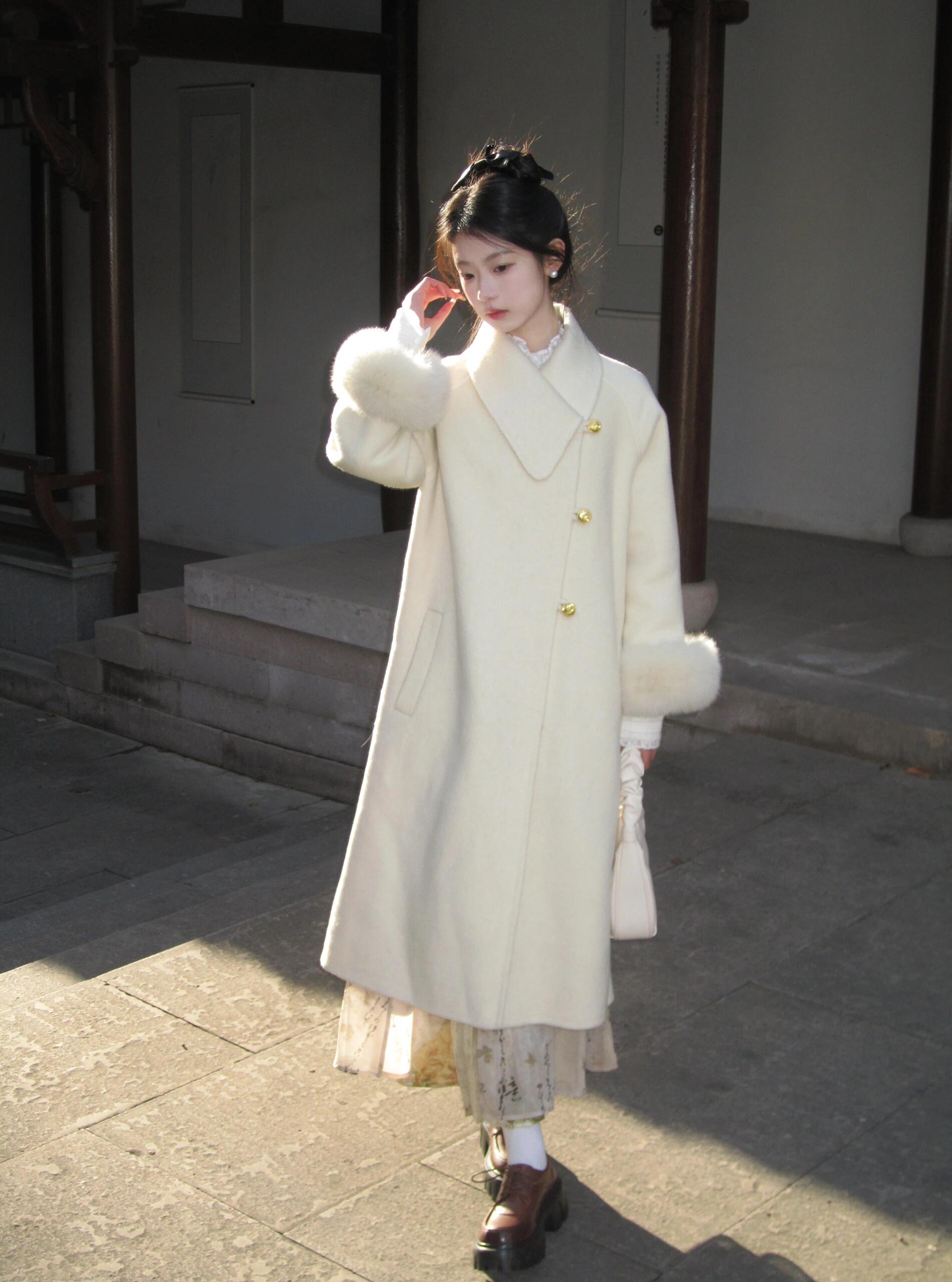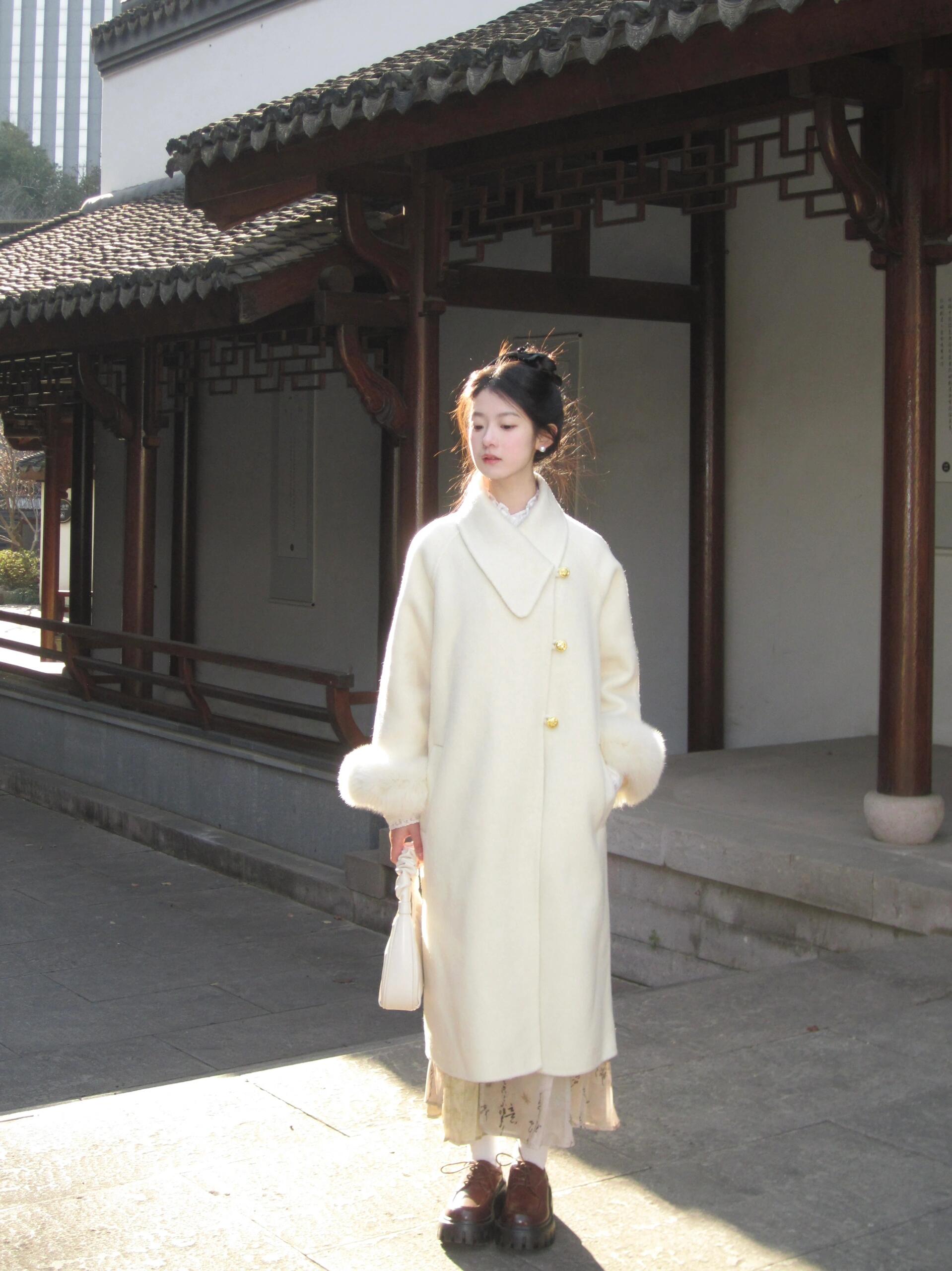 Luxe Woolen Coat – White Fox Fur Mid-Length Cashmere Elegance