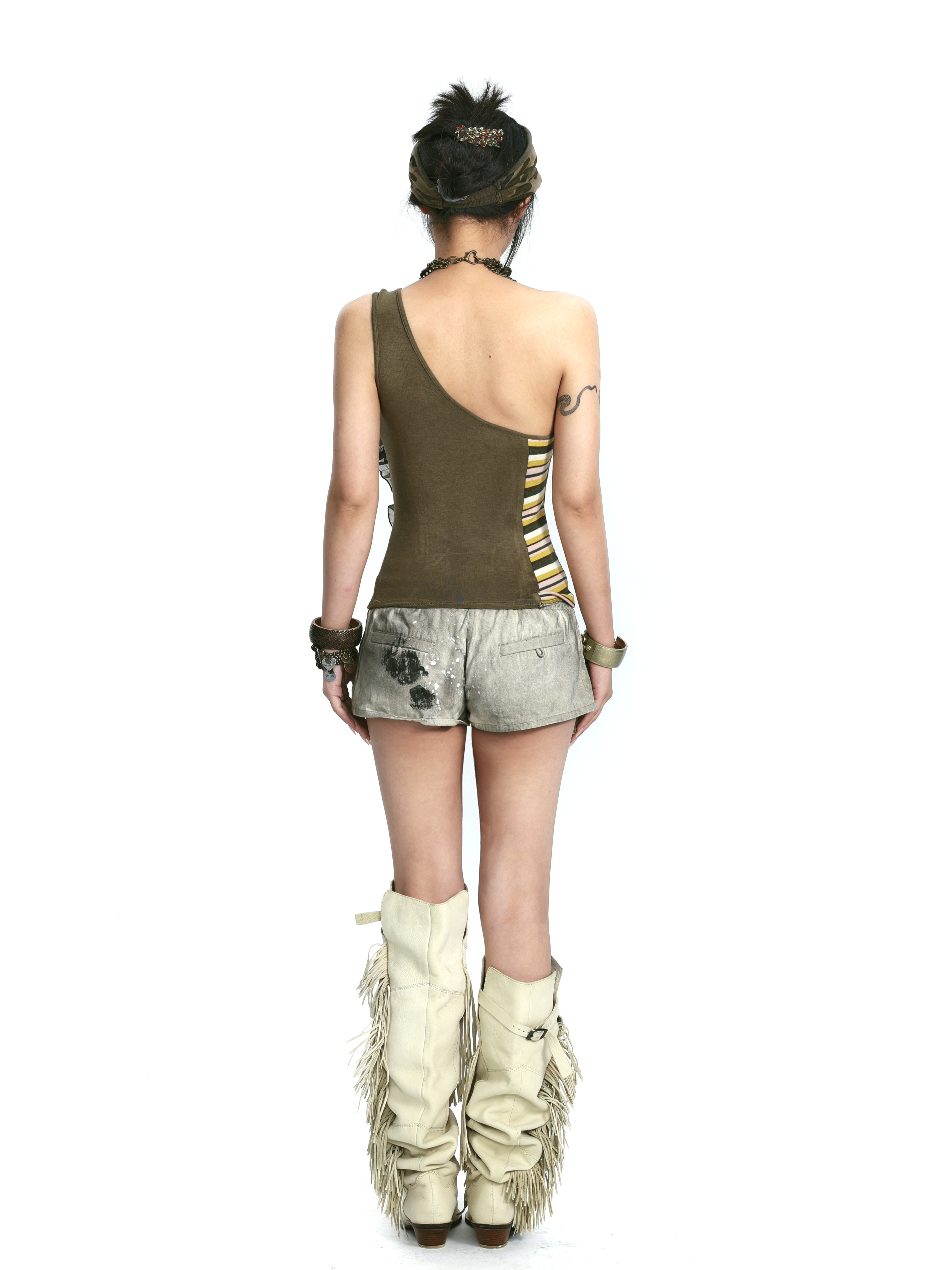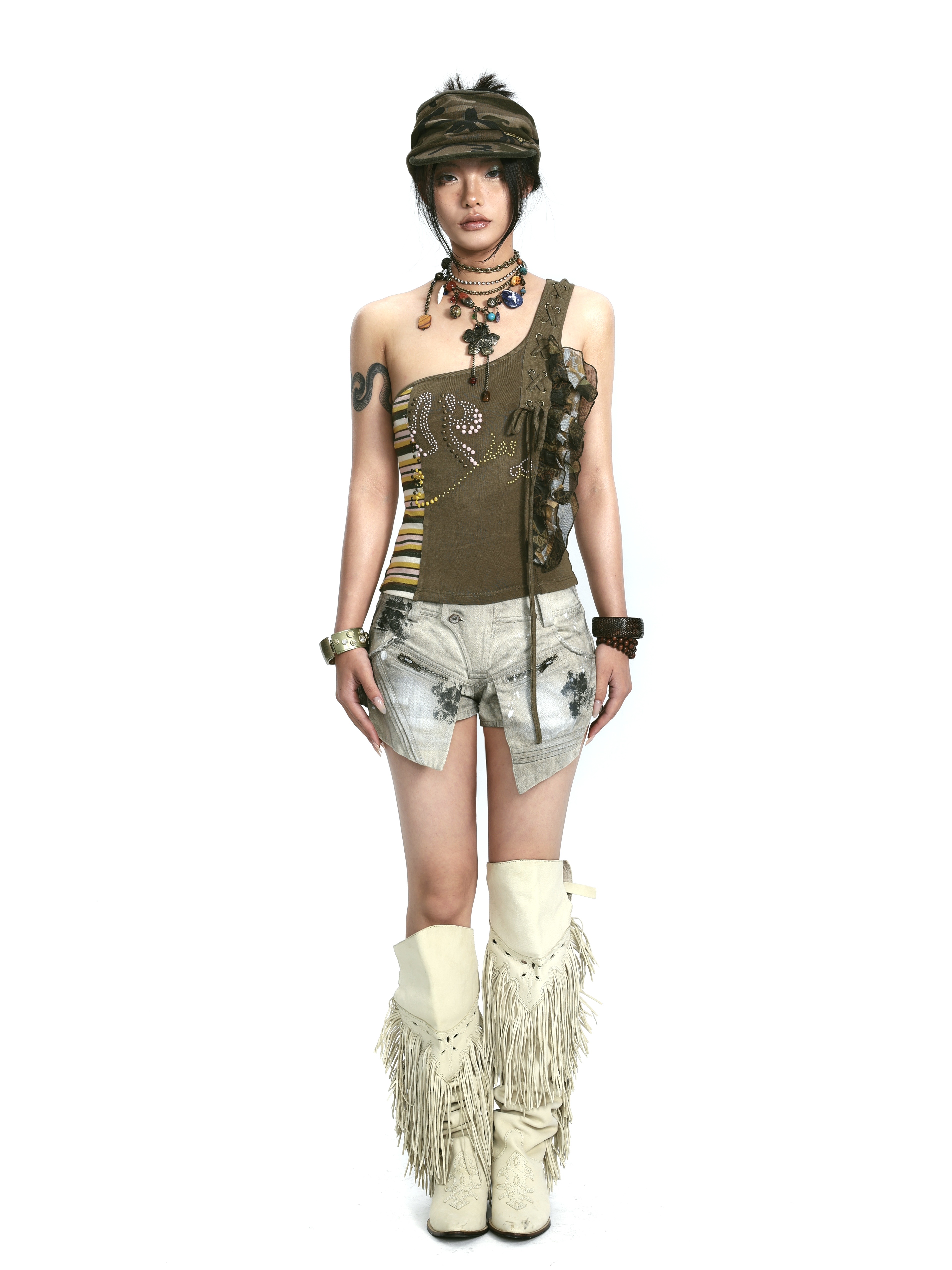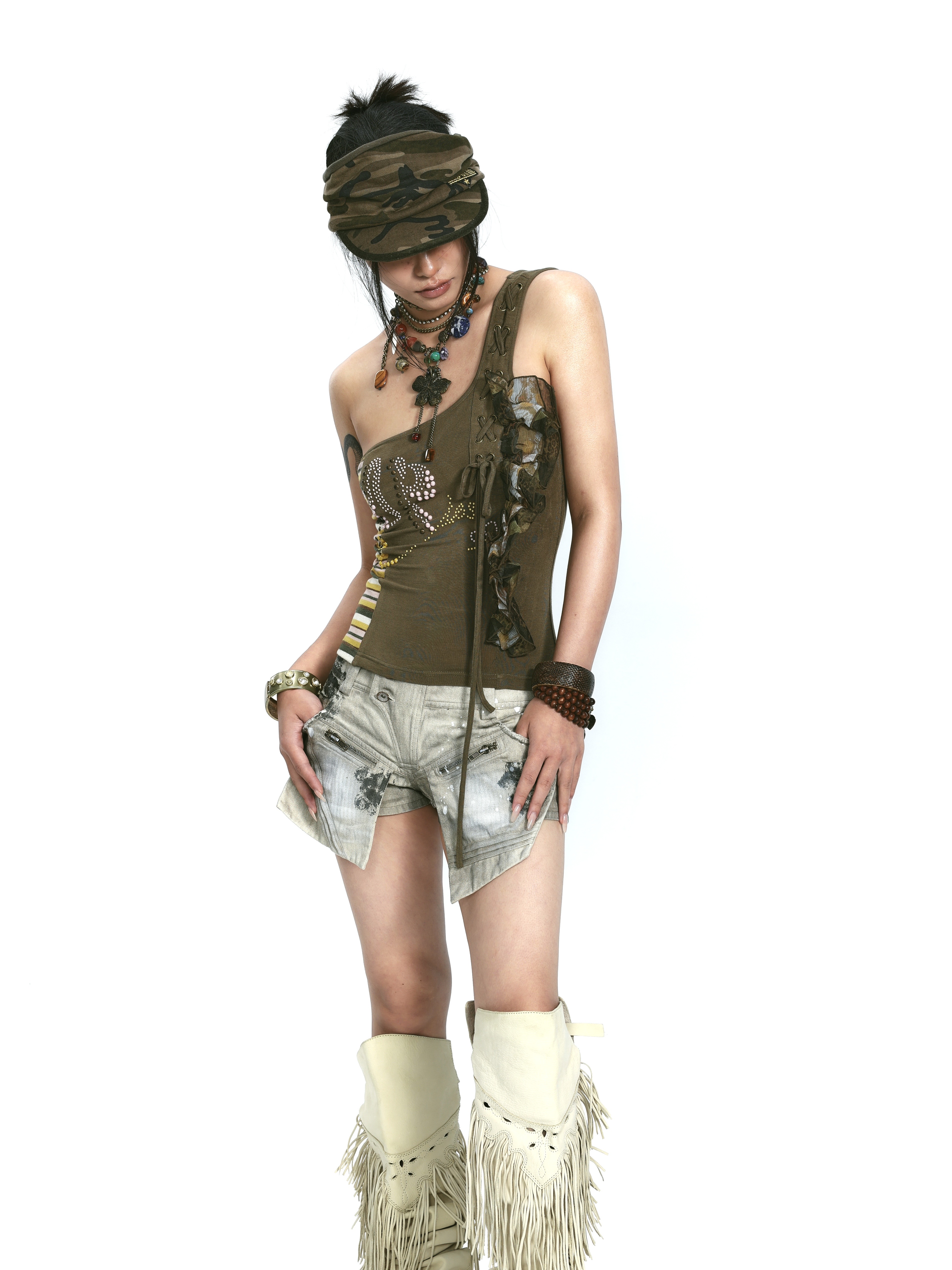 Diamond-Pattern One-Shoulder Cami – Lace Gauze Texture