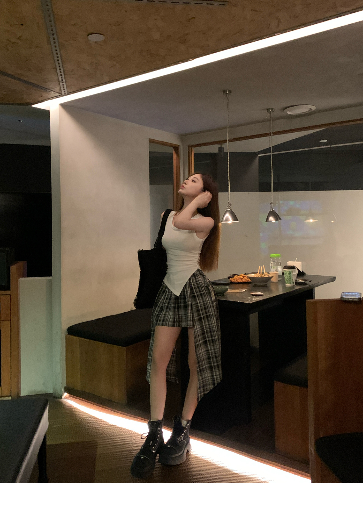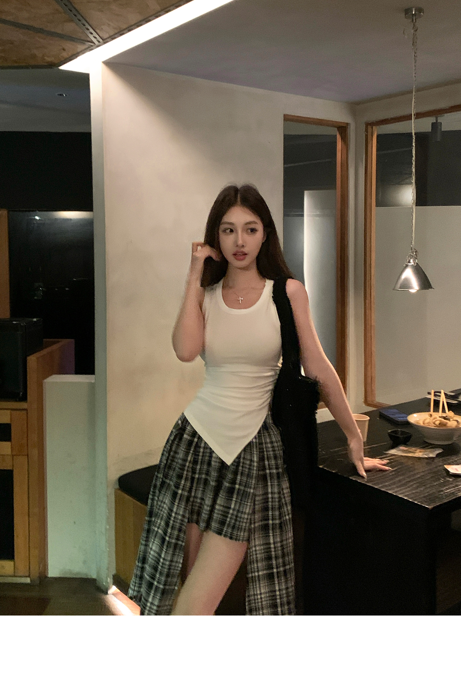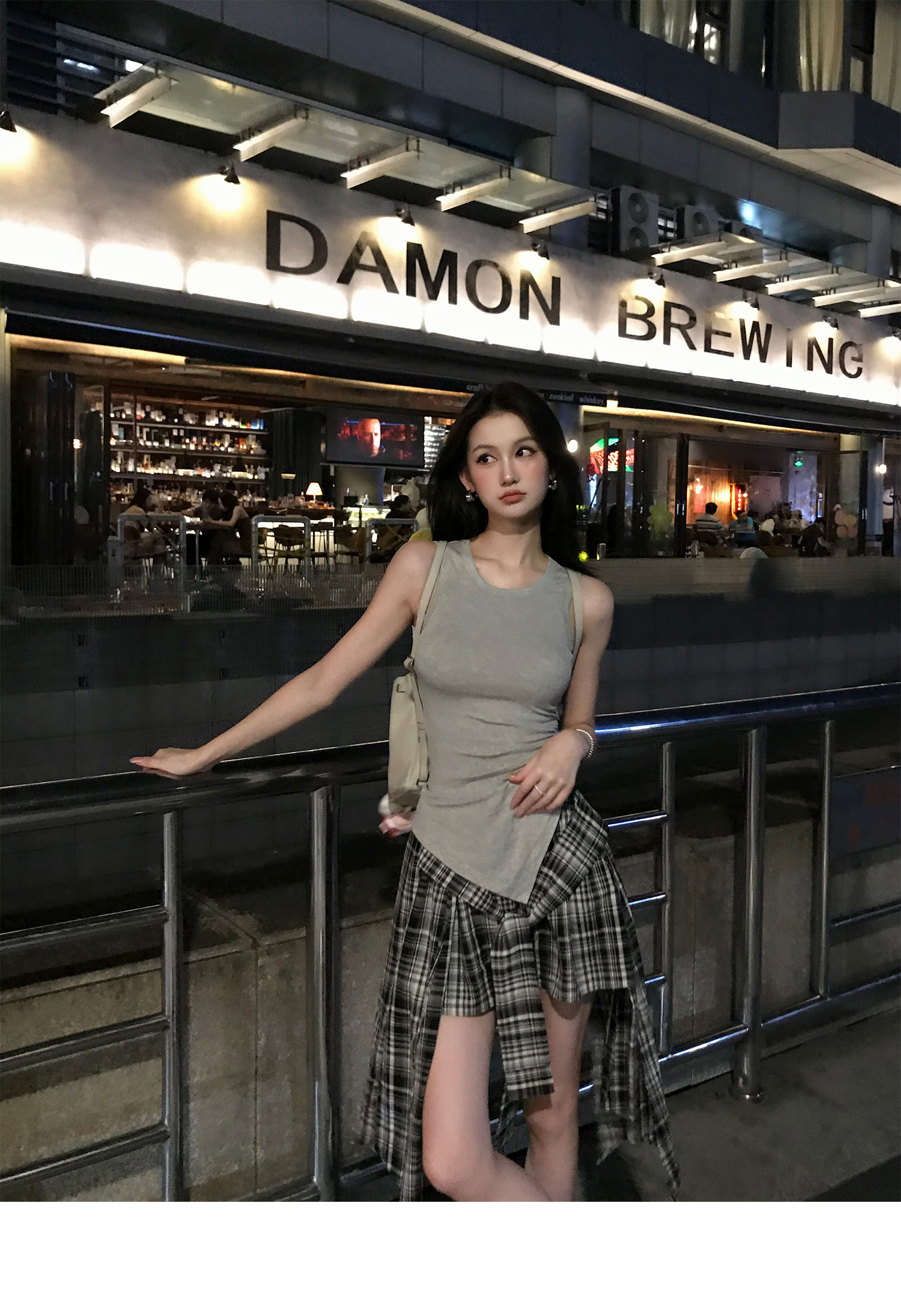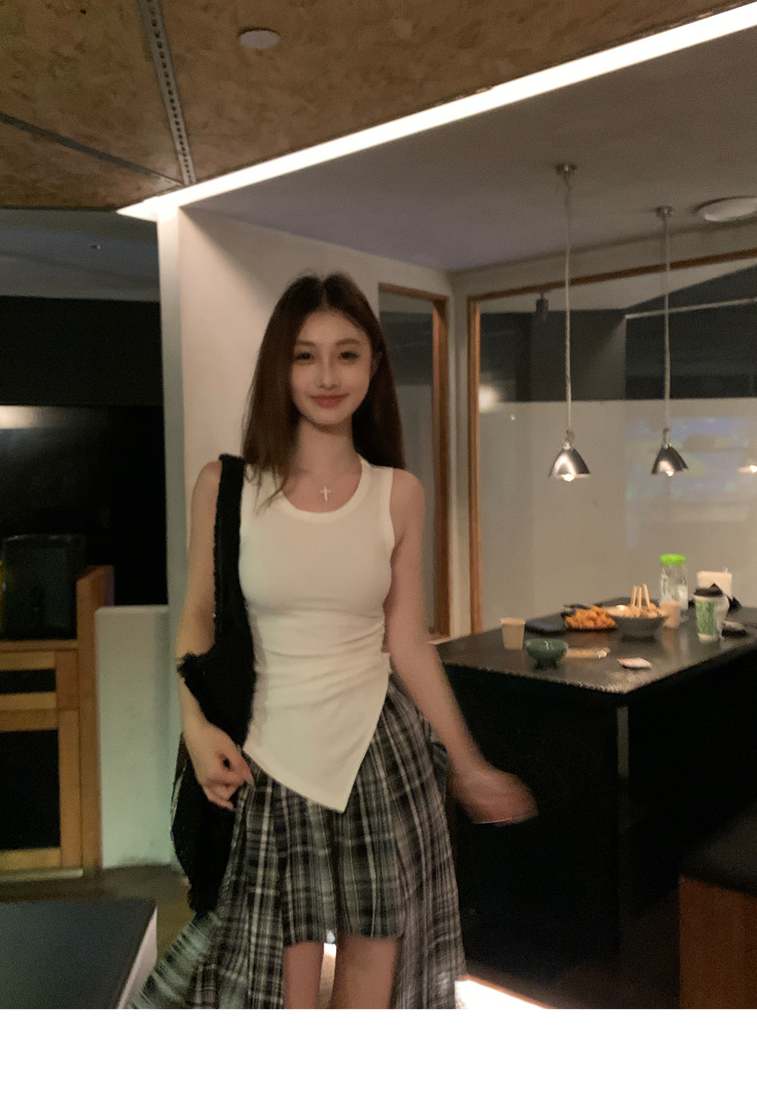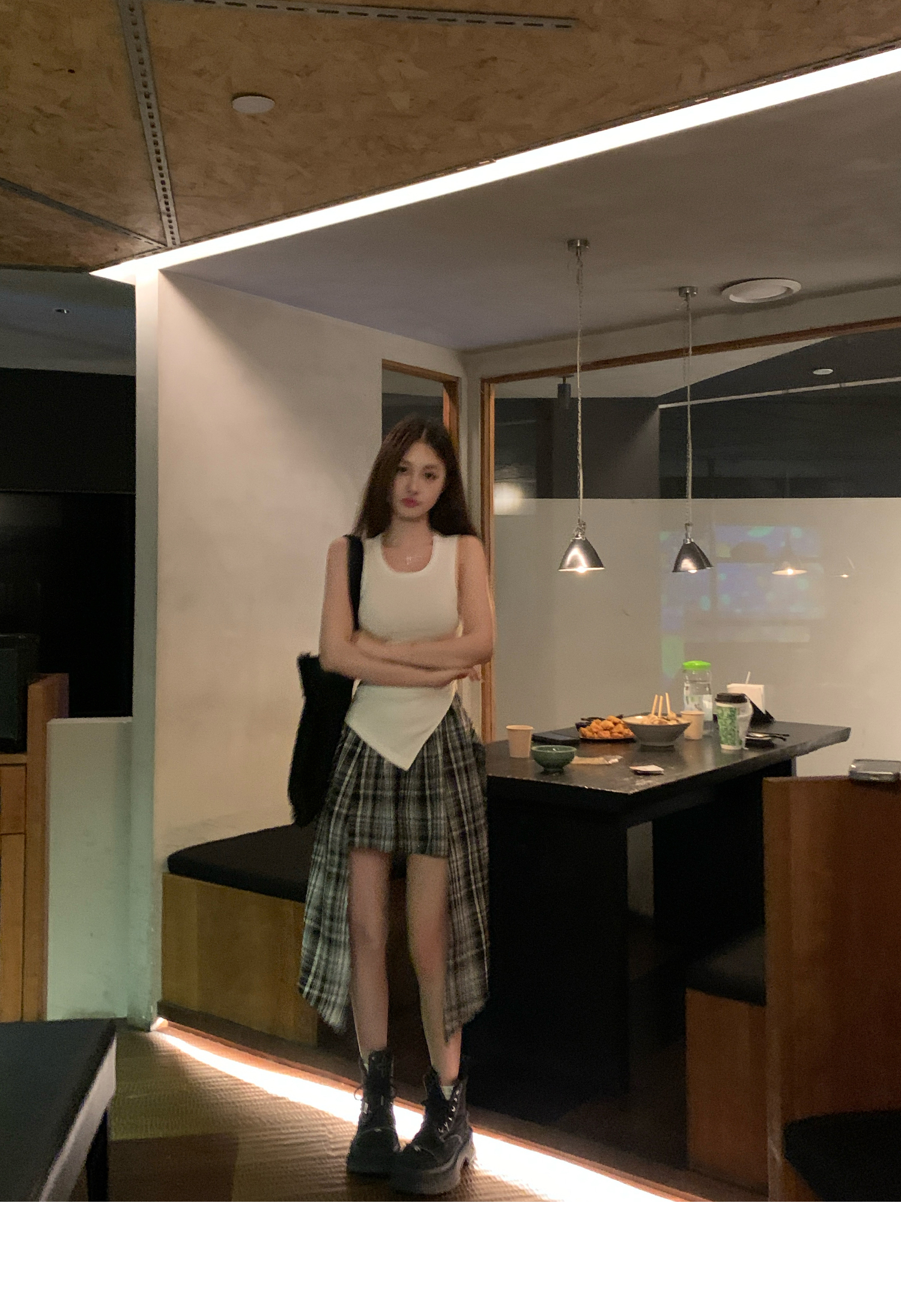 Weird Girl Irregular Sleeveless Vest + Checkered Half Skirt Set - Summer Style