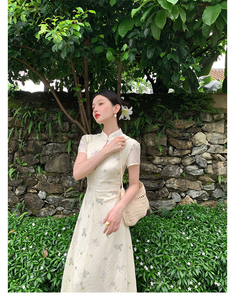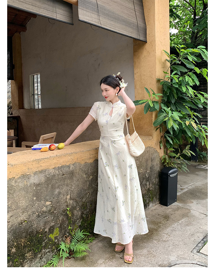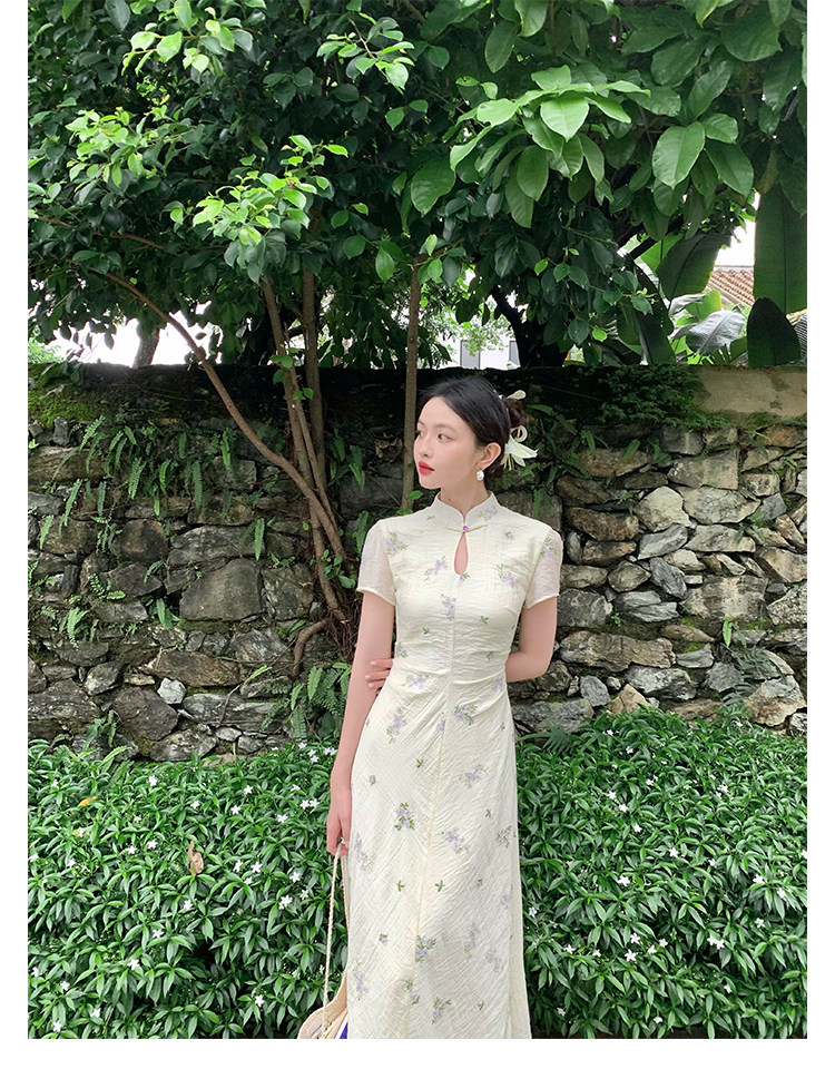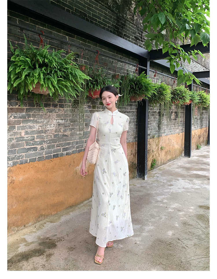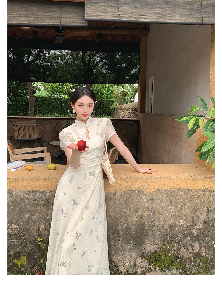 Disc Buckle Collar Embroidered Cheongsam Dress